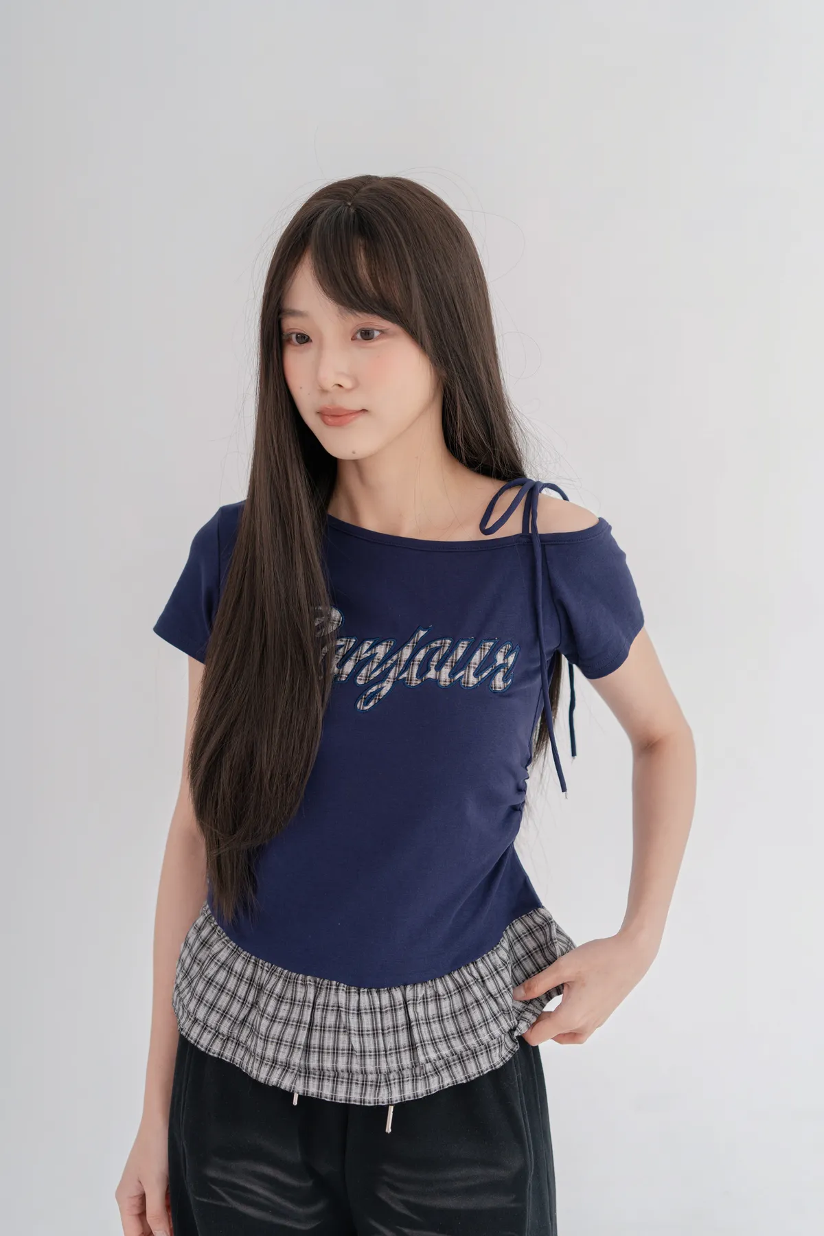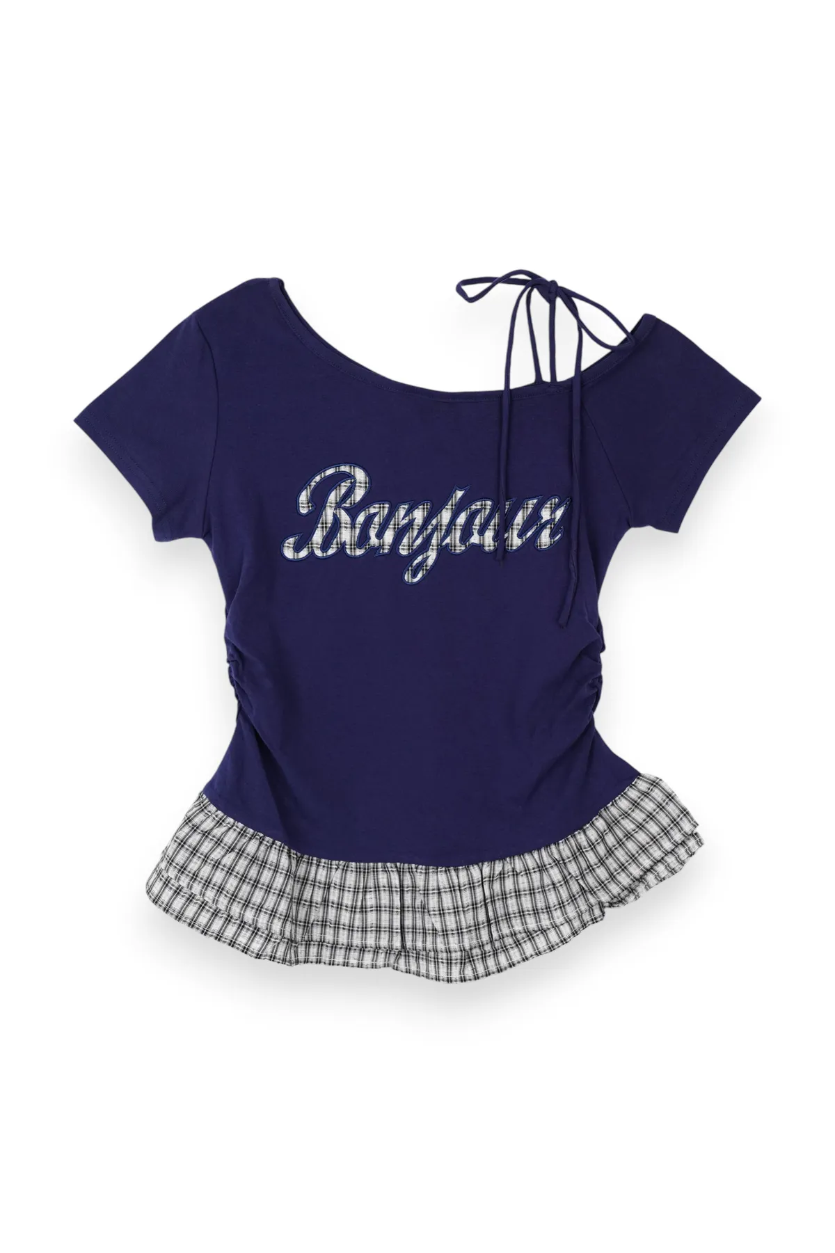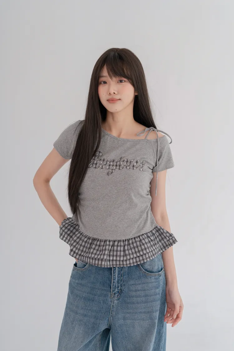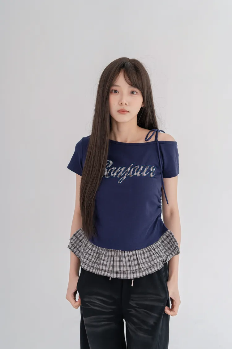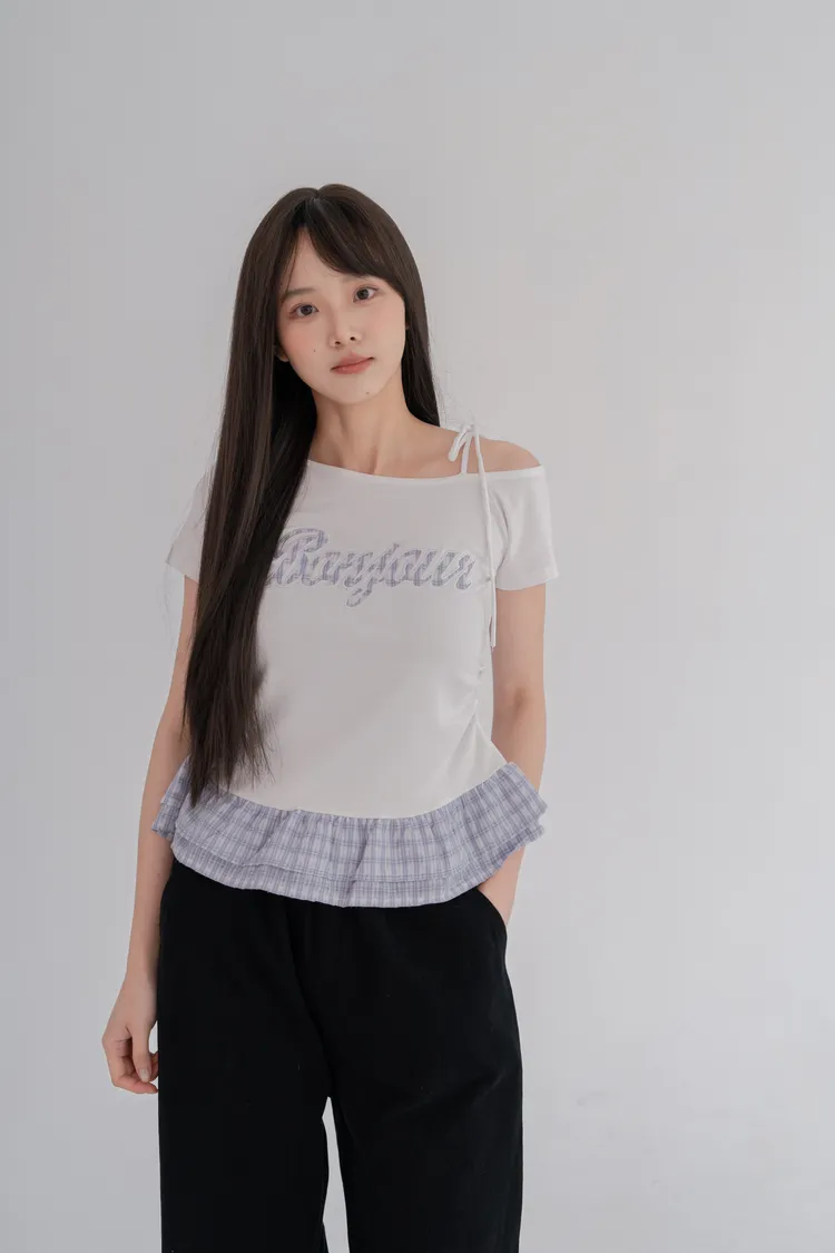 格紋拼接斜肩綁繩上衣