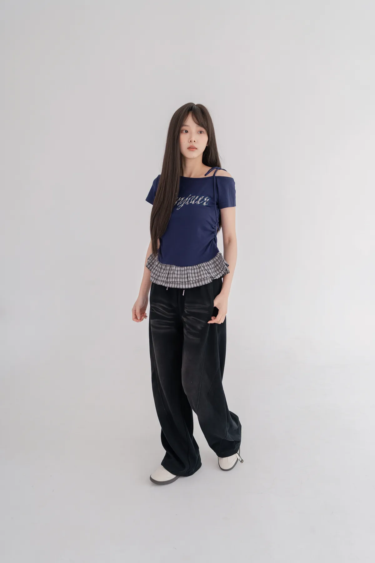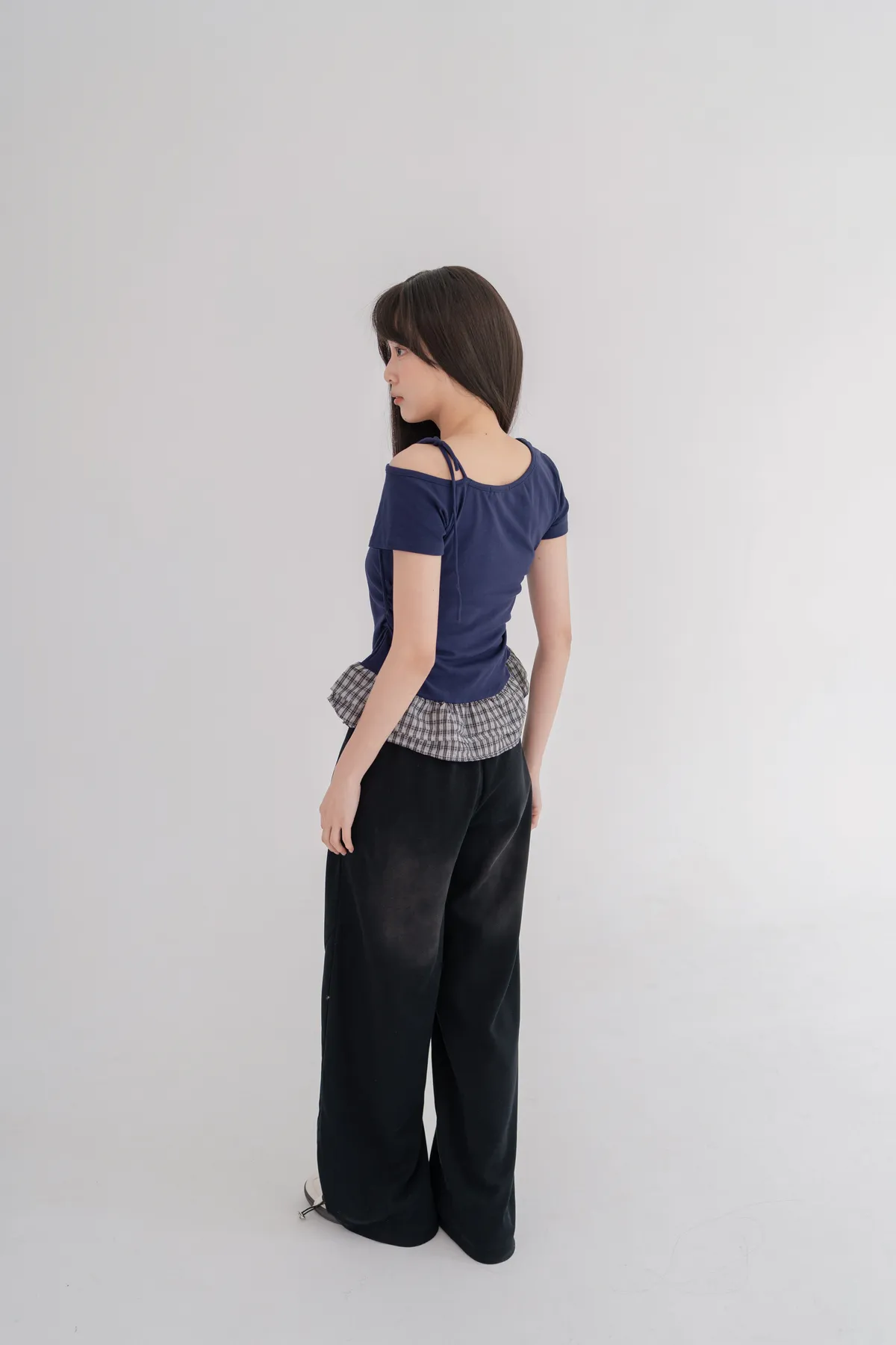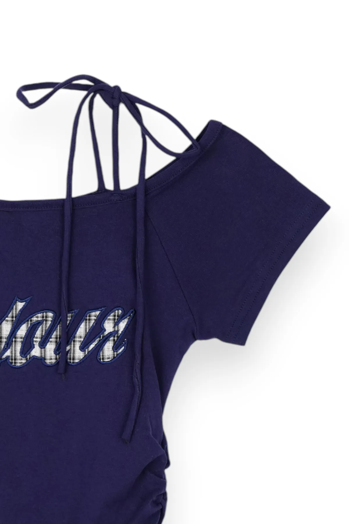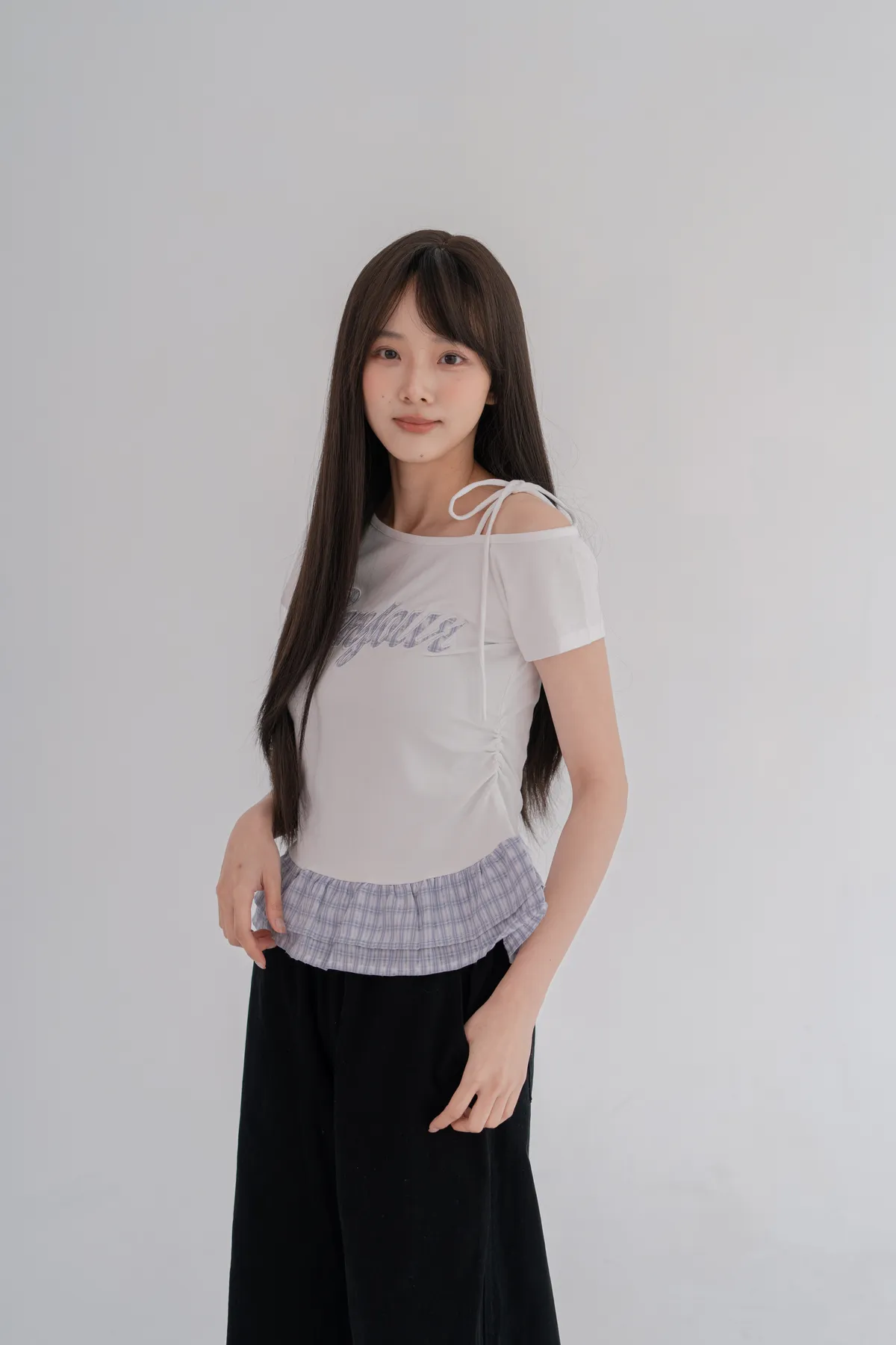 格紋拼接斜肩綁繩上衣