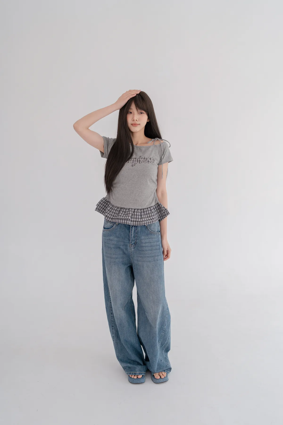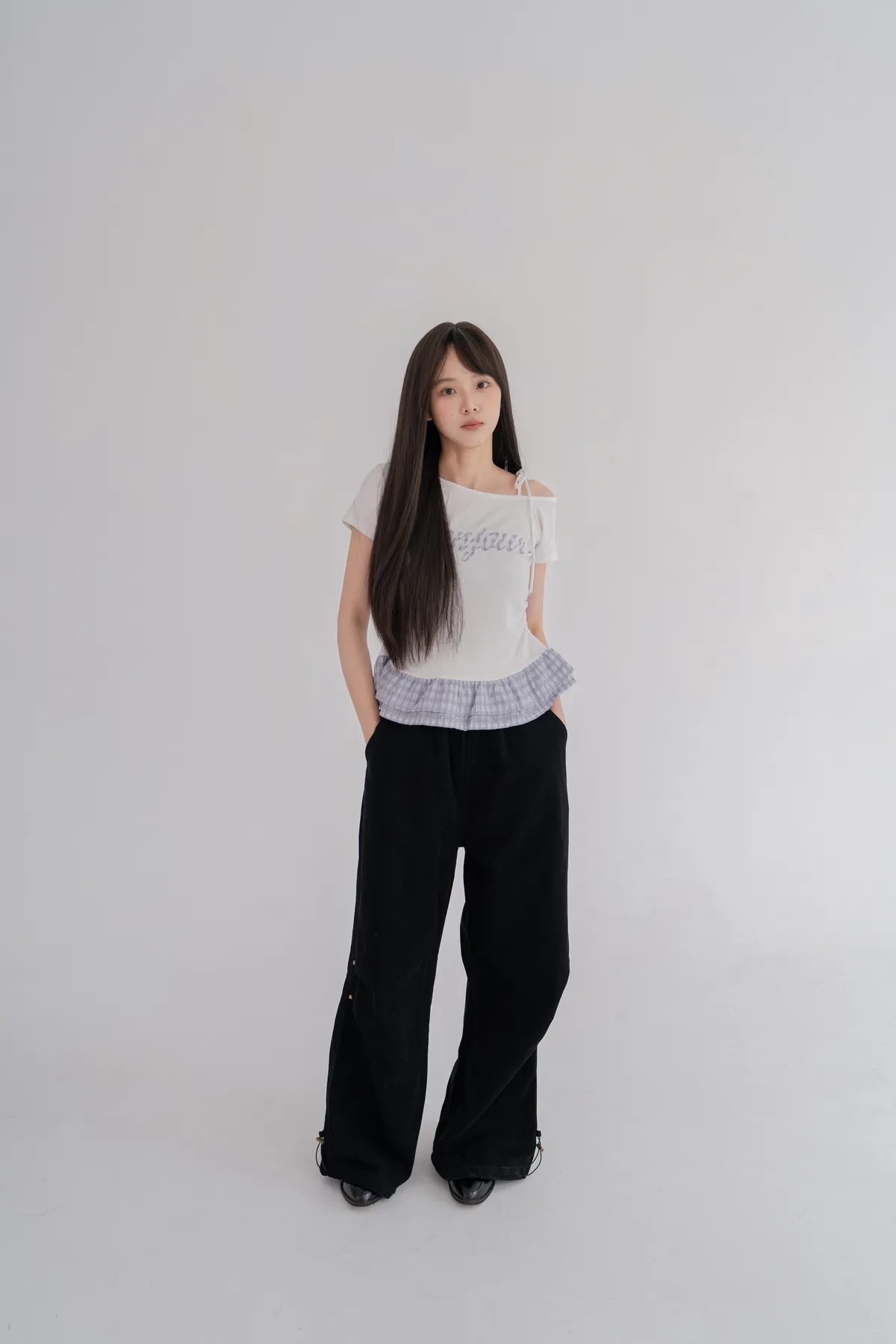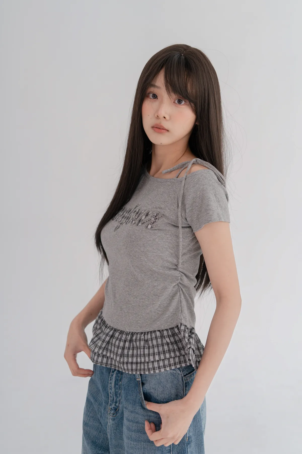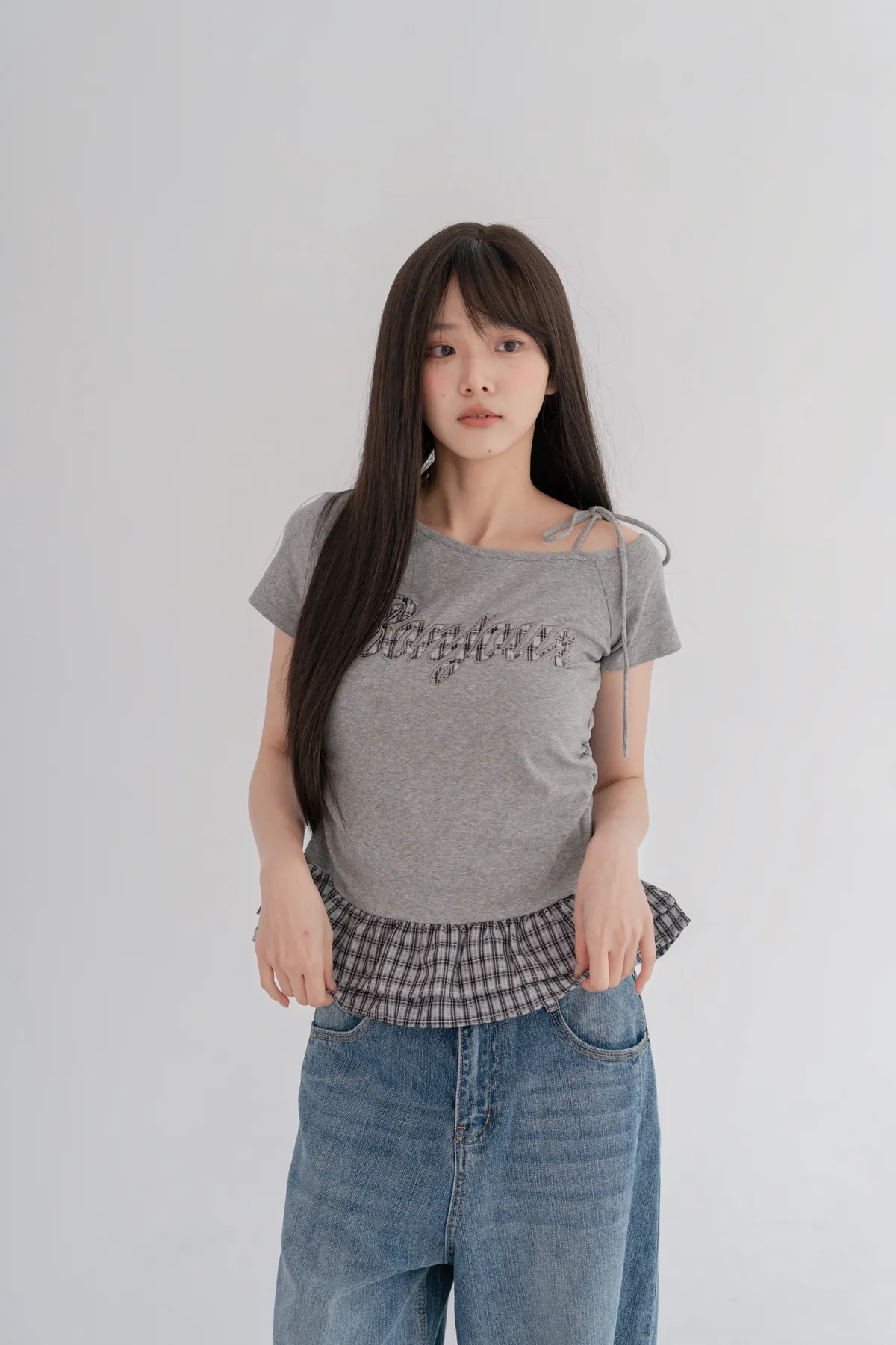 *下擺層次感格紋荷葉拼接