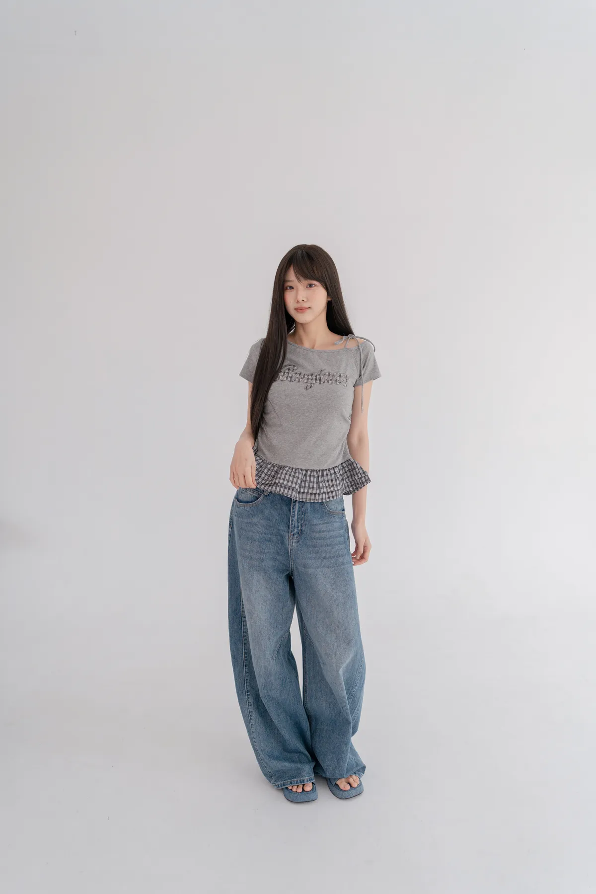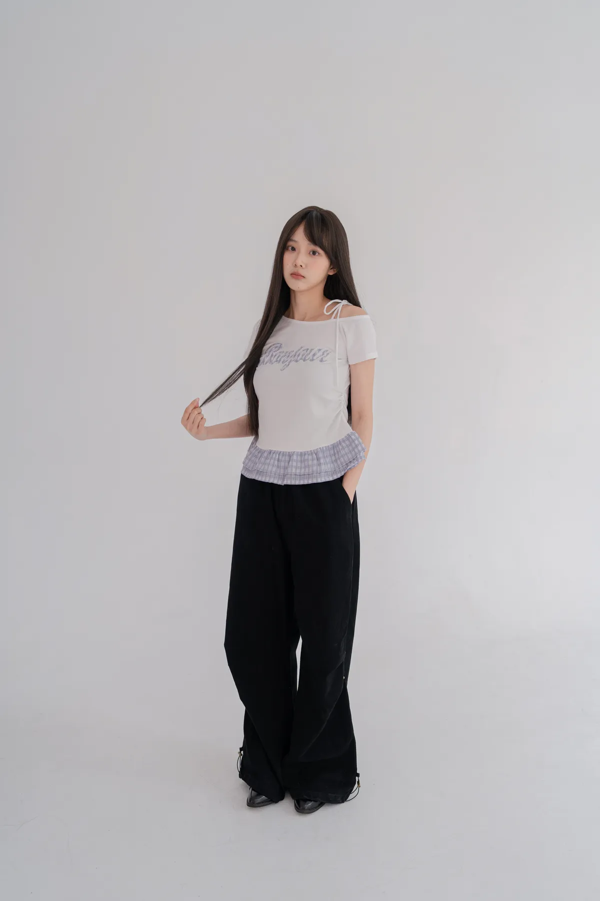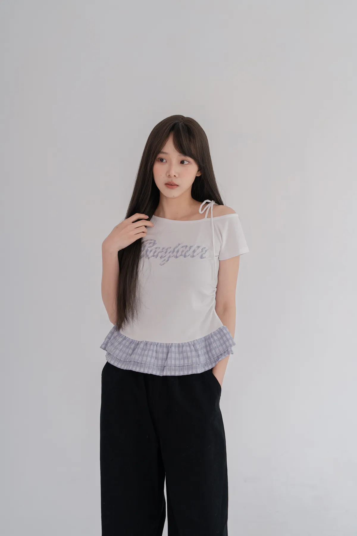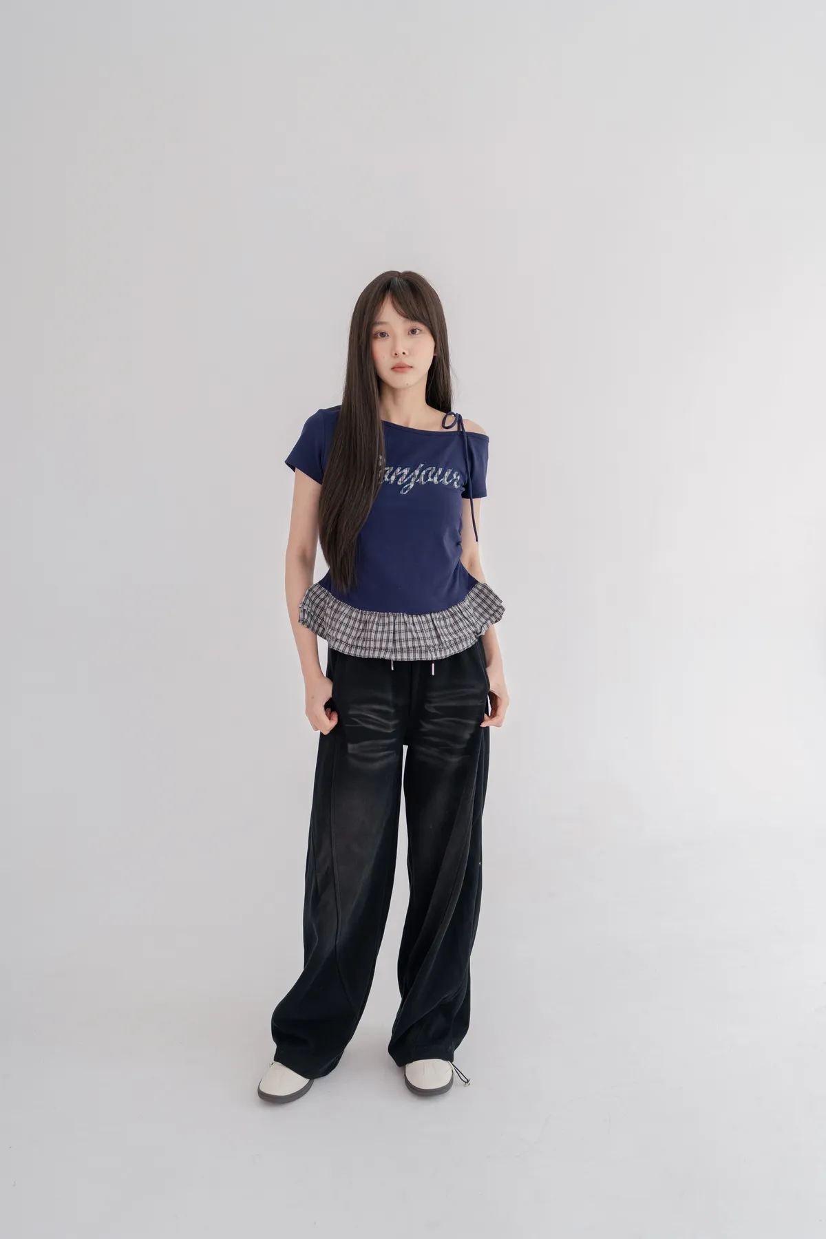 *下擺層次感格紋荷葉拼接