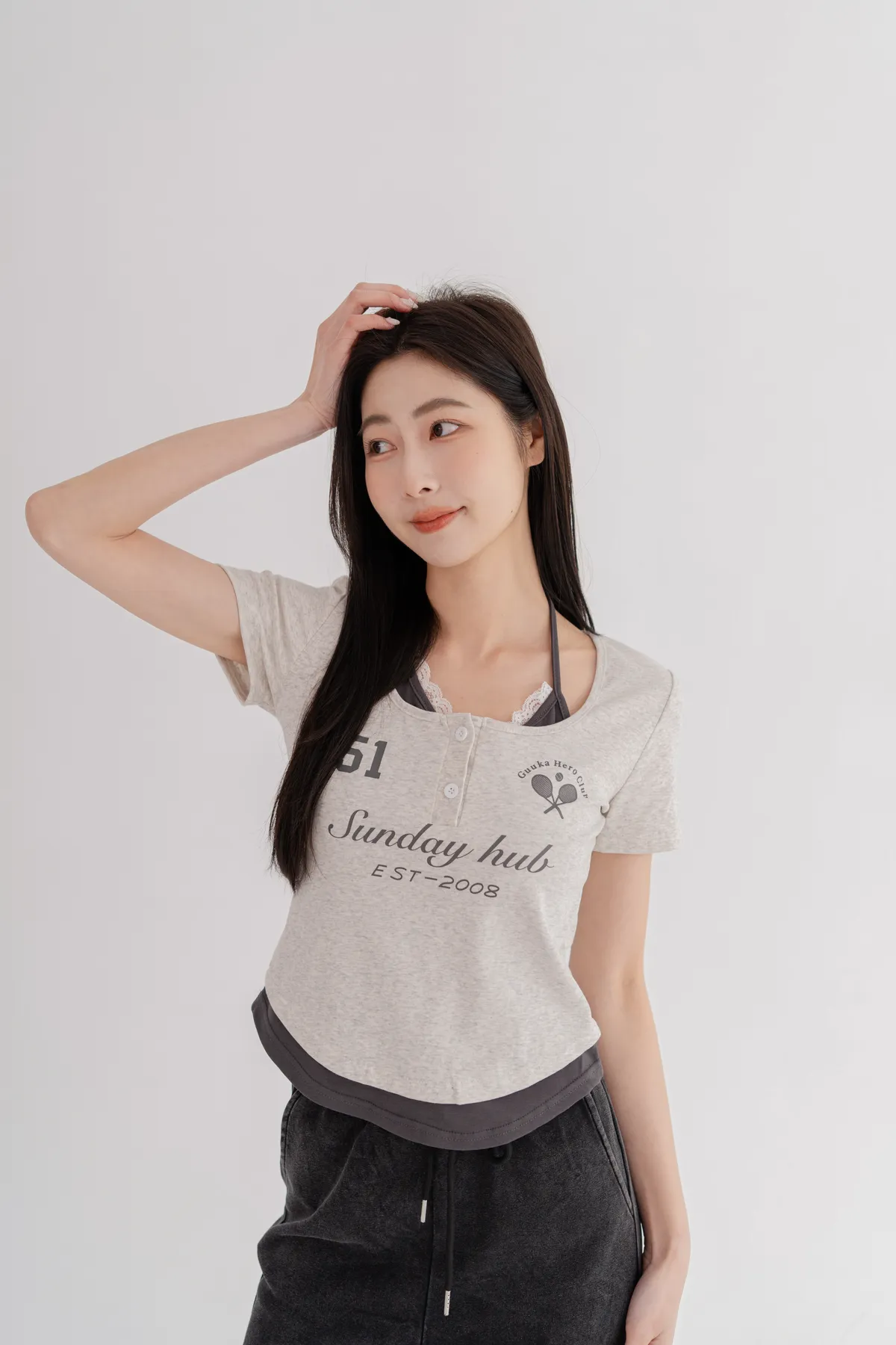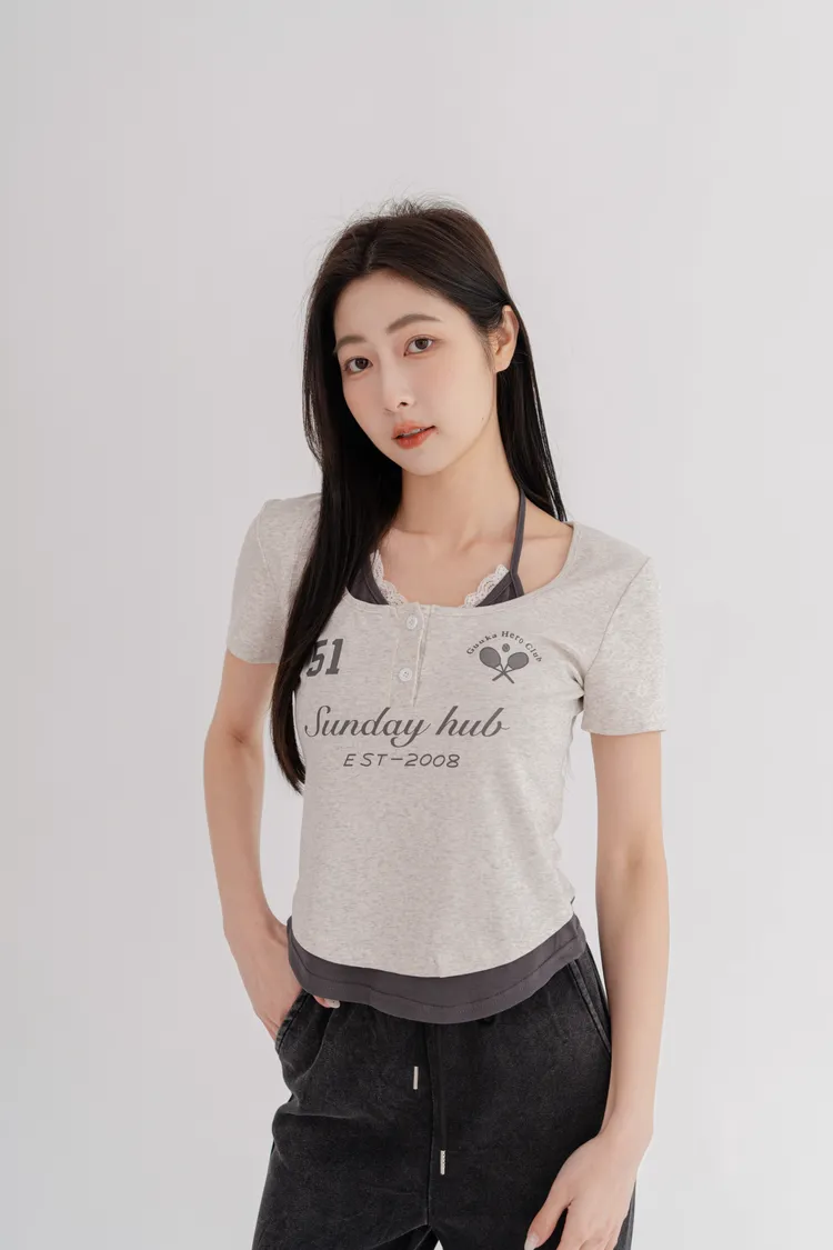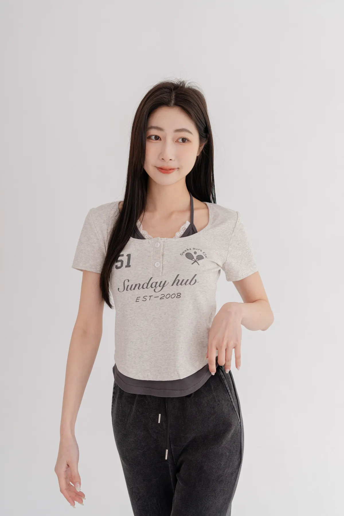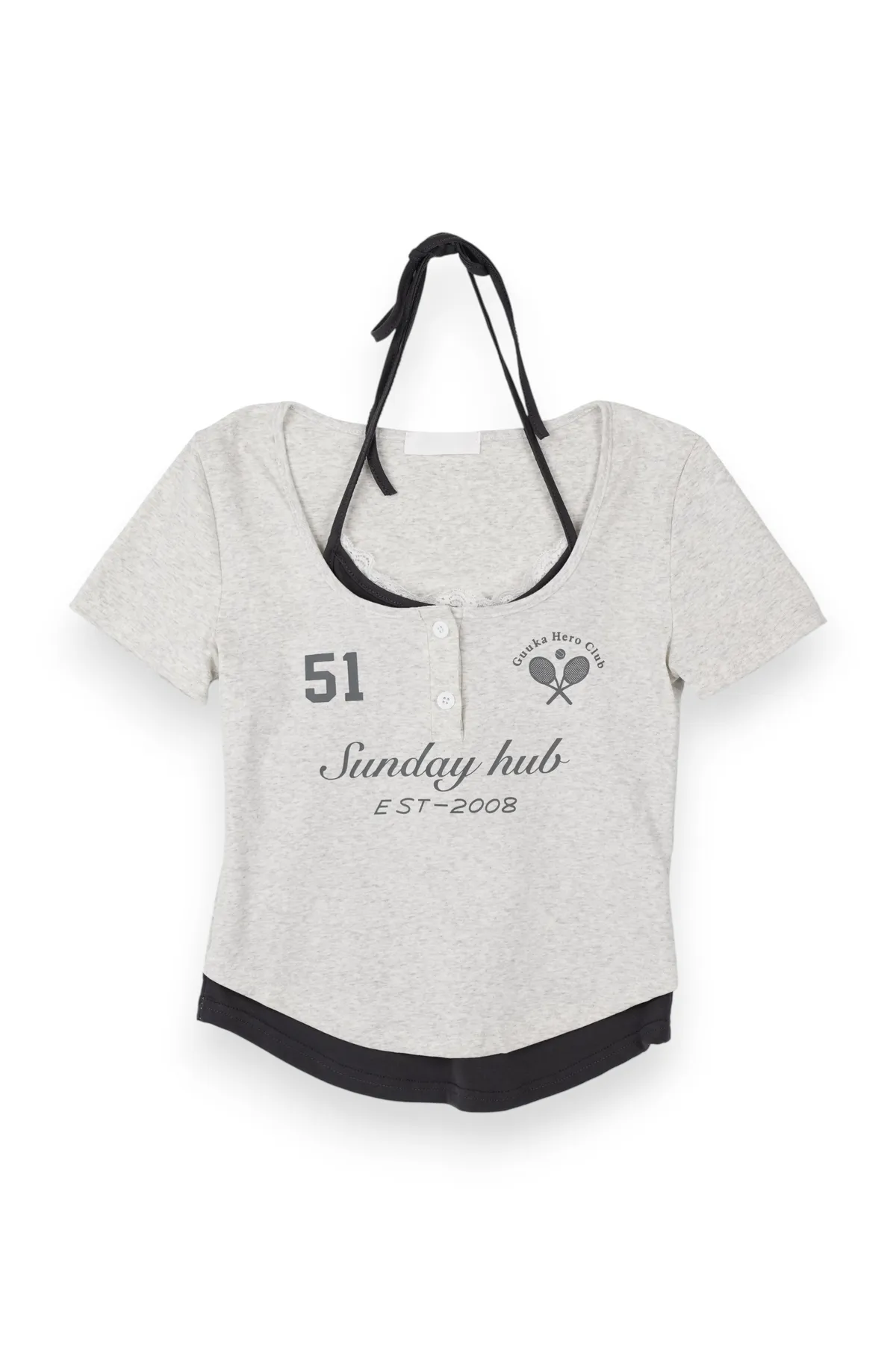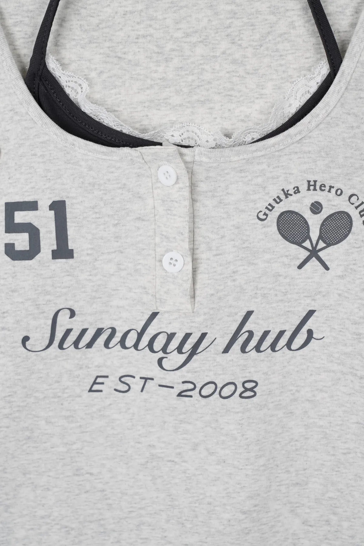 *主題學院印花: 印有「Sunday hub」字母與網球拍圖樣,強化美式復古校園氛圍。