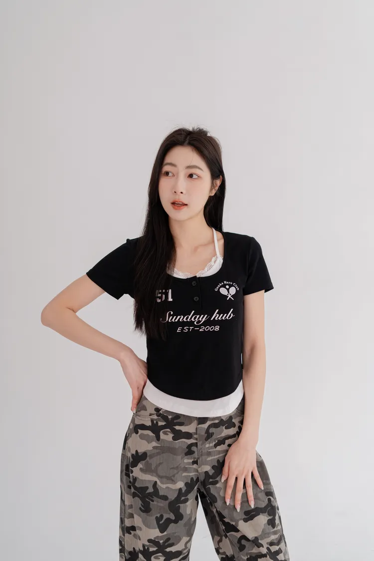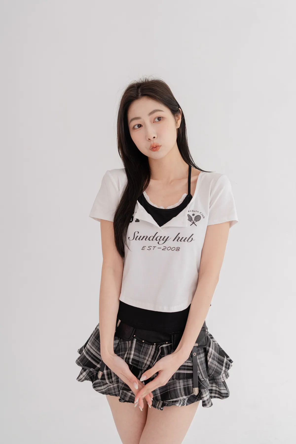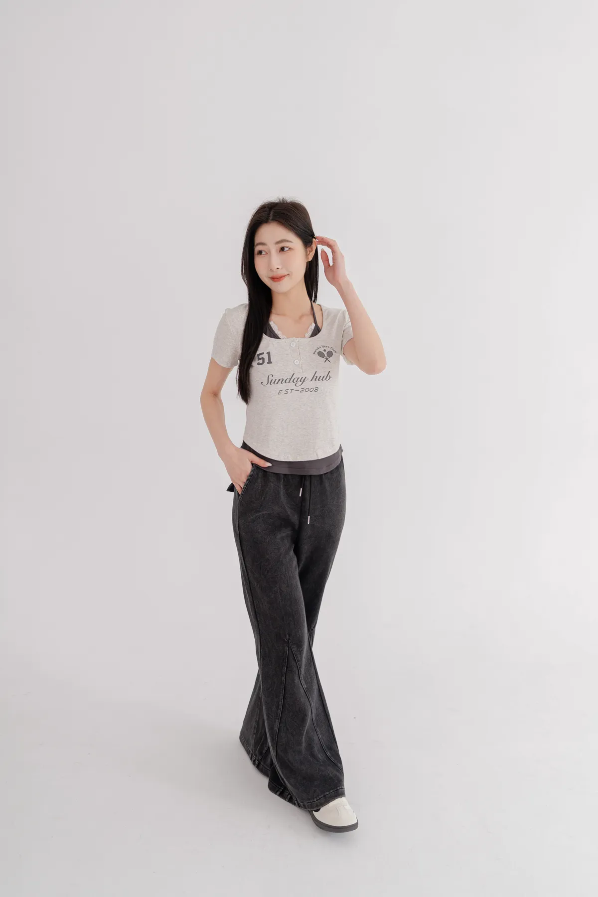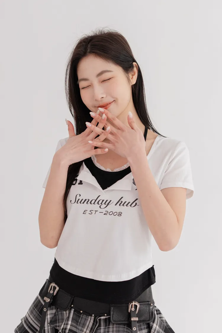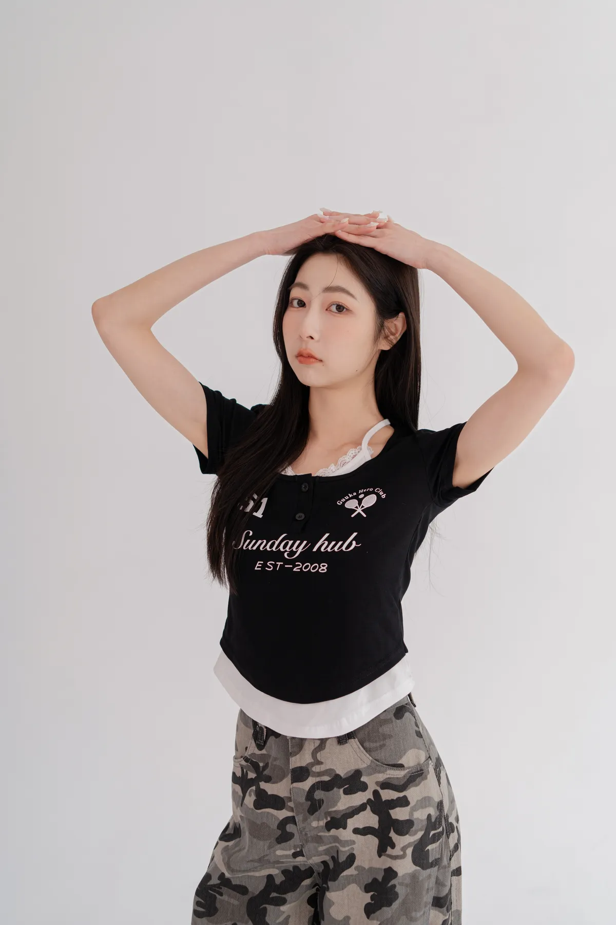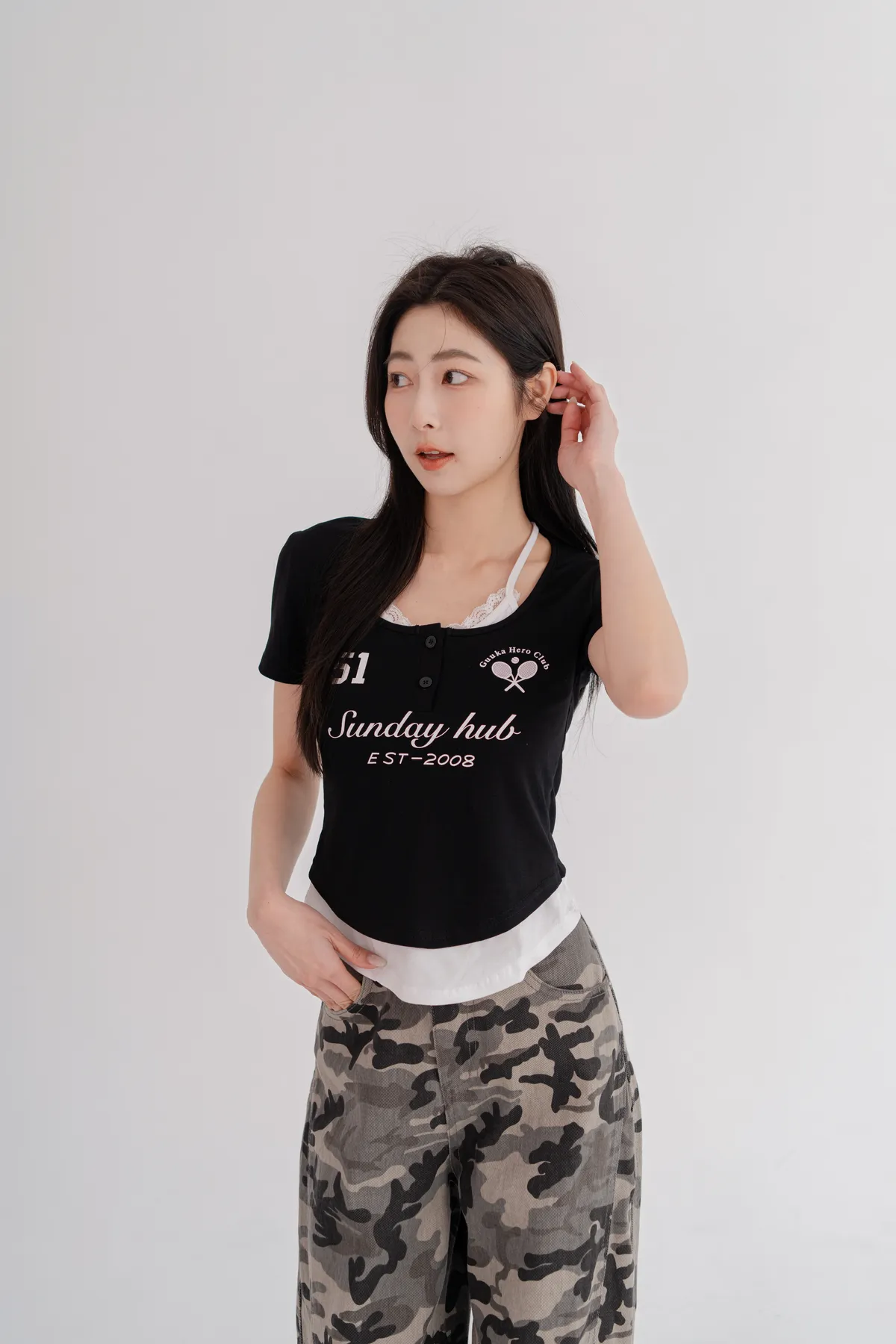 *主題學院印花: 印有「Sunday hub」字母與網球拍圖樣,強化美式復古校園氛圍。