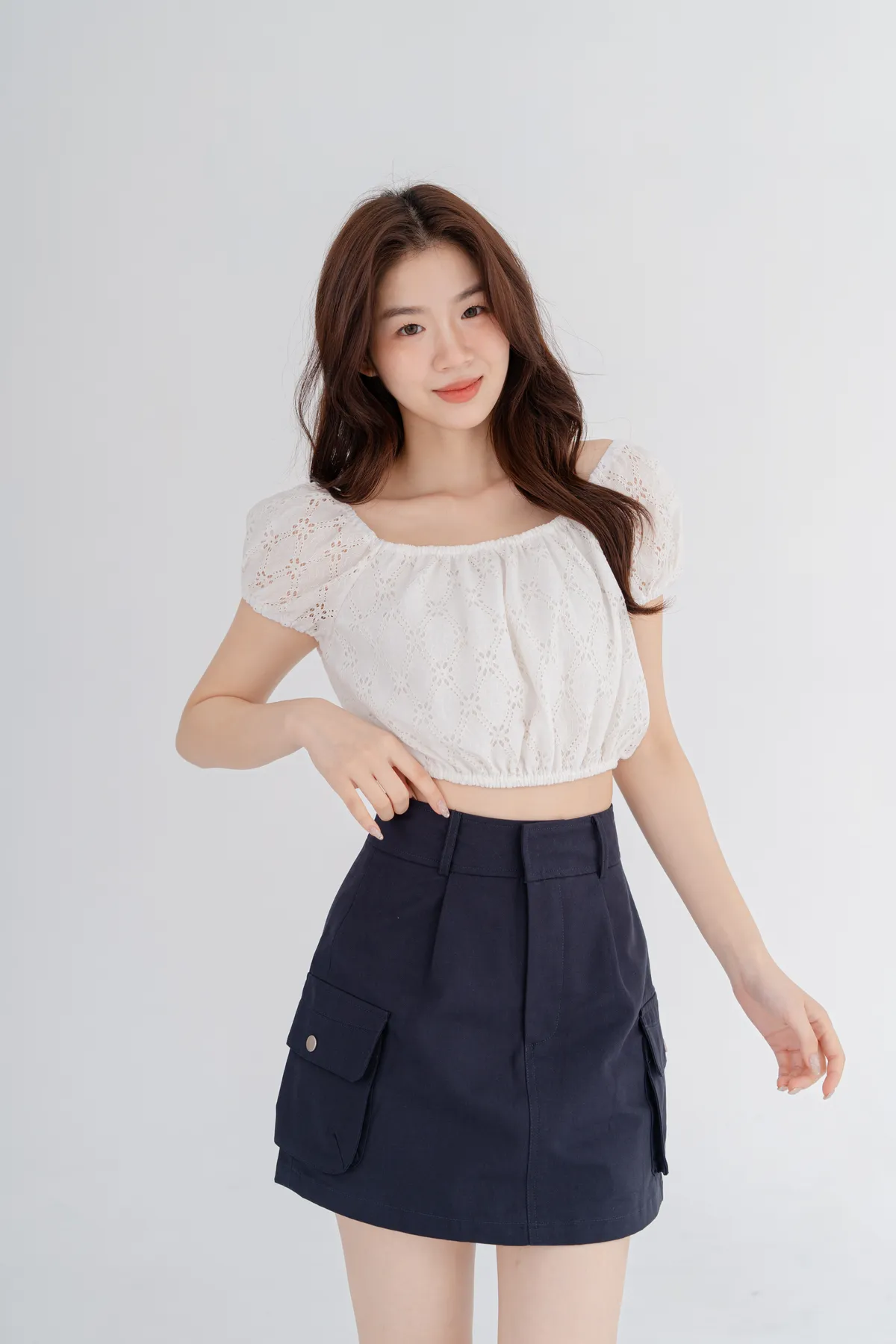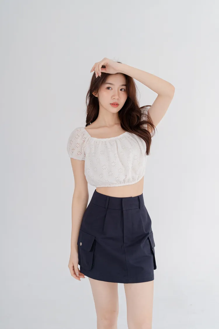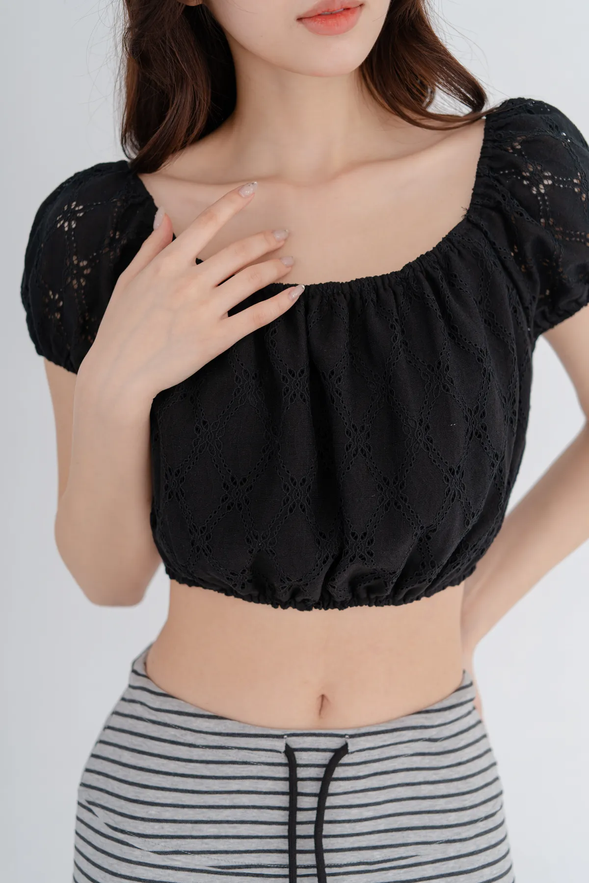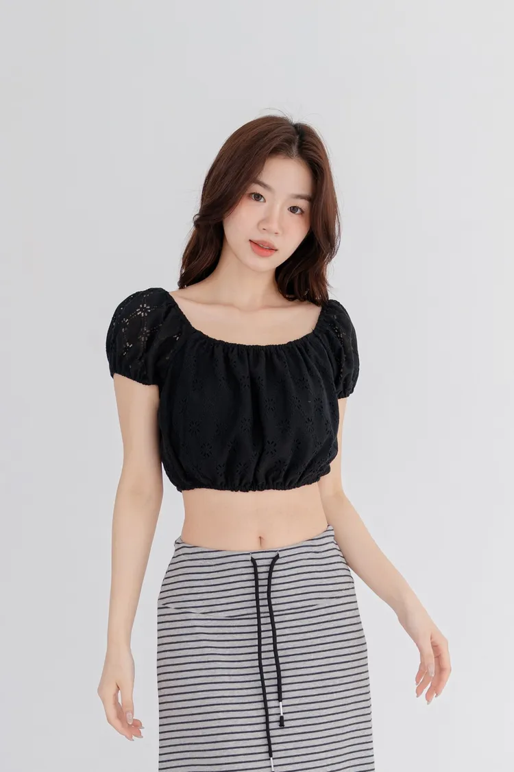 法式蕾絲雕花澎袖短上衣