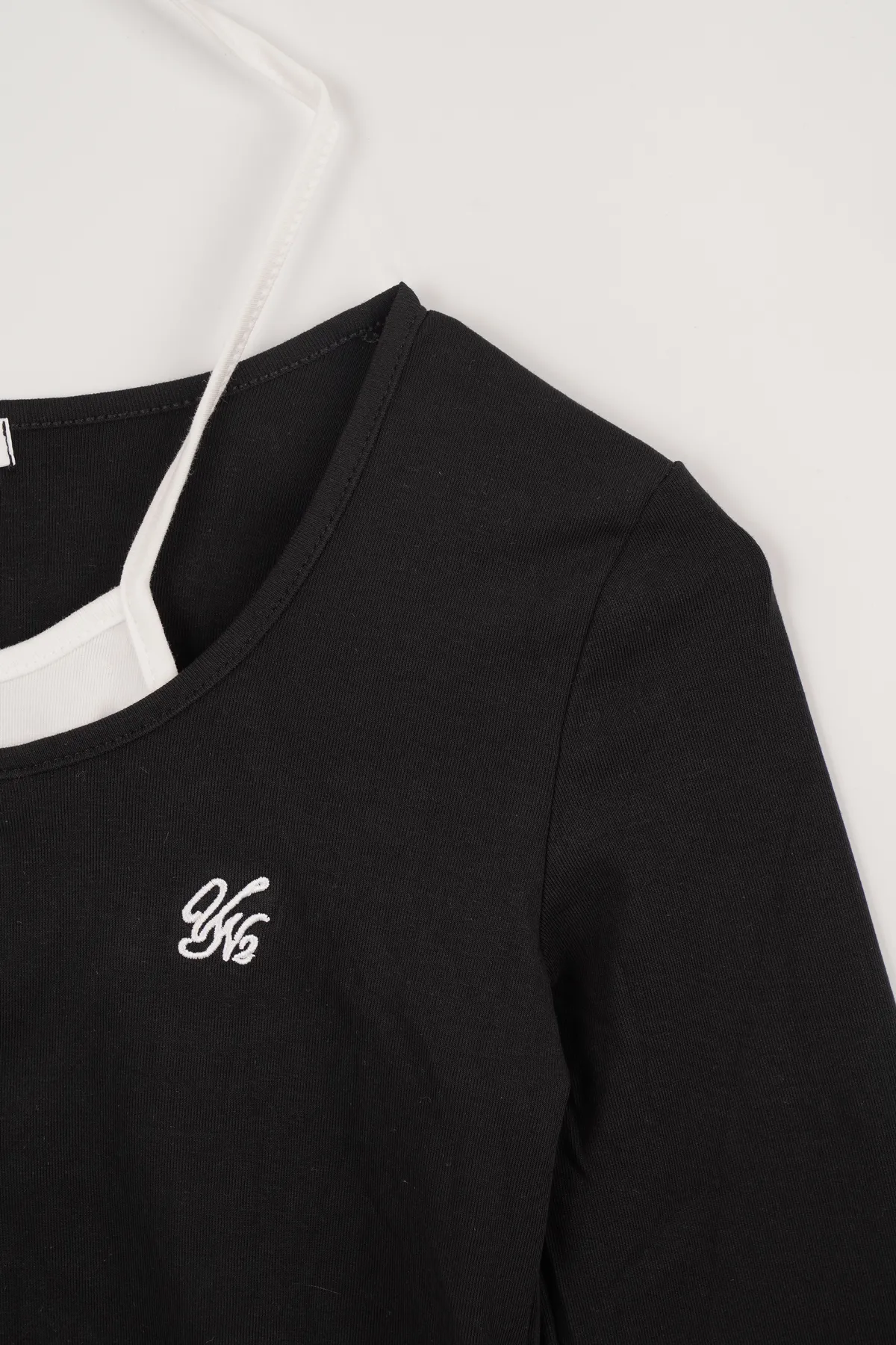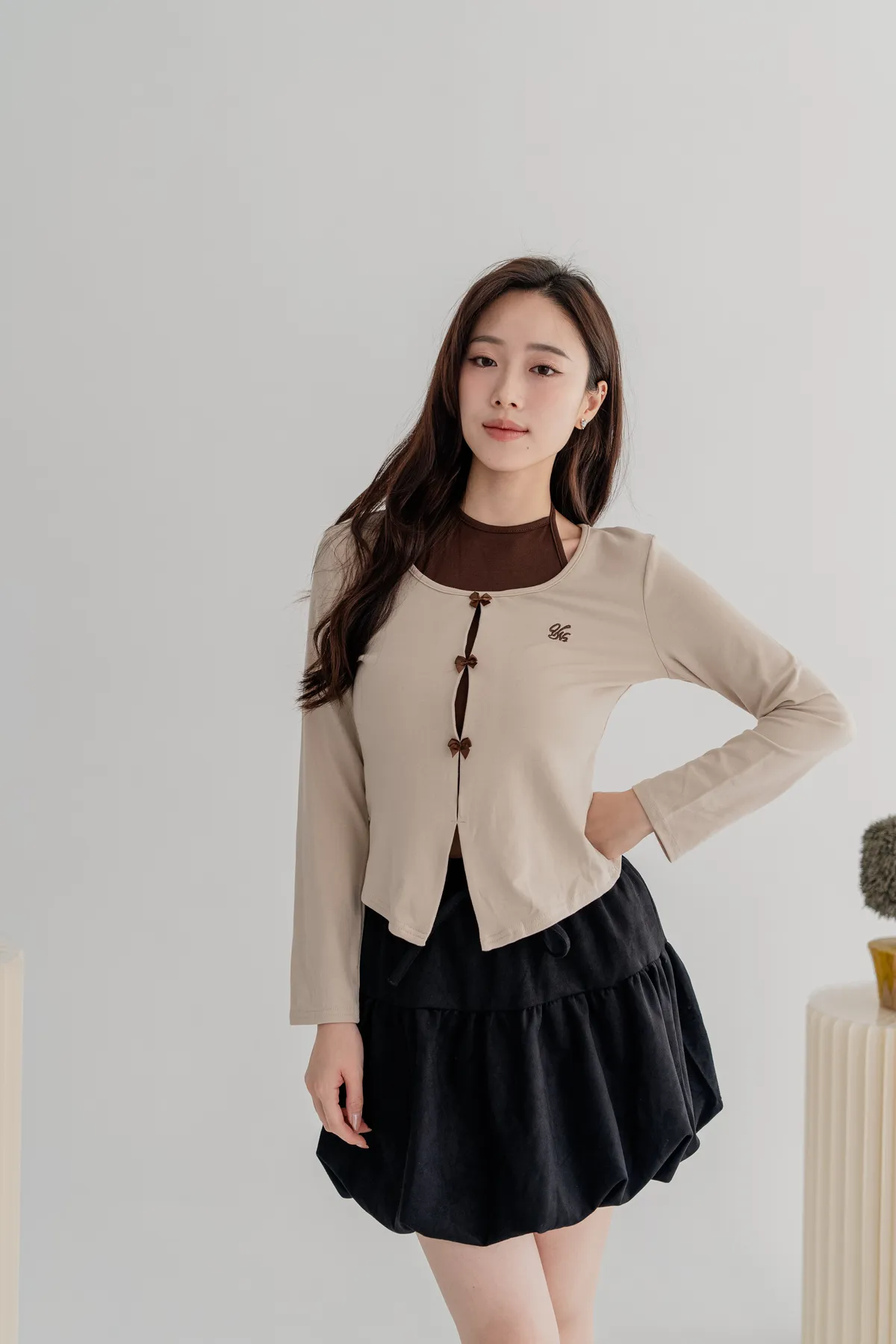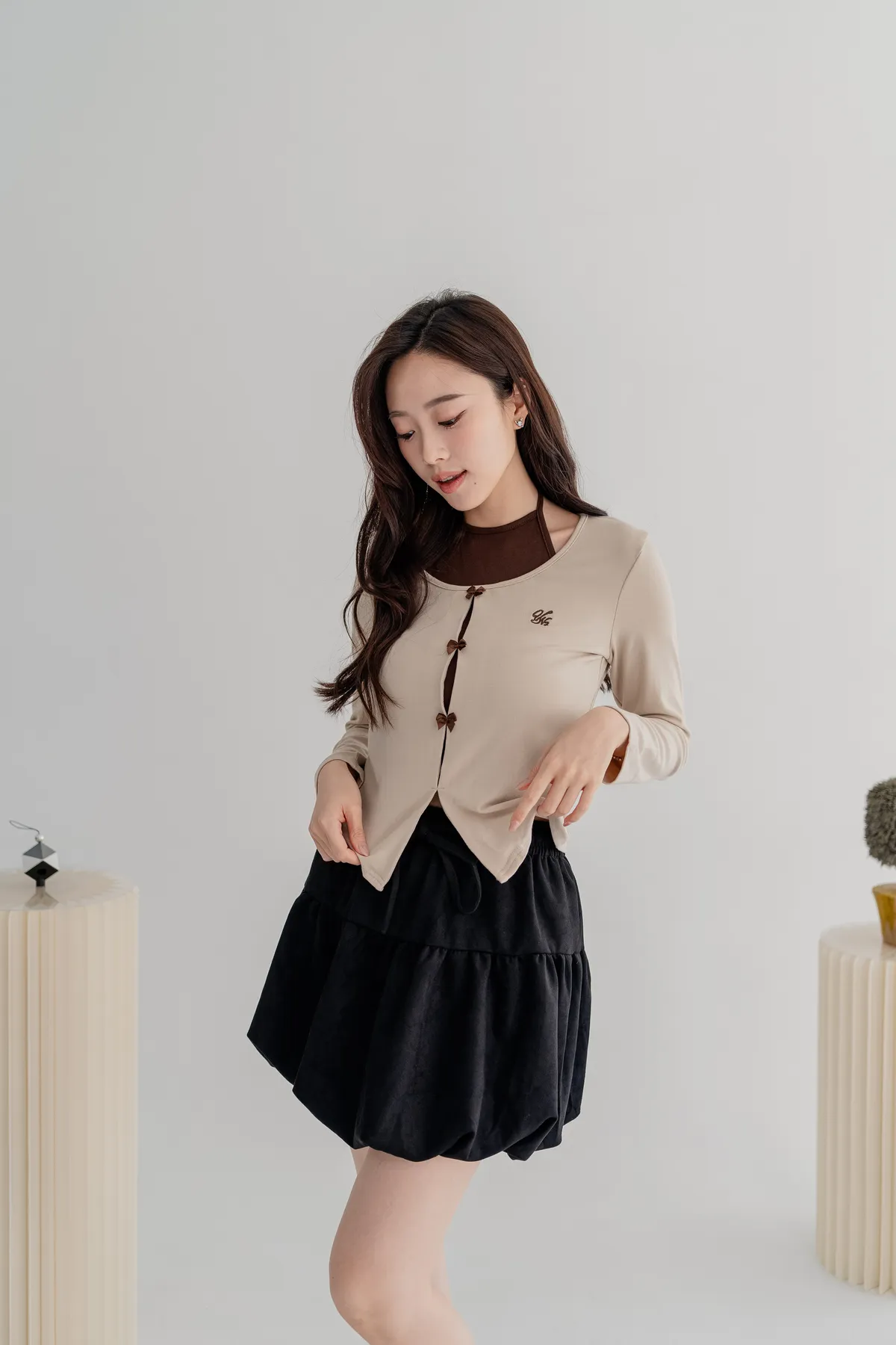 商品資訊:柔軟彈力針織布料,舒適親膚,微短版剪裁,修飾腰線比例,假內搭層次設計,輕鬆穿出造型感