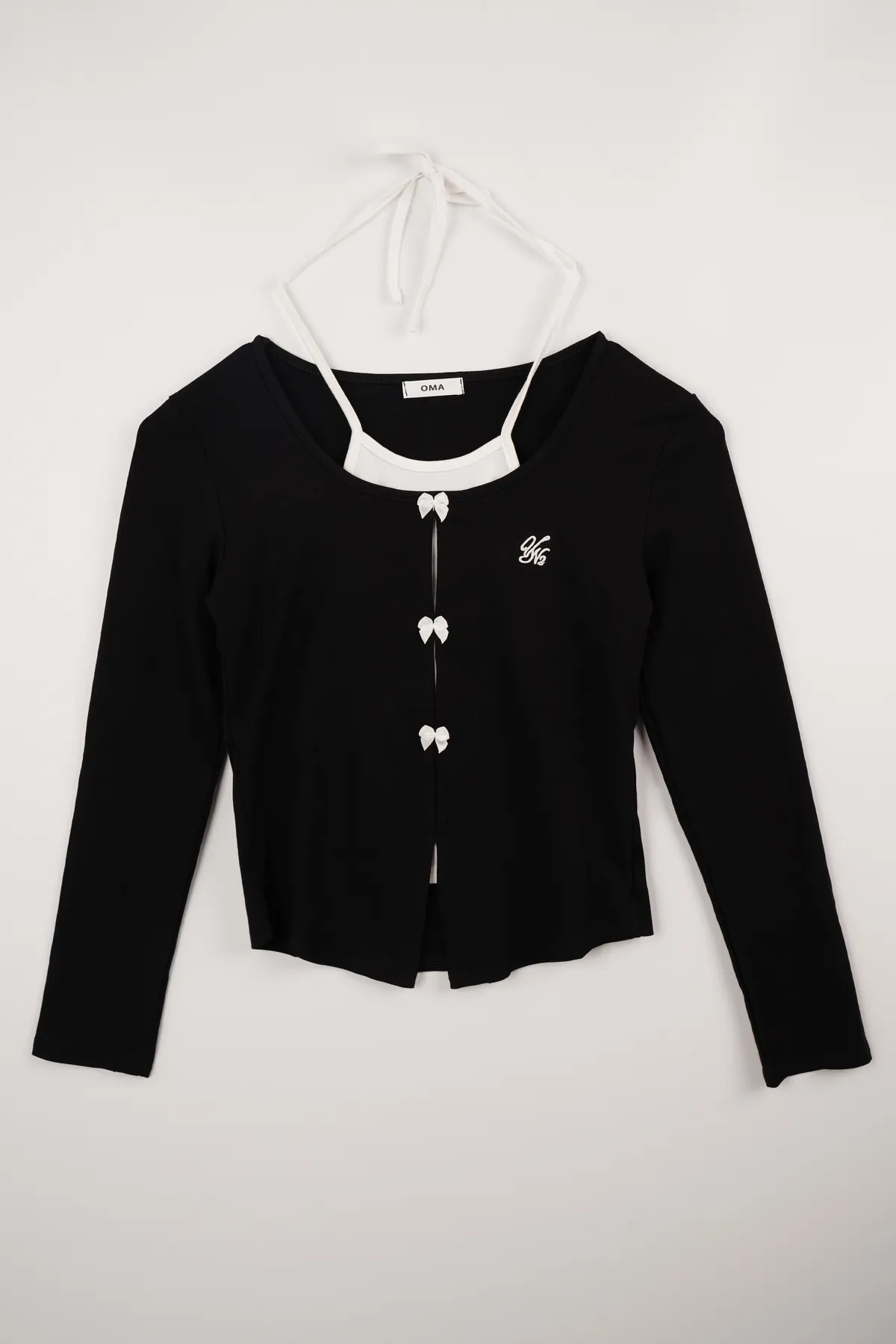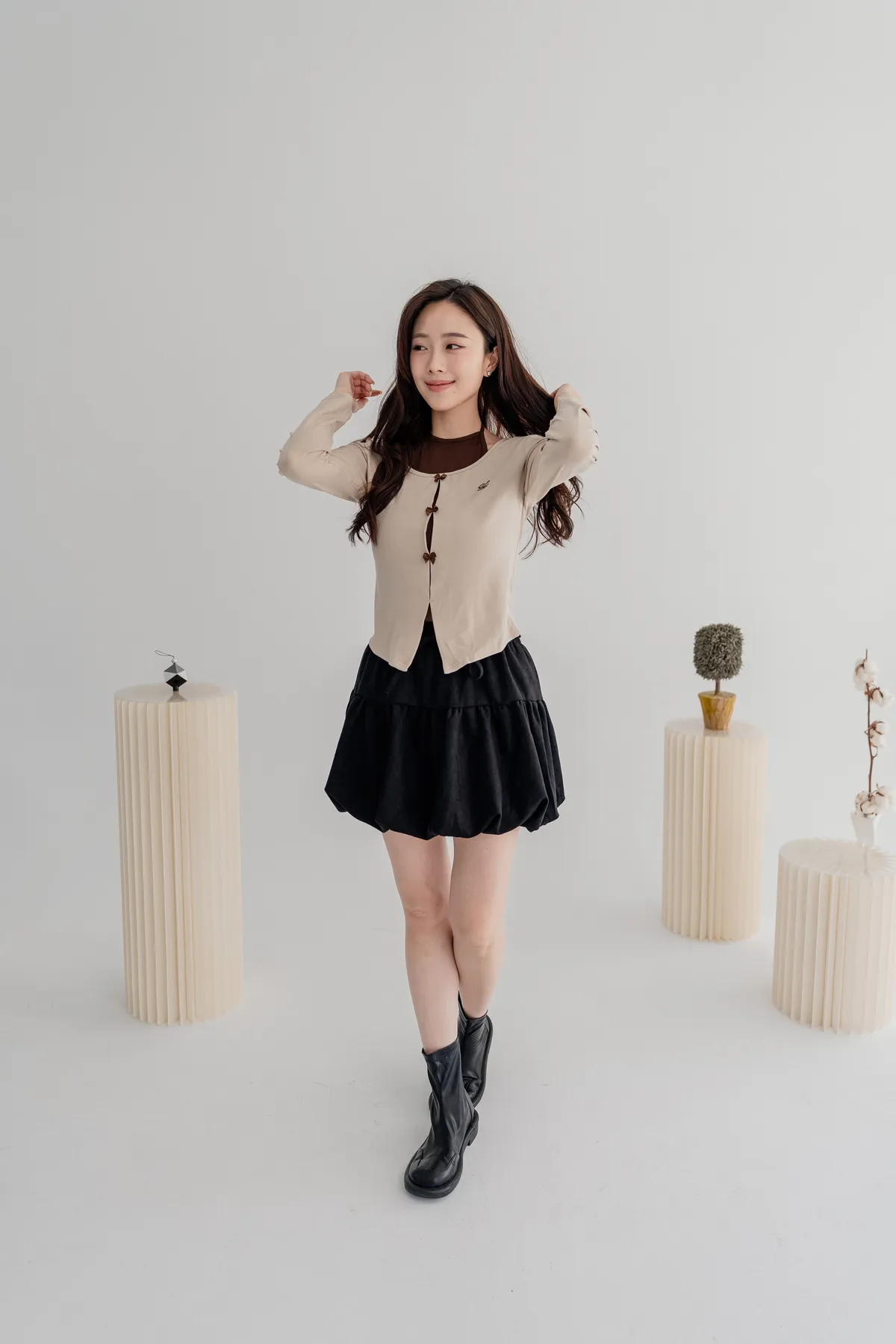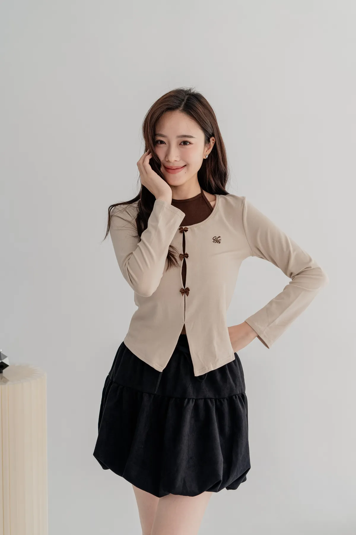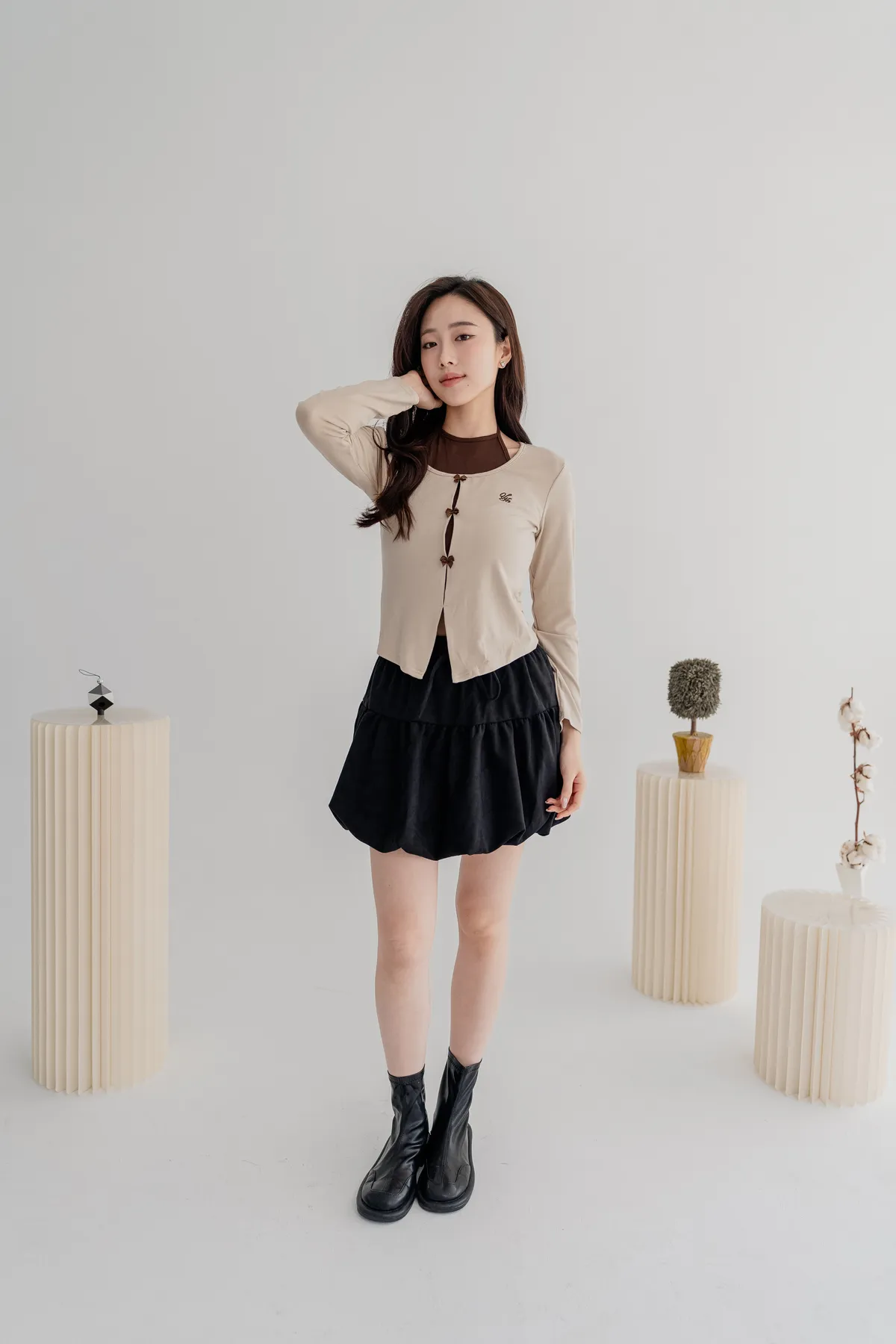 商品資訊:柔軟彈力針織布料,舒適親膚,微短版剪裁,修飾腰線比例,假內搭層次設計,輕鬆穿出造型感