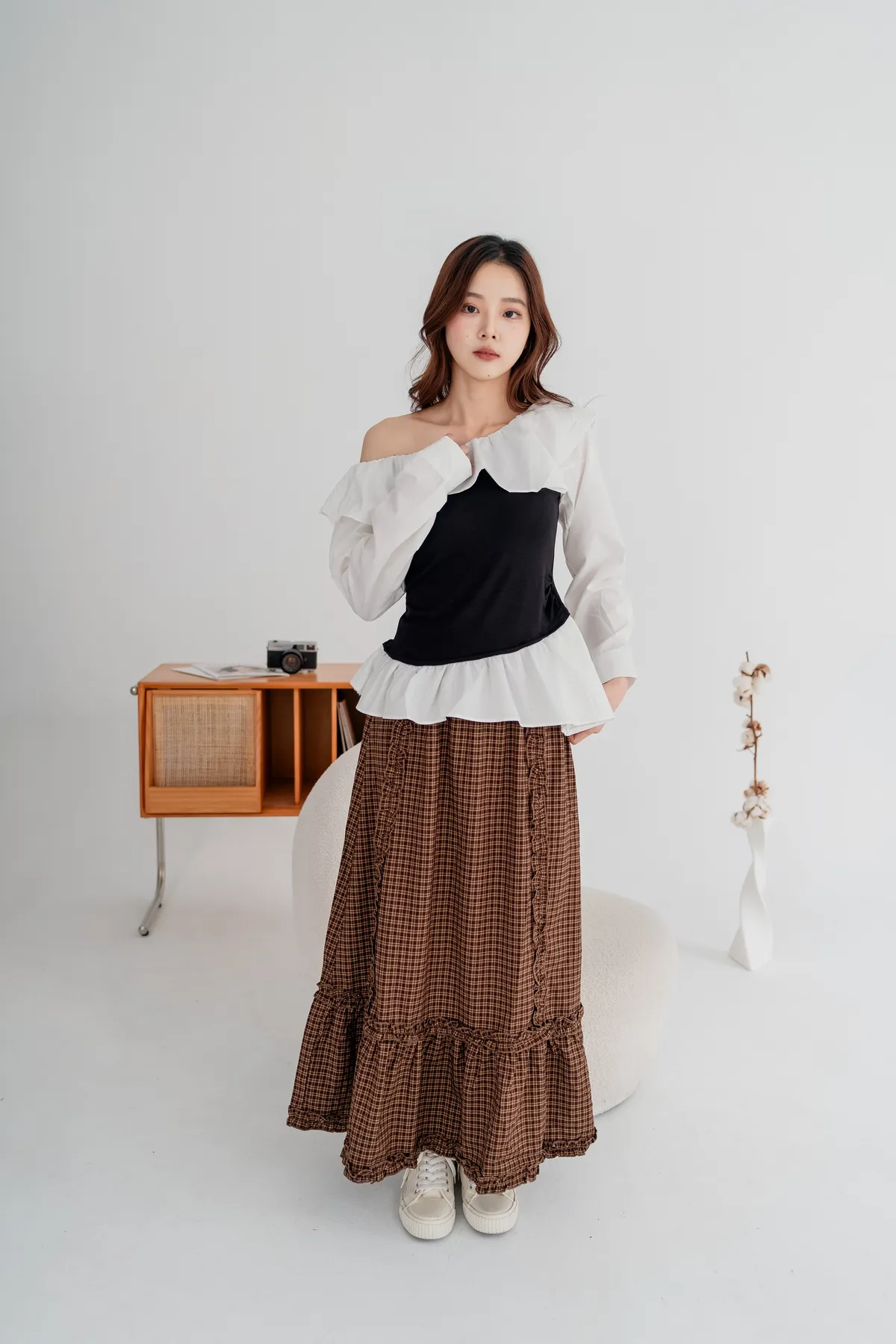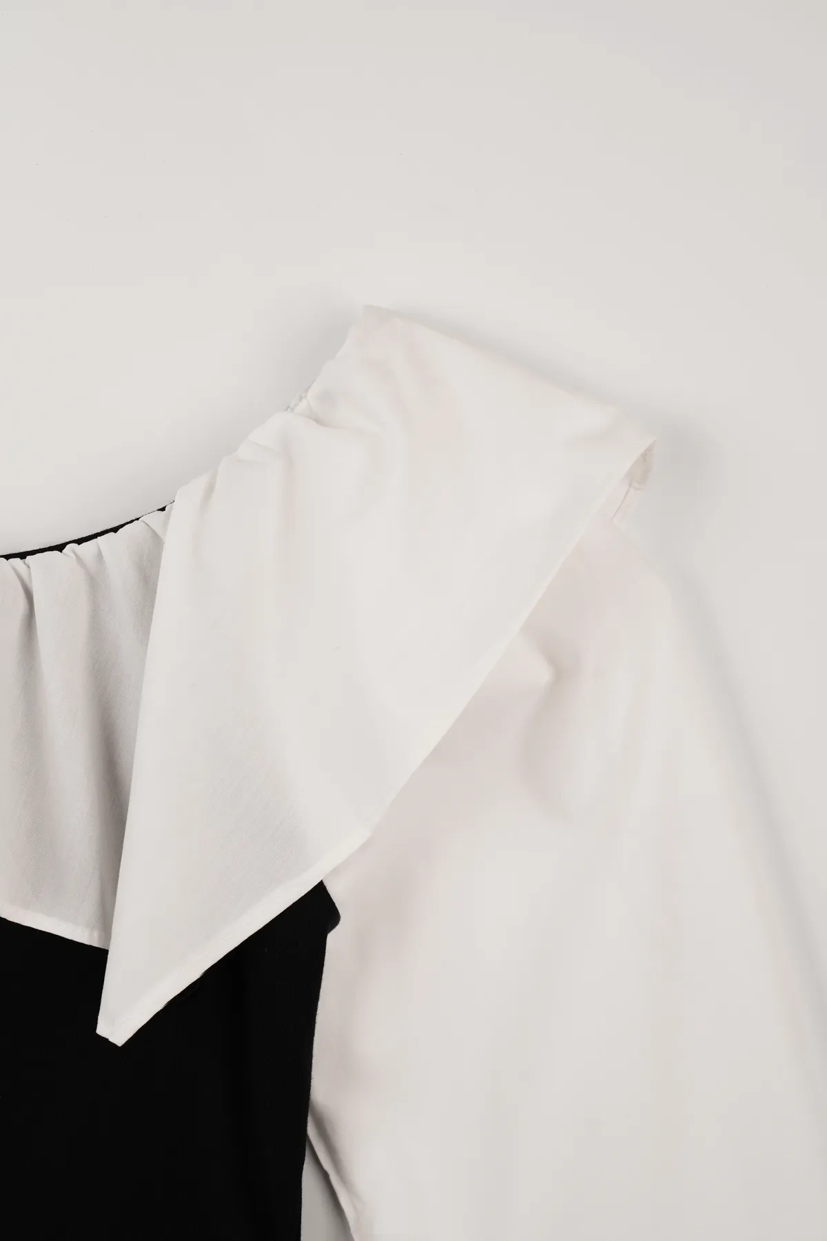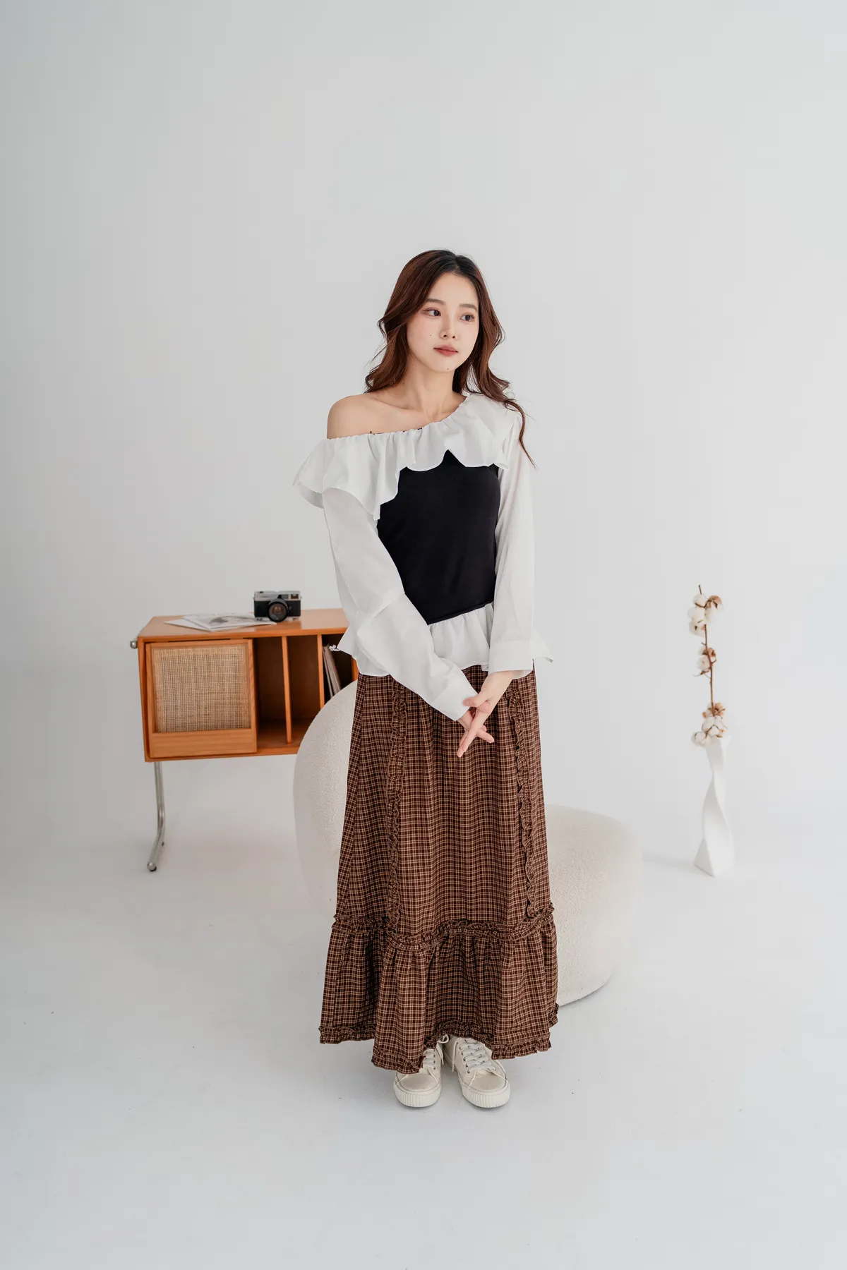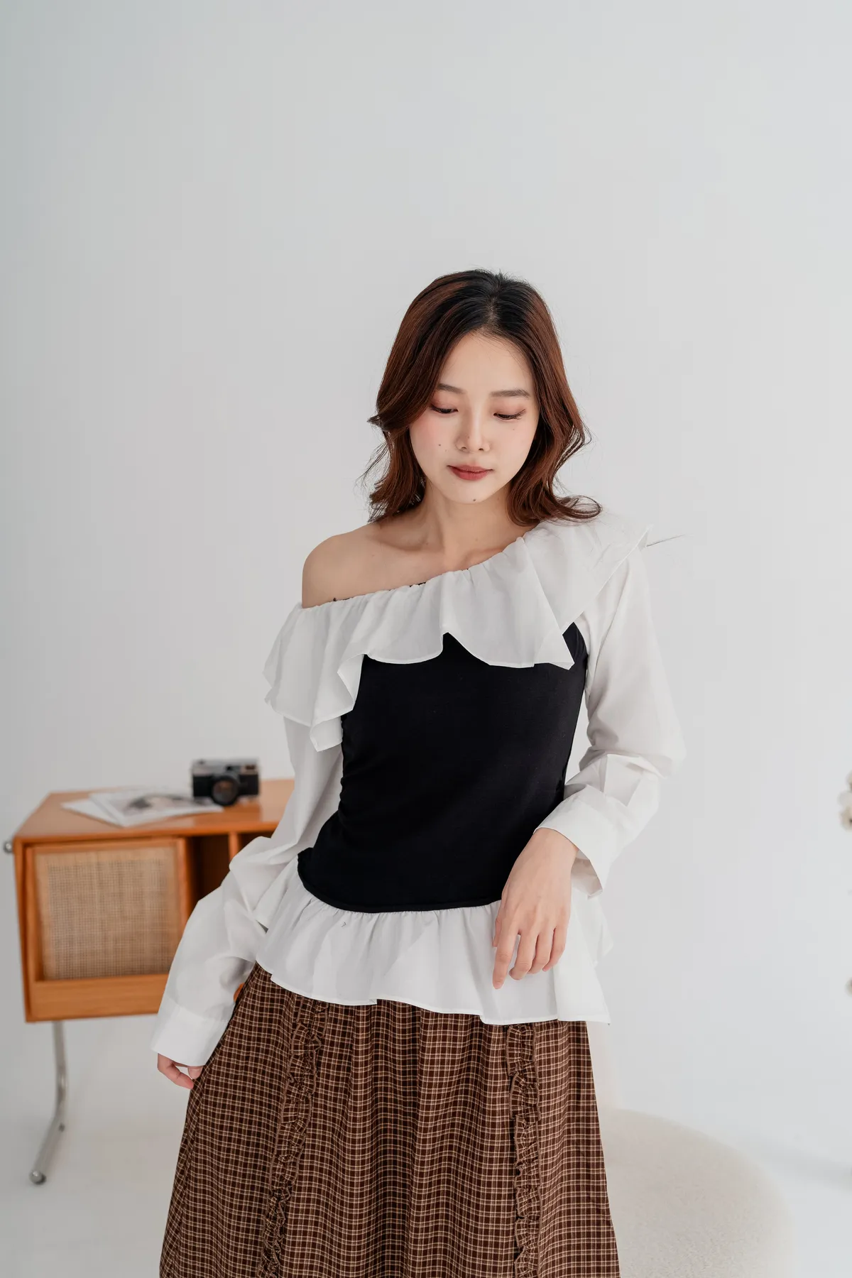 柔軟的荷葉邊環繞肩線,微露肩一字領設計剛剛好展現女性線條,下襬荷葉剪裁營造出輕盈圓弧感