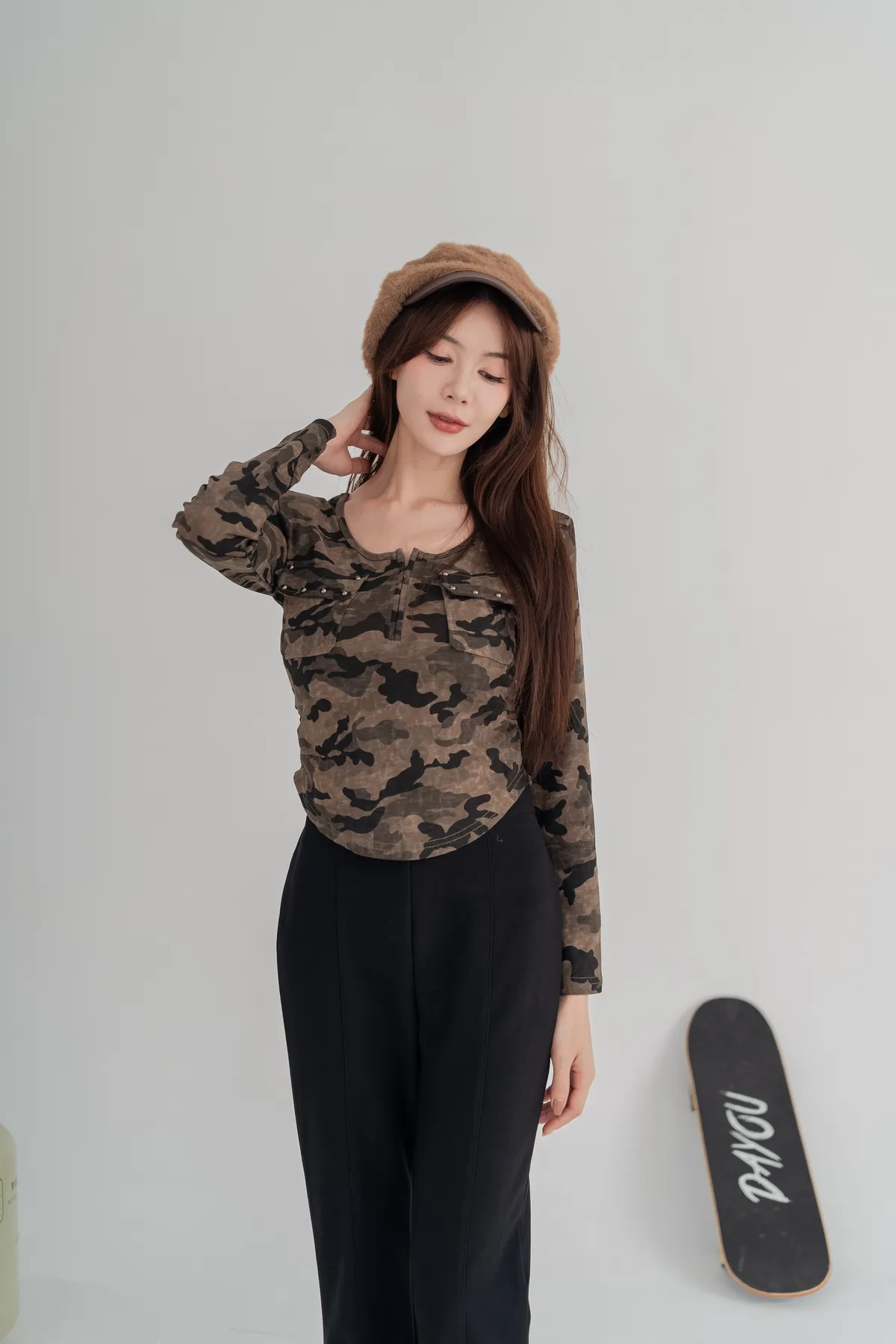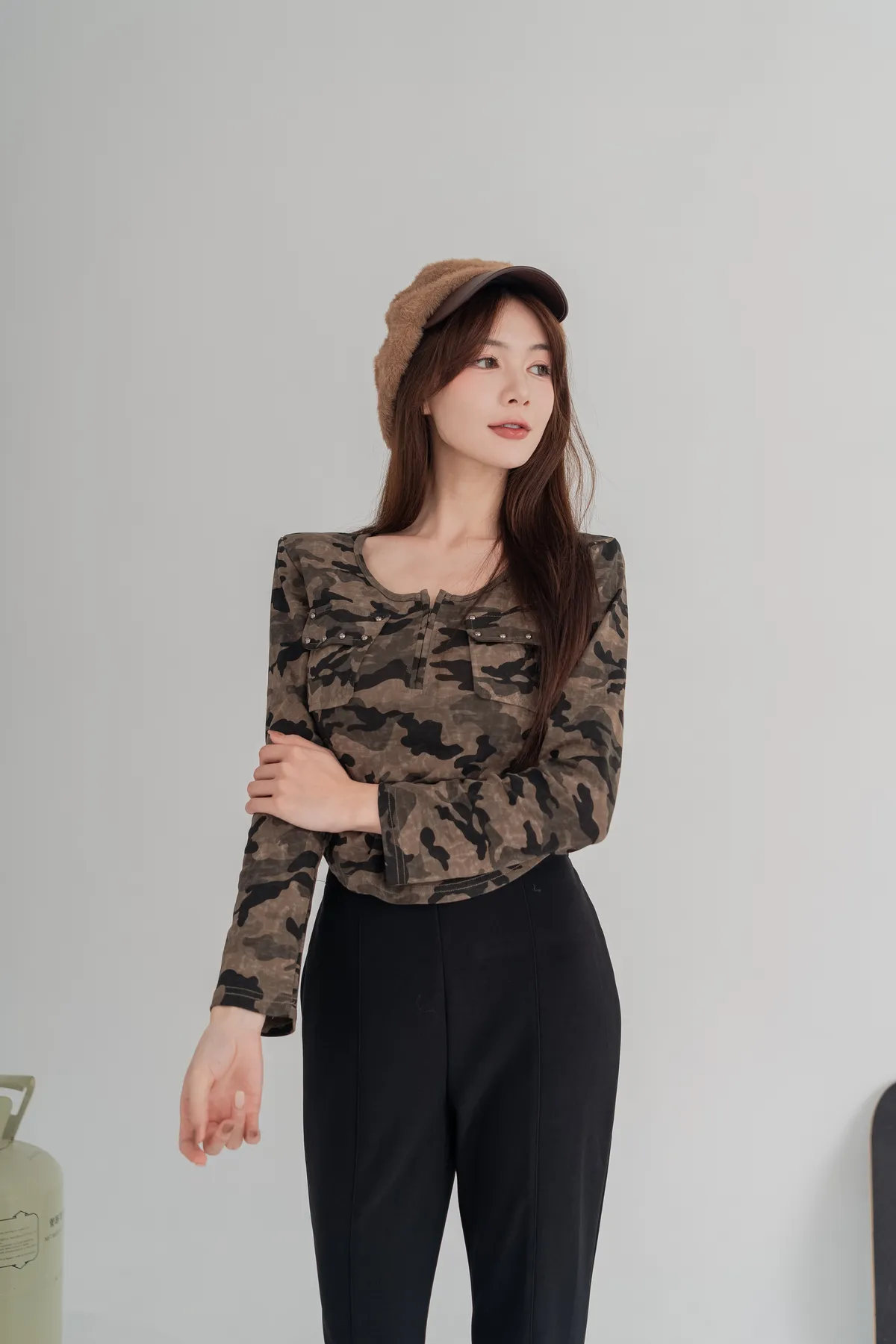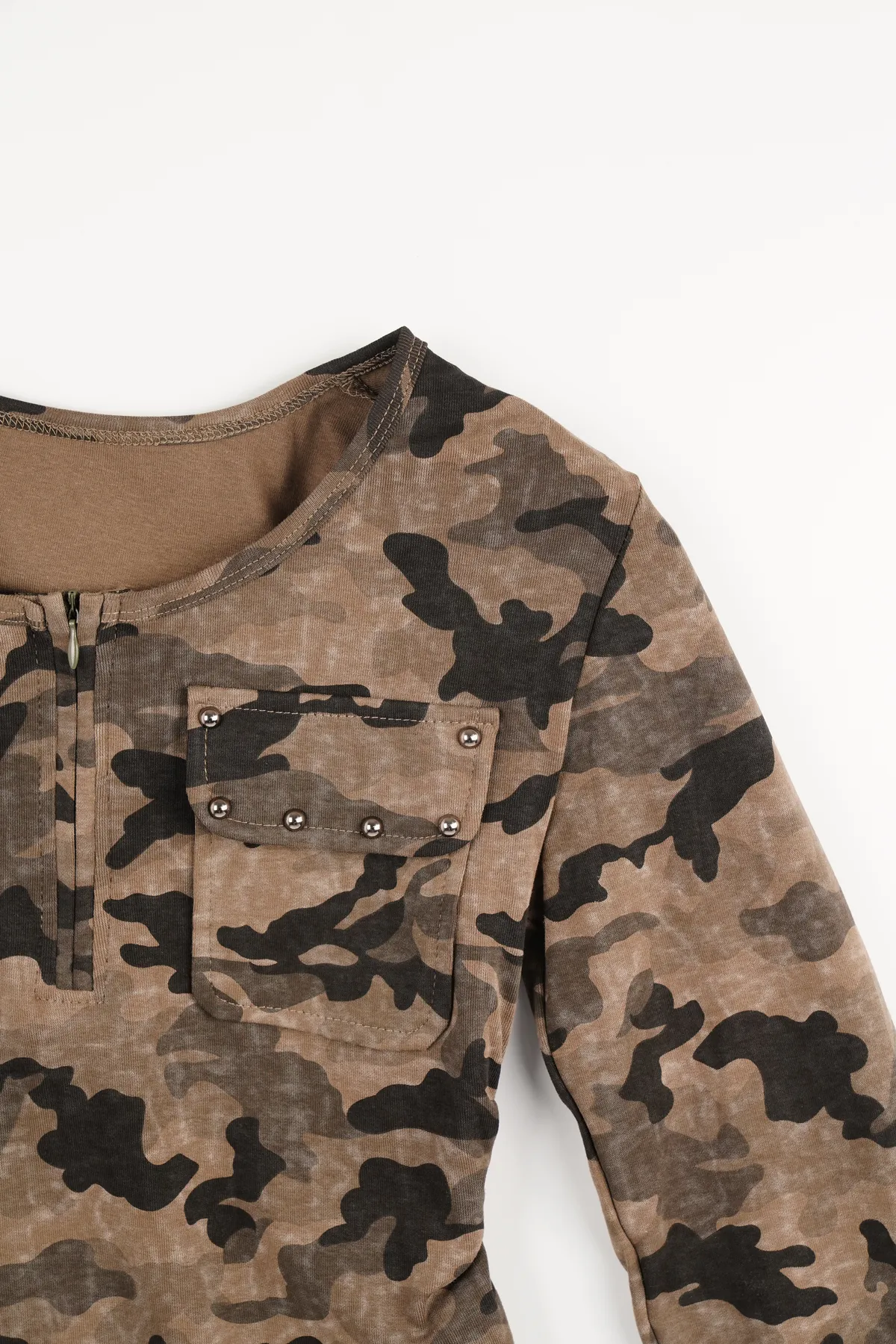 經典迷彩印花,展現個性與時尚,胸前雙口袋+金屬鉚釘細節,細節感滿分,彈性面料,貼合身形不緊繃