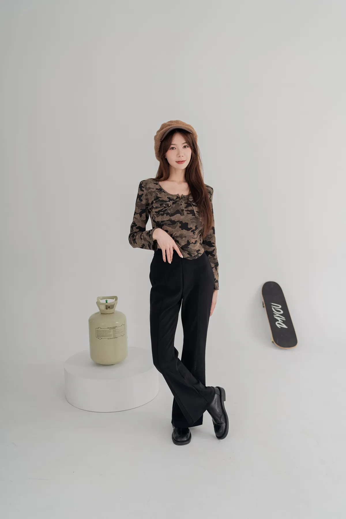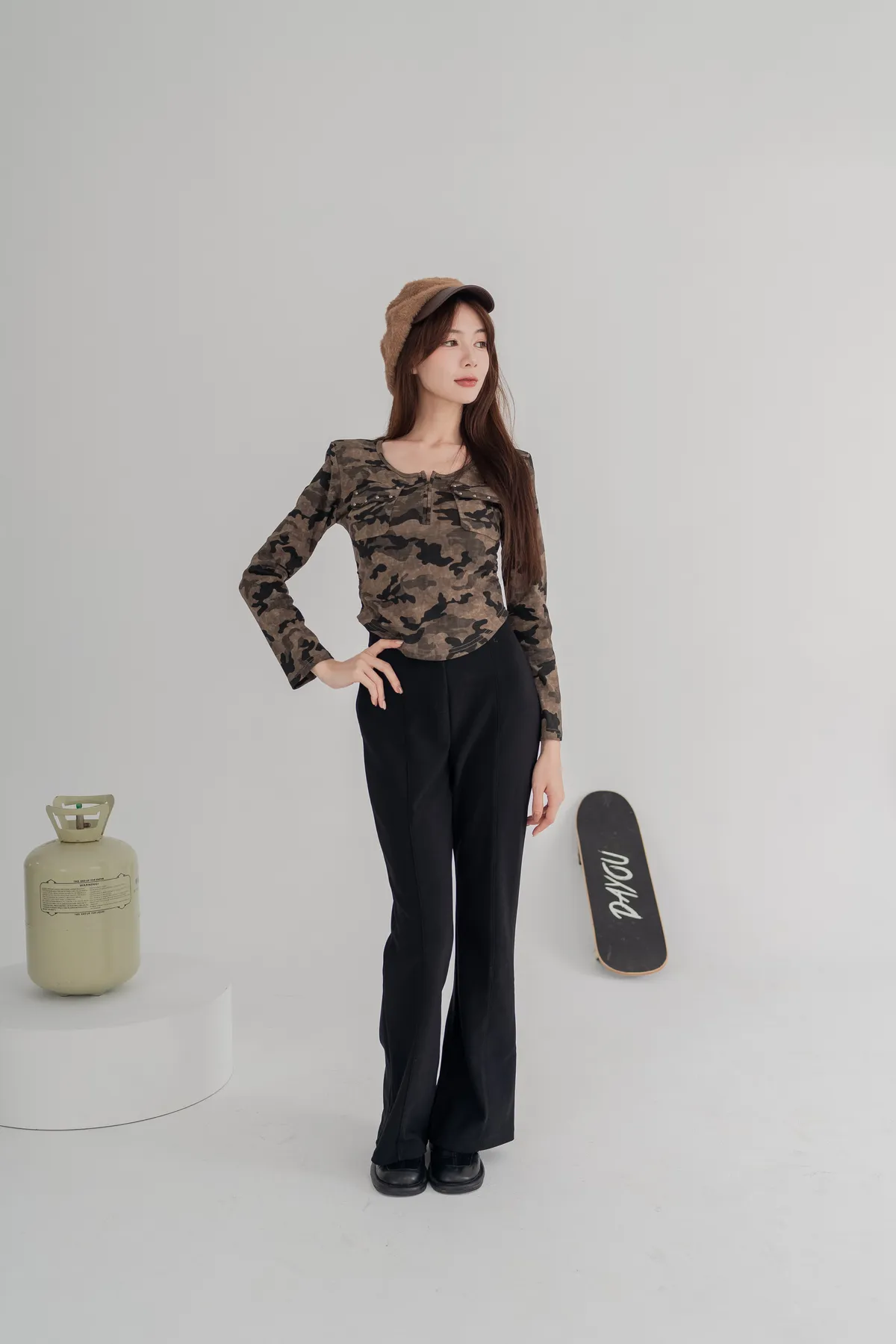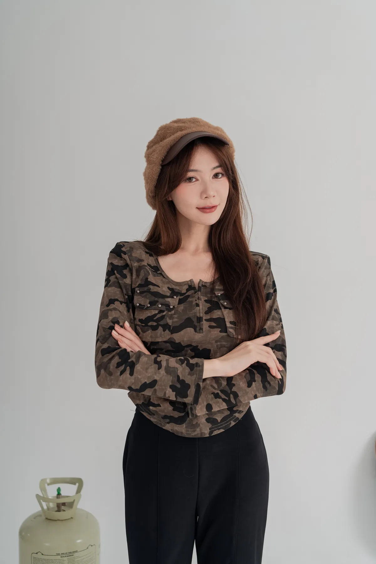 經典迷彩印花,展現個性與時尚,胸前雙口袋+金屬鉚釘細節,細節感滿分,彈性面料,貼合身形不緊繃