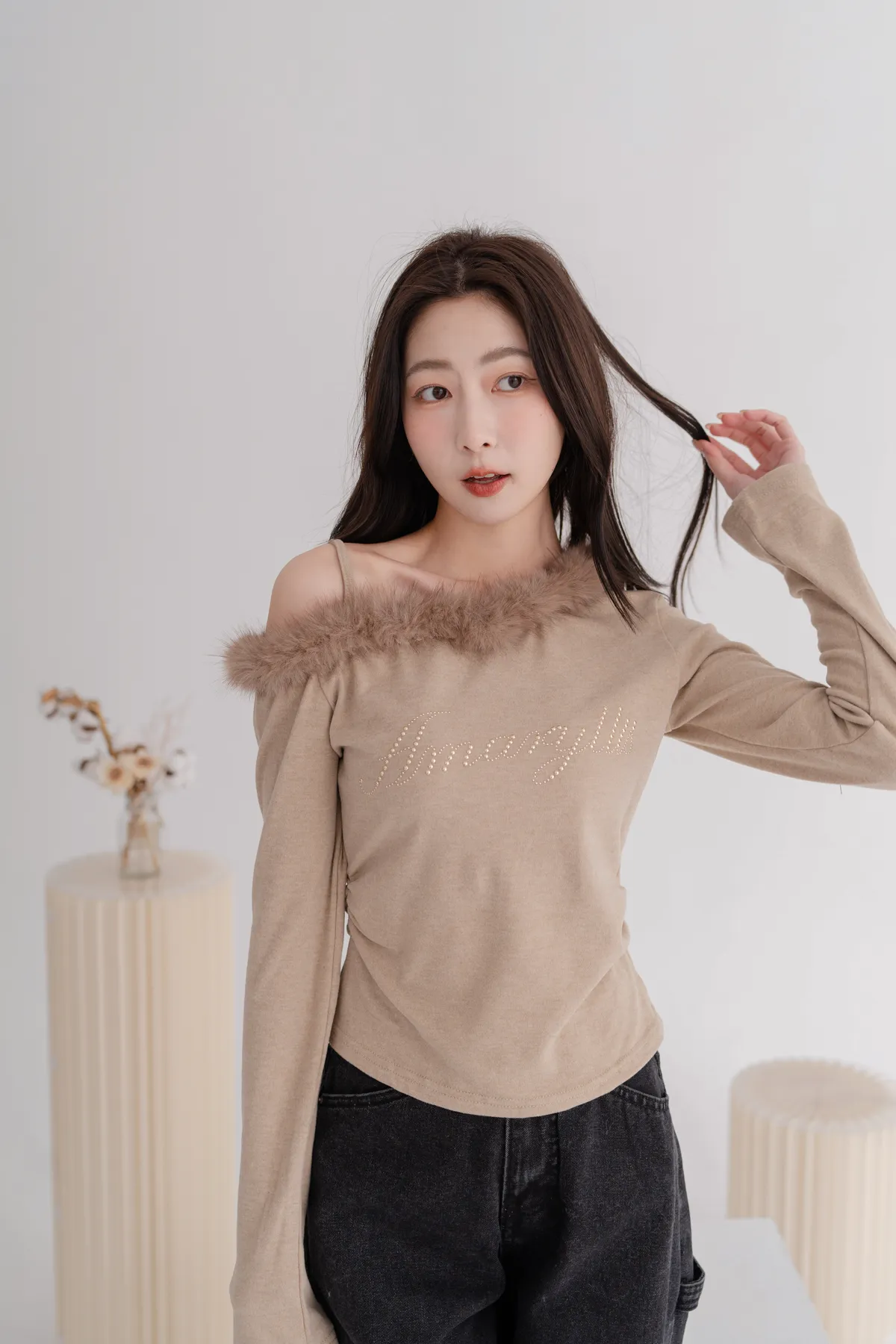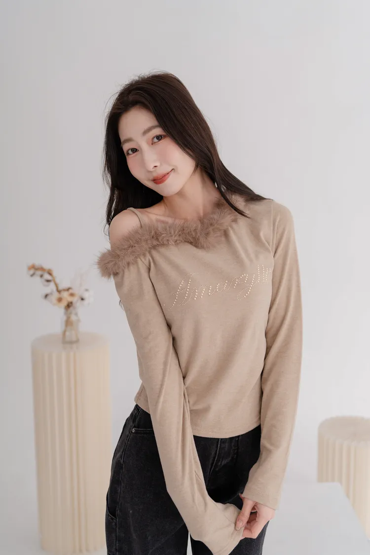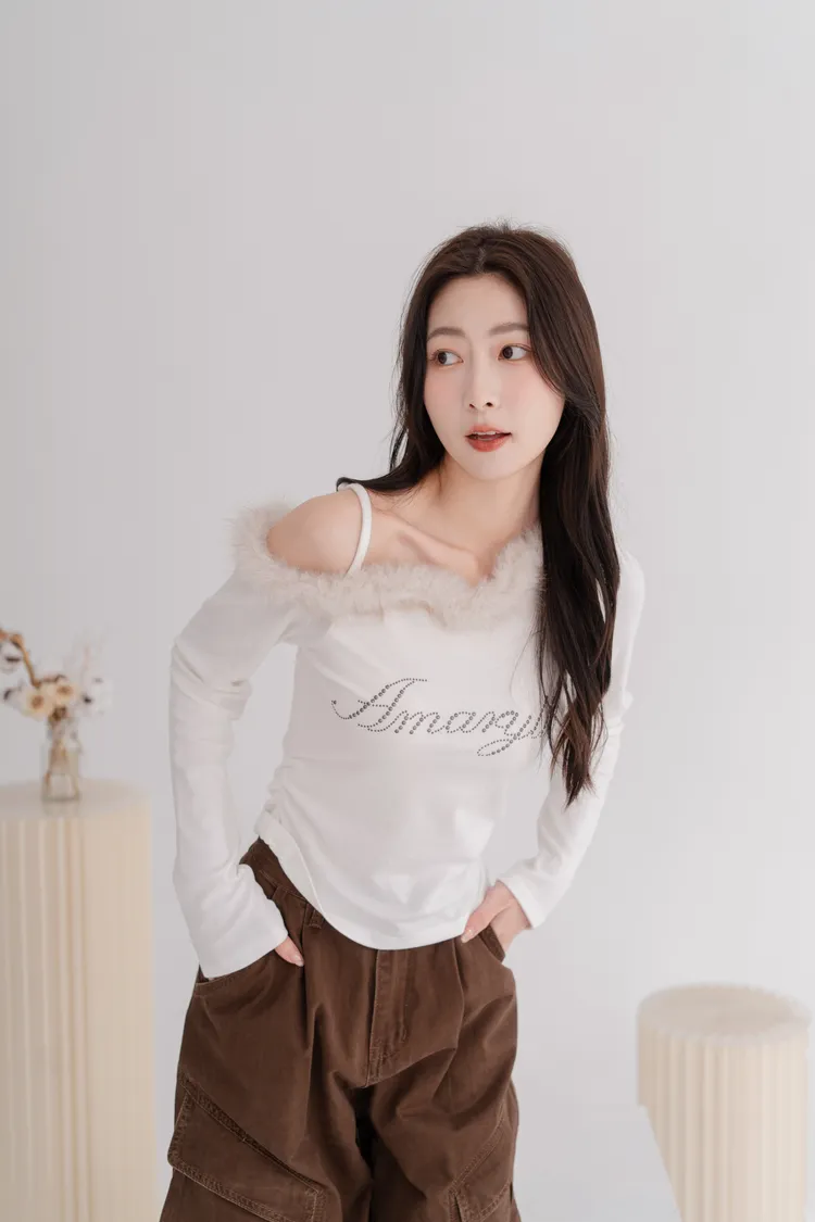 斜肩毛領磨毛上衣