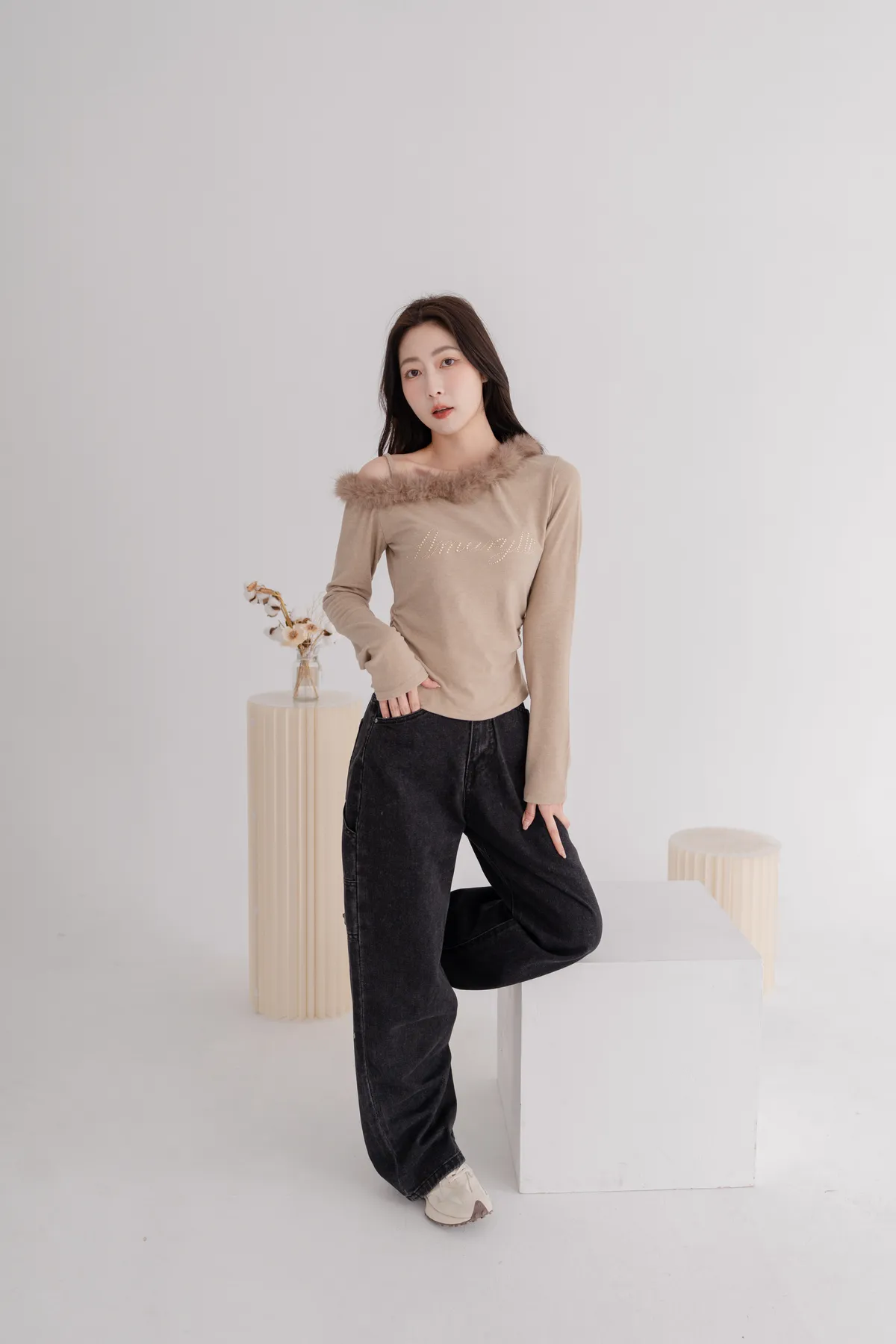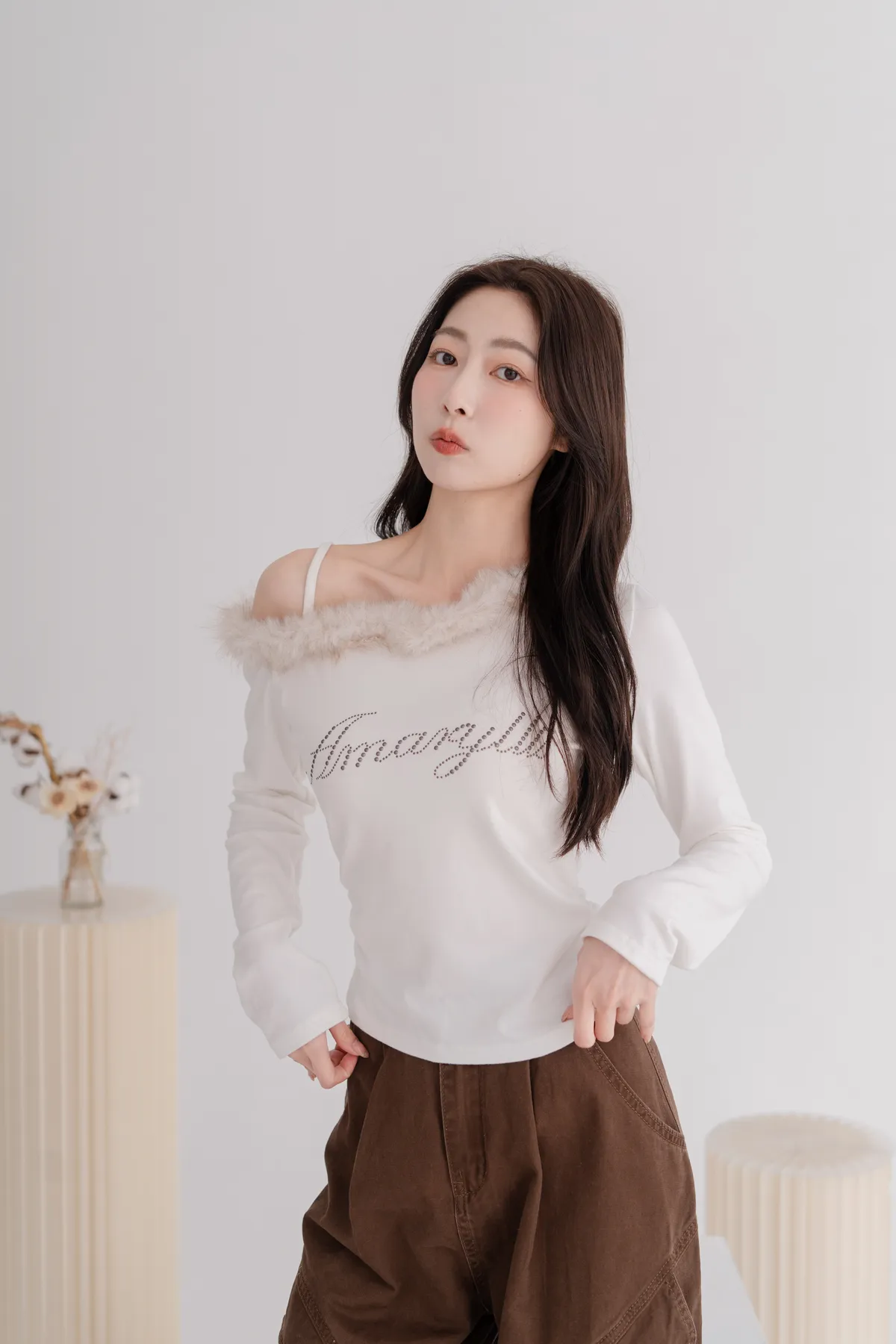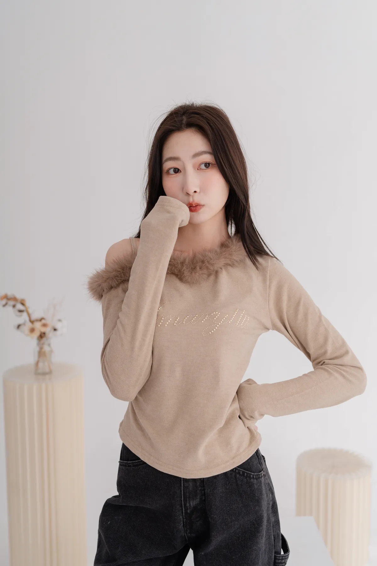 斜肩毛領磨毛上衣