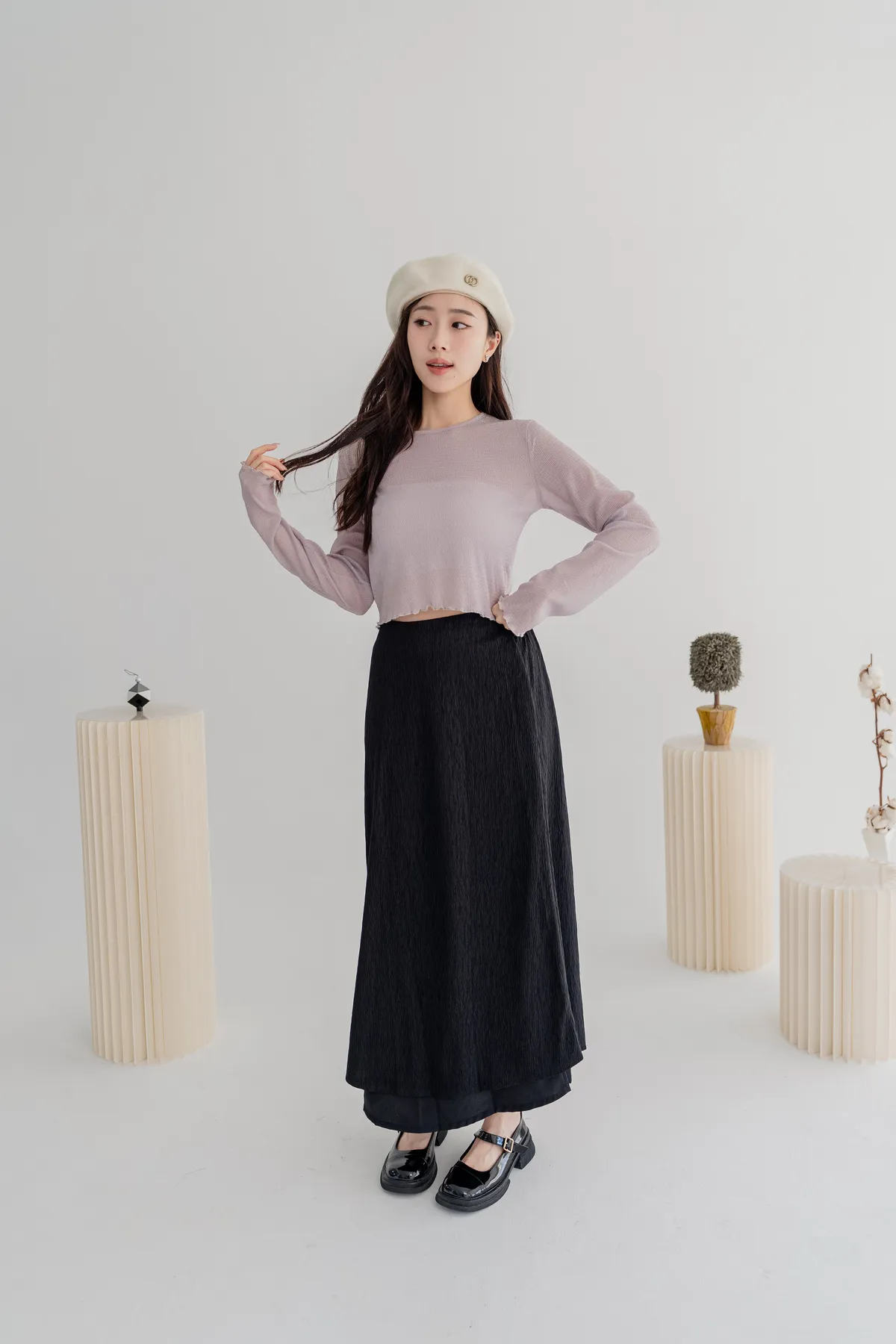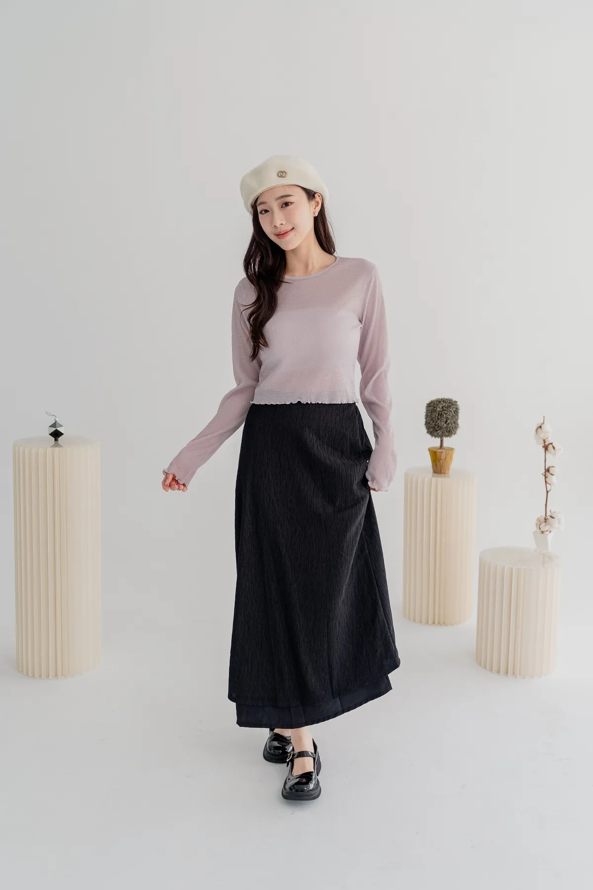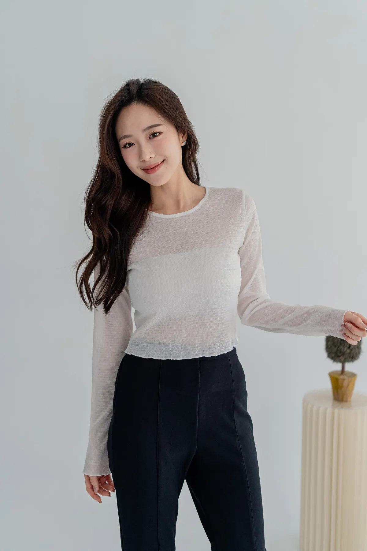 商品資訊:細緻的壓紋布料帶出微透層次,單穿或作為內搭,都能在日常中展現低調的性感與高級感。