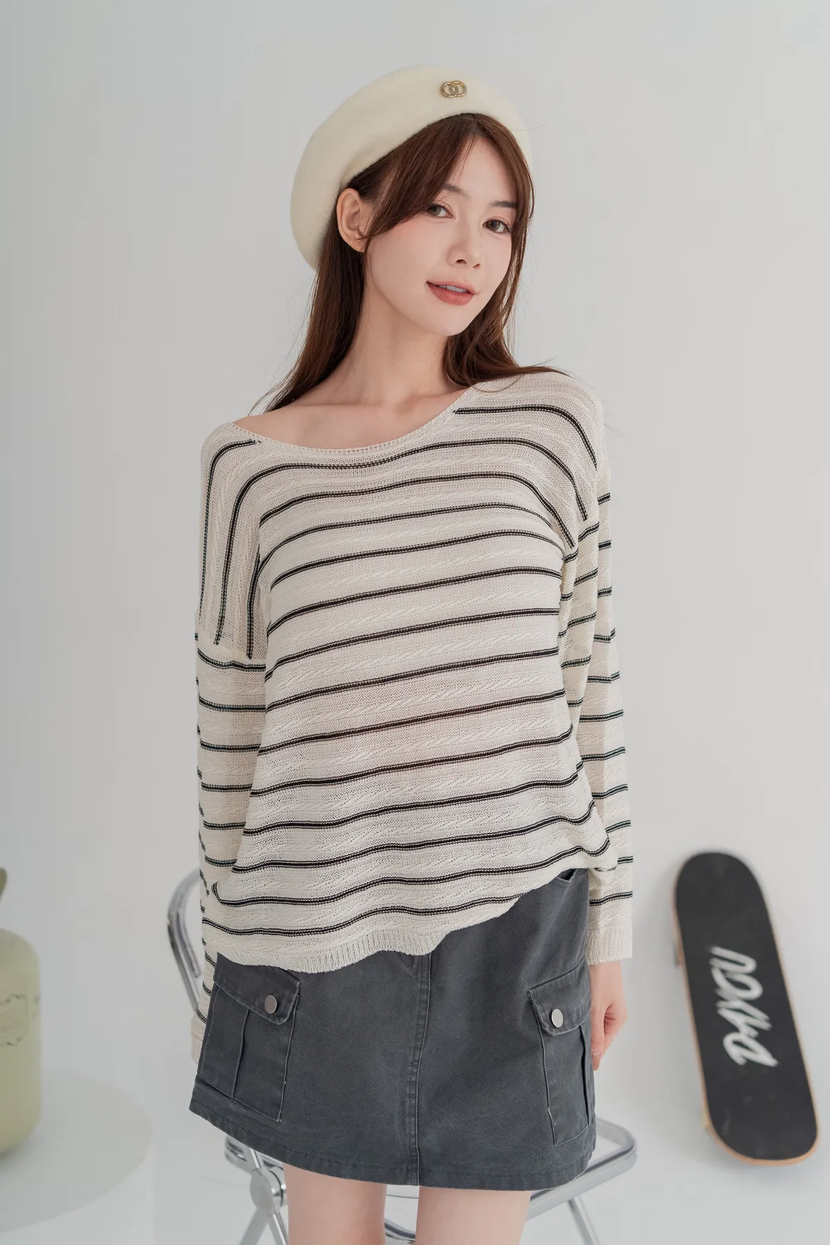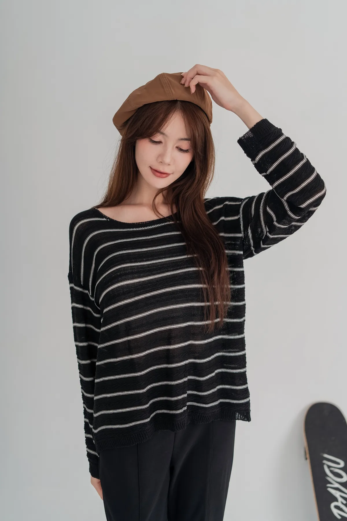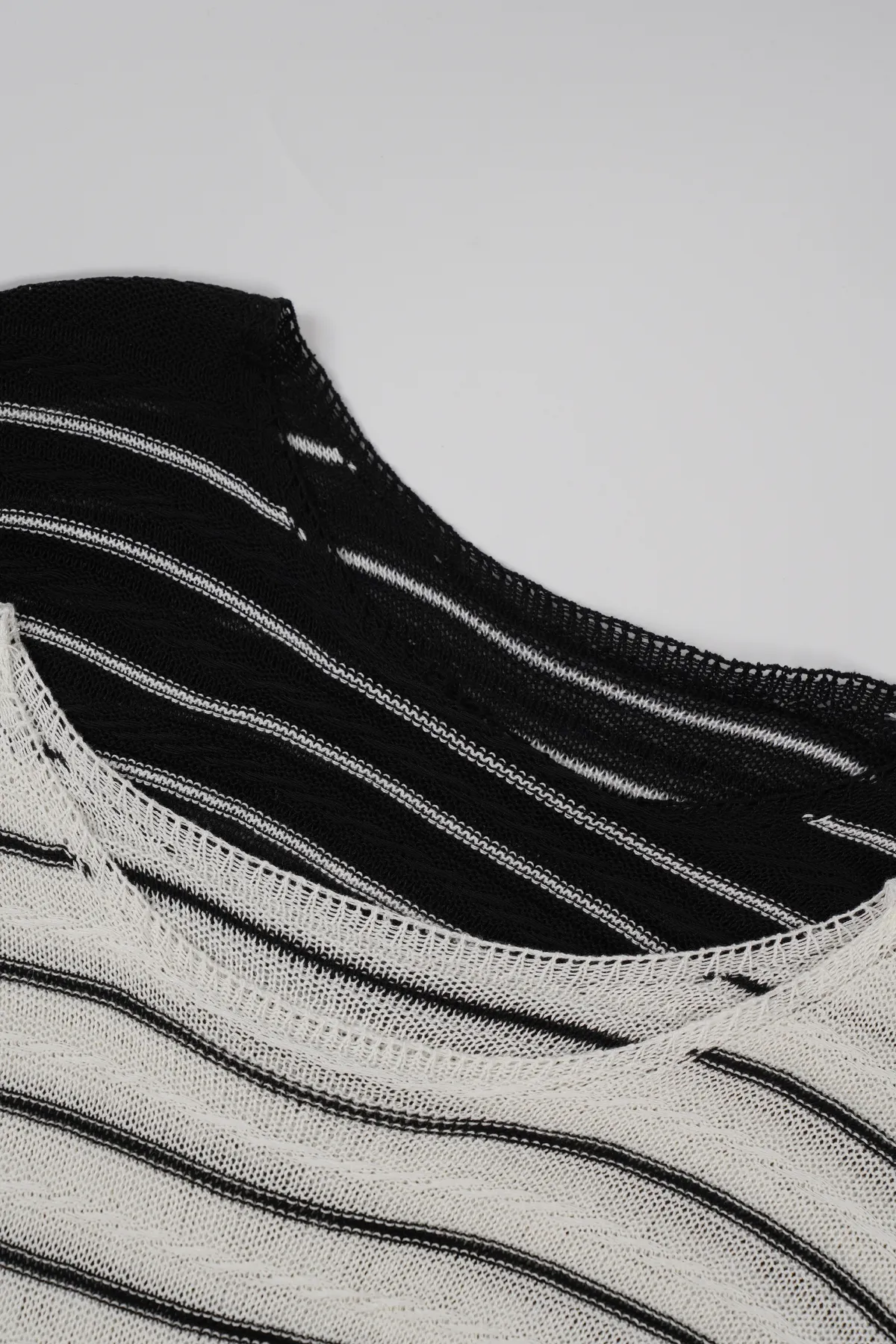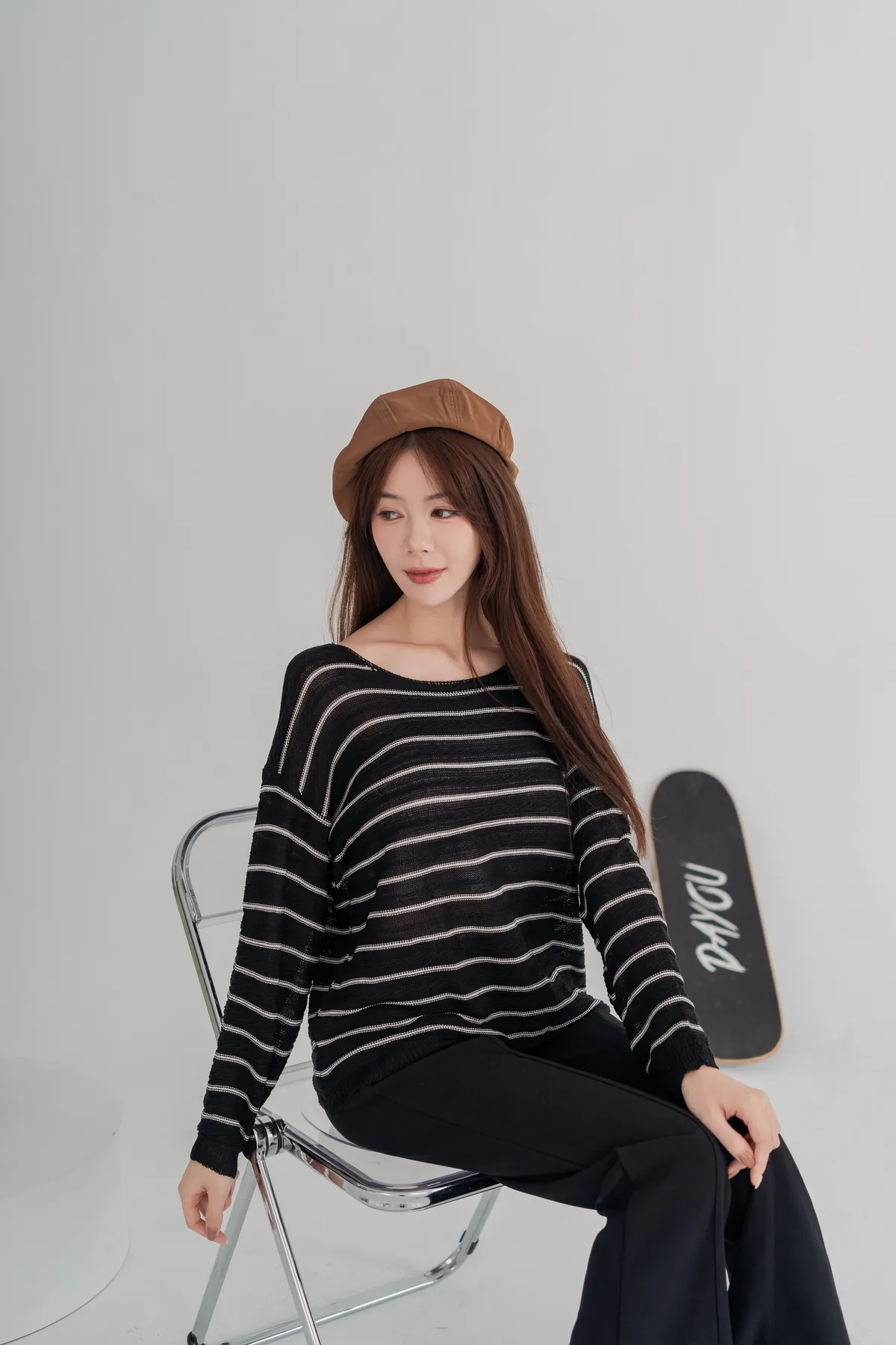 經典條紋結合微透膚的編織設計,展現若隱若現的時髦氣息,寬鬆落肩剪裁讓整體更顯慵懶自然,單穿或內搭皆具層次感。