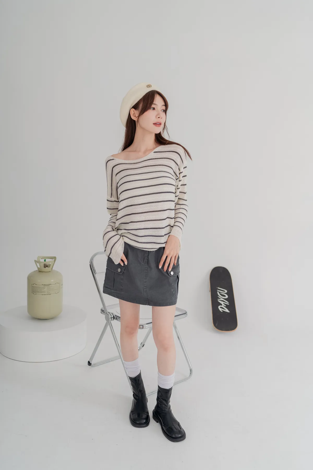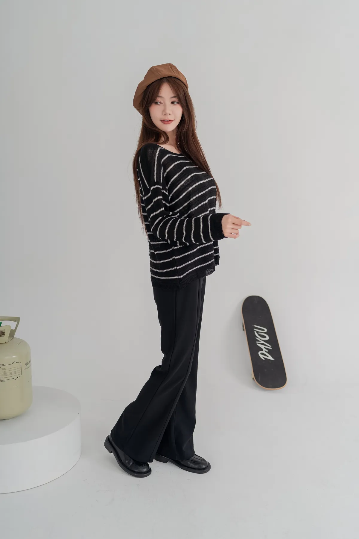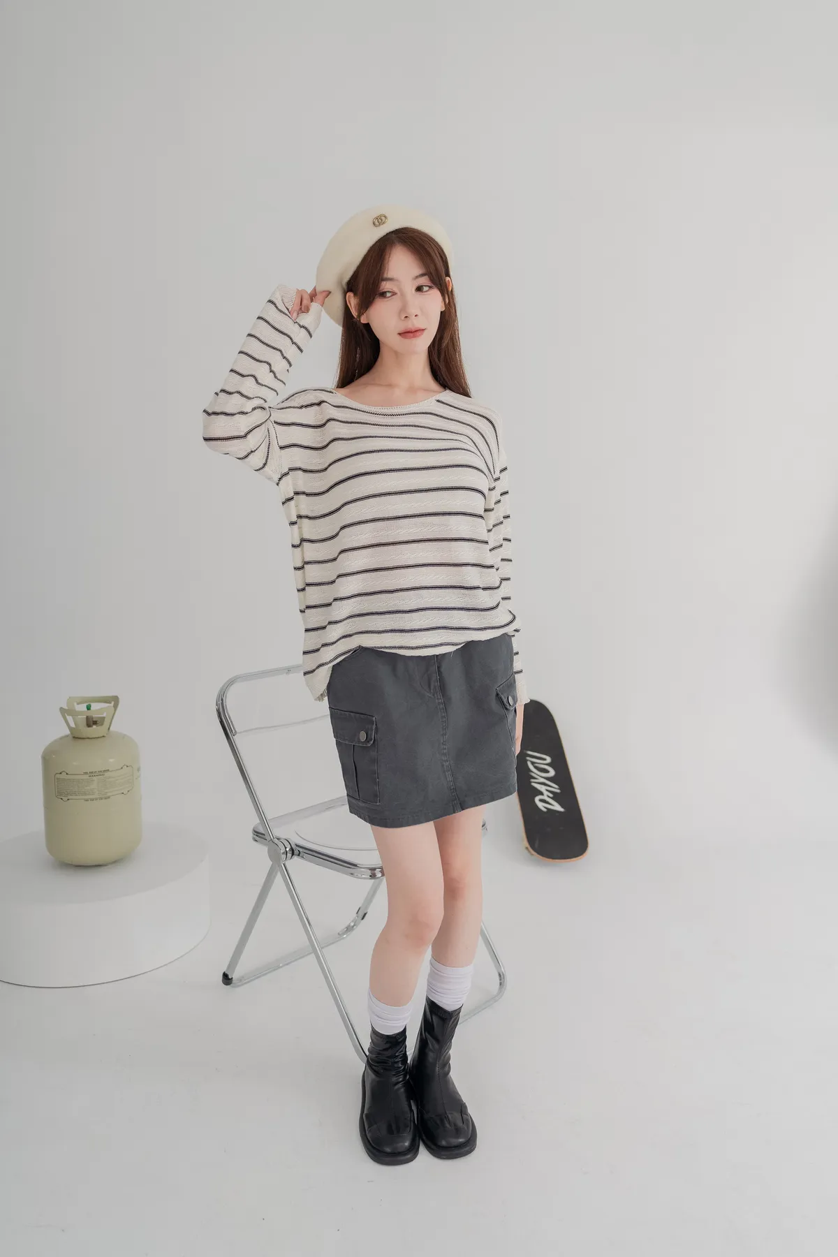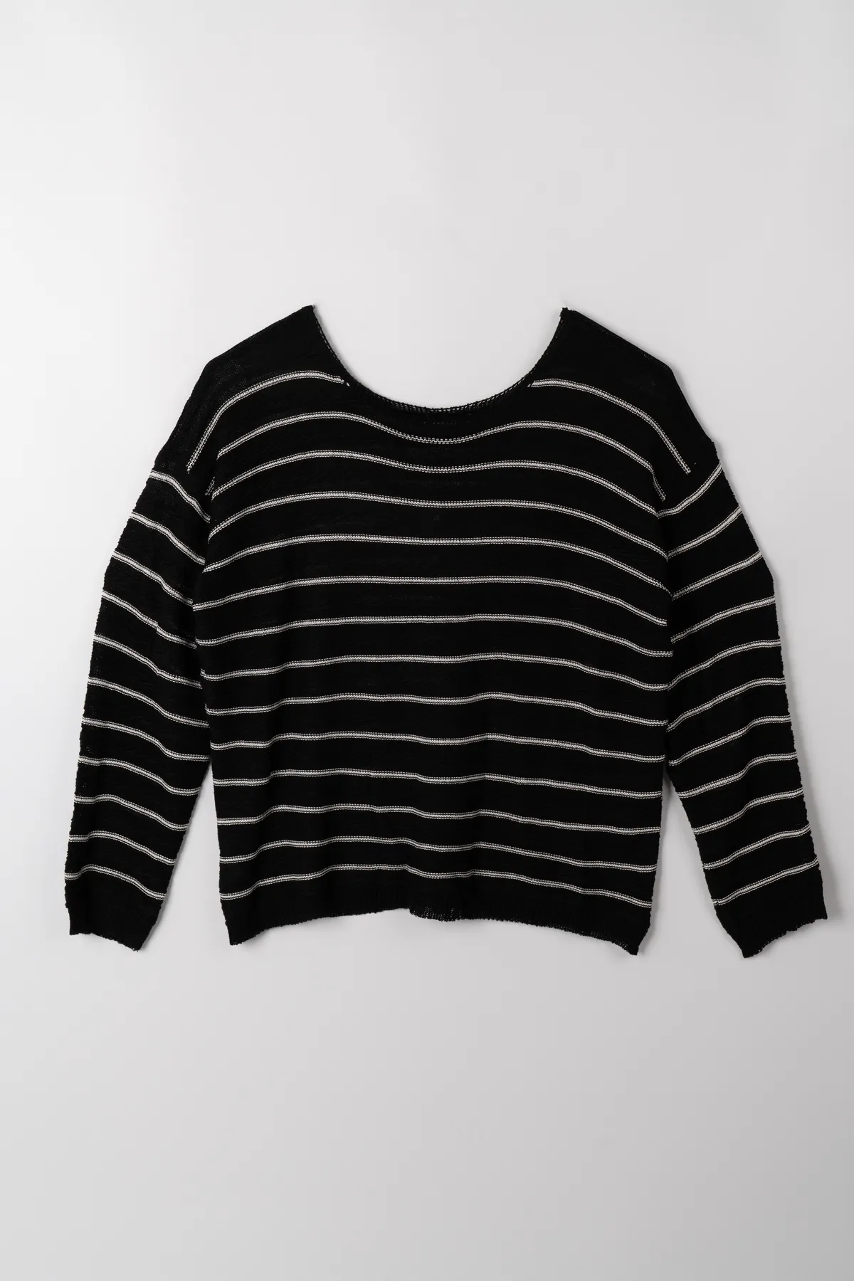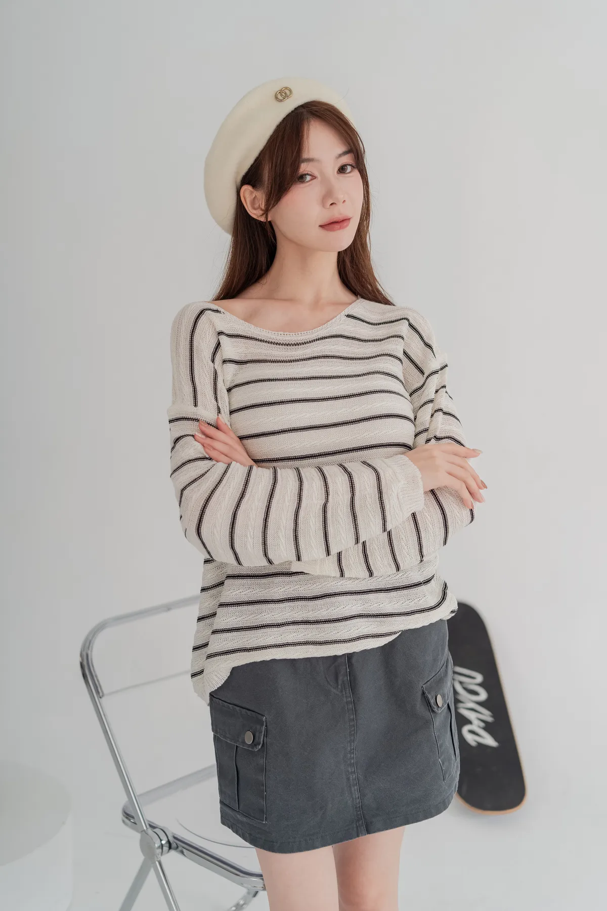 經典條紋結合微透膚的編織設計,展現若隱若現的時髦氣息,寬鬆落肩剪裁讓整體更顯慵懶自然,單穿或內搭皆具層次感。