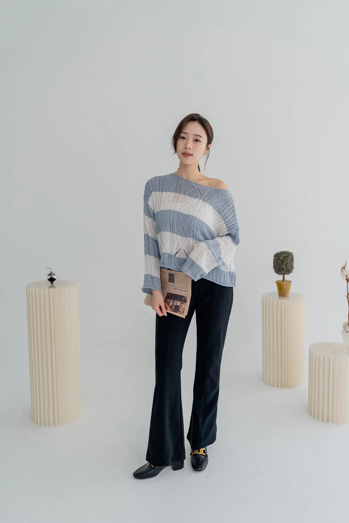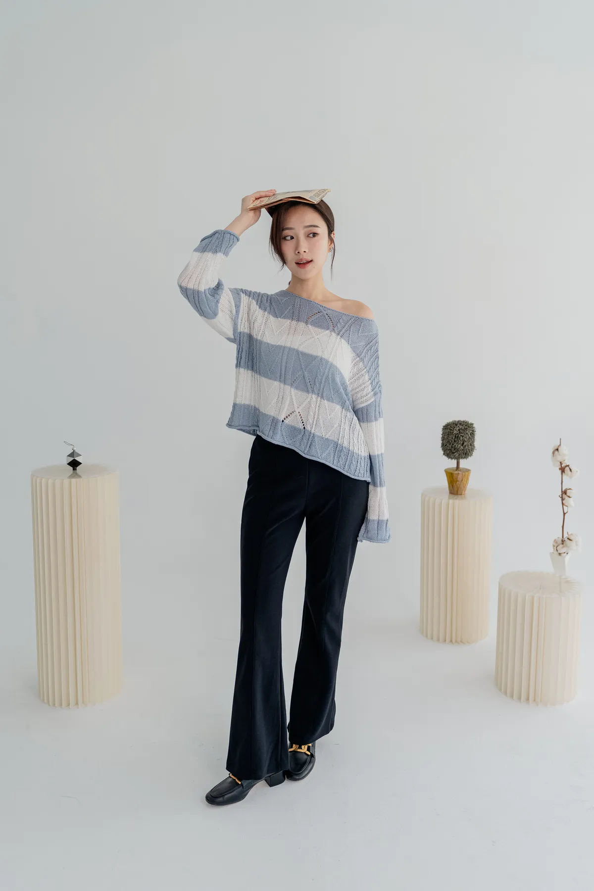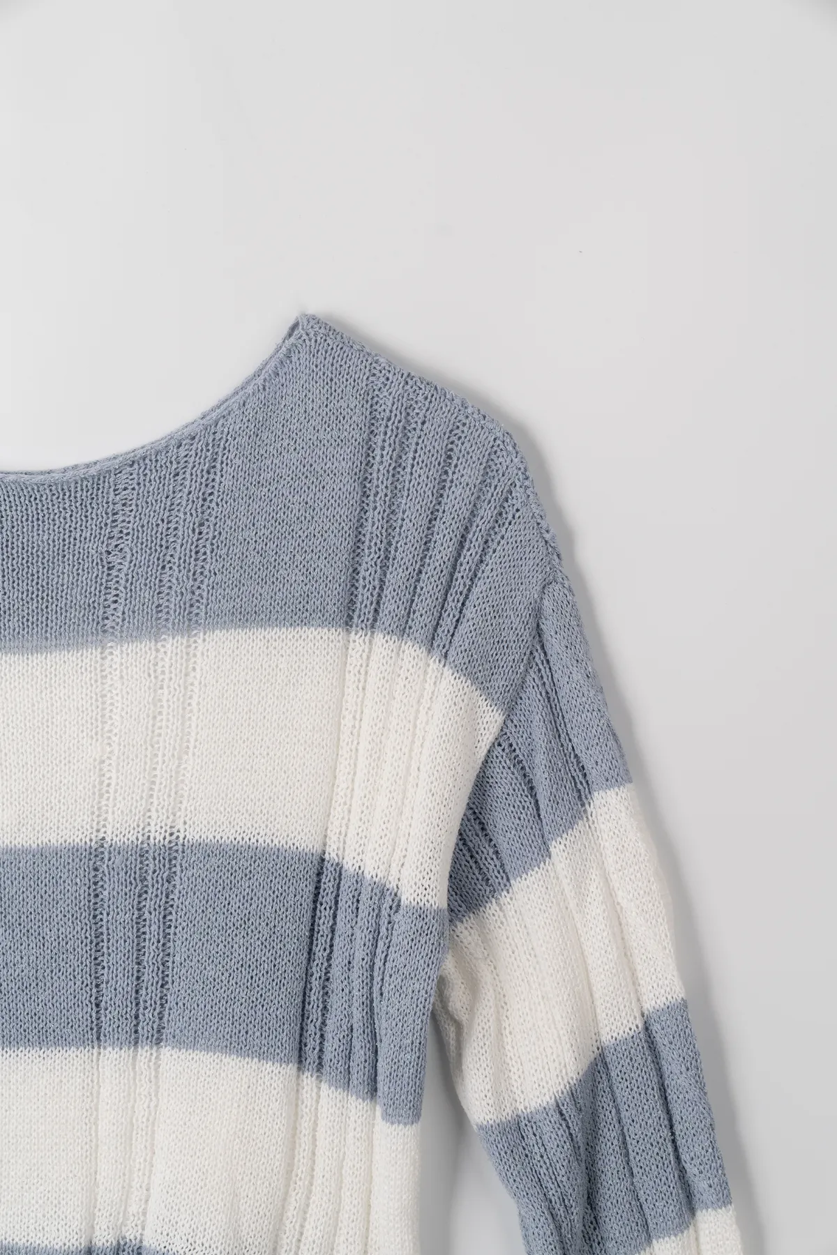 橫條斜肩造型針織上衣