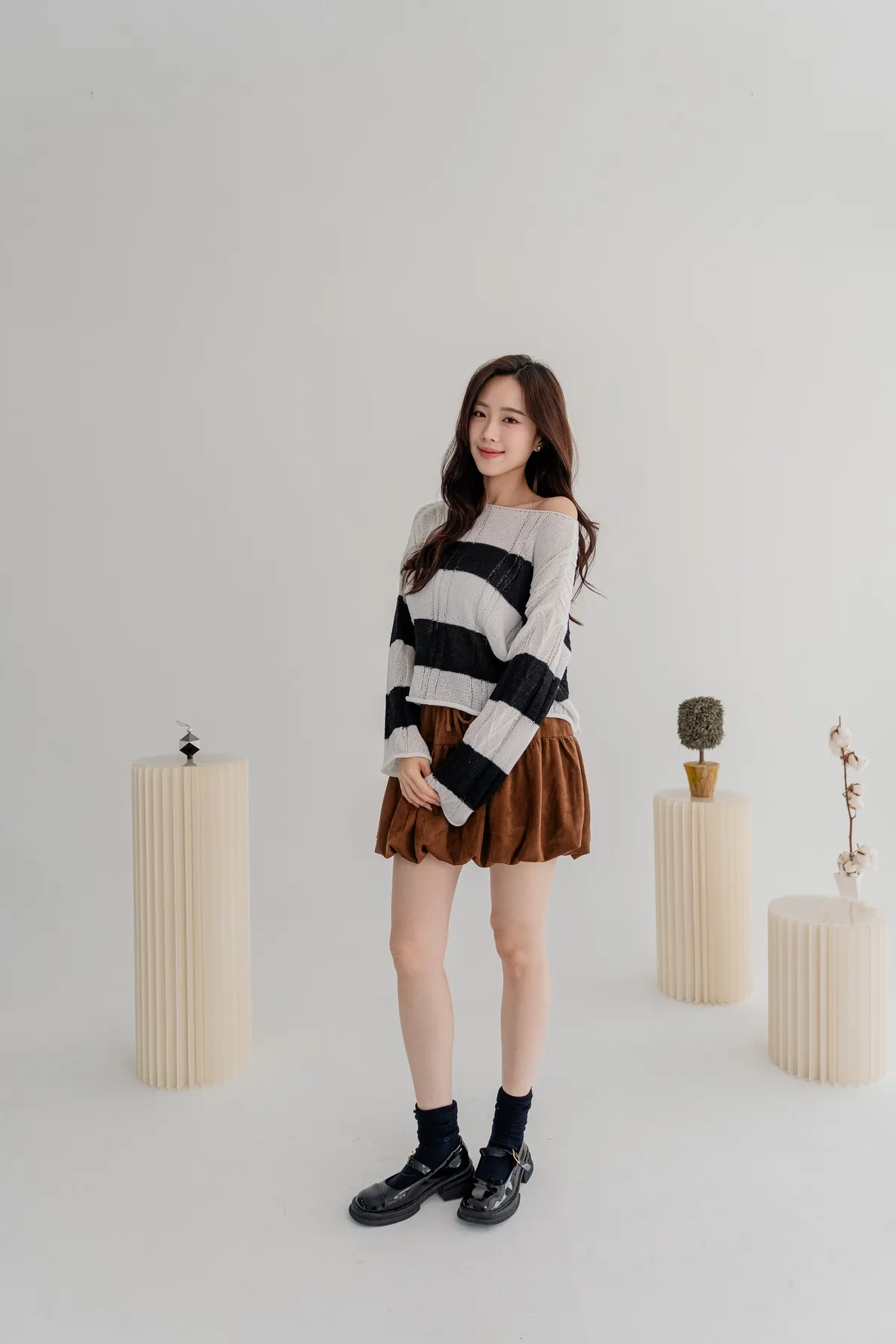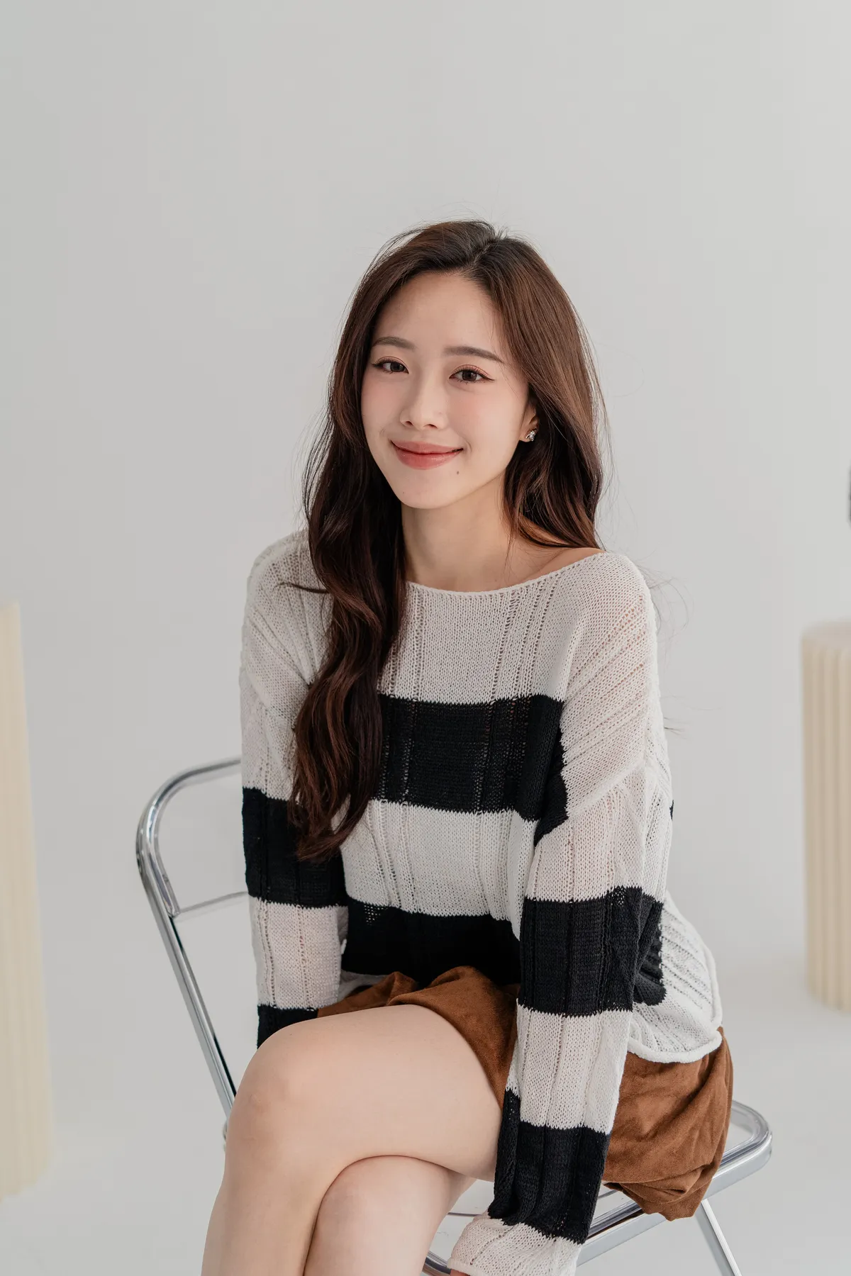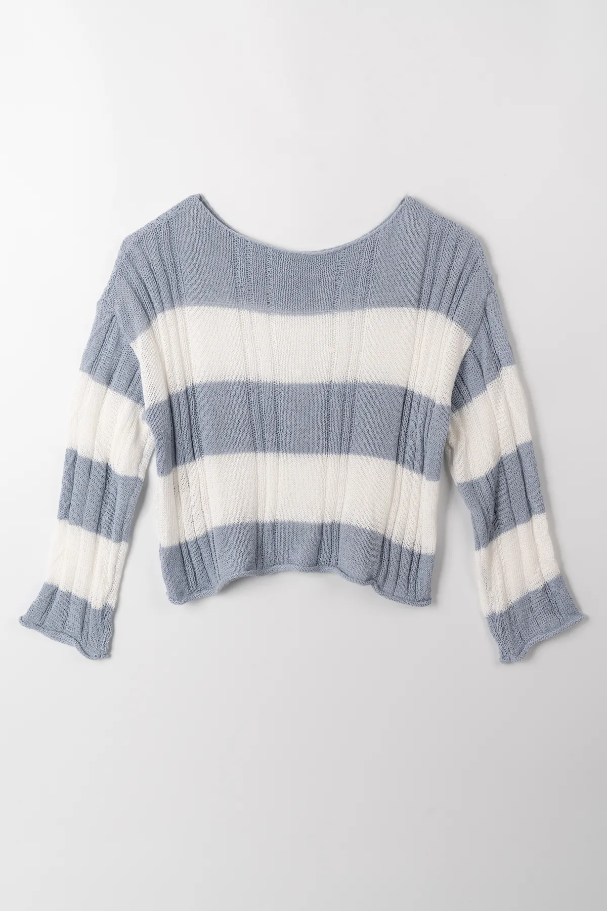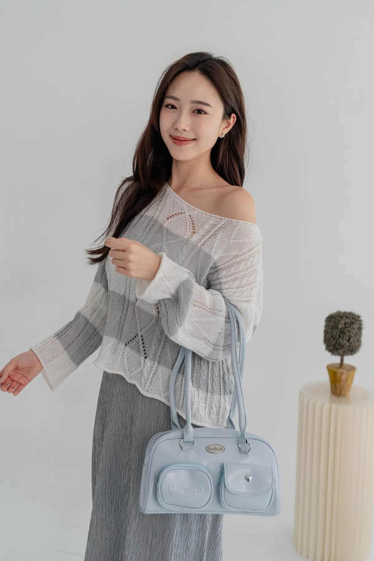 橫條斜肩造型針織上衣