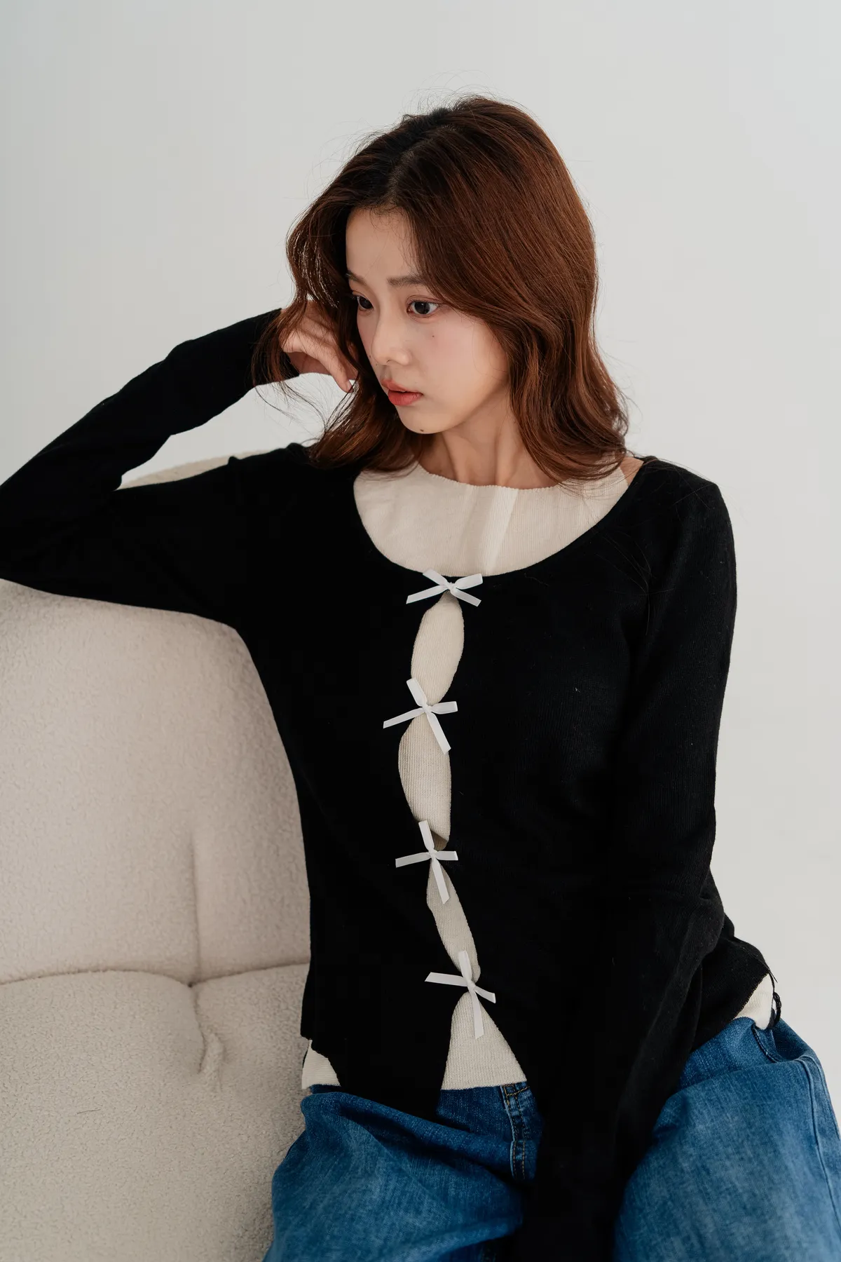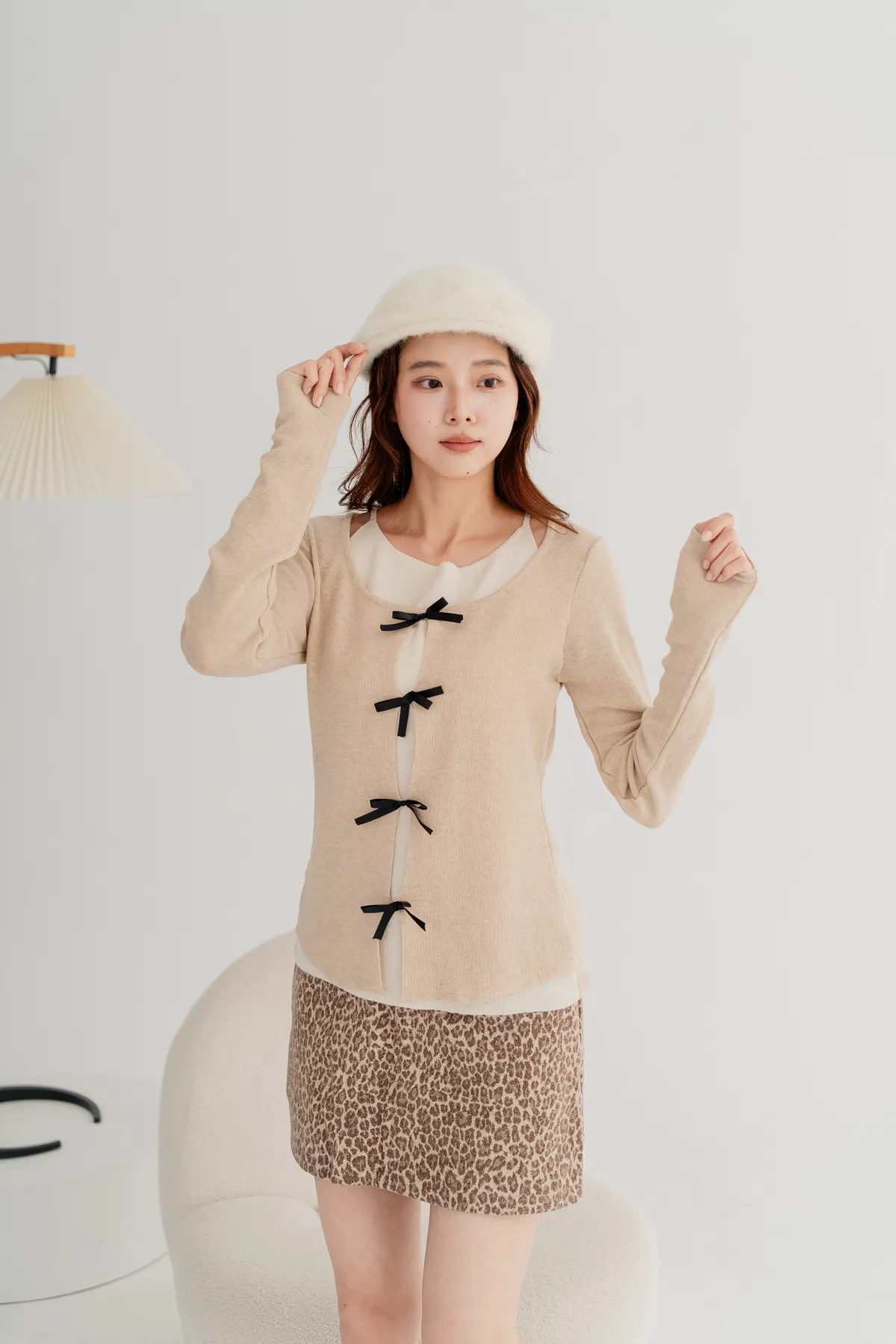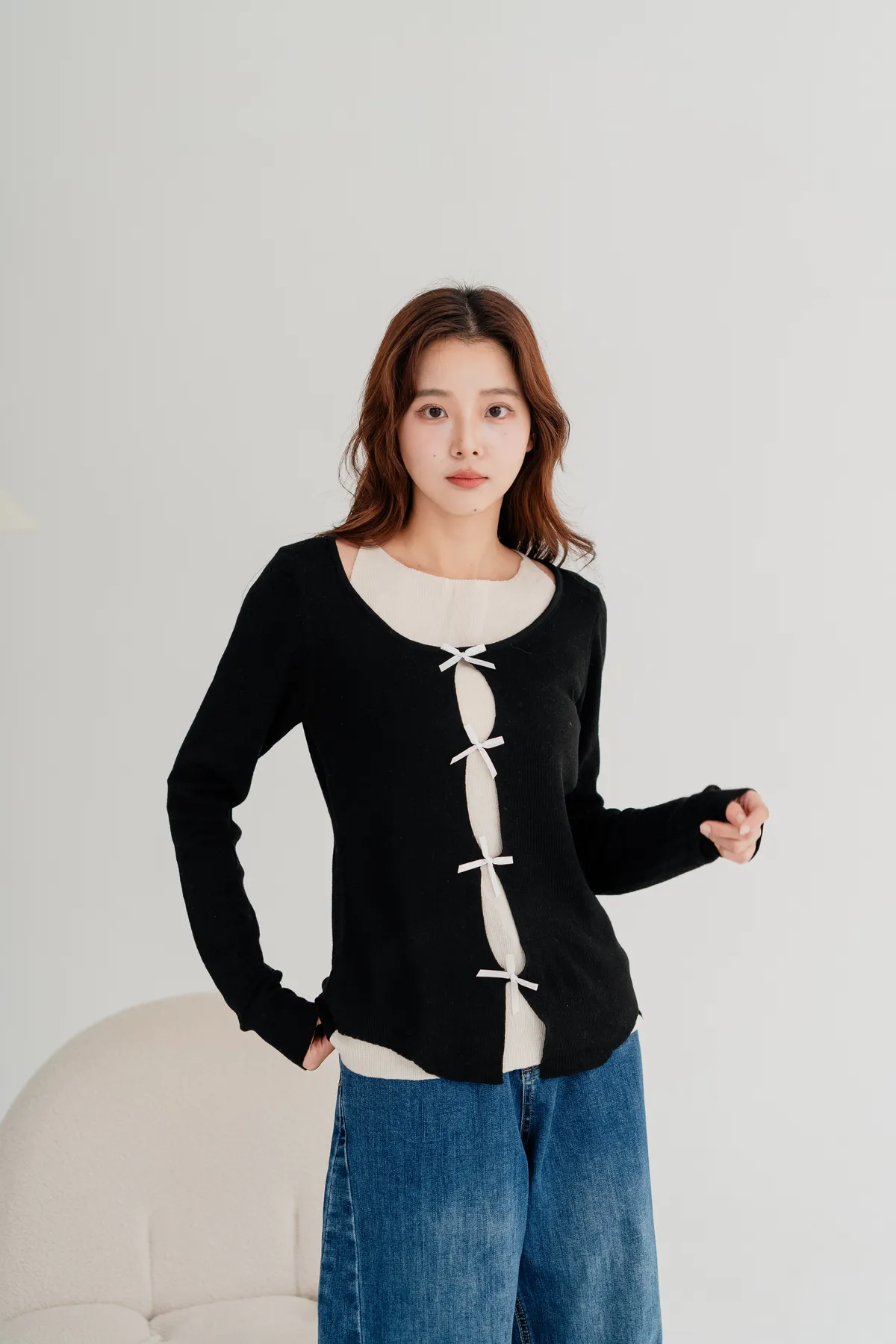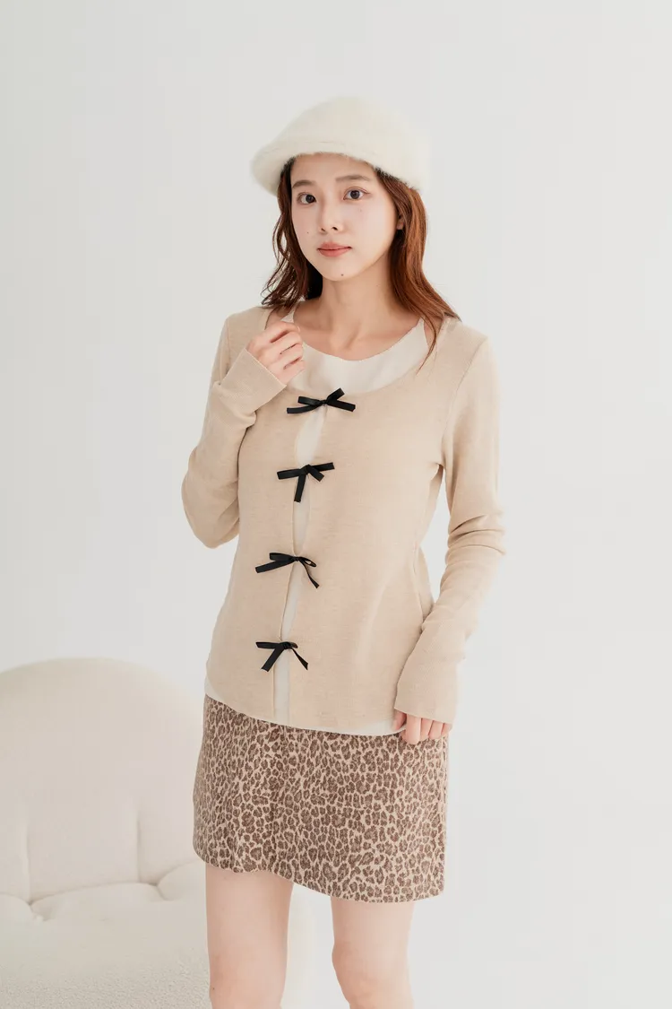 蝴蝶結假兩件針織上衣