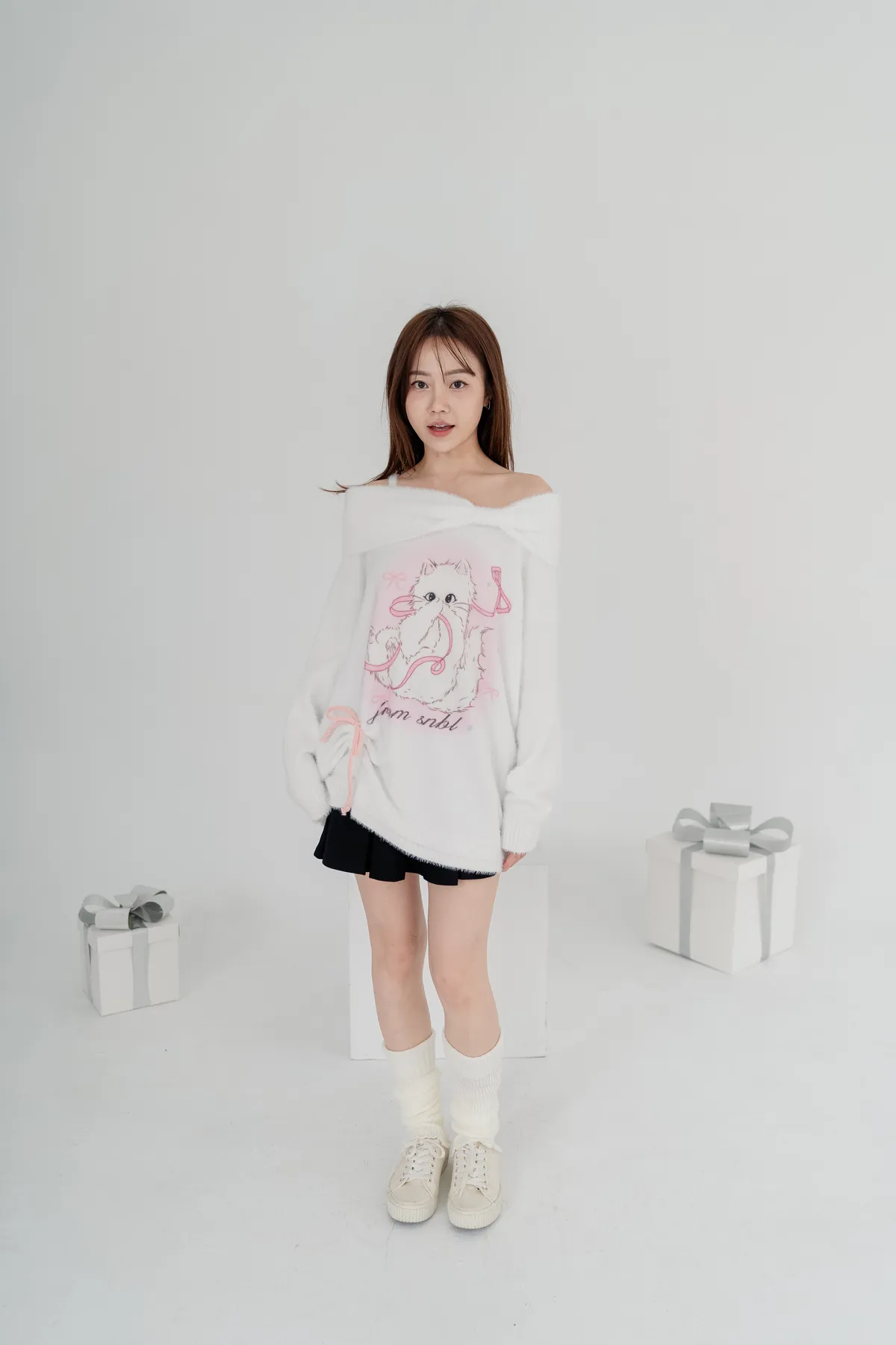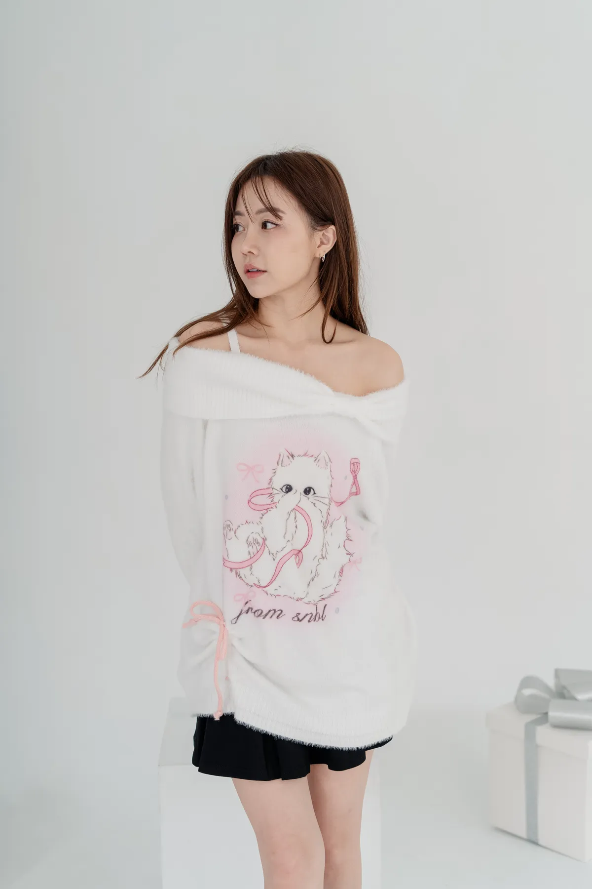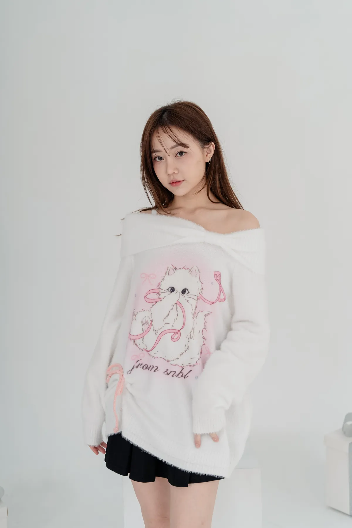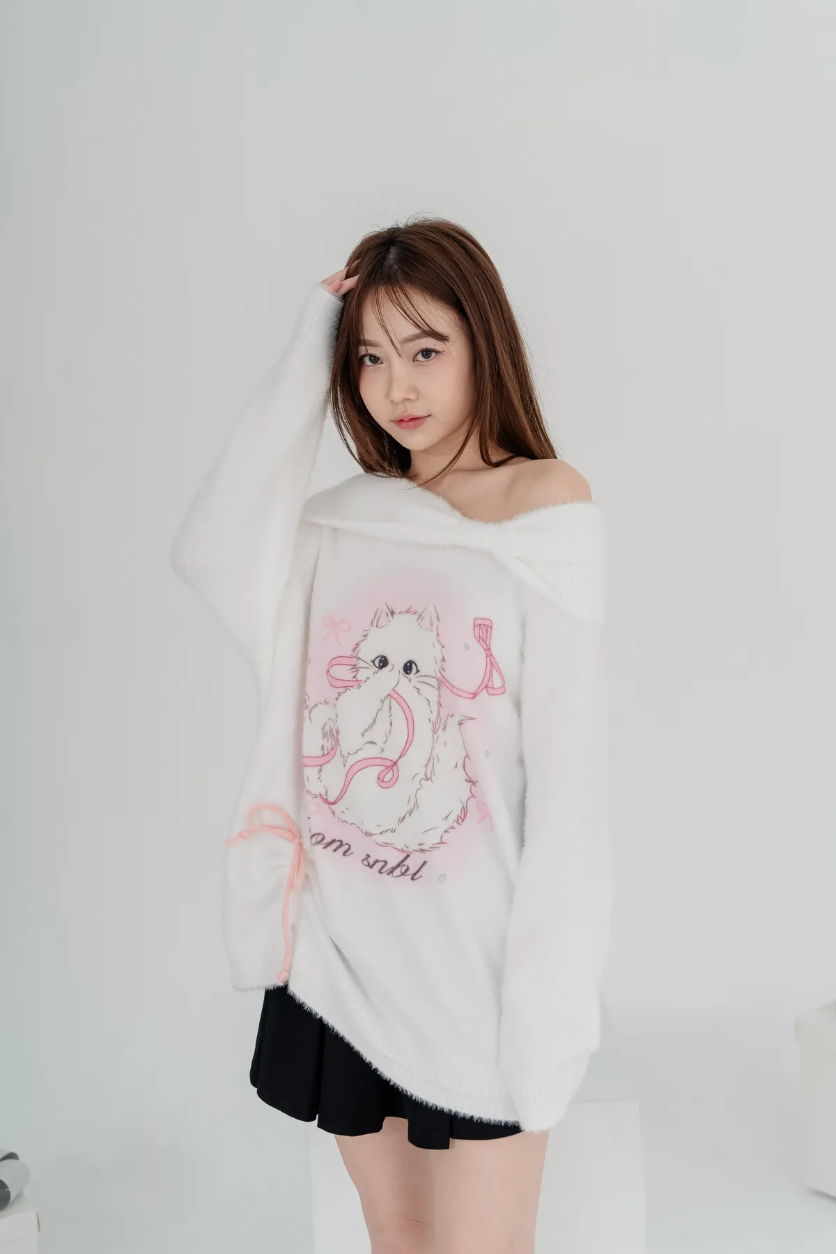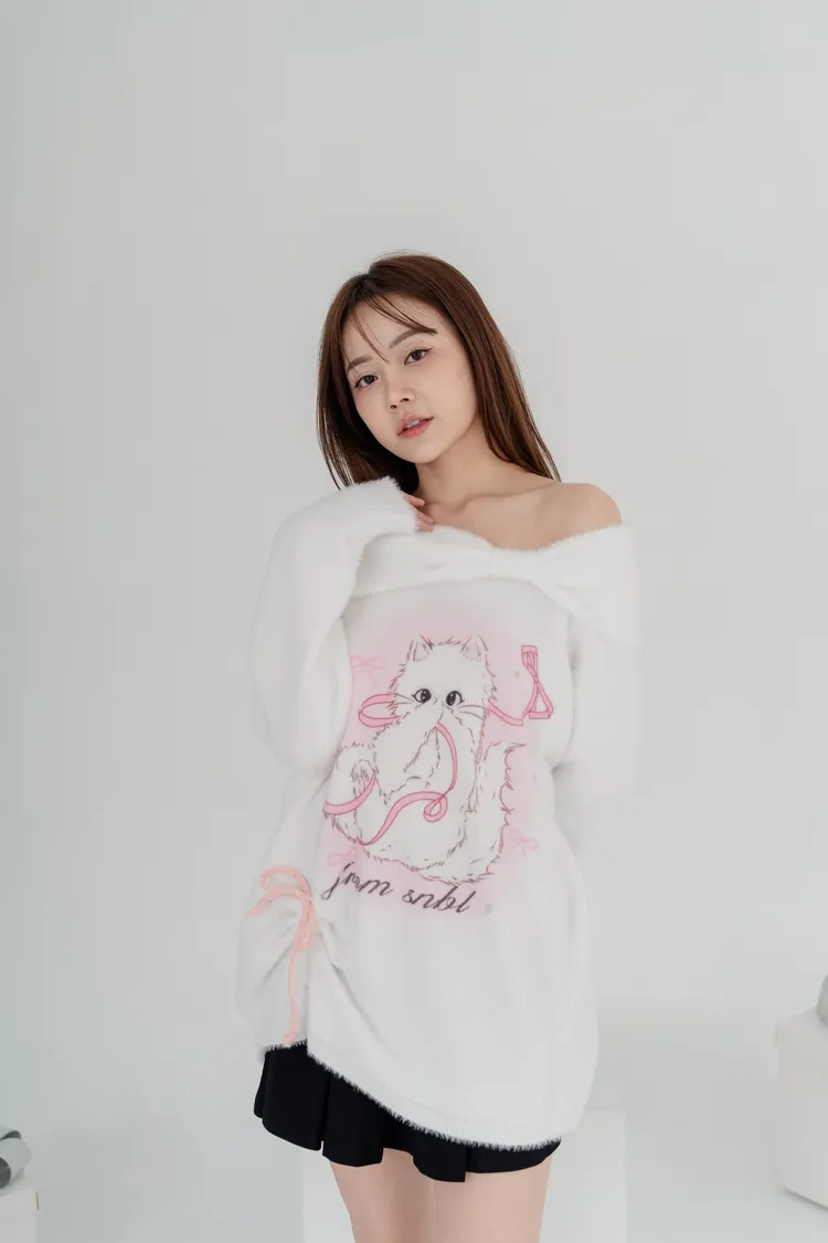 軟絨毛貓咪露肩毛衣