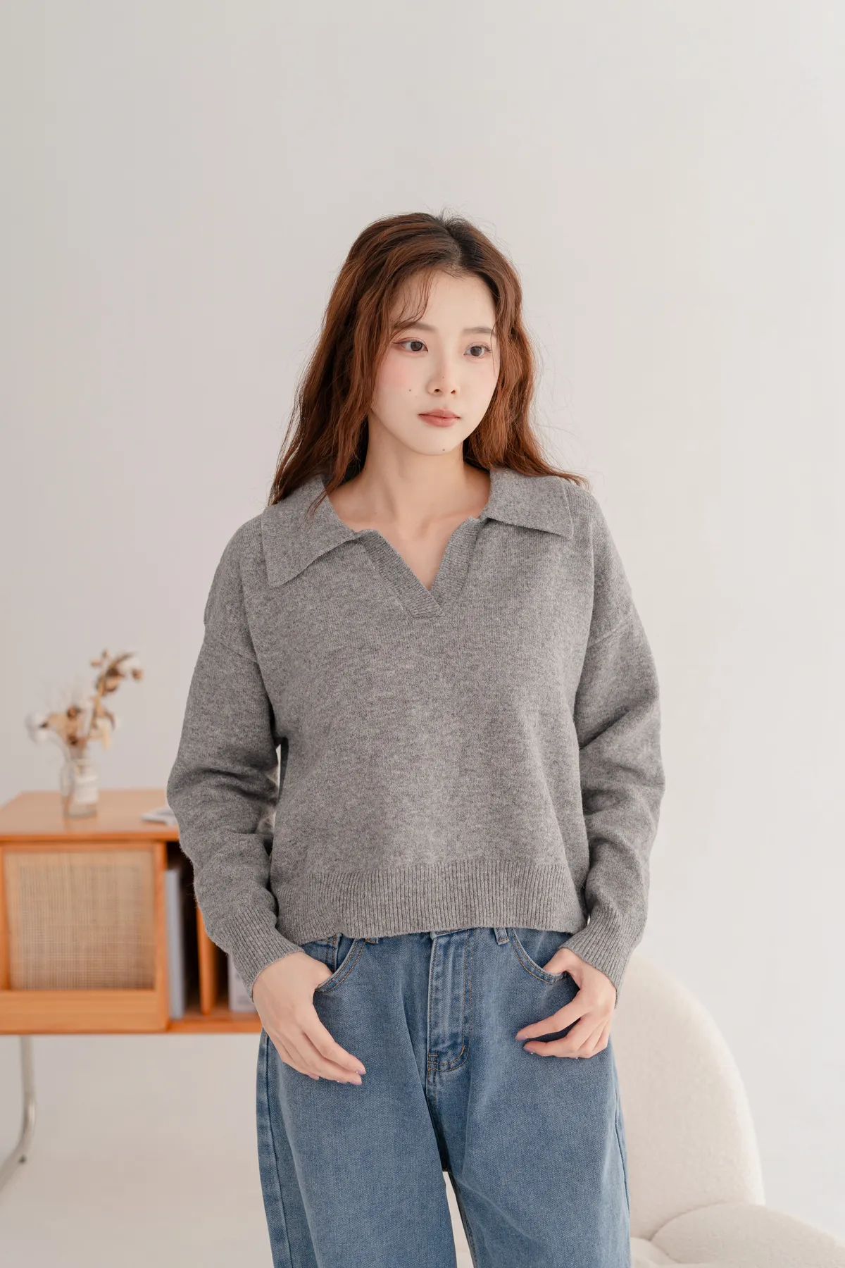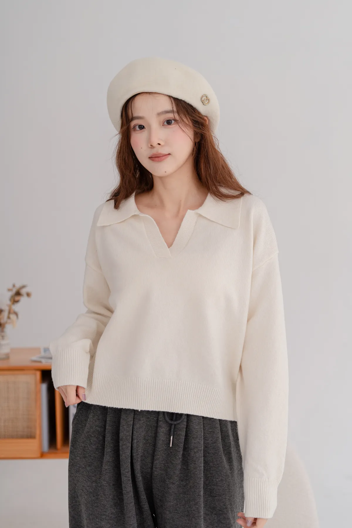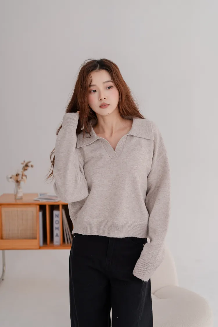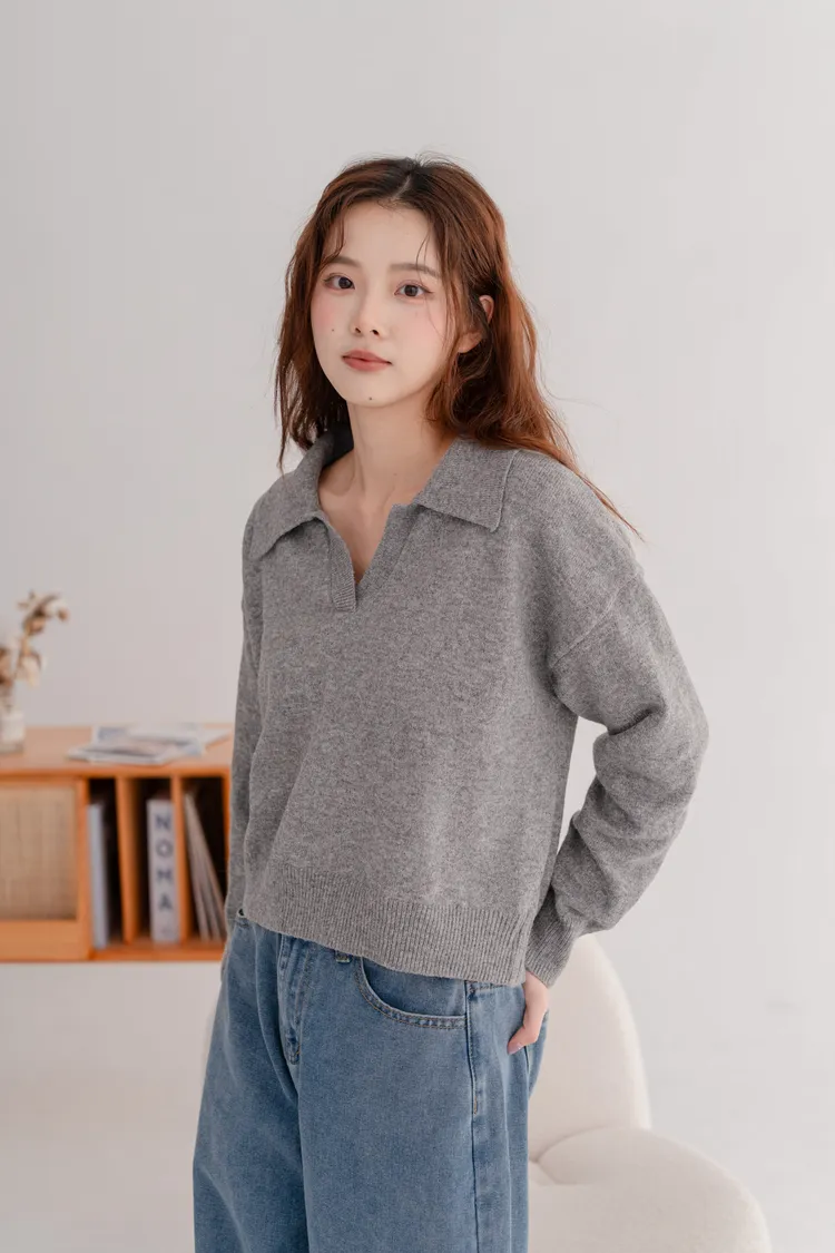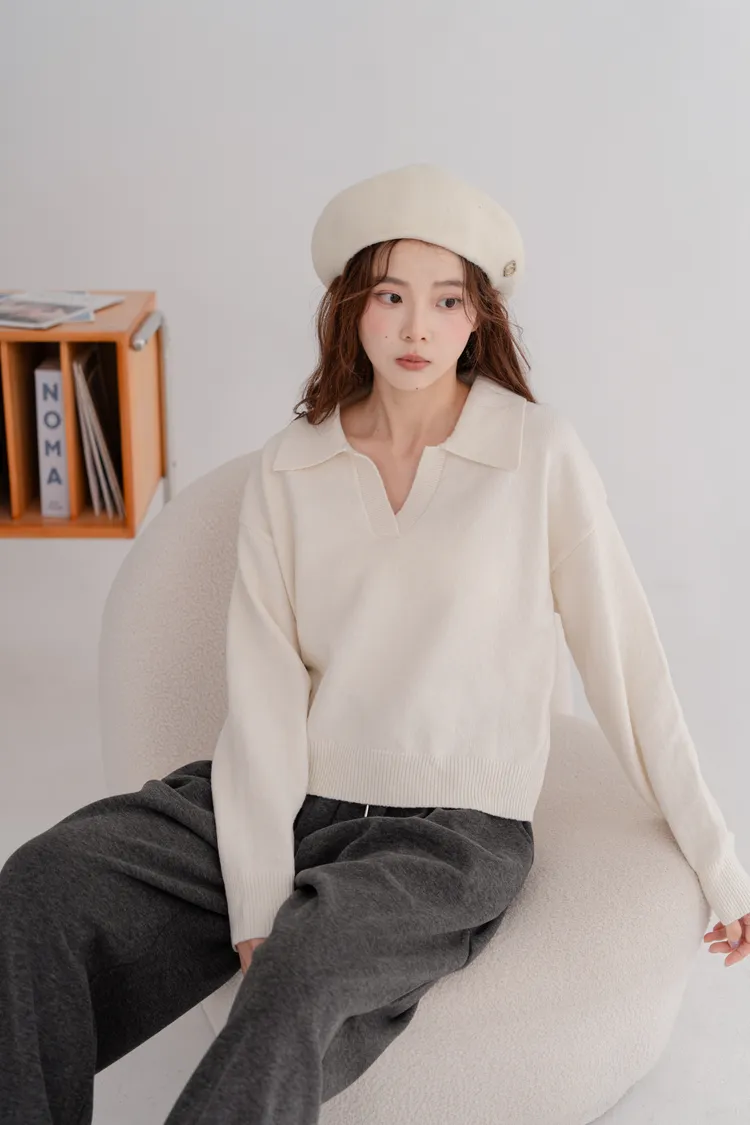 翻領短版素面毛衣