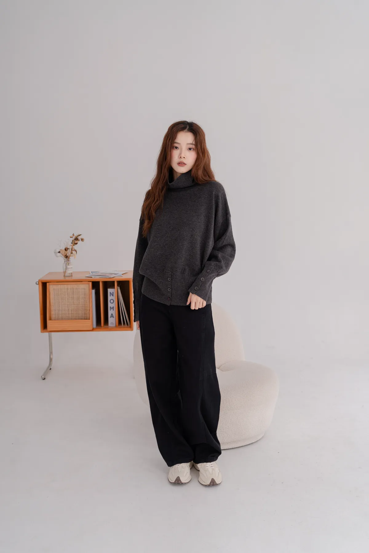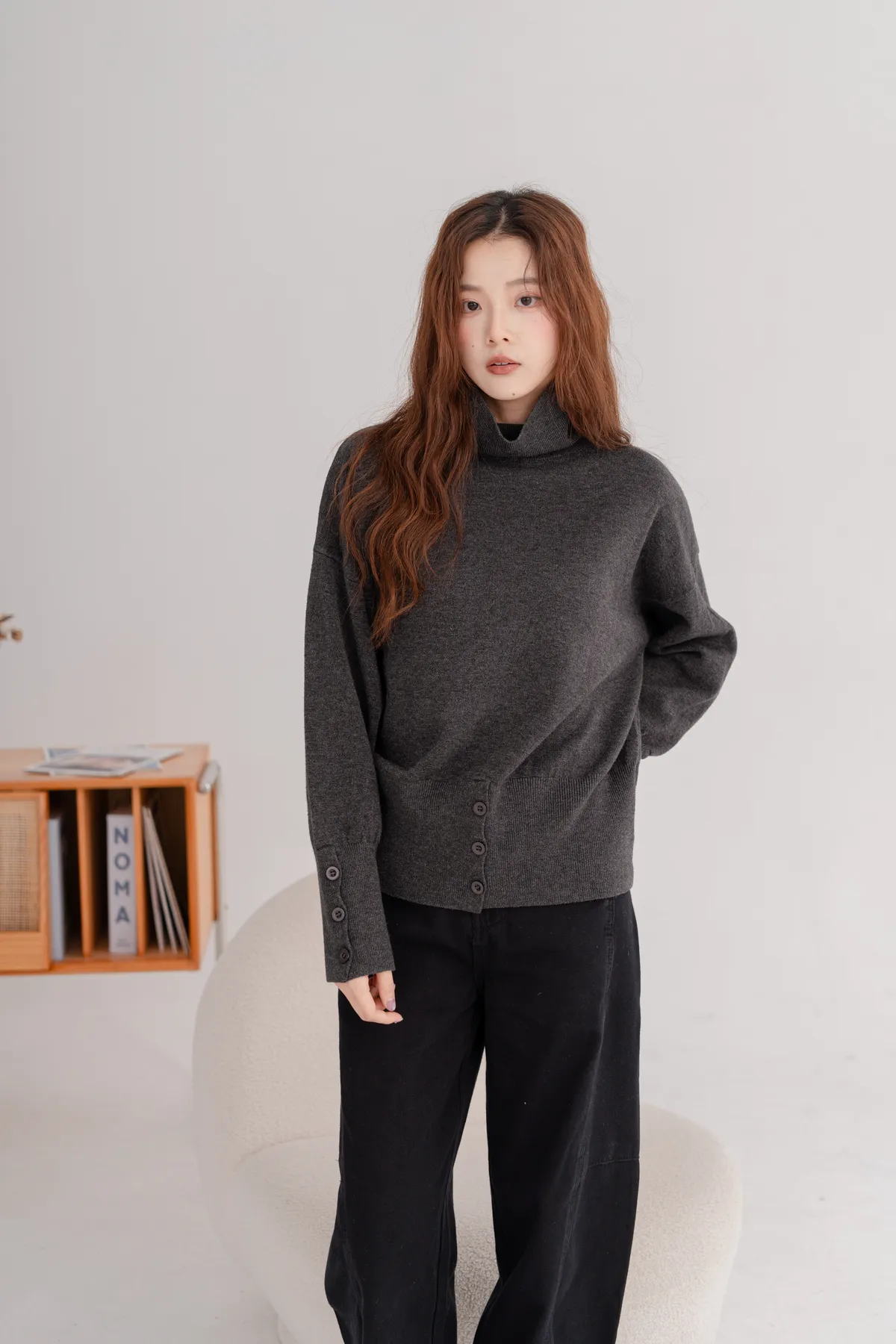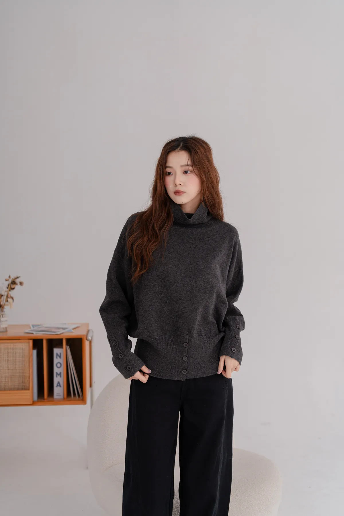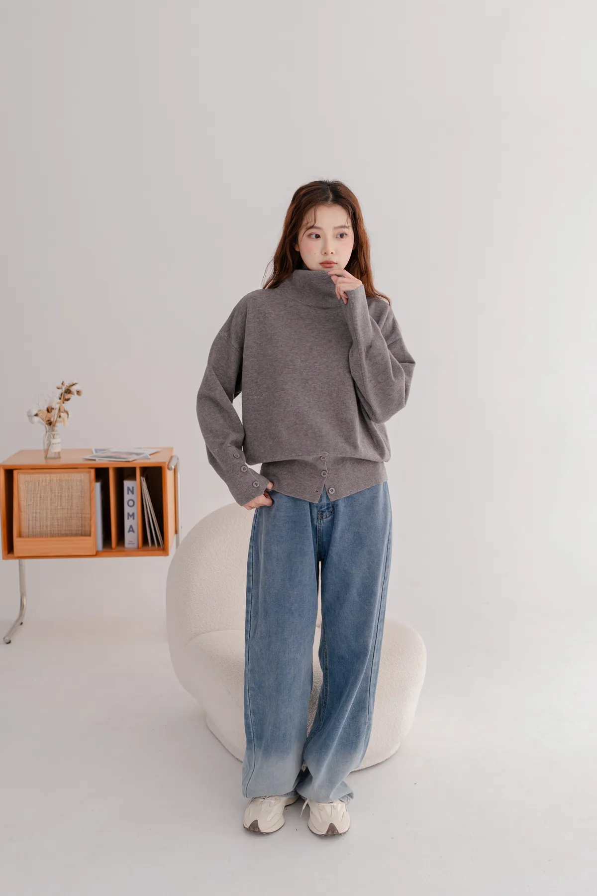 高領下排釦造型毛衣