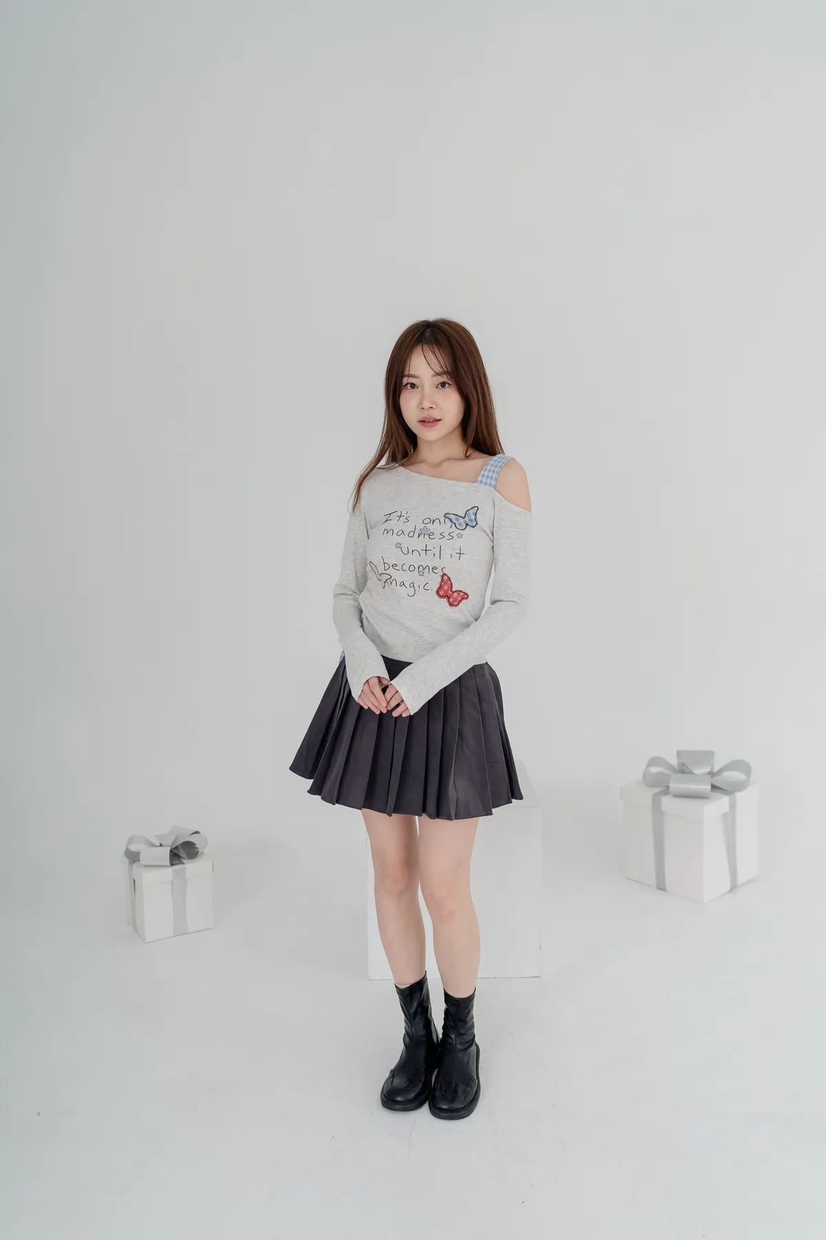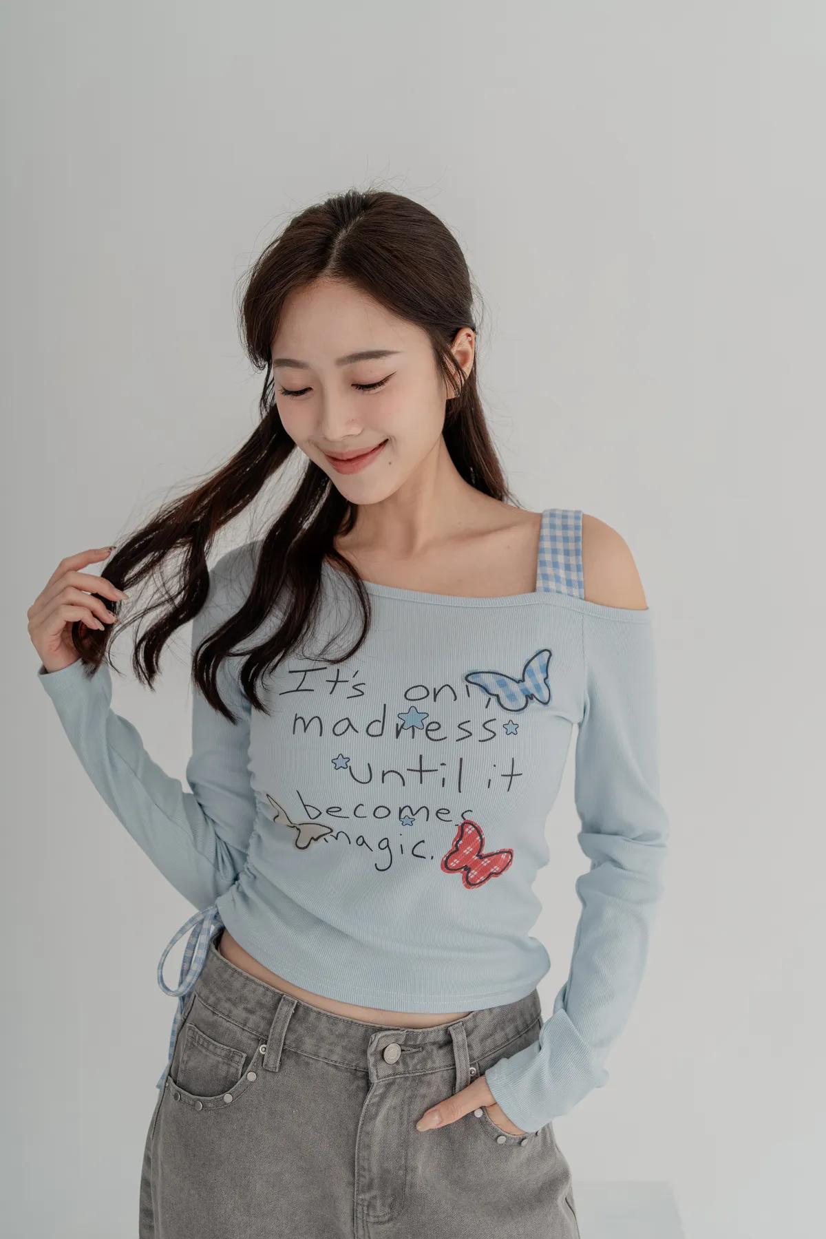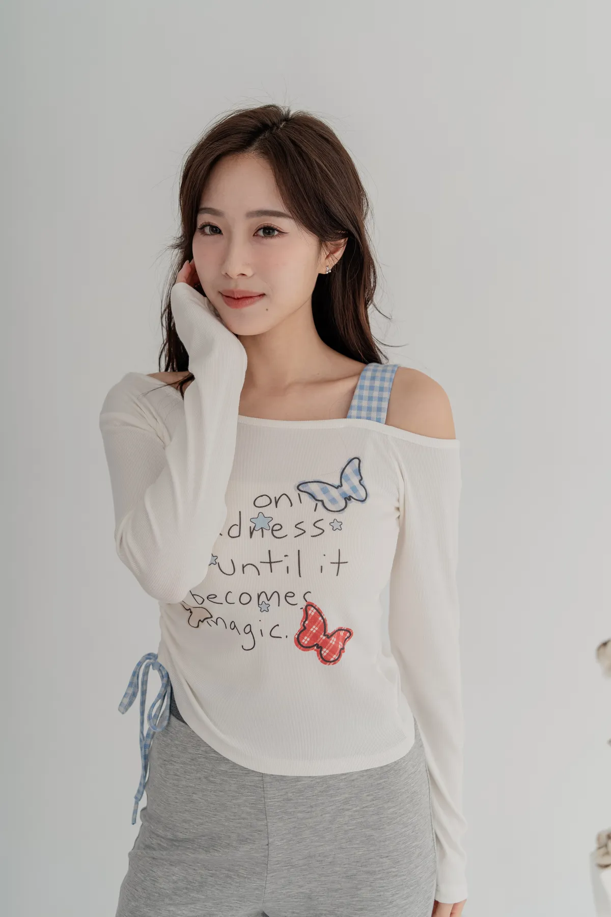 手寫感標語搭配蝴蝶圖案,傳達出青春、不設限的少女氣息。搭配短裙、百褶裙、牛仔褲都能輕鬆打造不同風格,是一件甜美、率性都能完美切換的高實穿單品。