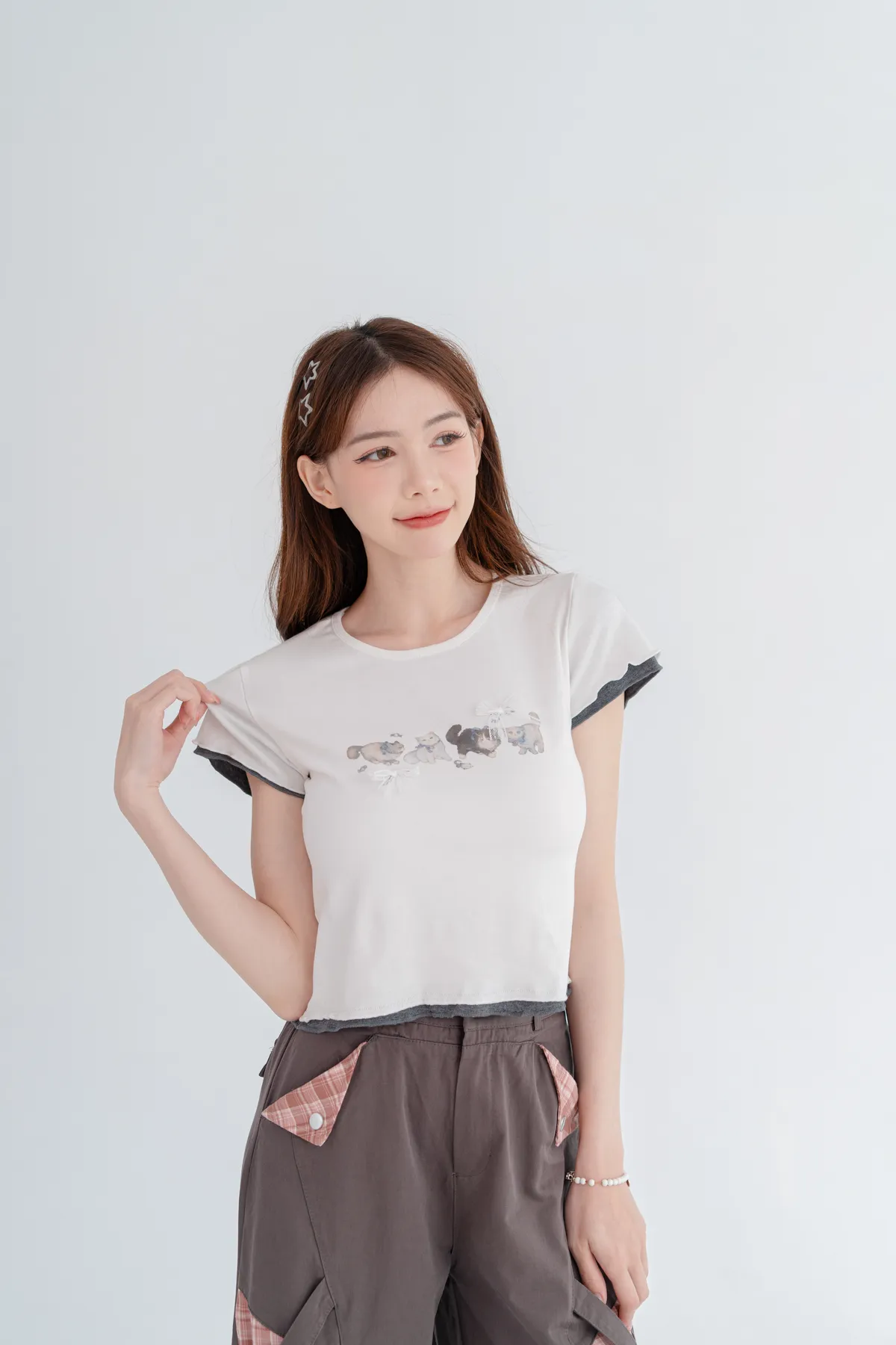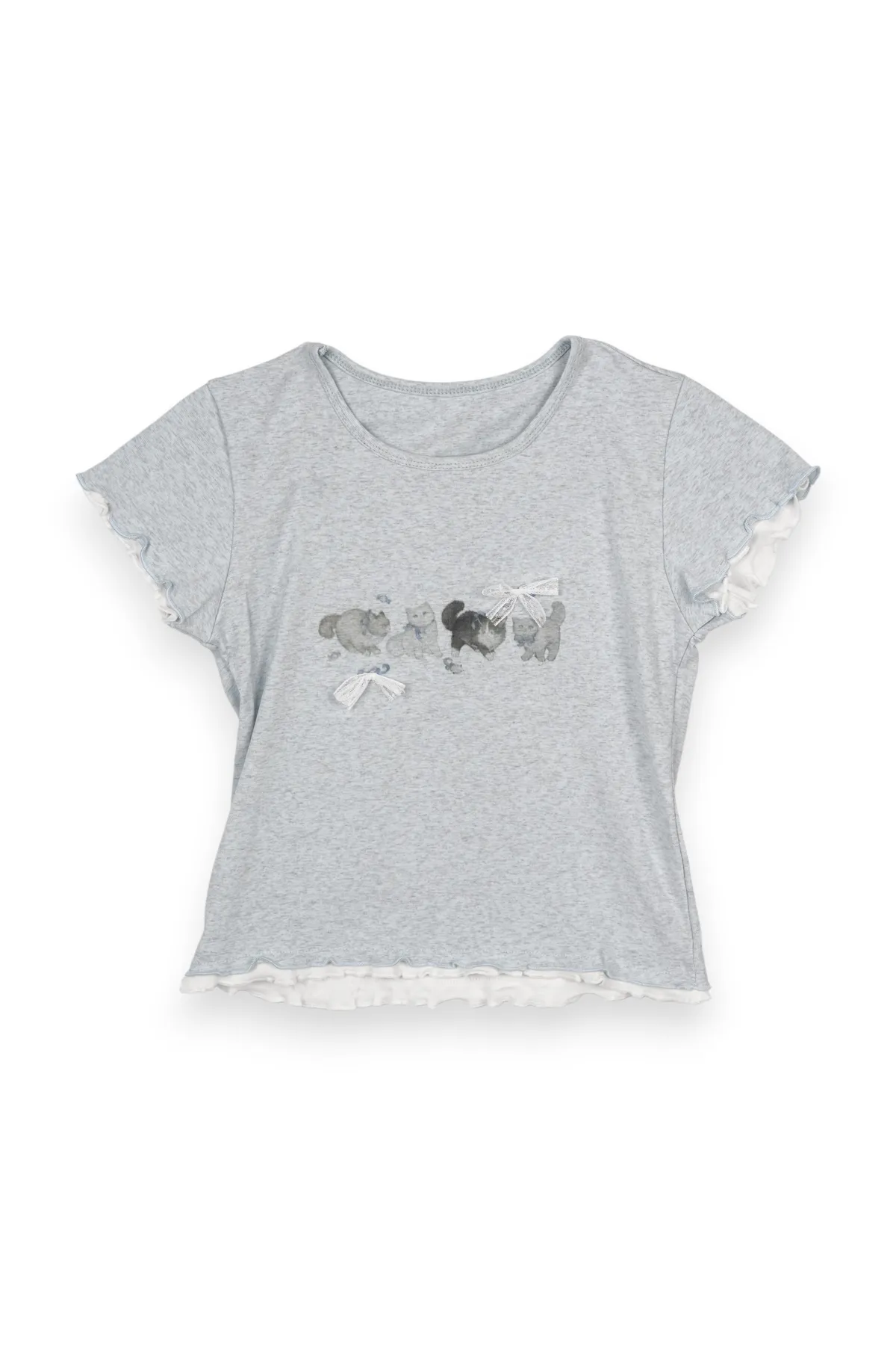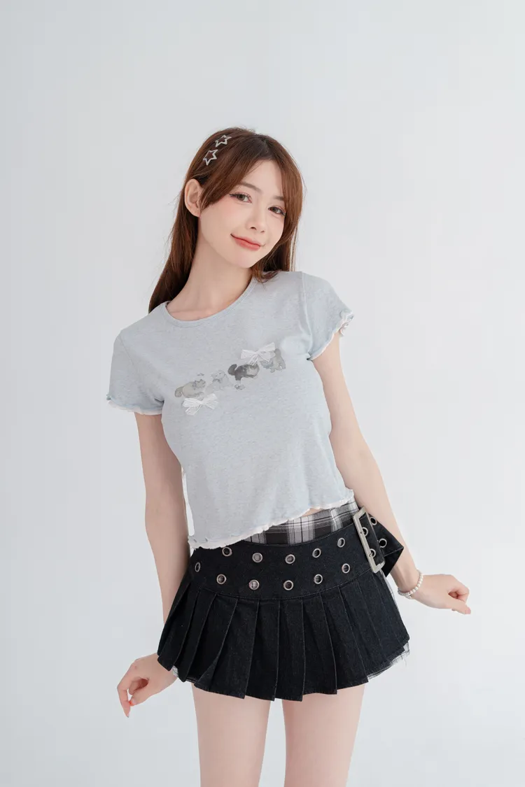 貓咪蝴蝶結木耳邊短T