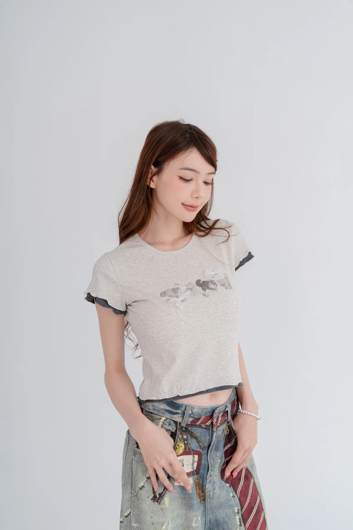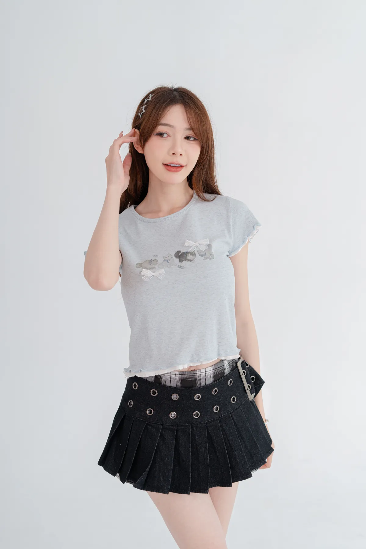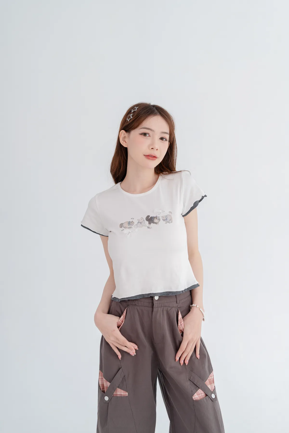 貓咪蝴蝶結木耳邊短T