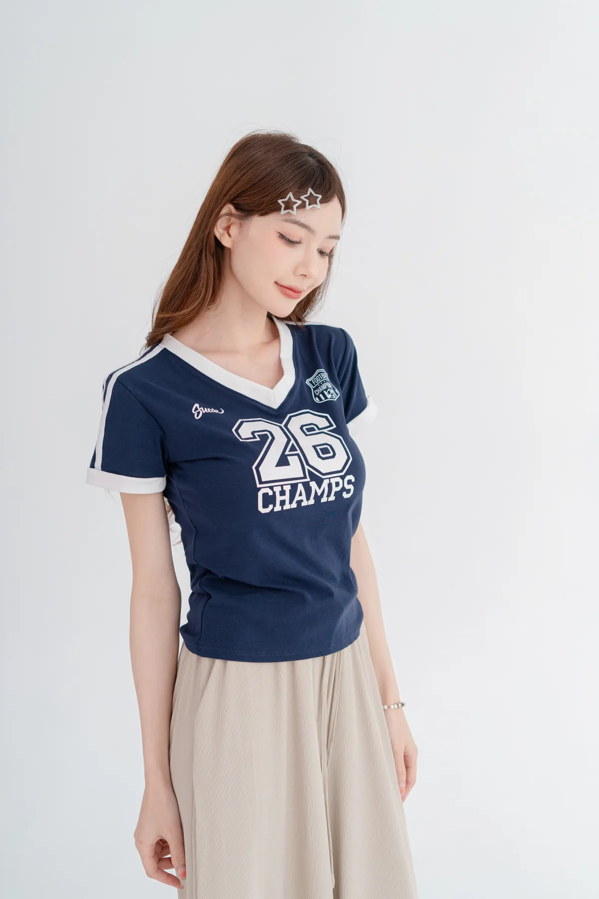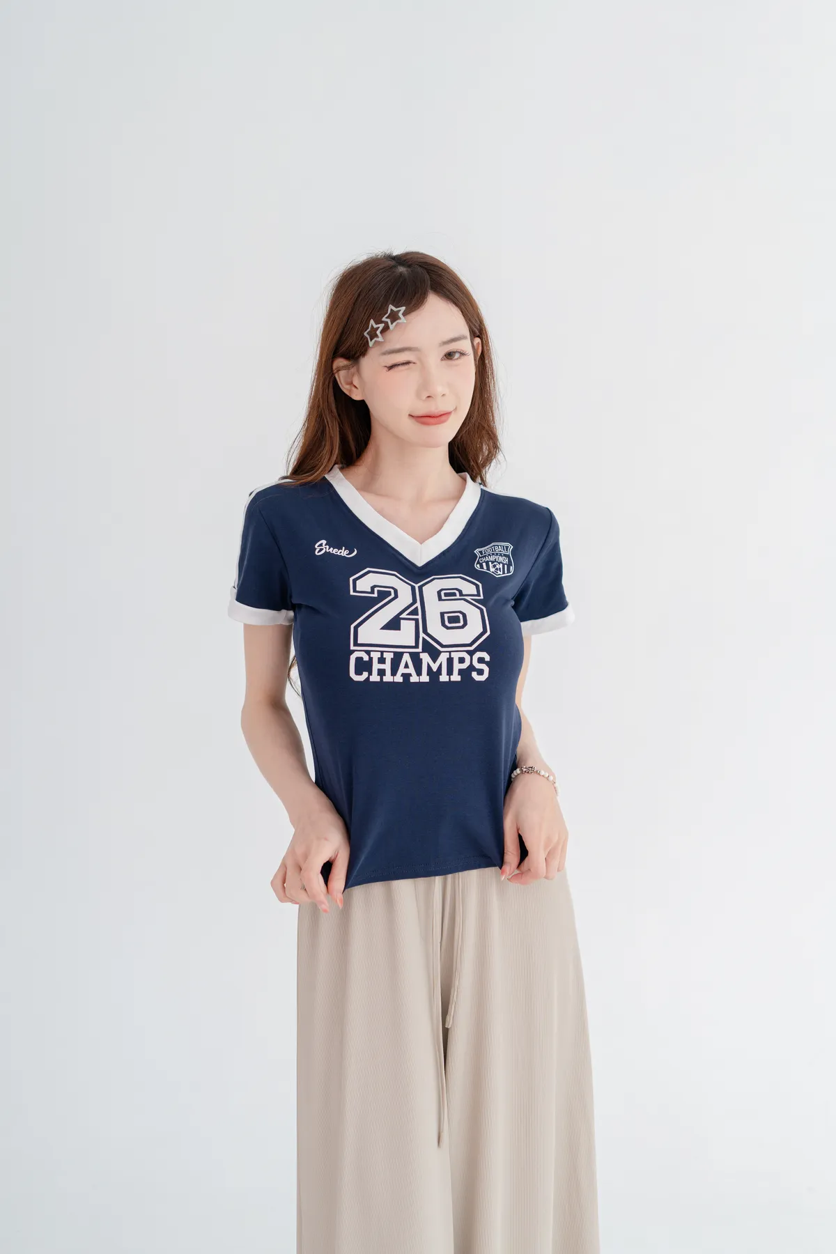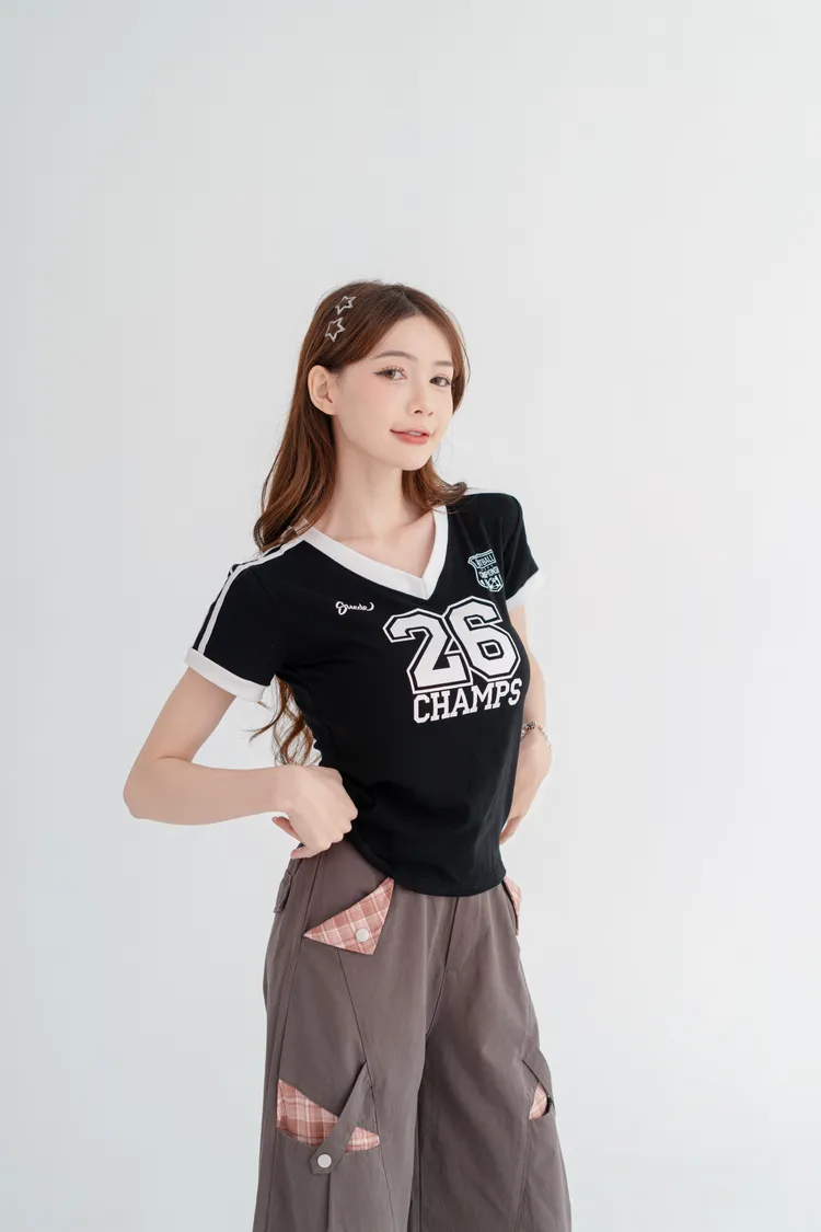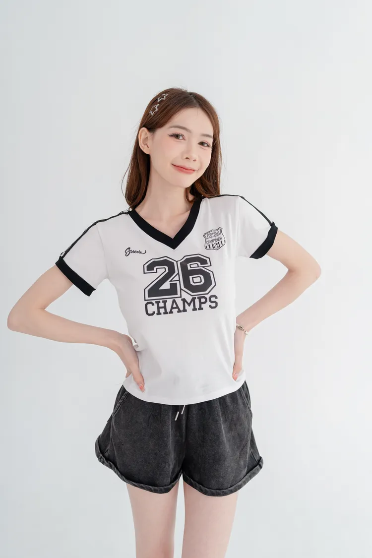 美式數字撞色V領T恤