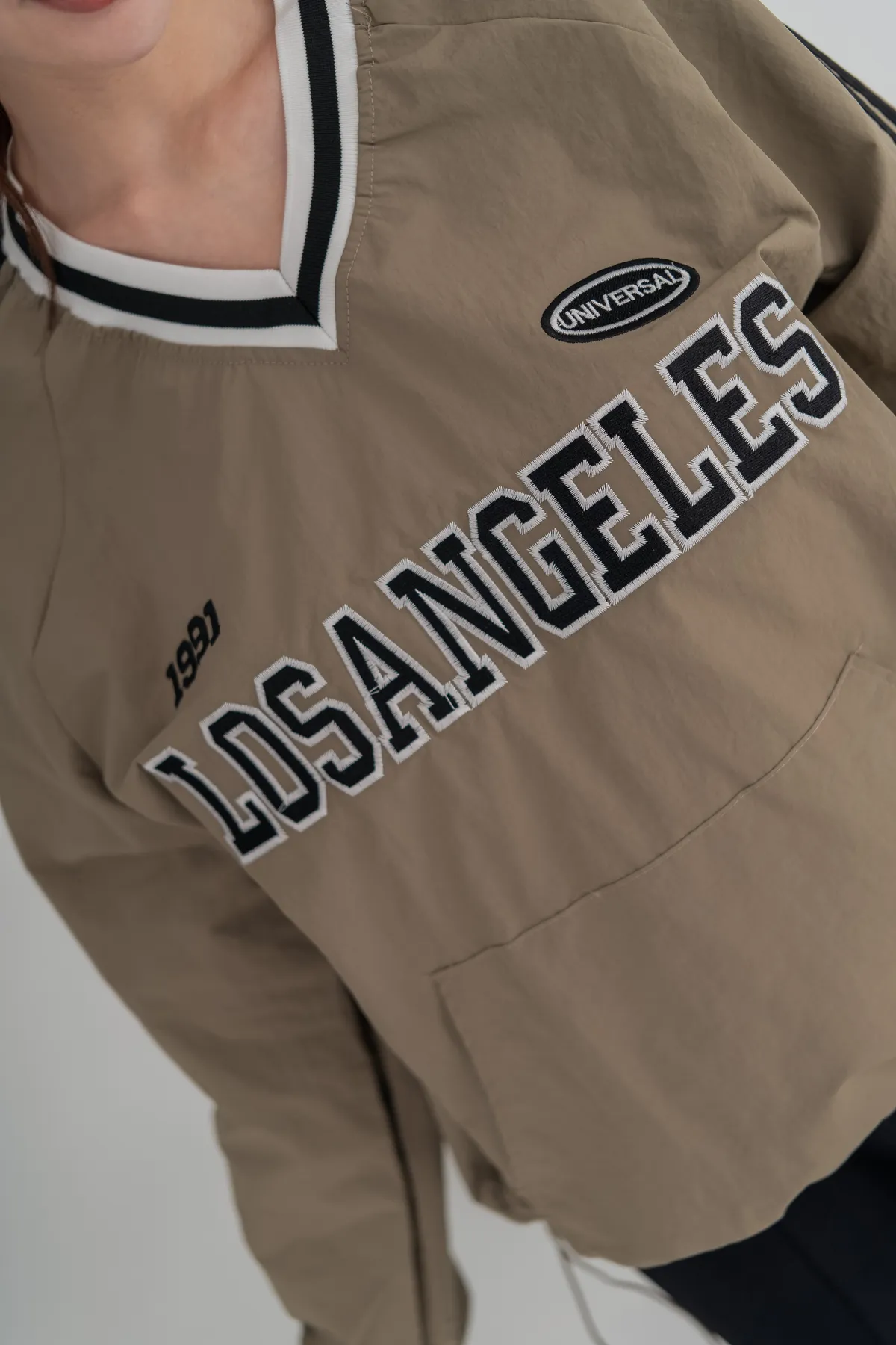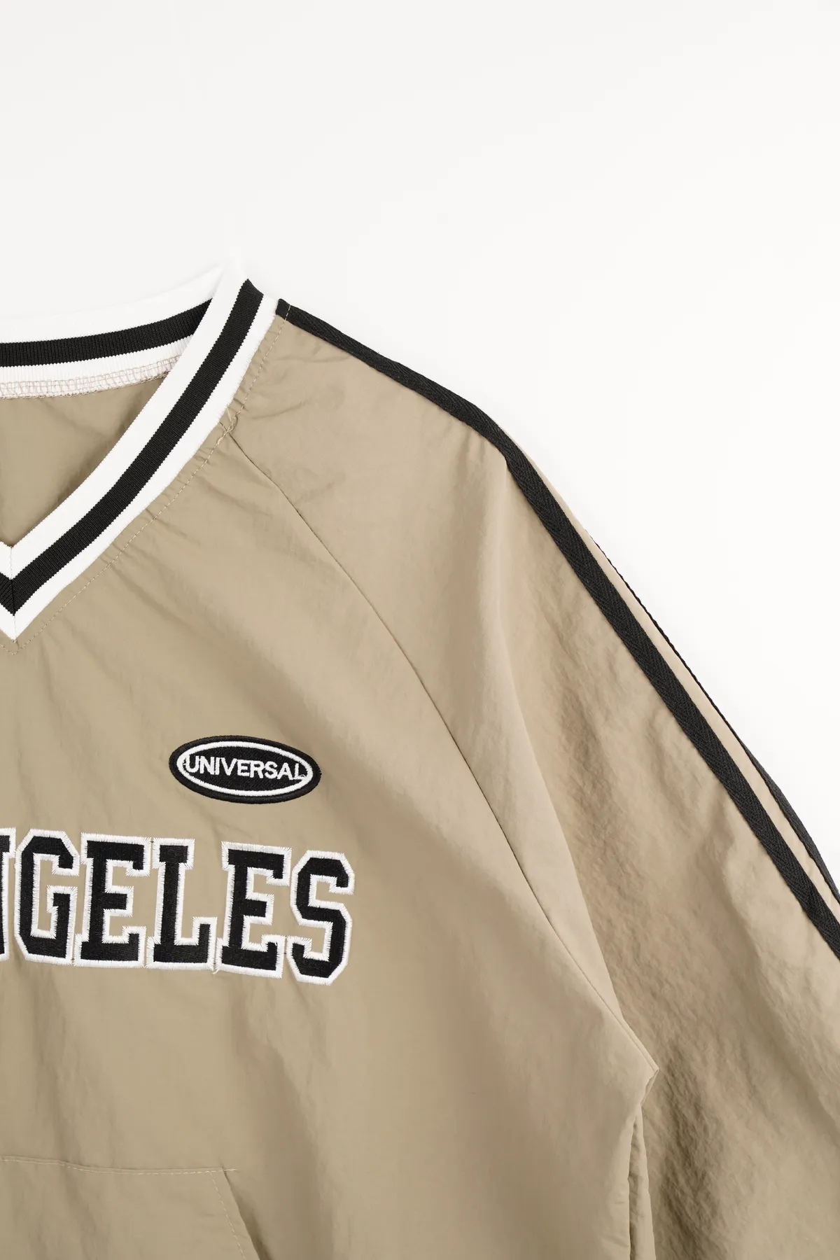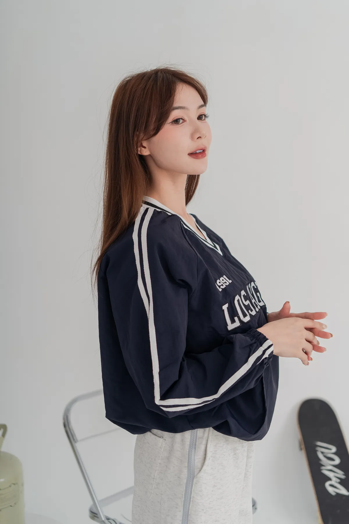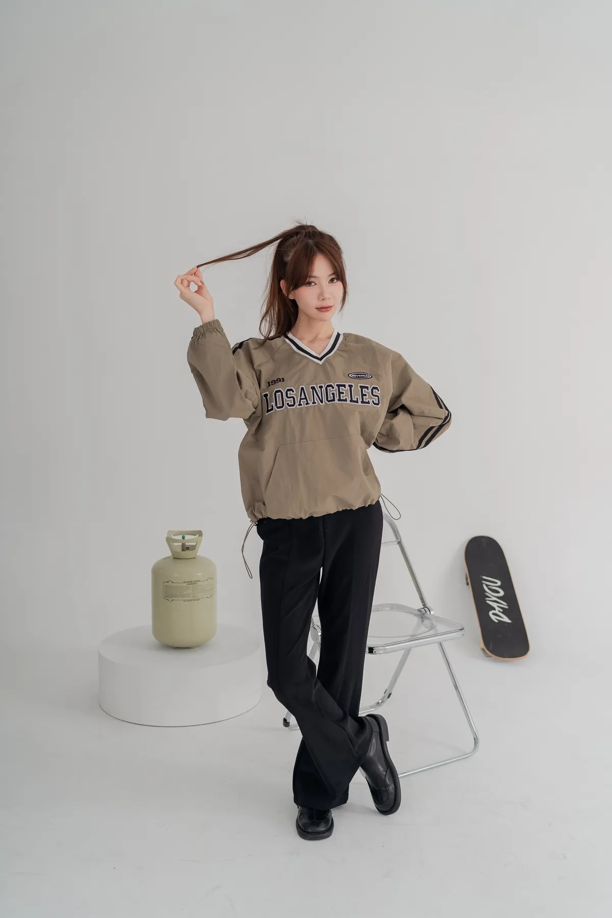 以美式學院風為靈感,這款上衣結合復古運動元素與俐落剪裁,胸前立體字母刺繡展現個性態度,V領撞色條紋設計修飾臉型與頸部線條,落肩版型與抽繩下擺設計,穿出自然的休閒輪廓。