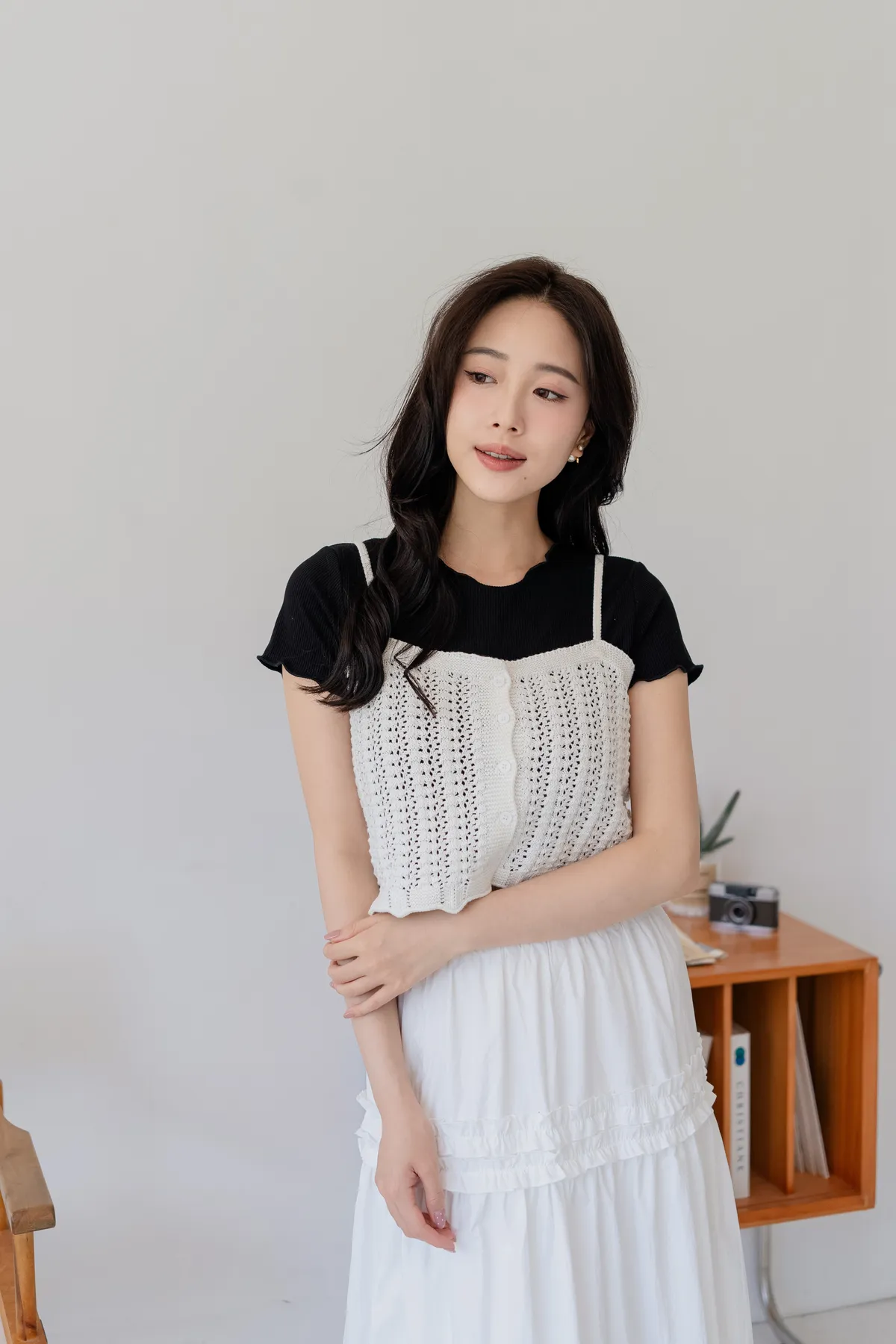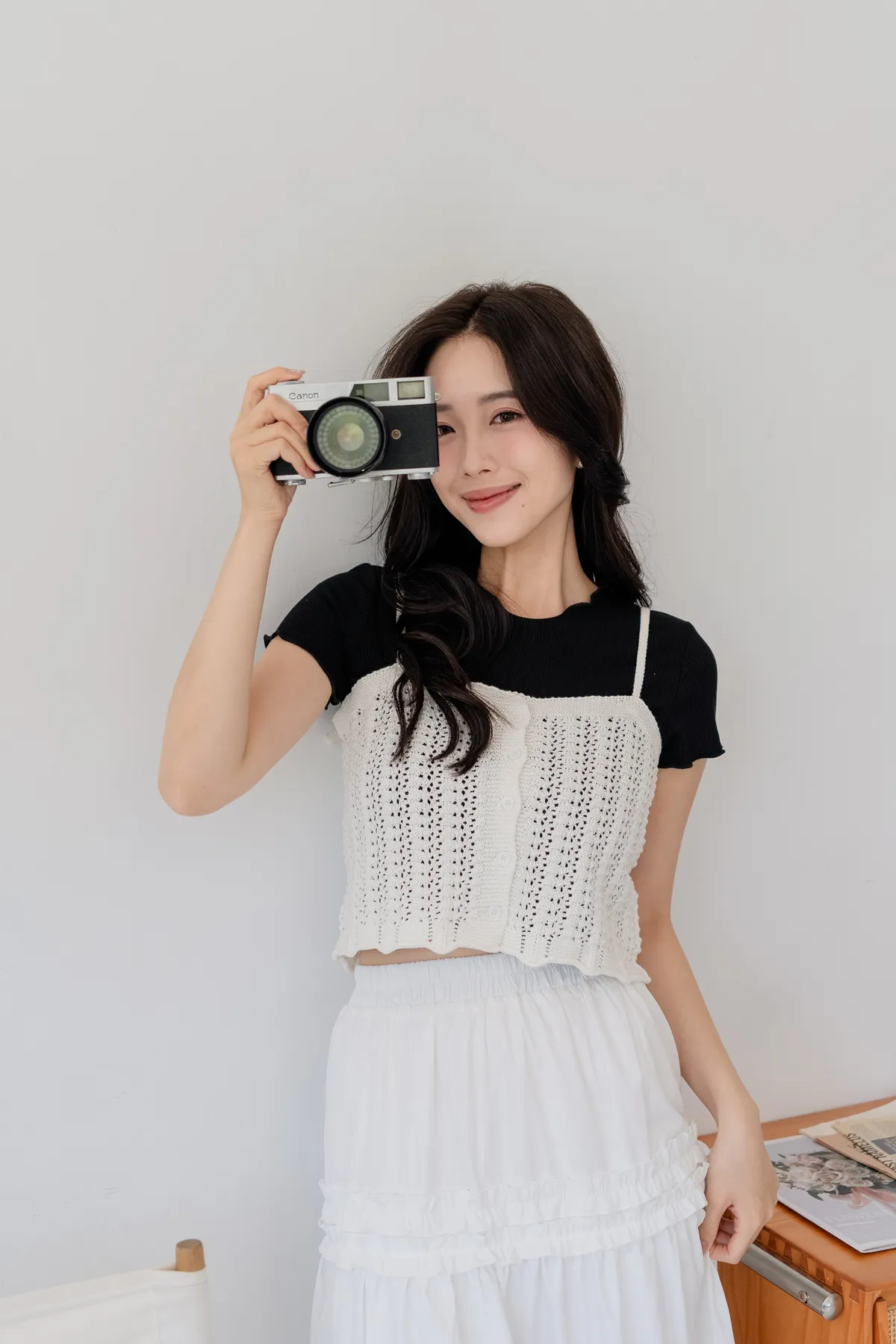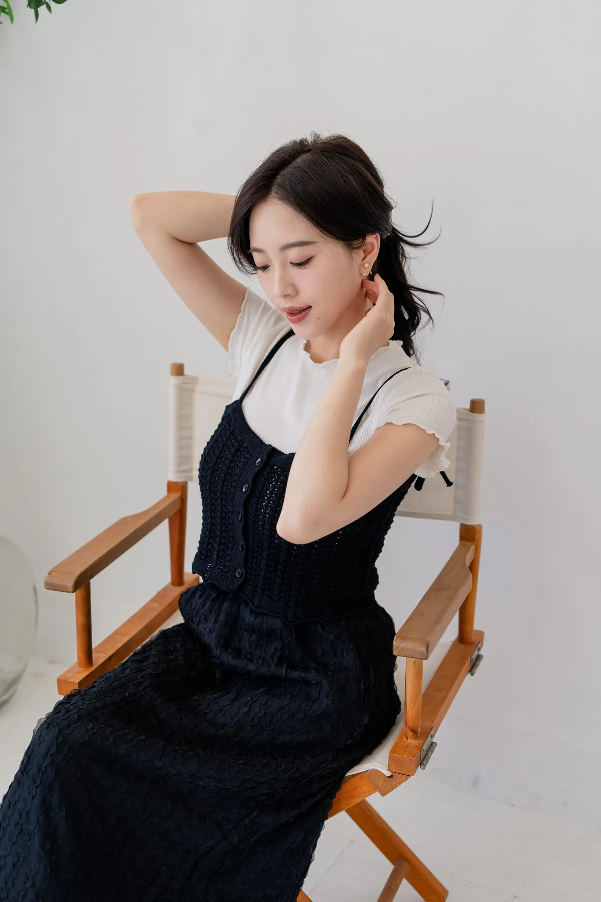 商品資訊:細緻的鏤空編織設計,帶出自然的呼吸感與夏日的輕盈氛圍;排釦點綴則增添細節層次,讓基本單品也能展現精緻感。