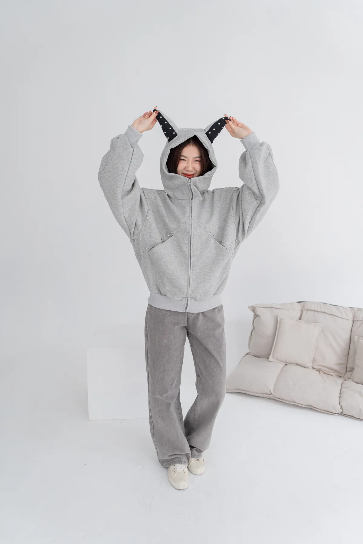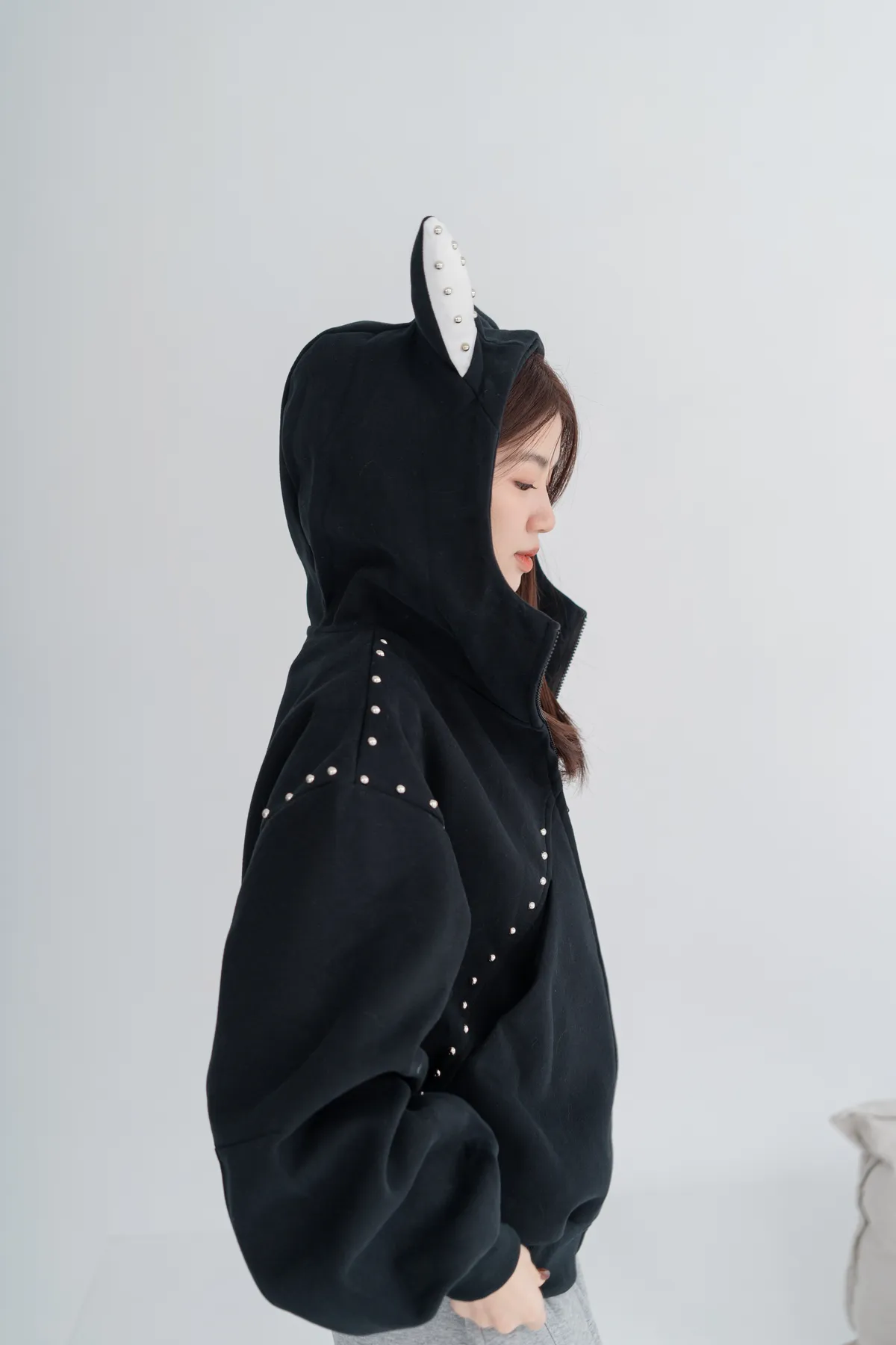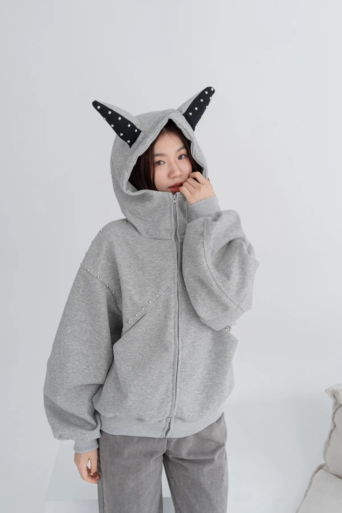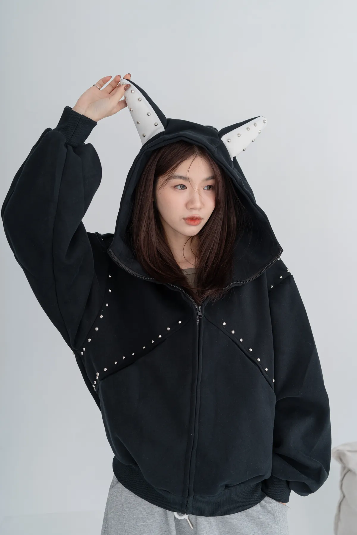 立體耳朵造型,加上金屬鉚釘細節,瞬間把可愛與帥氣合而為一。寬鬆輪廓穿起來不挑人,拉鍊式設計更方便日常搭配,無論內搭運動背心、貼身上衣或簡單 T-shirt 都能強化層次感。