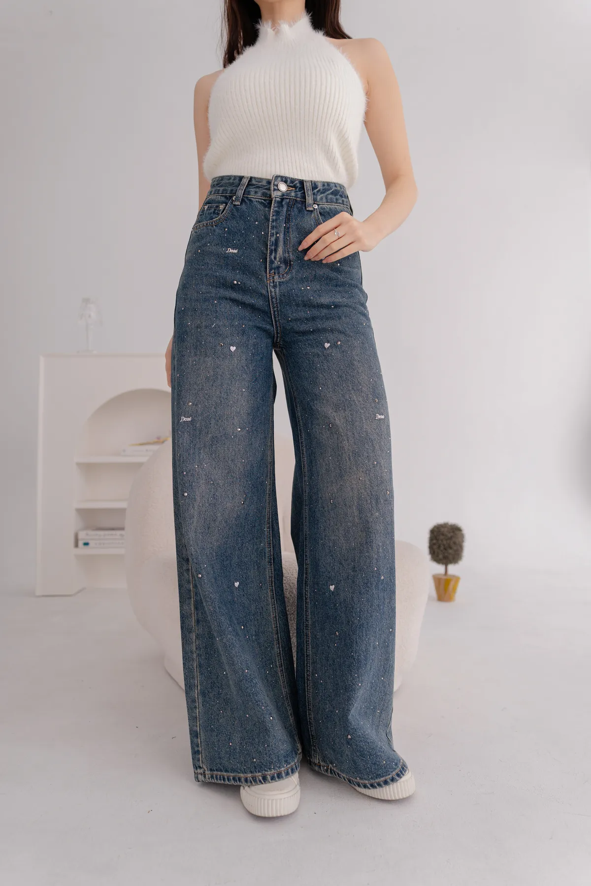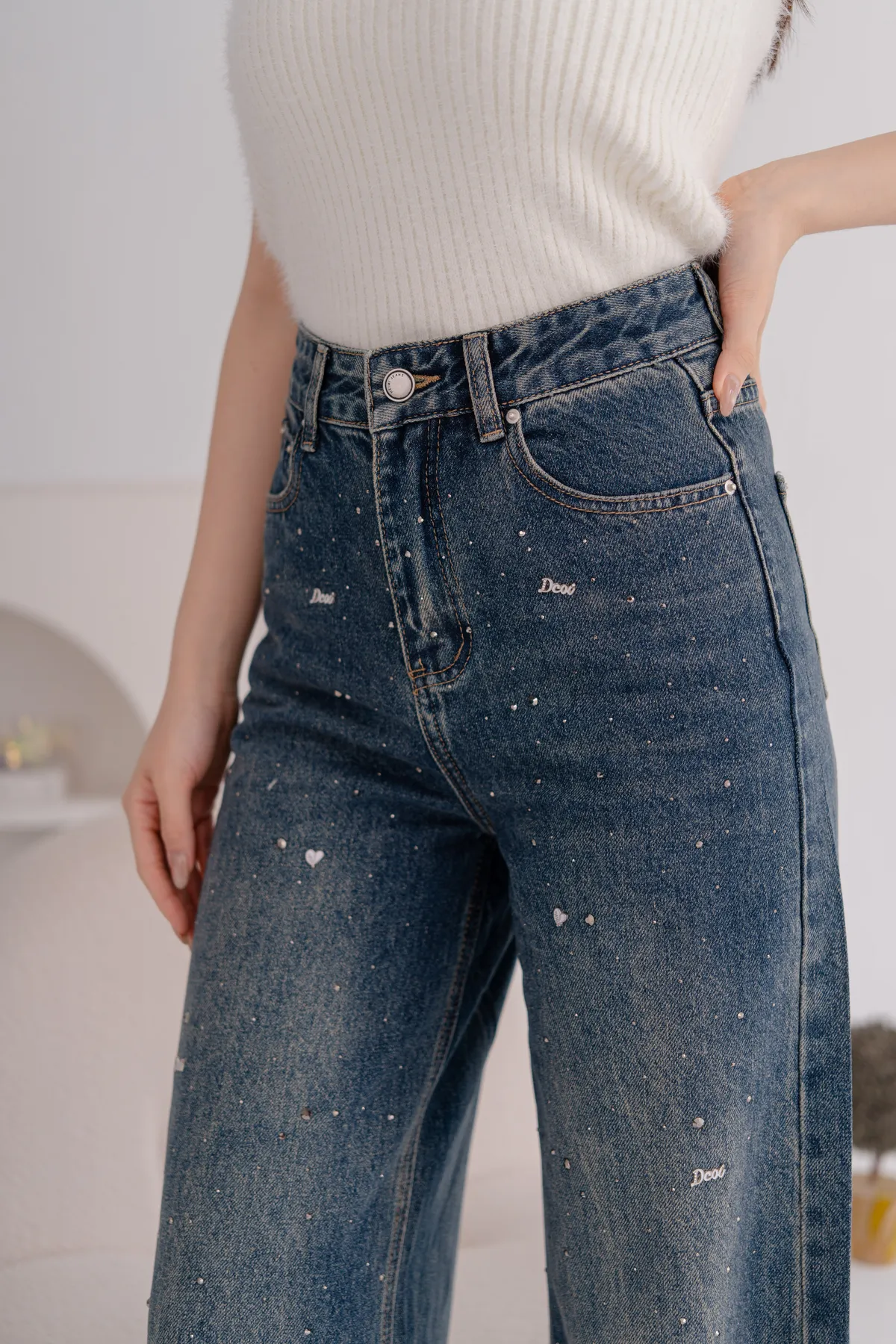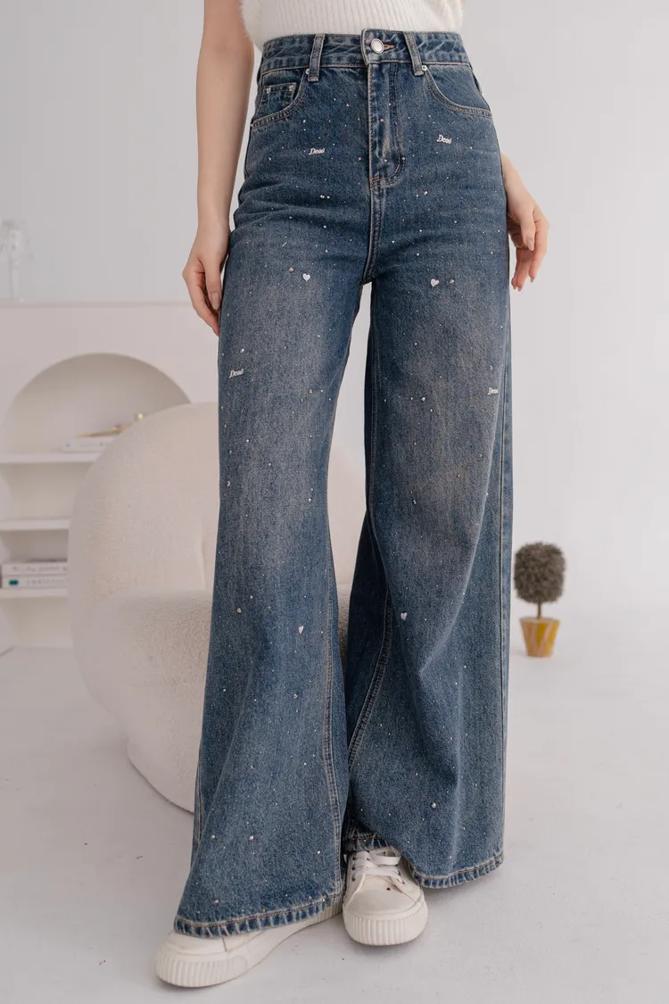 亮鑽貓抓水洗牛仔寬褲