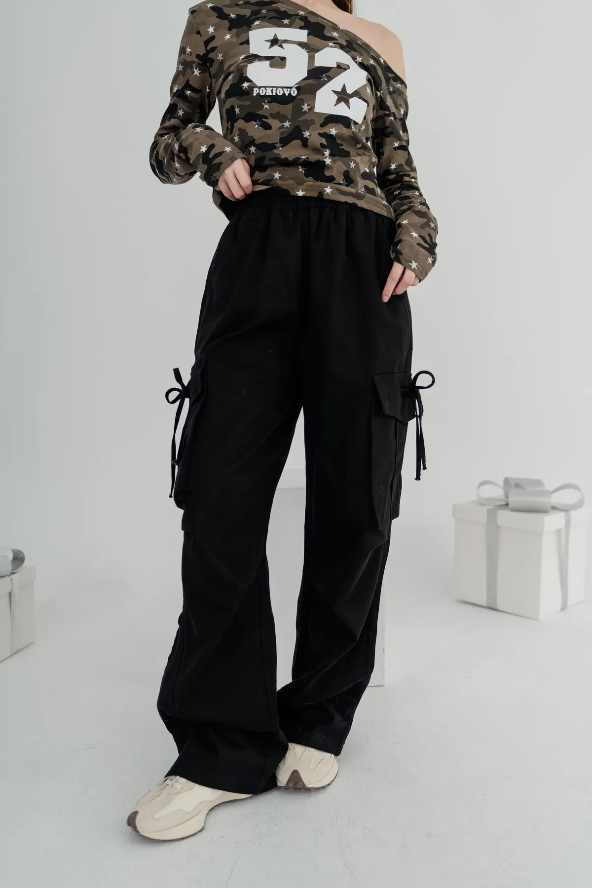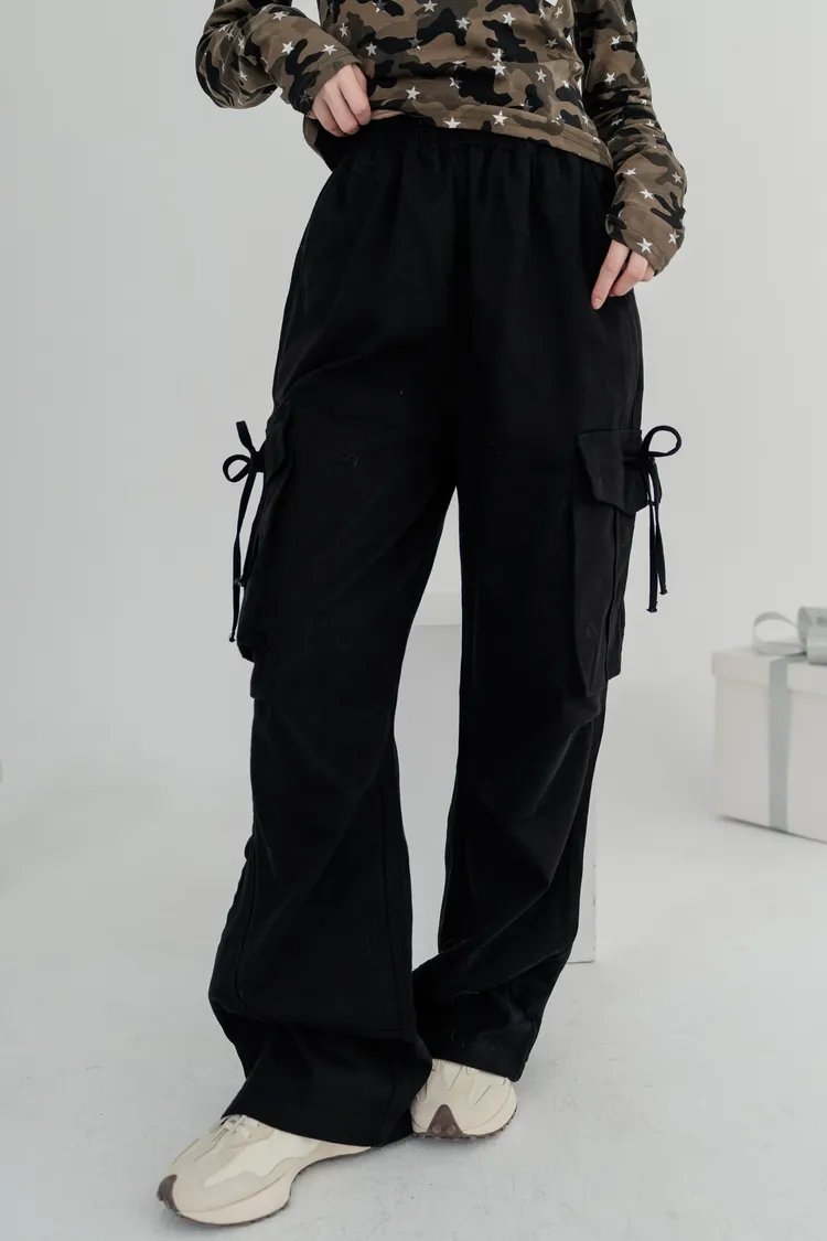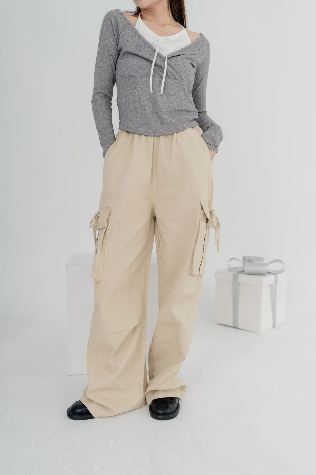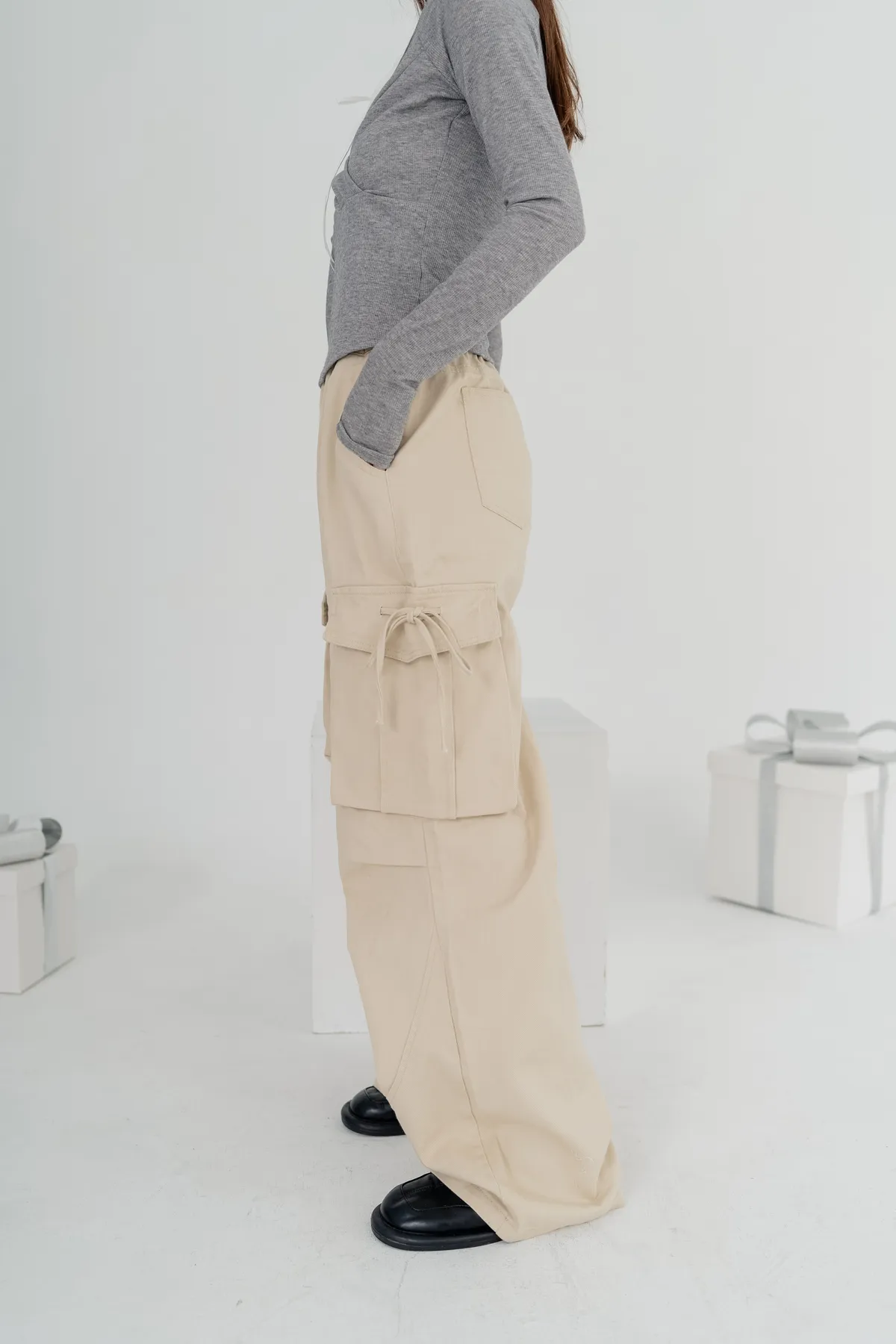 高腰剪裁拉長比例,寬直褲管設計修飾腿部線條,腰頭鬆緊設計不勒肚