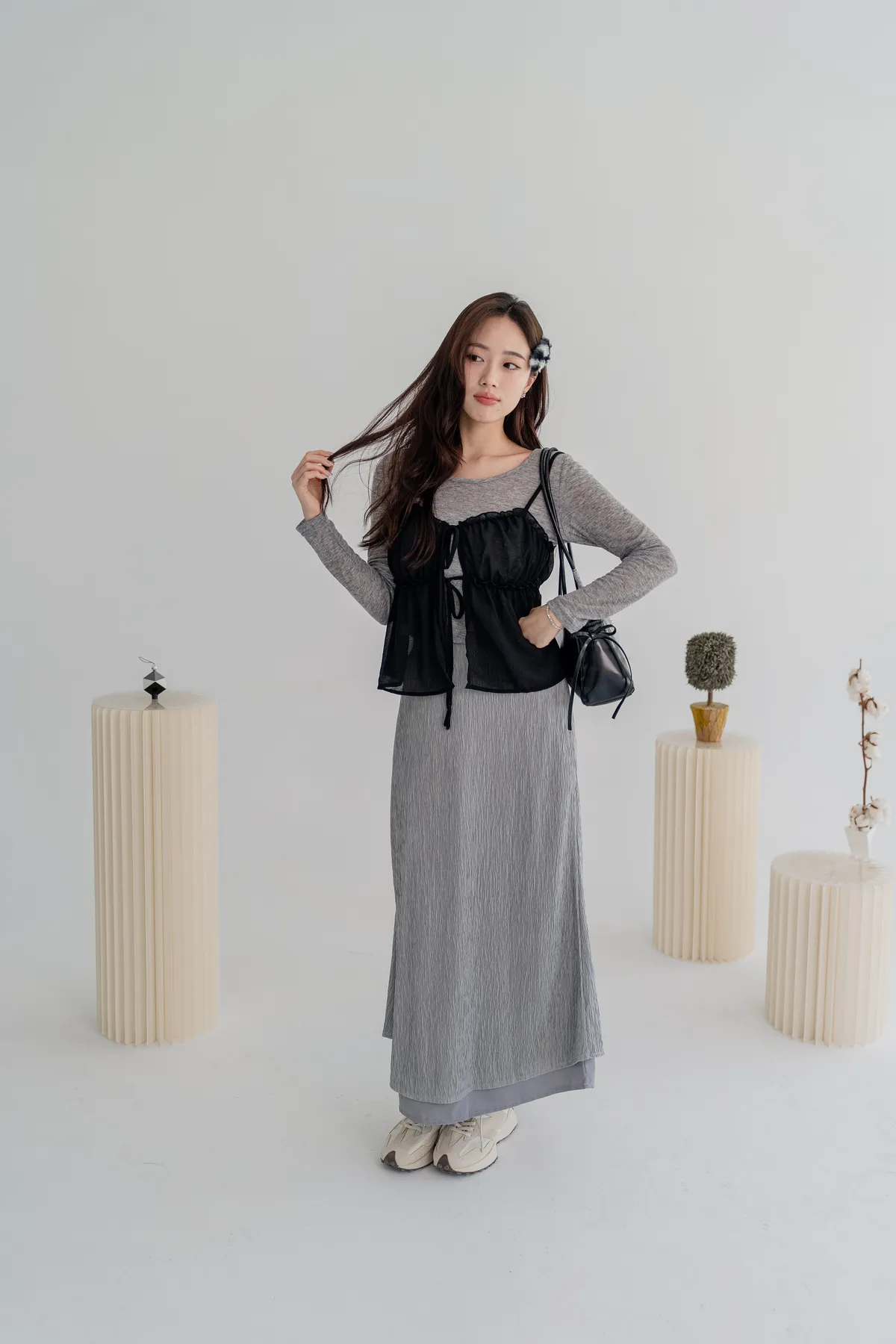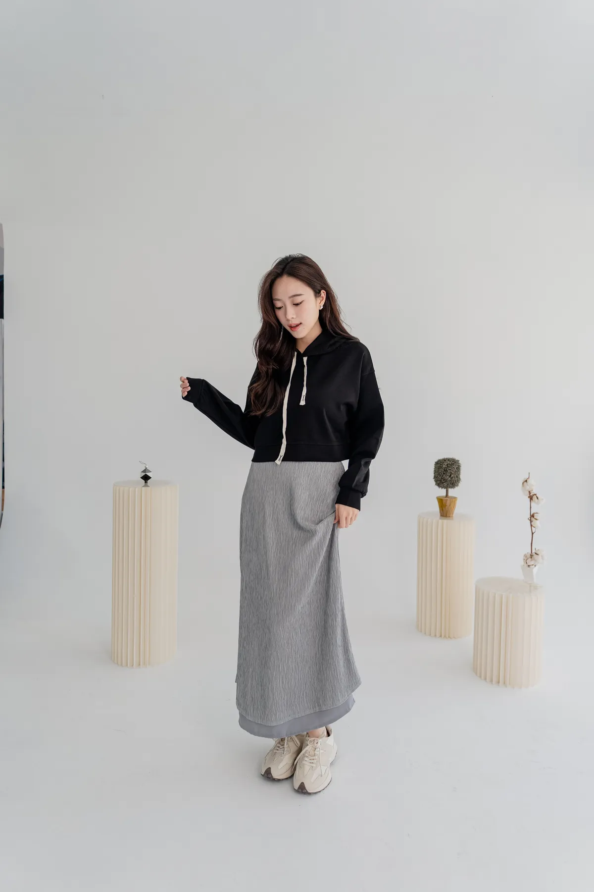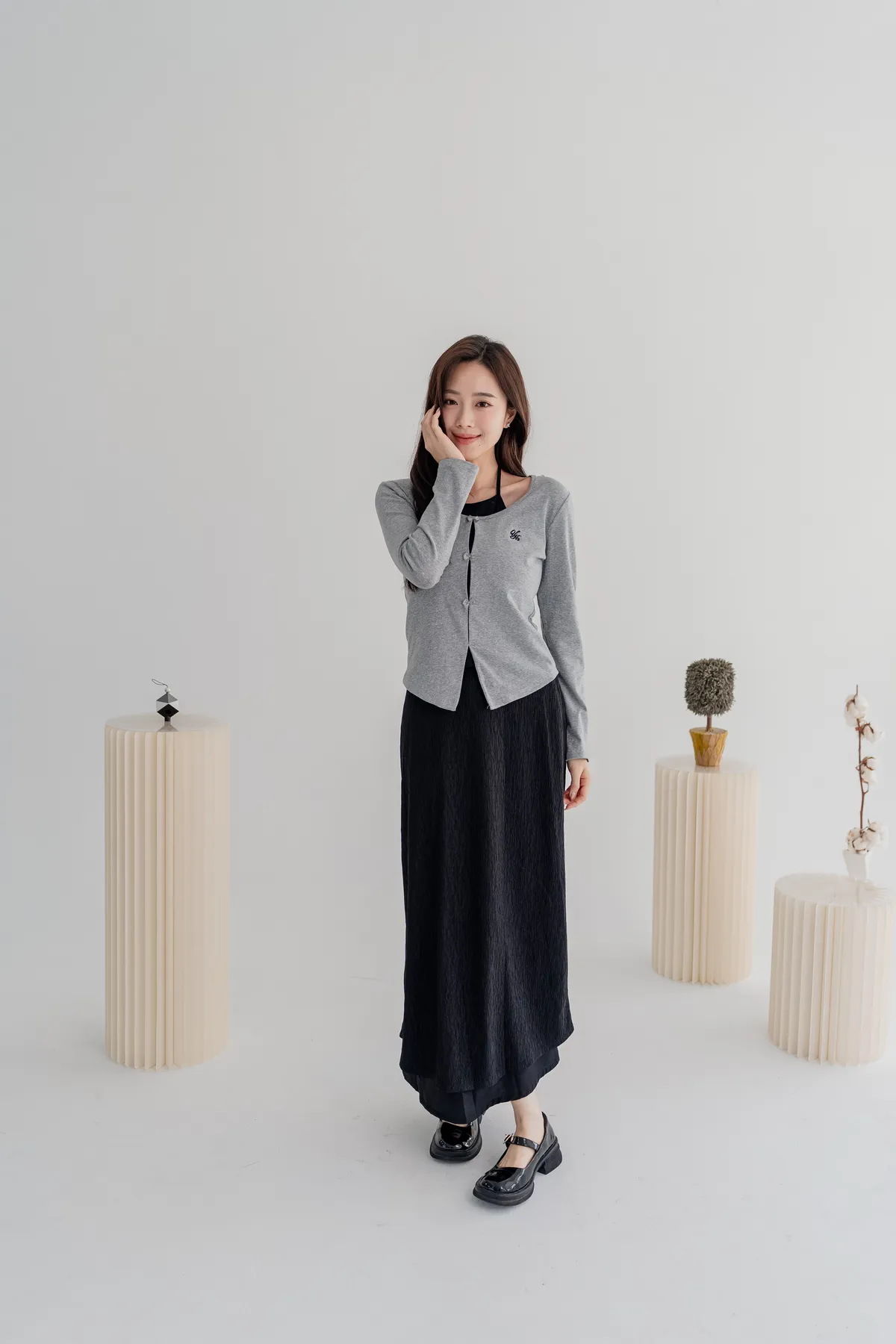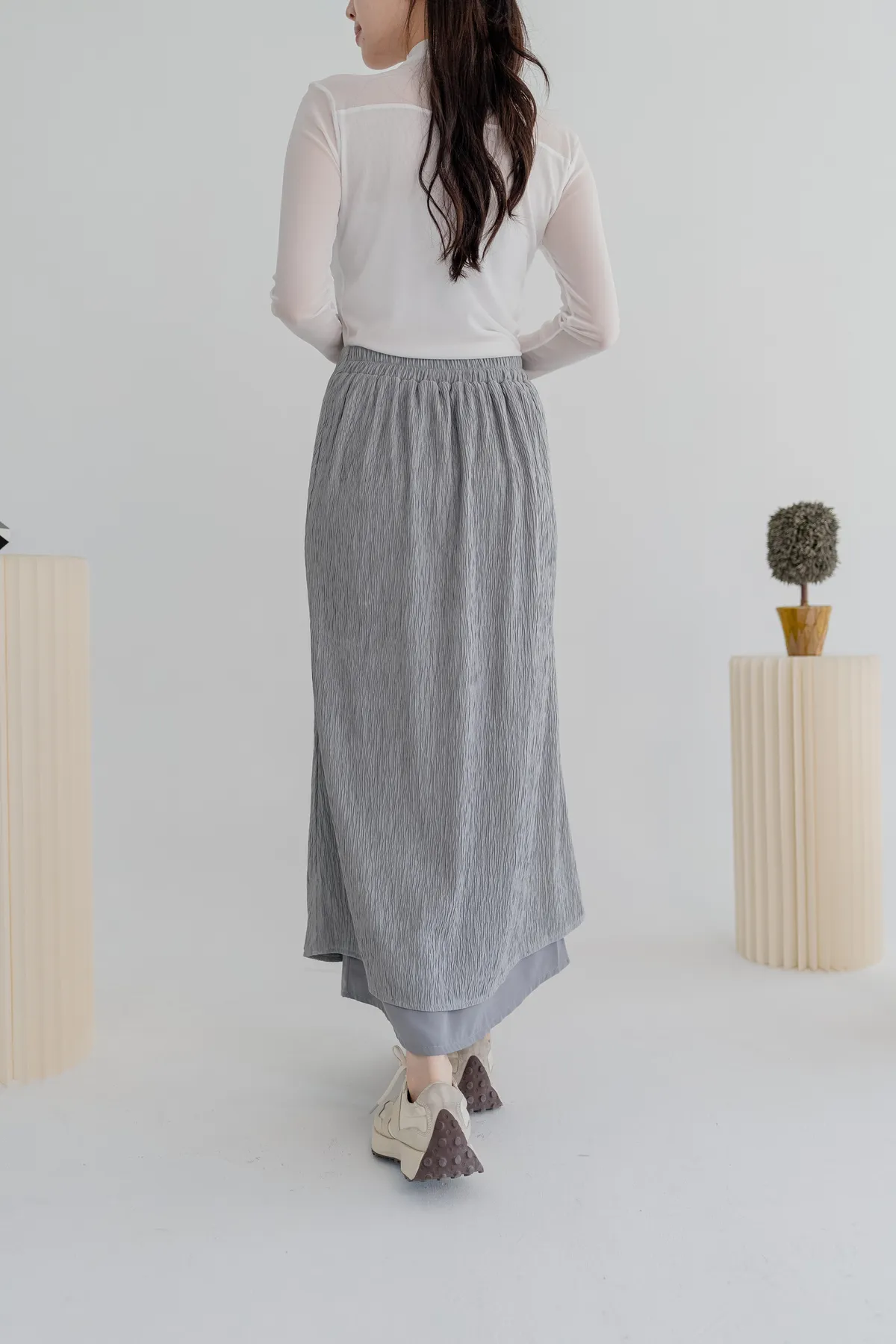 商品資訊:細緻壓摺布料帶出自然垂墜感,修身剪裁拉長比例,展現溫柔流線。