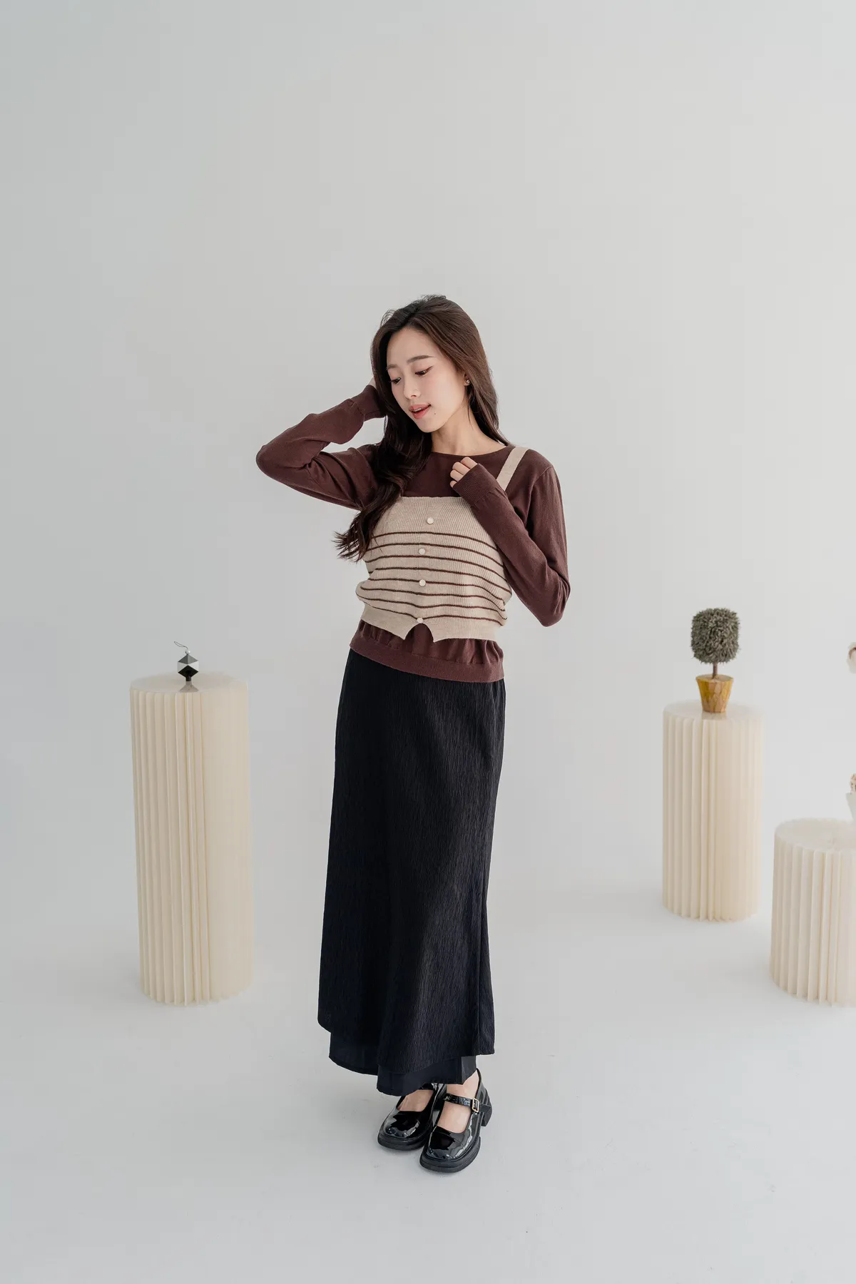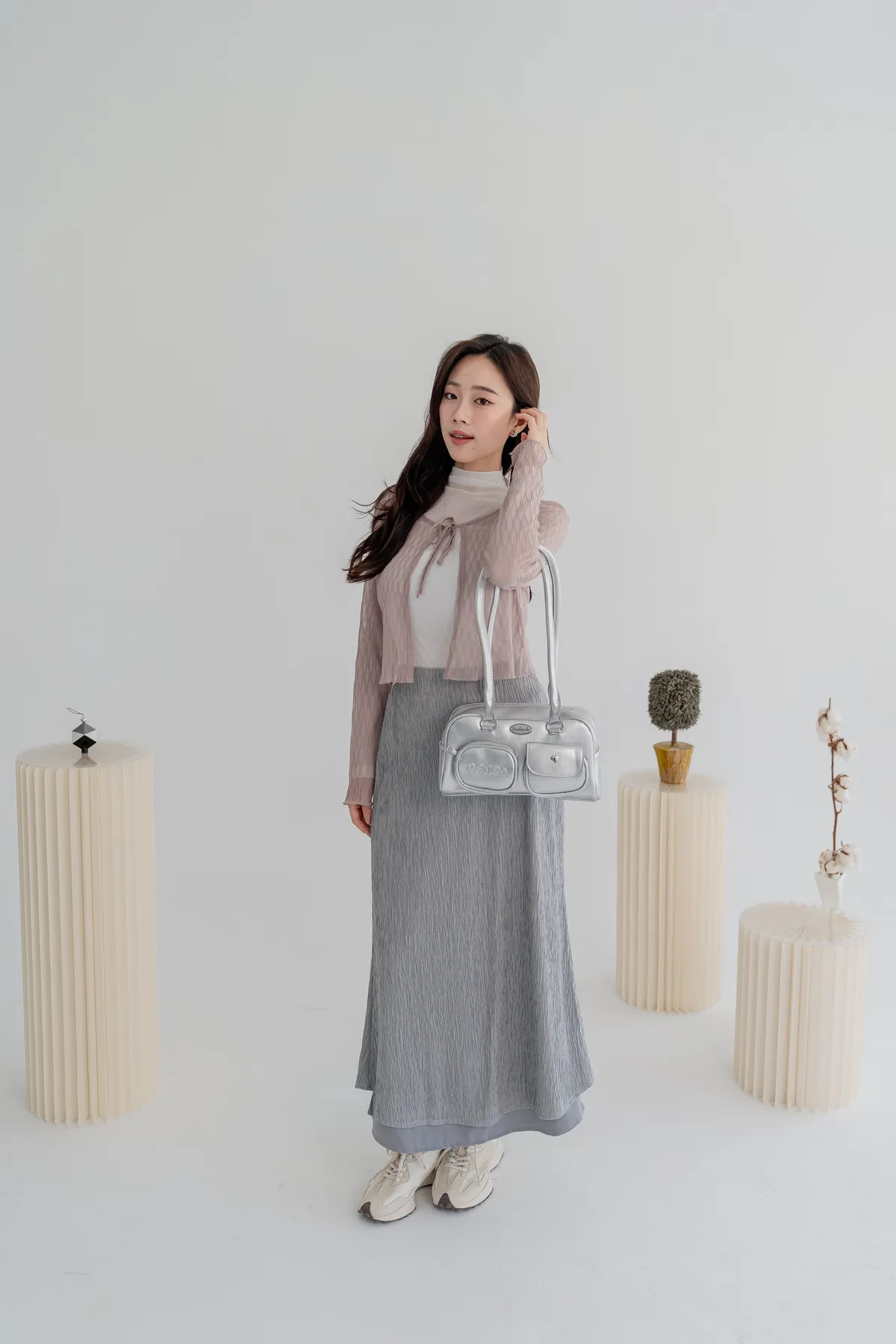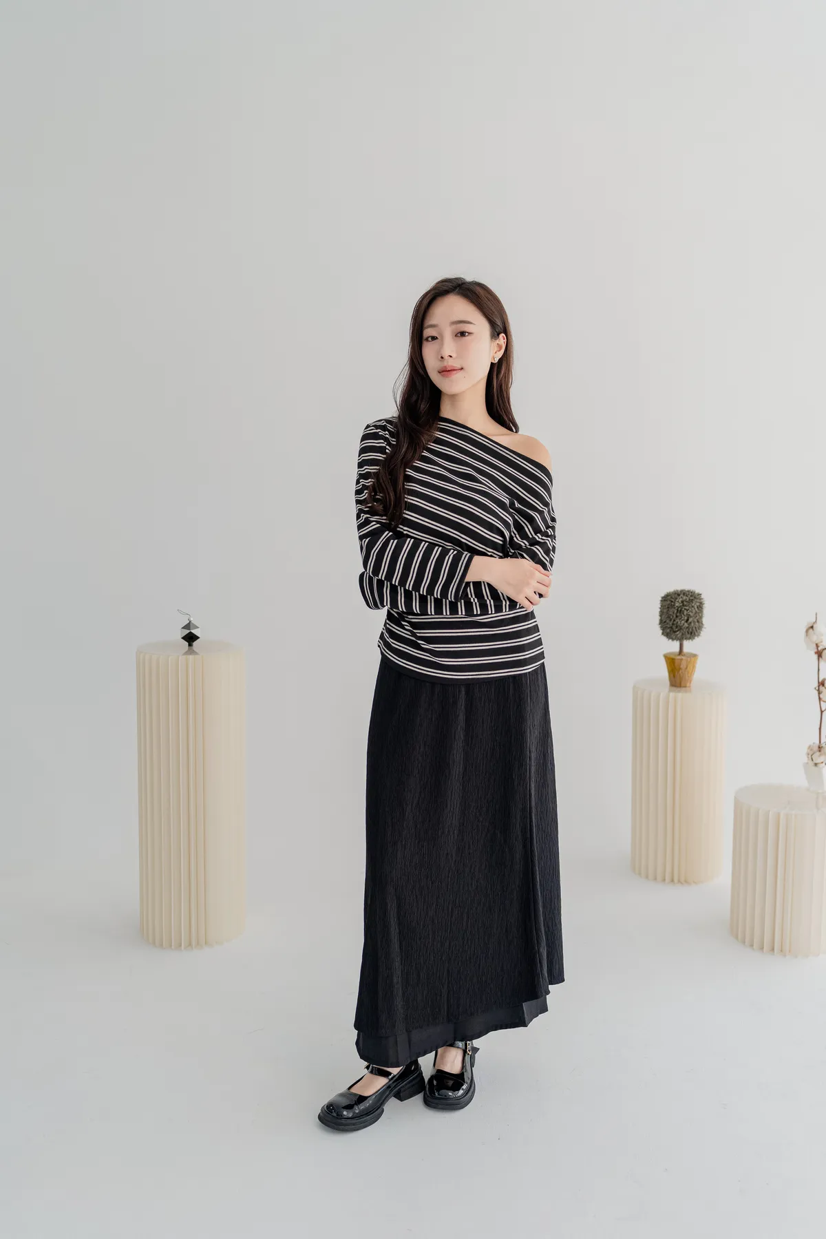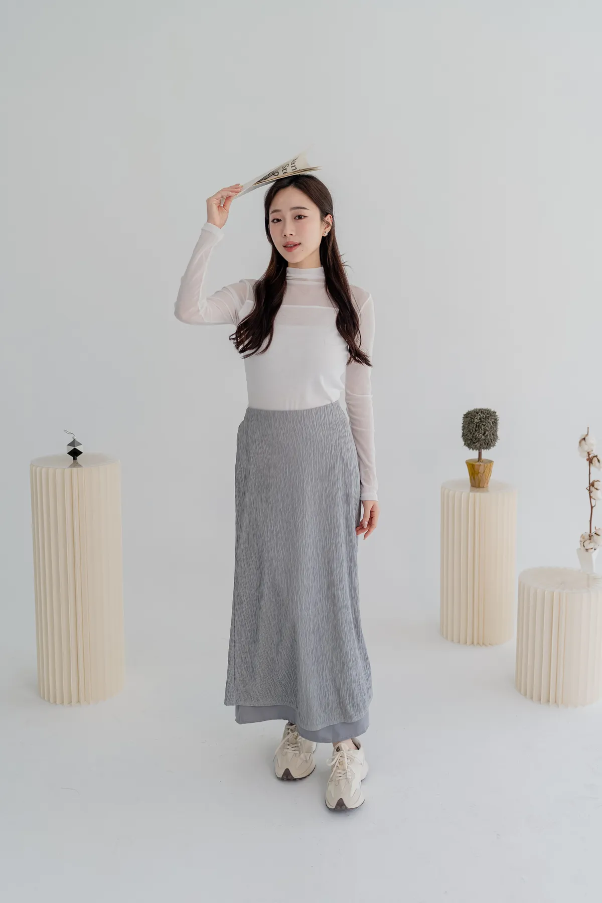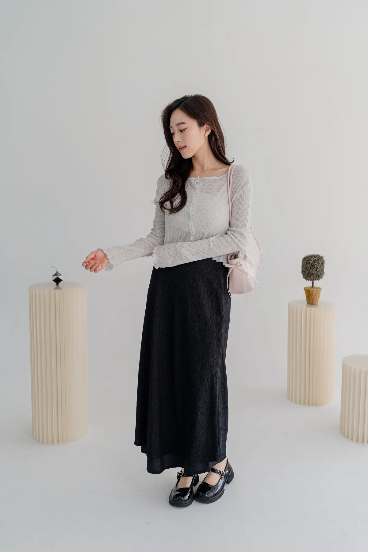 商品資訊:細緻壓摺布料帶出自然垂墜感,修身剪裁拉長比例,展現溫柔流線。
