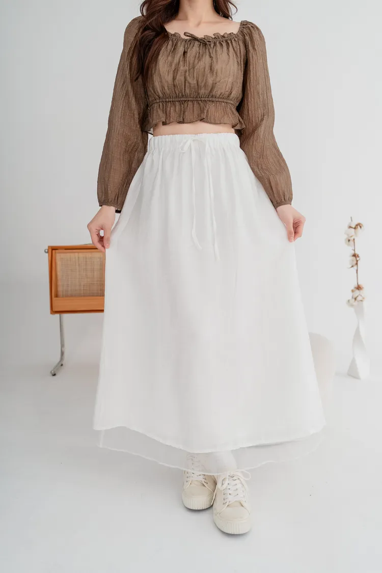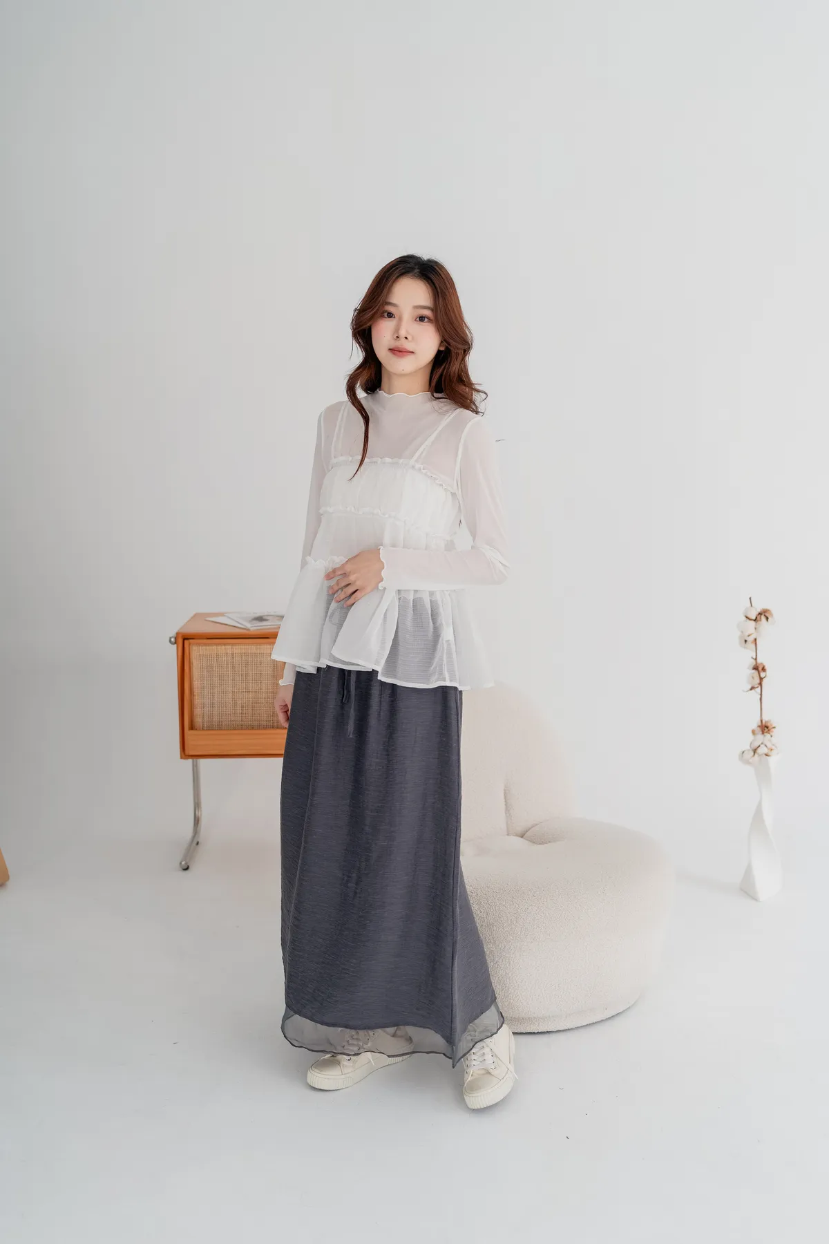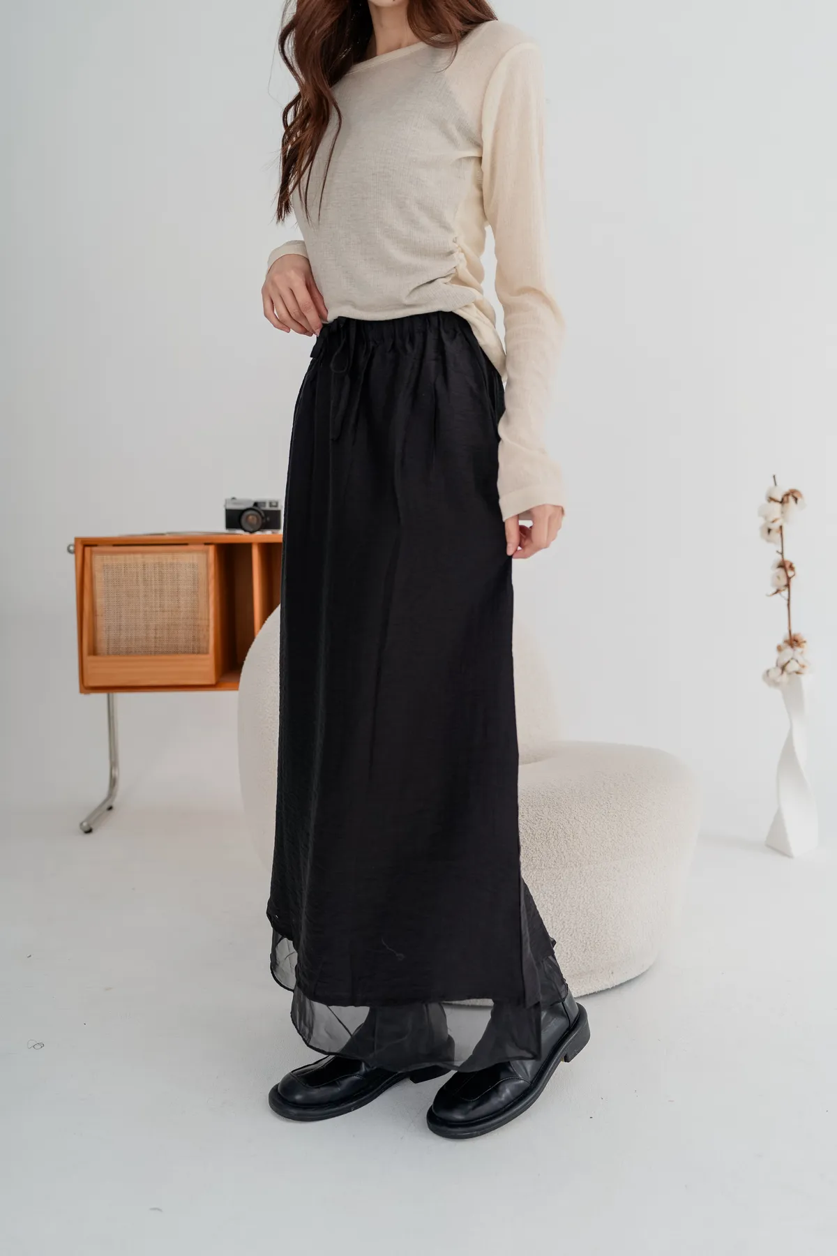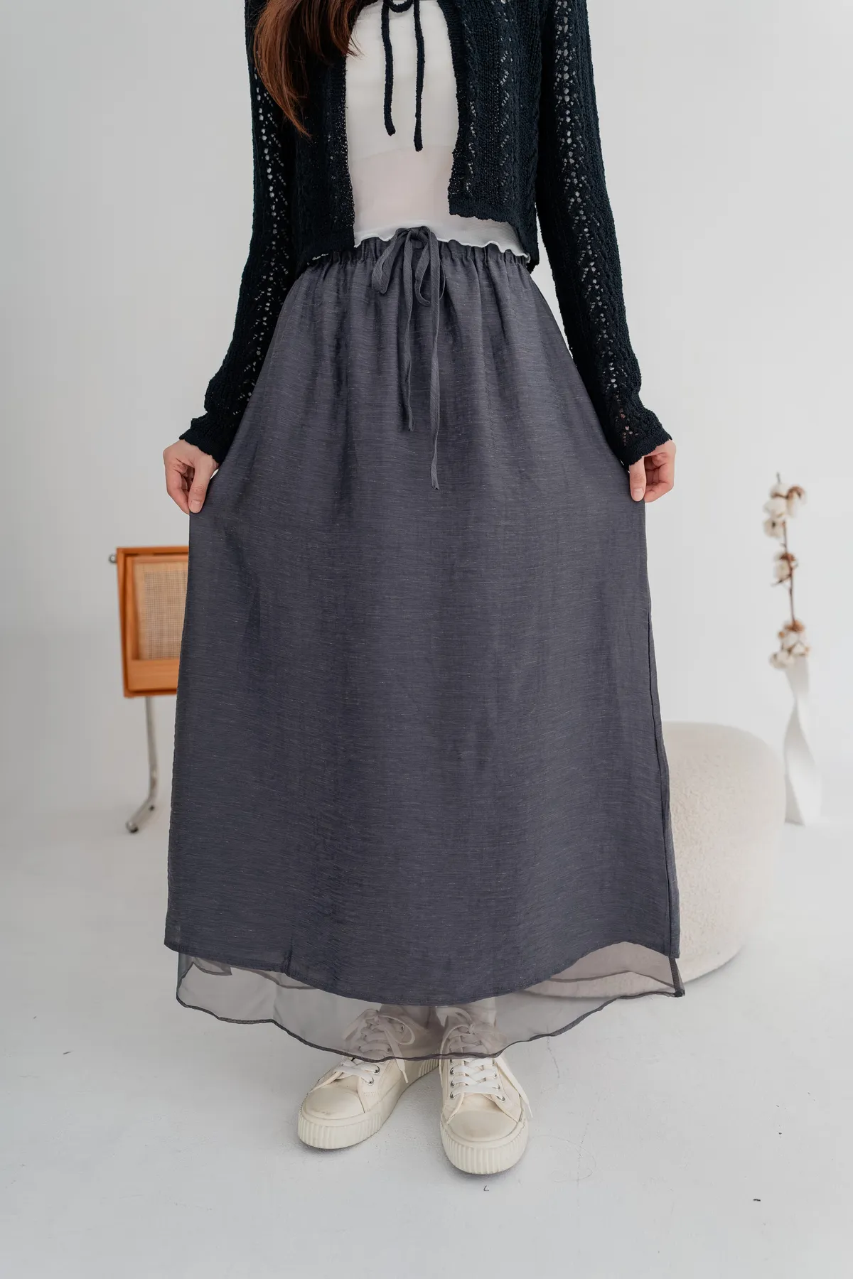 外層霧感布料+內層透紗下擺,營造輕盈微透的靈動感,順修A字裙版型,遮腿型、顯比例,隨性站著也很好看
