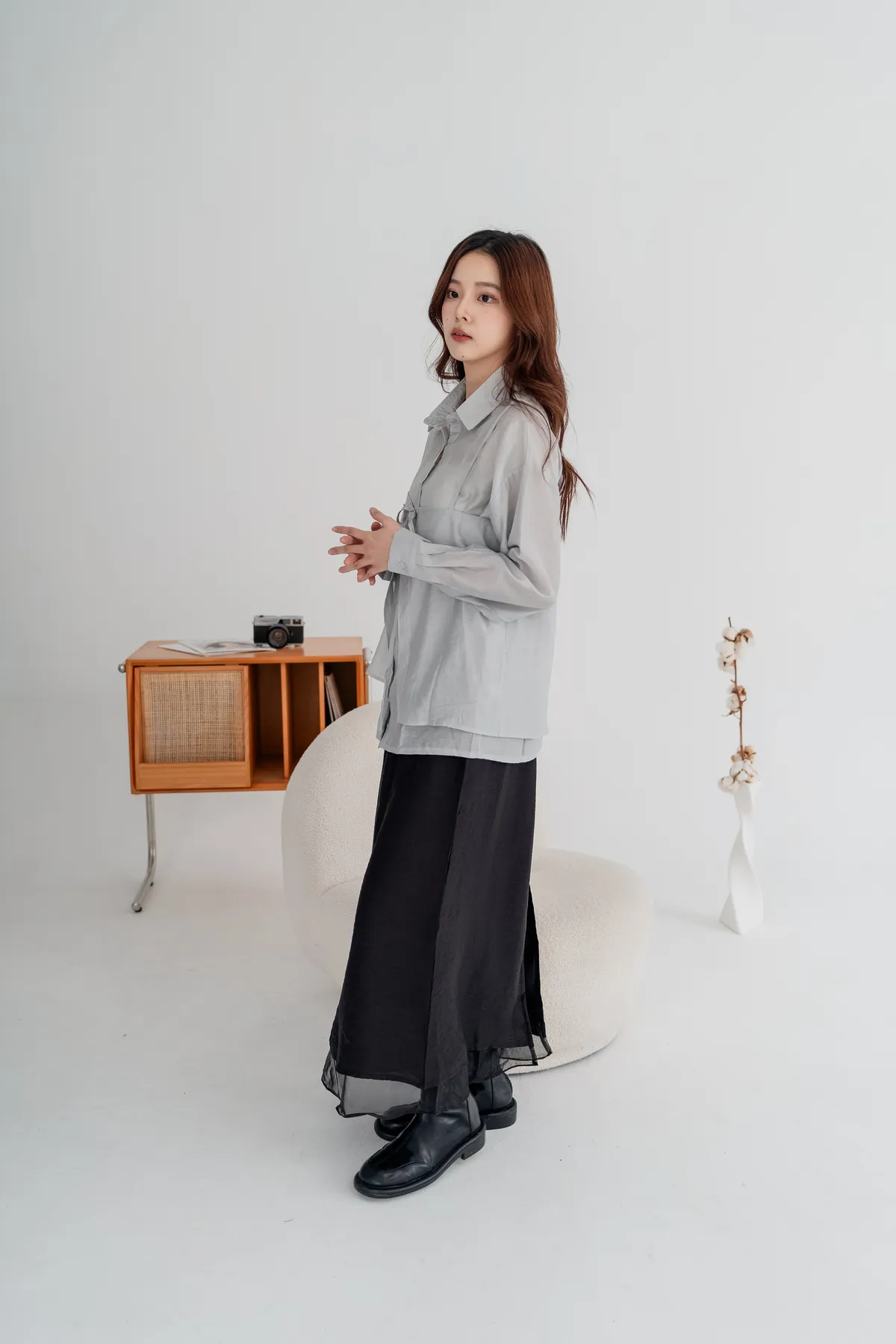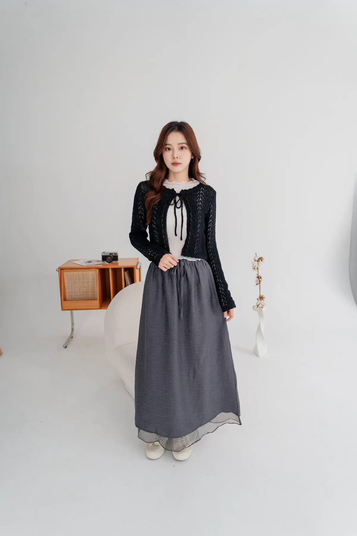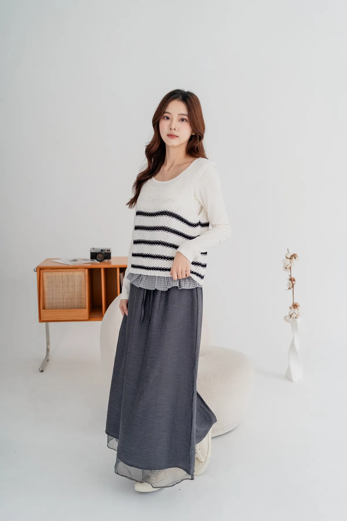 外層霧感布料+內層透紗下擺,營造輕盈微透的靈動感,順修A字裙版型,遮腿型、顯比例,隨性站著也很好看