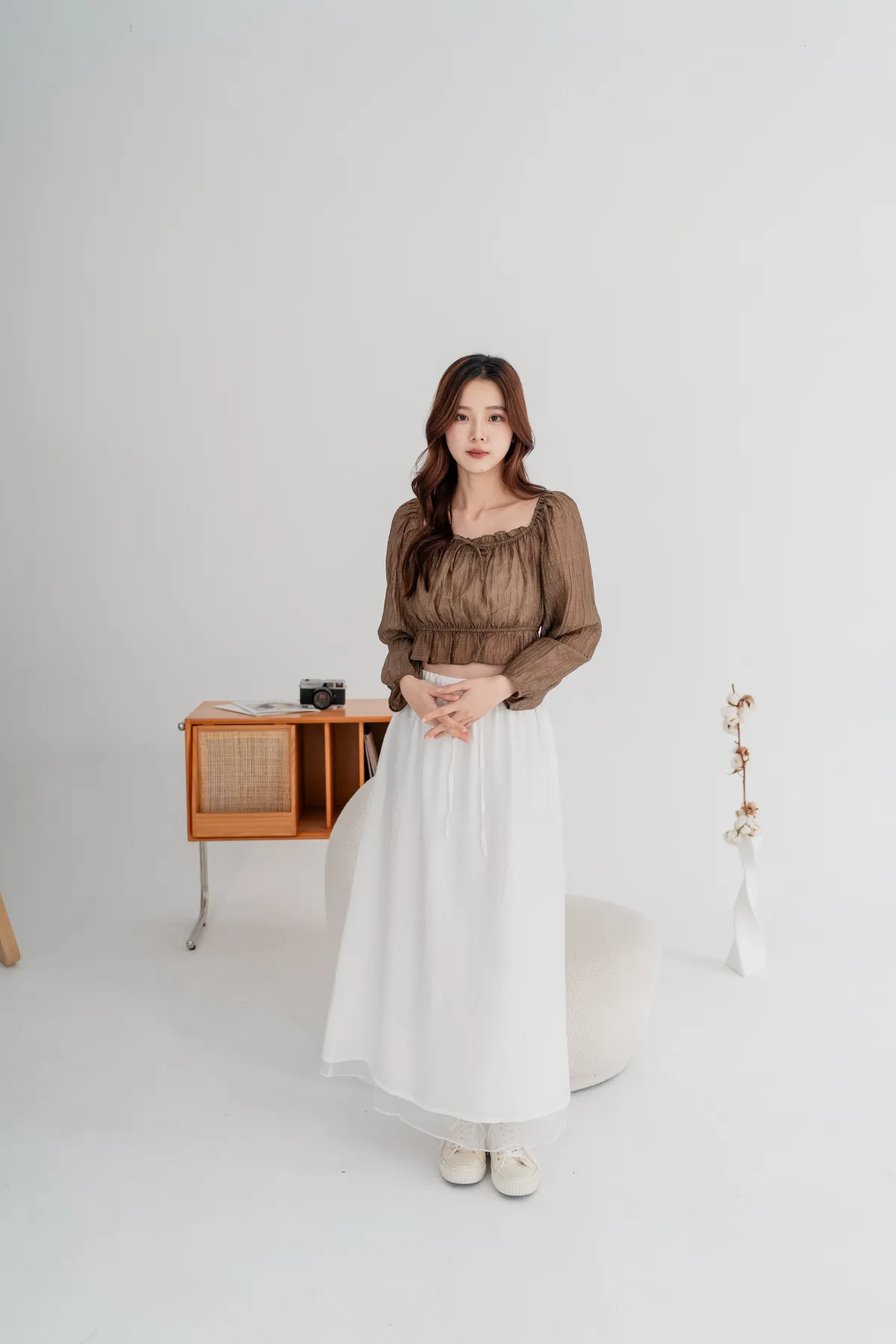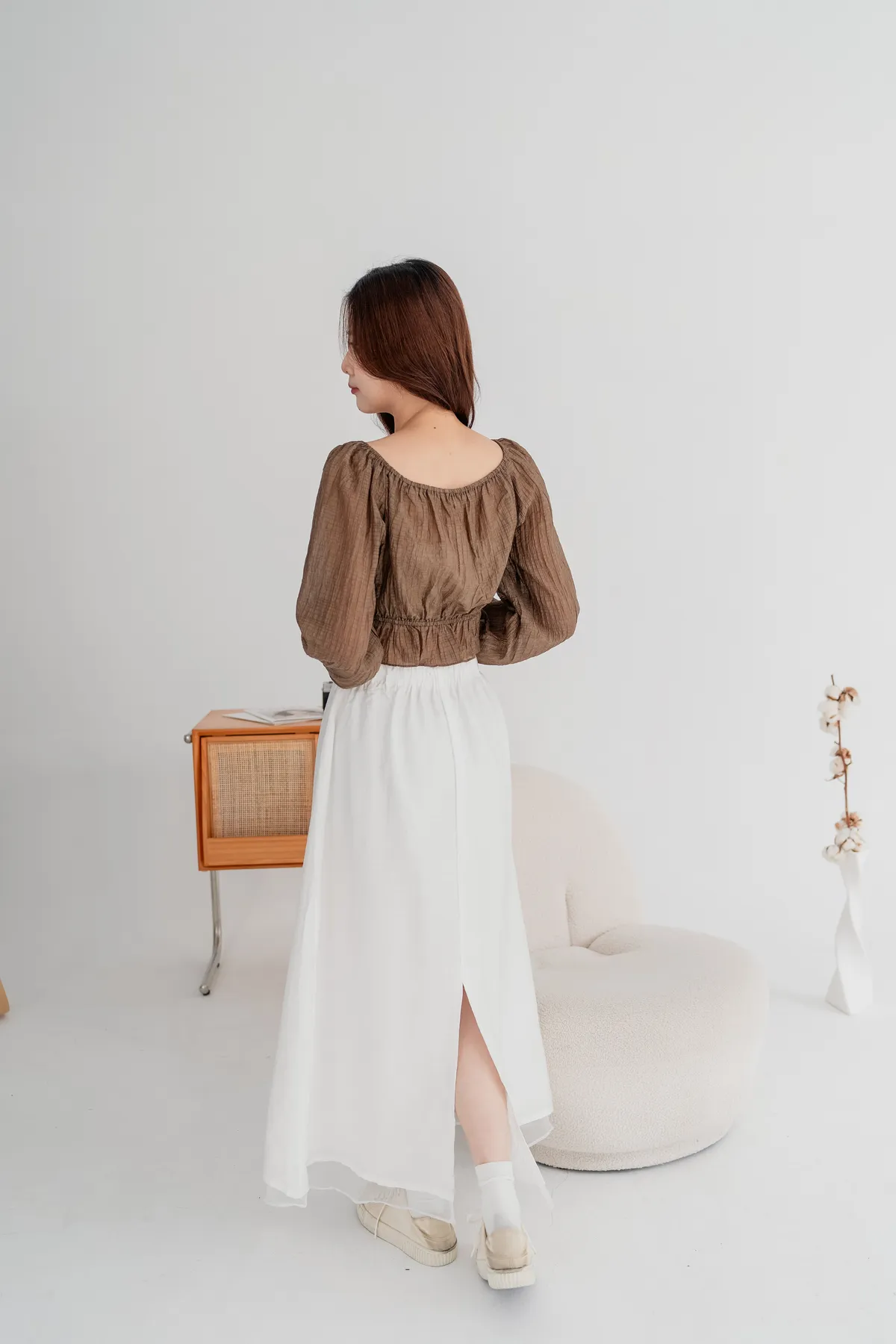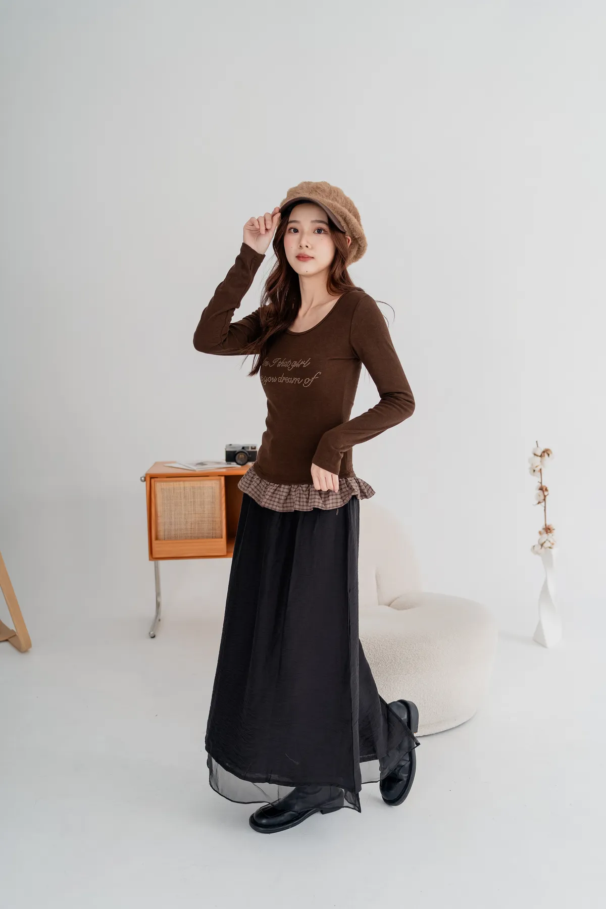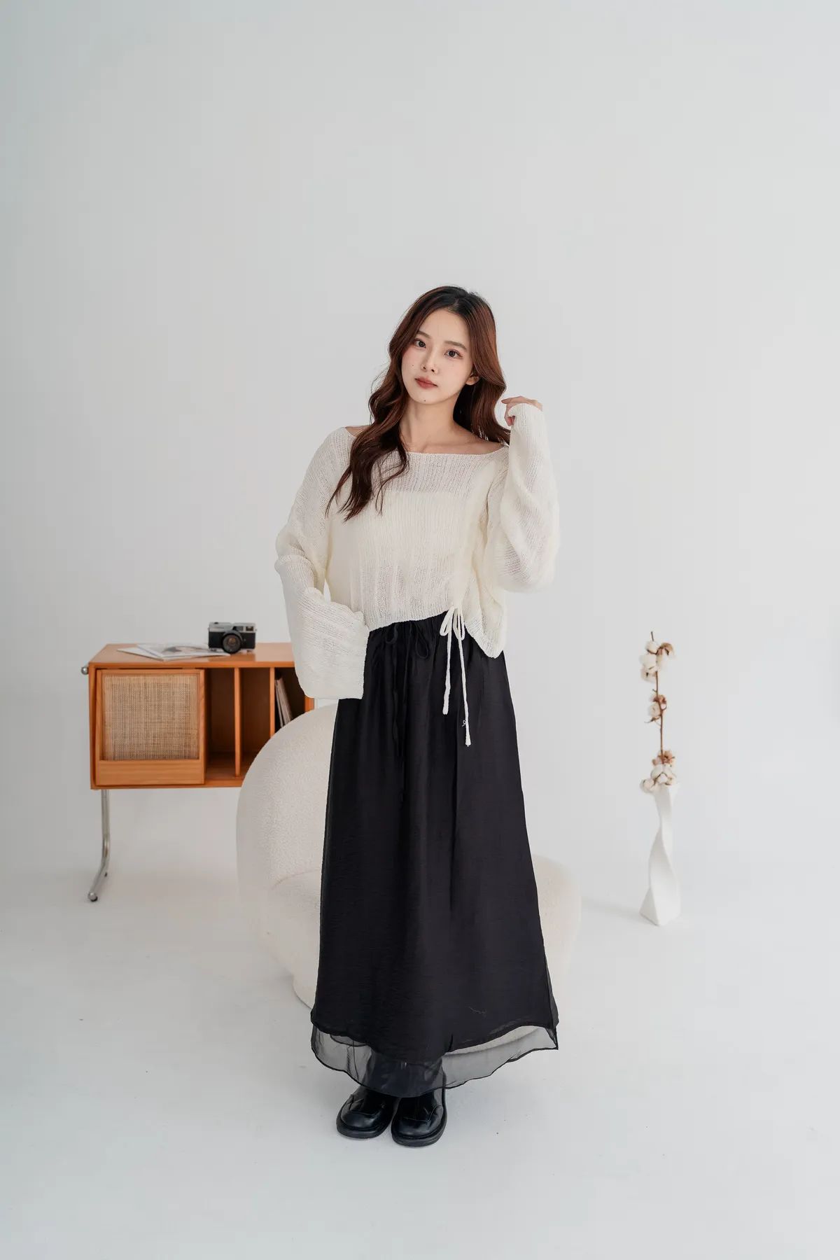 外層霧感布料+內層透紗下擺,營造輕盈微透的靈動感,順修A字裙版型,遮腿型、顯比例,隨性站著也很好看