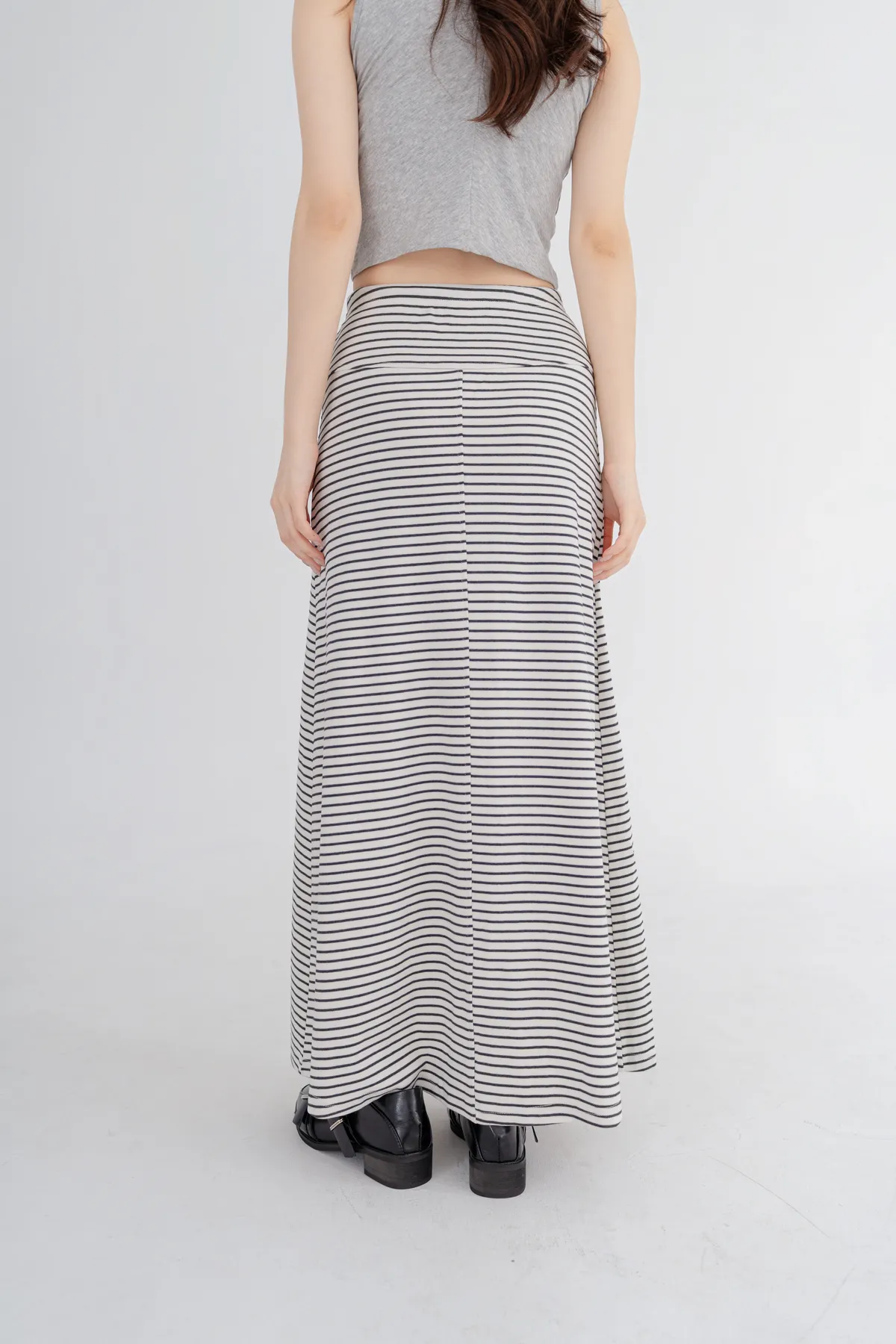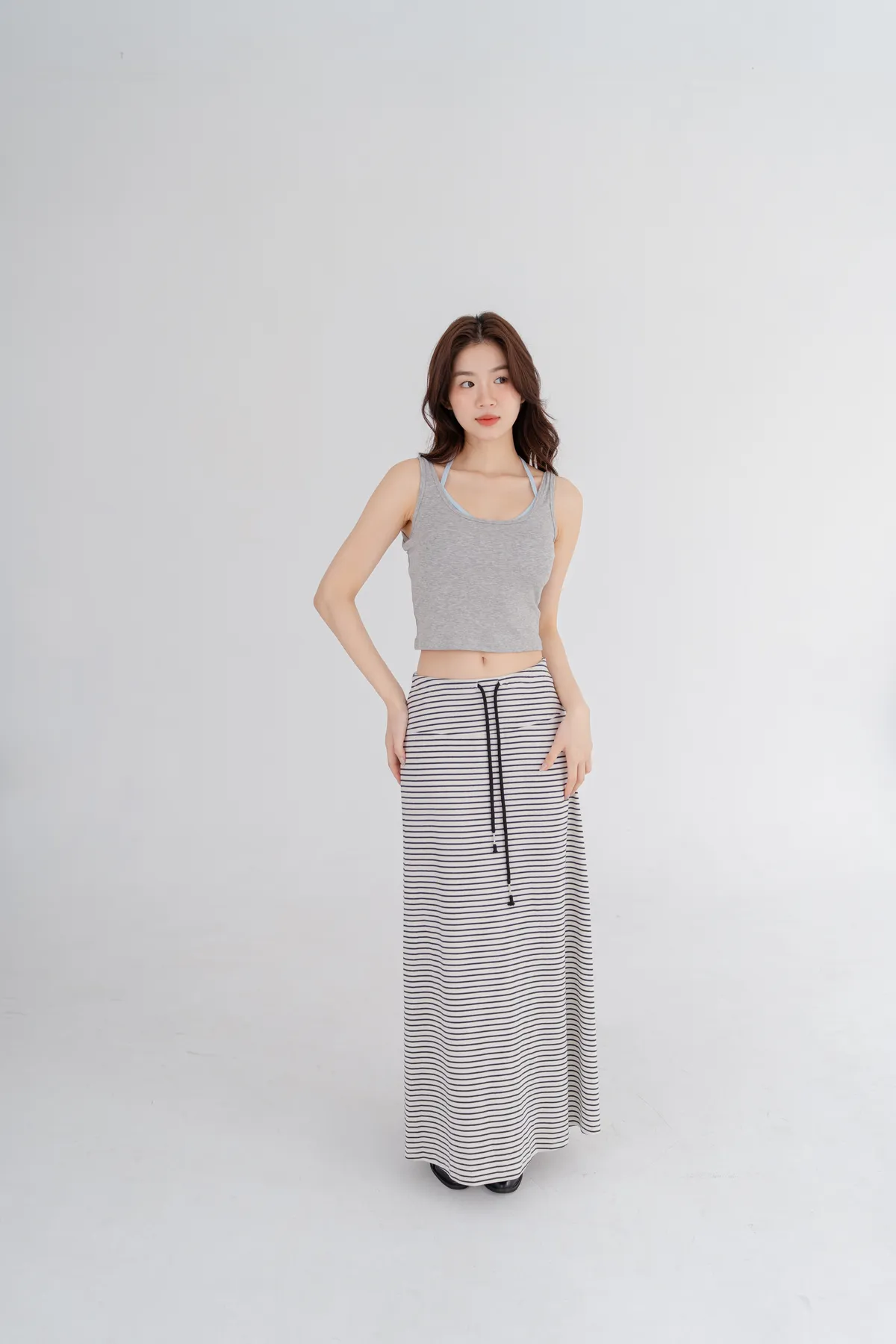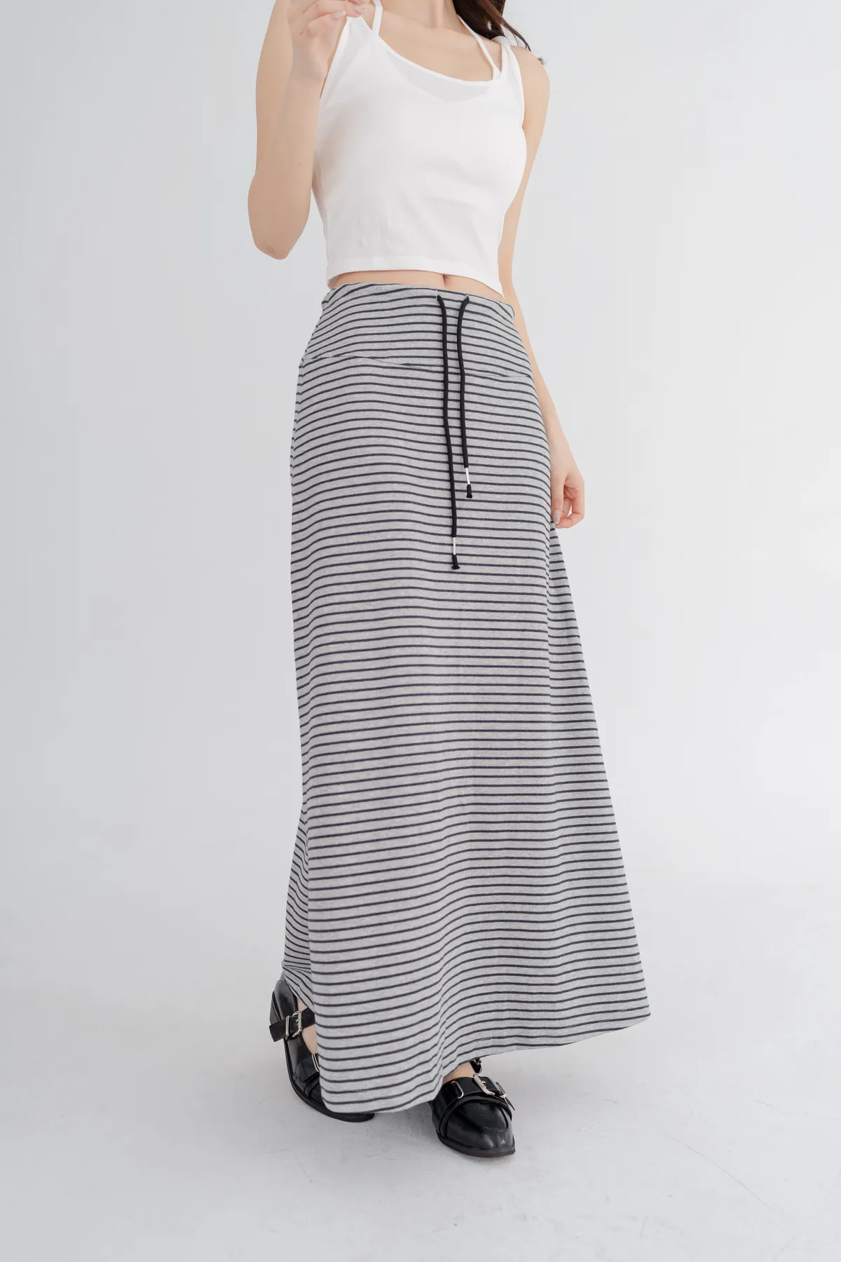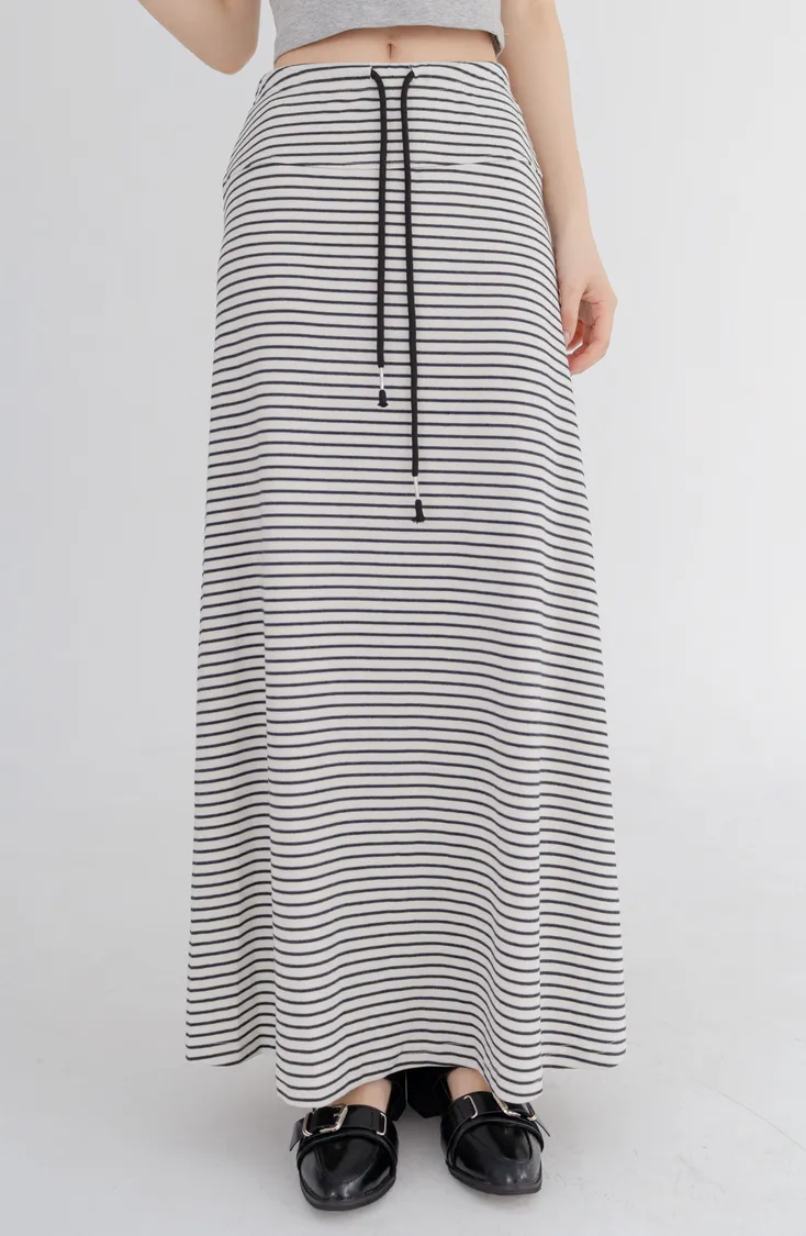 柔棉細條紋抽繩顯瘦長裙