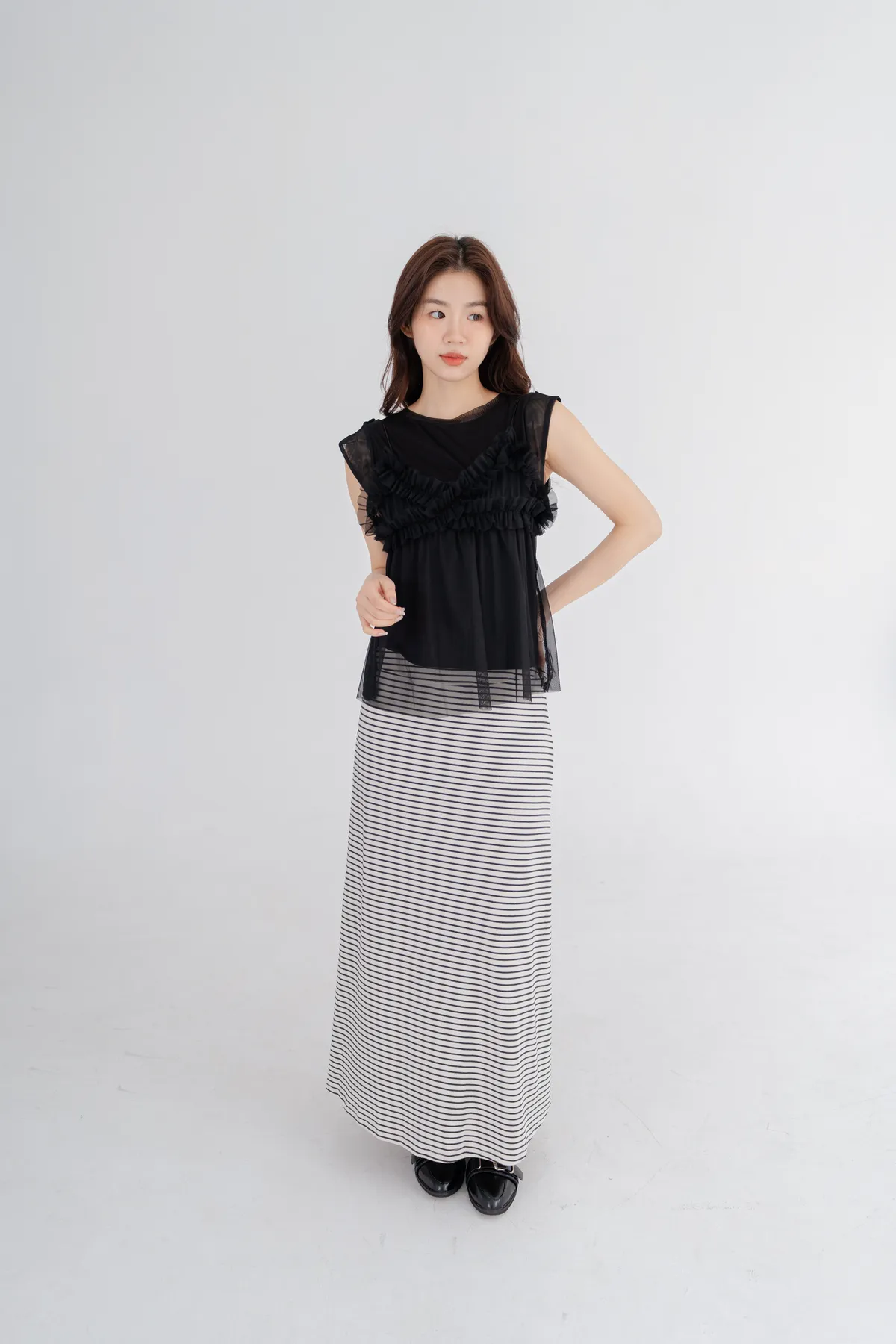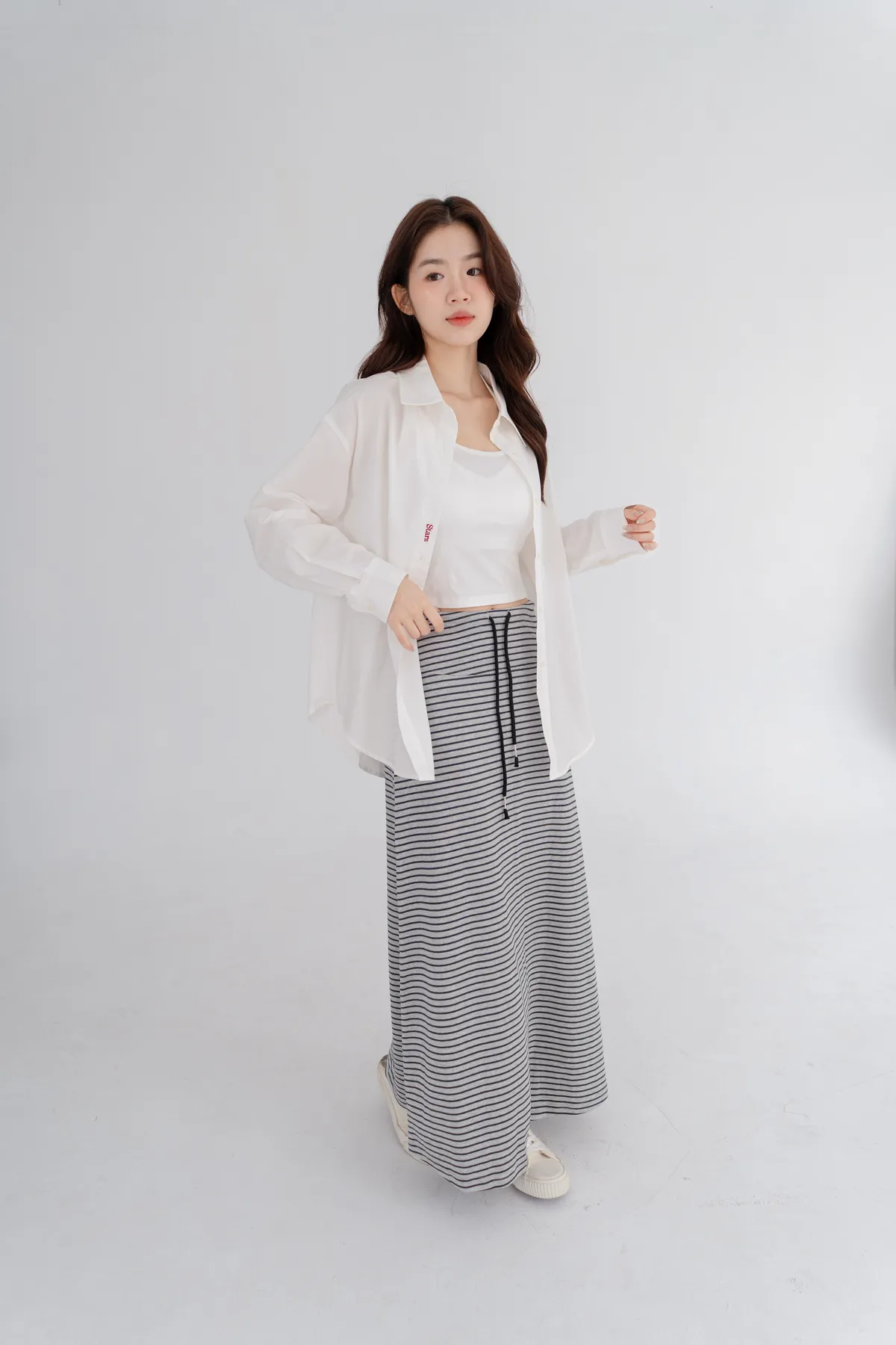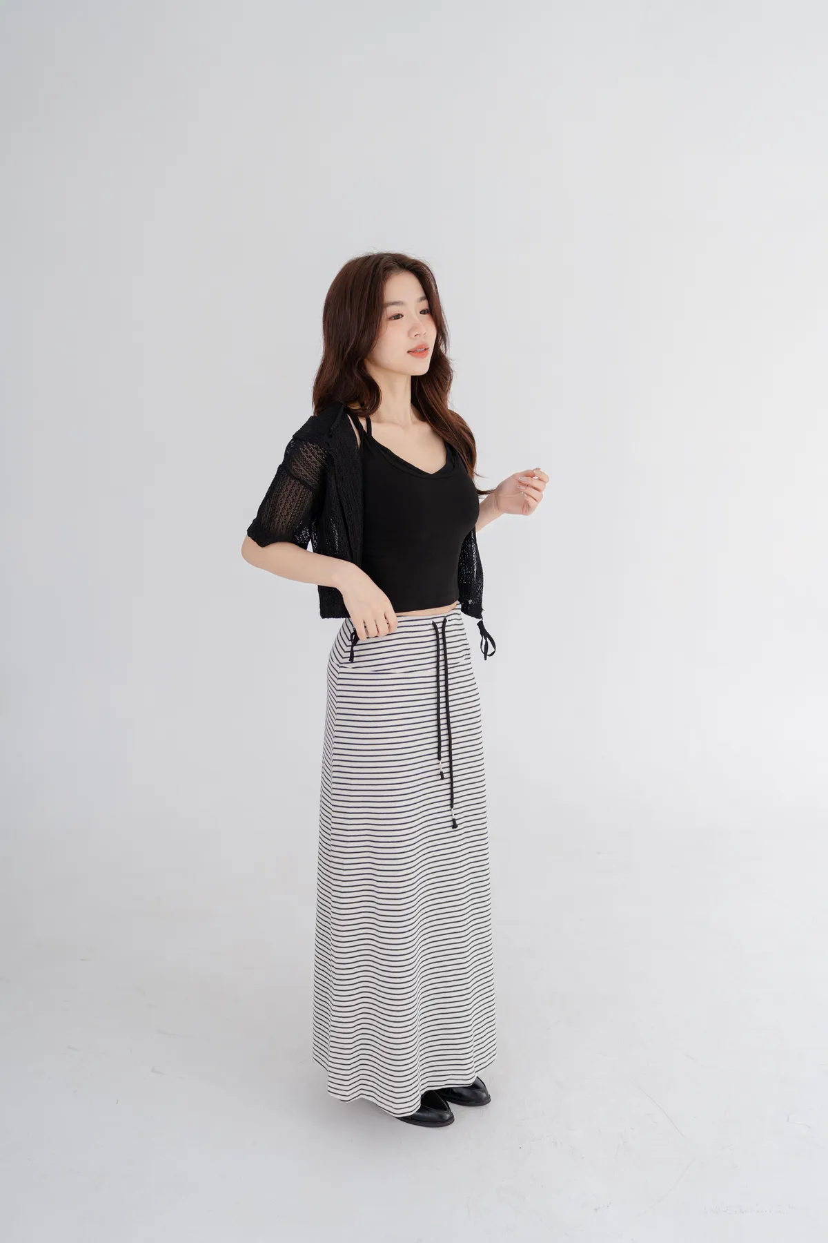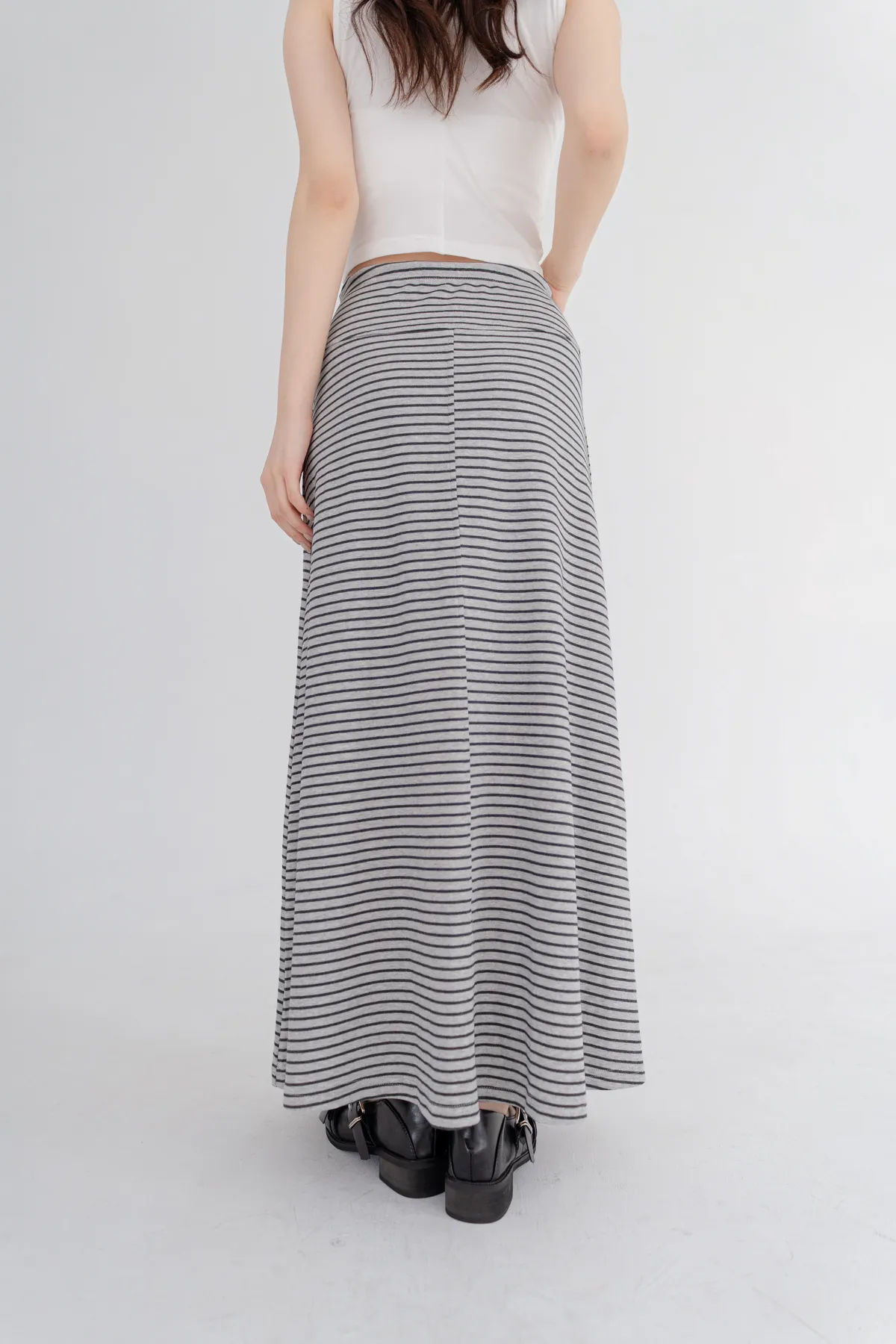 柔棉細條紋抽繩顯瘦長裙