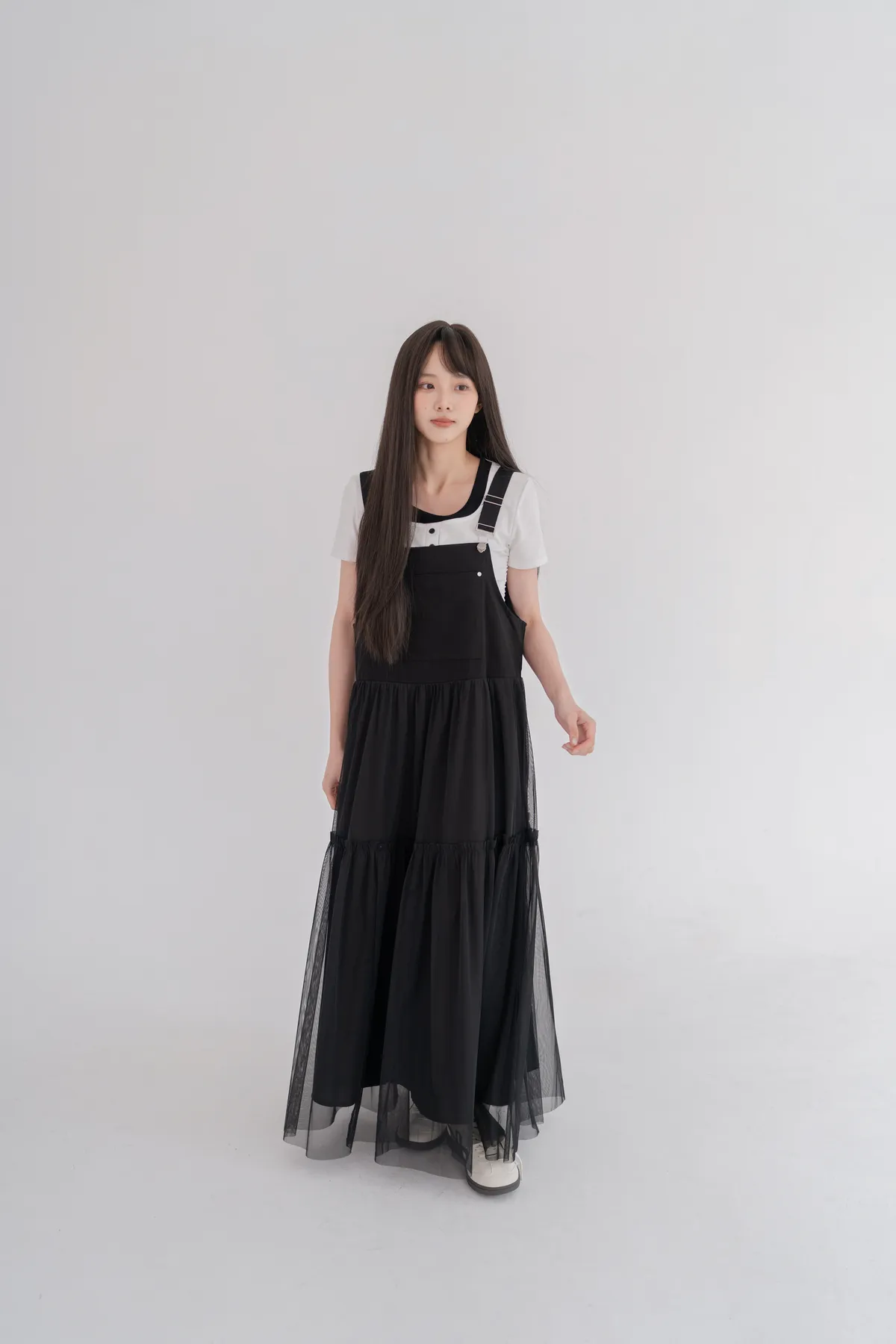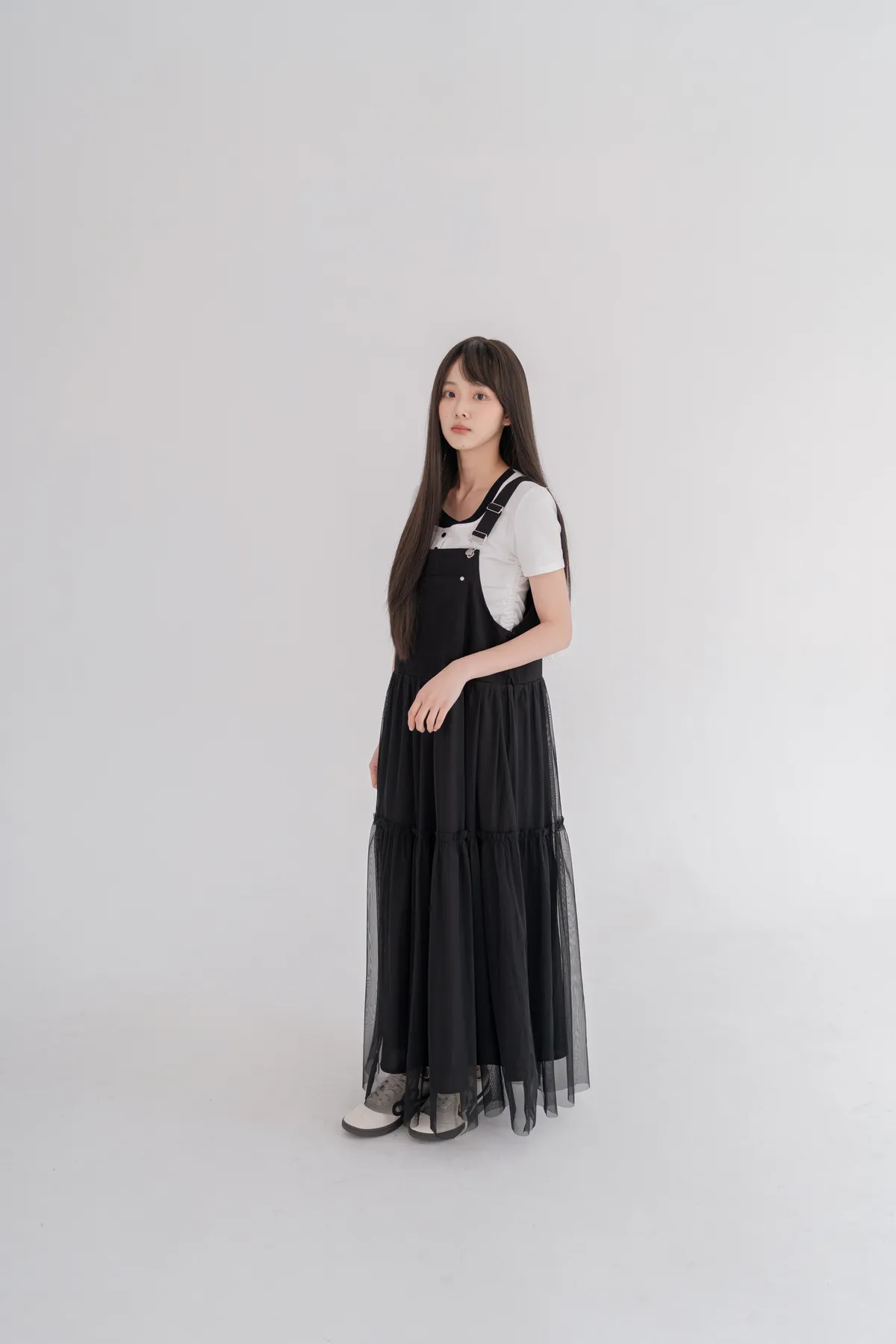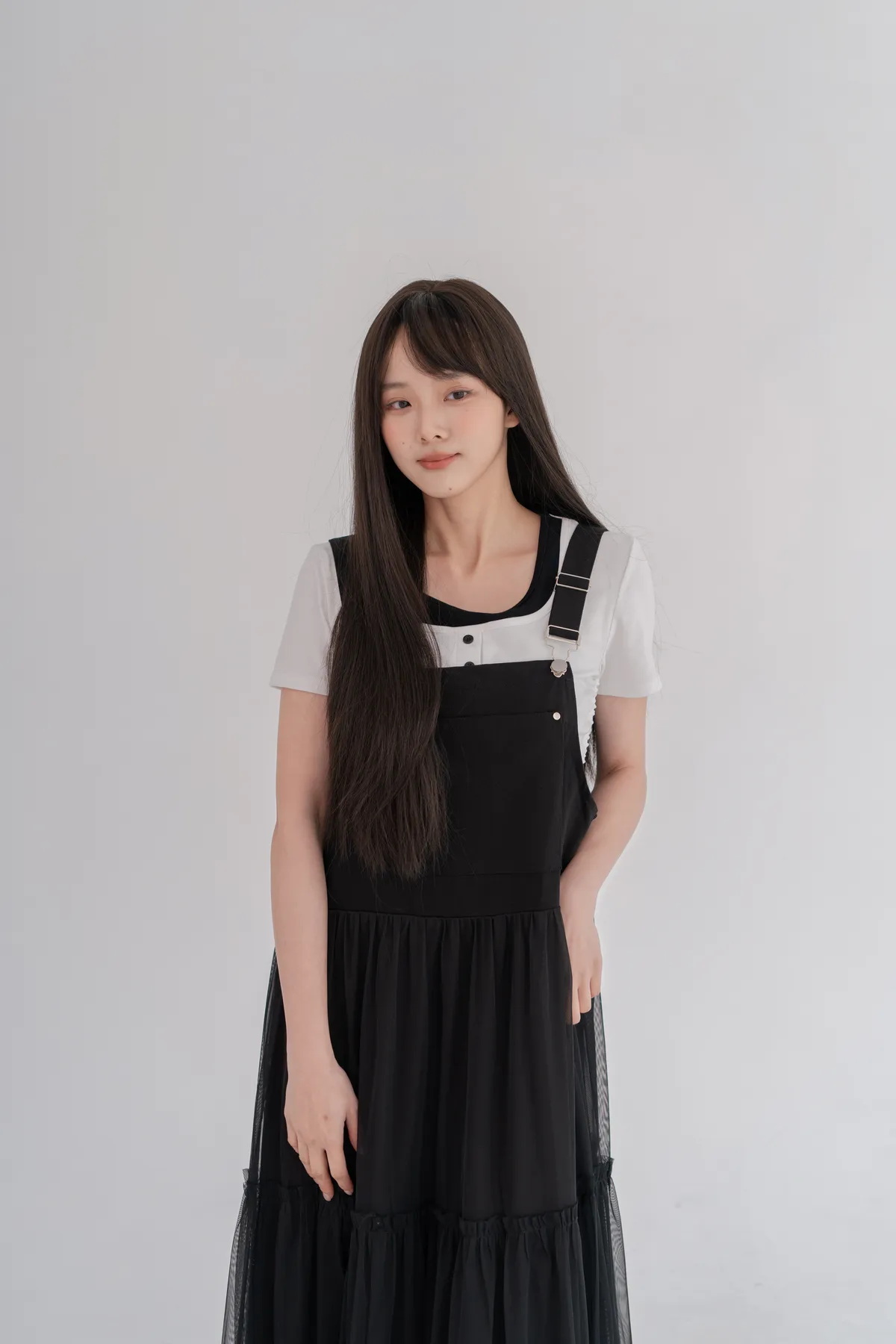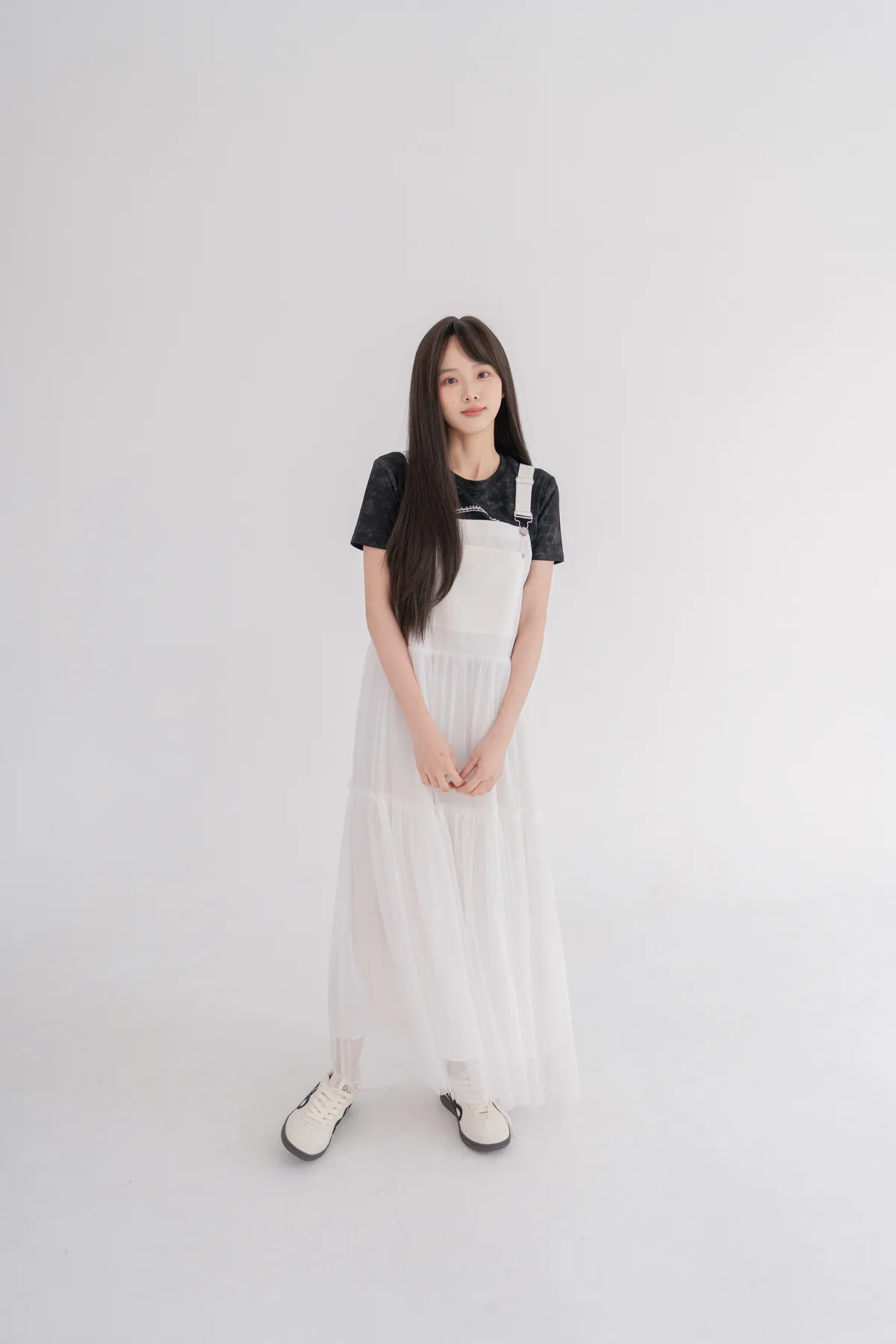 *下擺使用透膚網紗,營造出自然的澎鬆度與飄逸感。雙層拼接設計讓裙擺隨著走動呈現迷人的空氣感,有效修飾下半身線條
