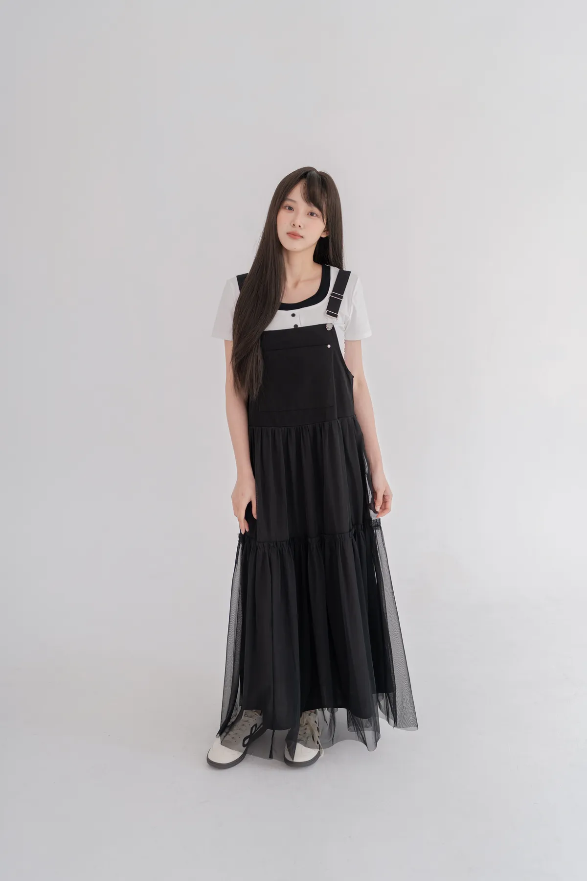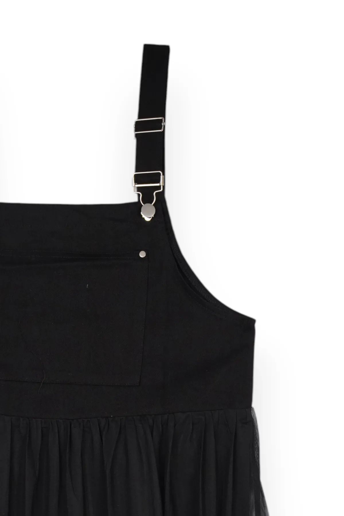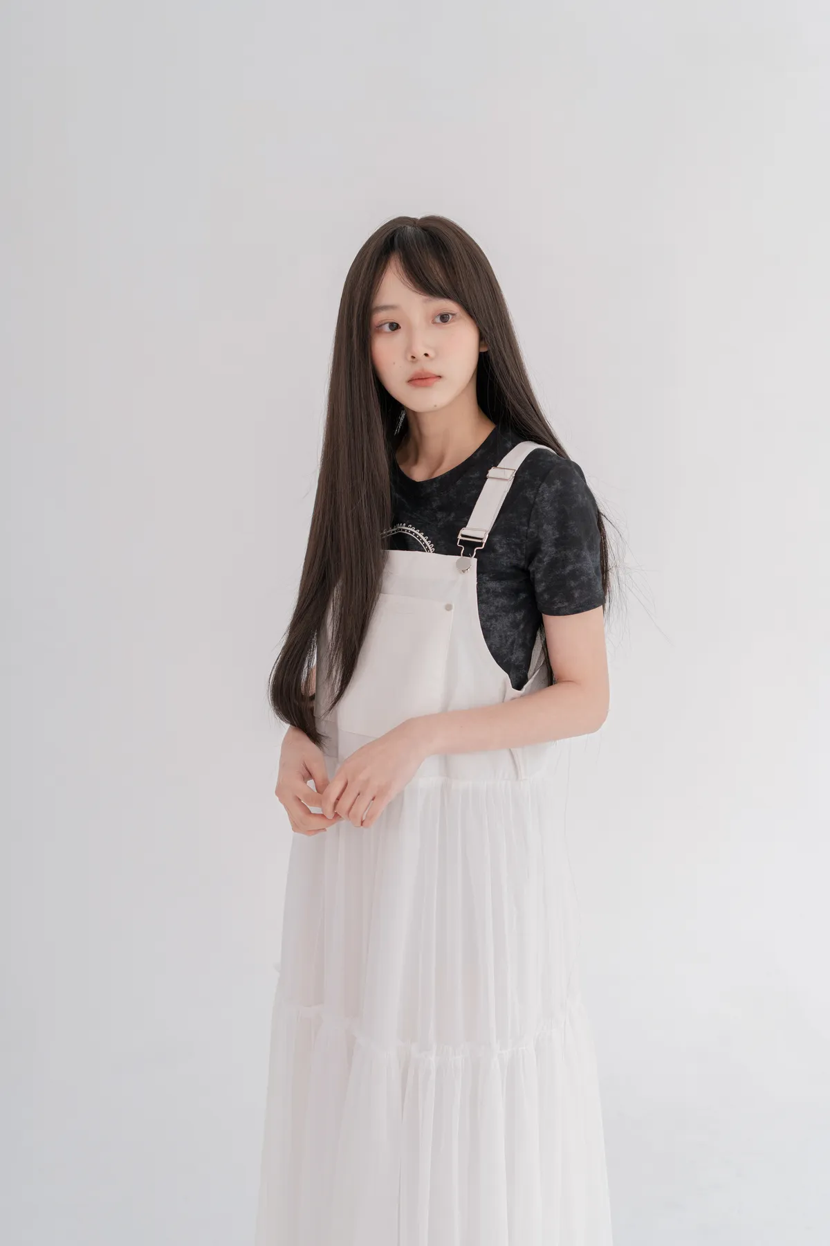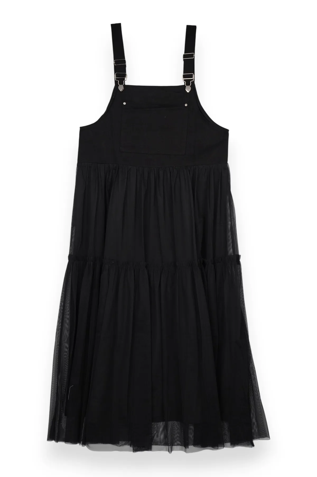 *上半身採用俐落的工裝吊帶設計,搭配金屬調節釦與紮實的面料,為柔美的裙裝注入率性靈魂,視覺上更顯層次不單調