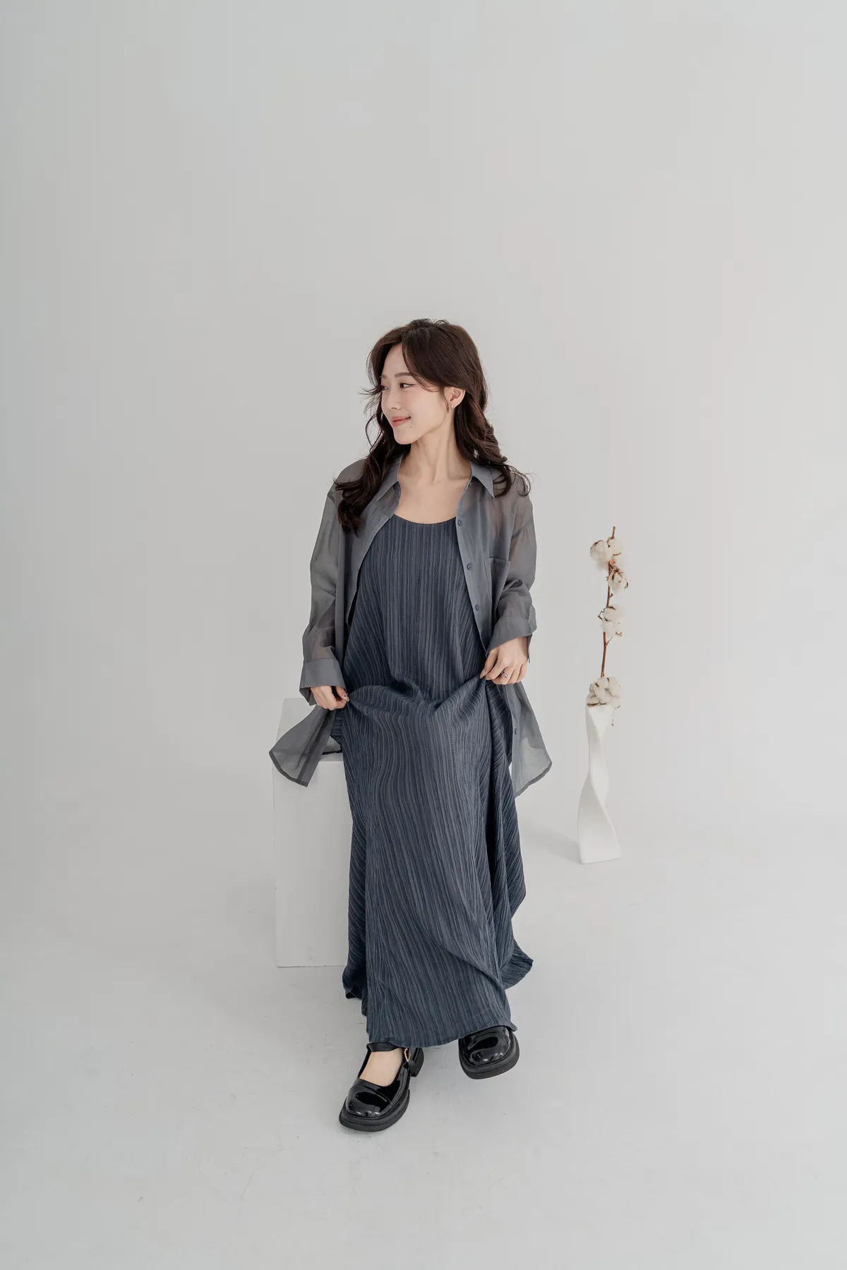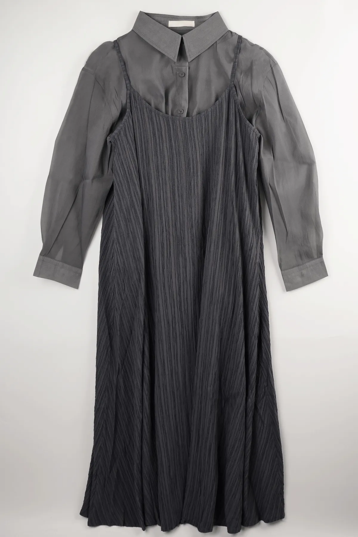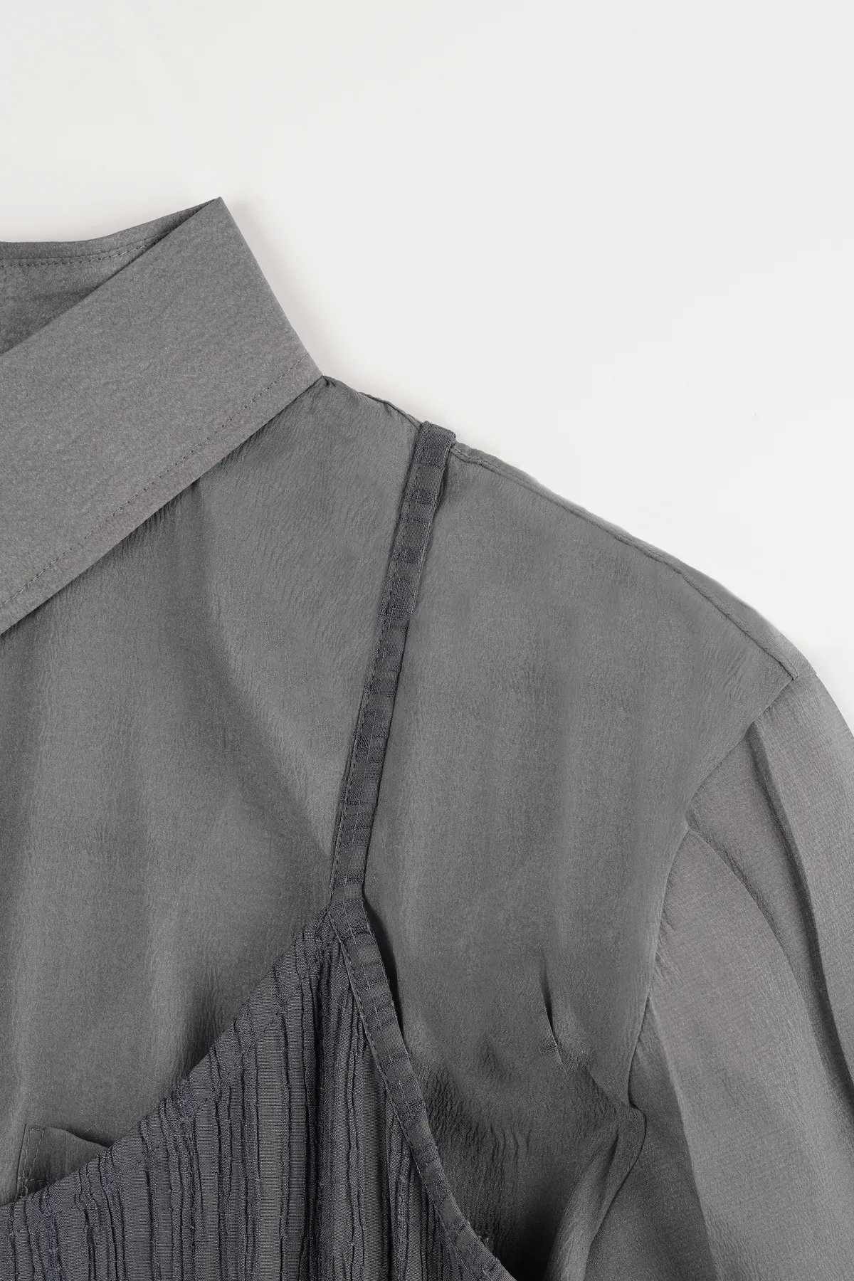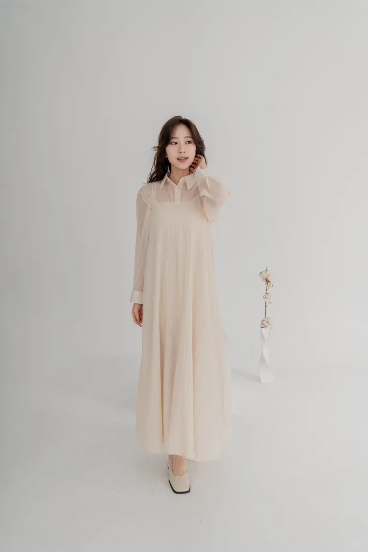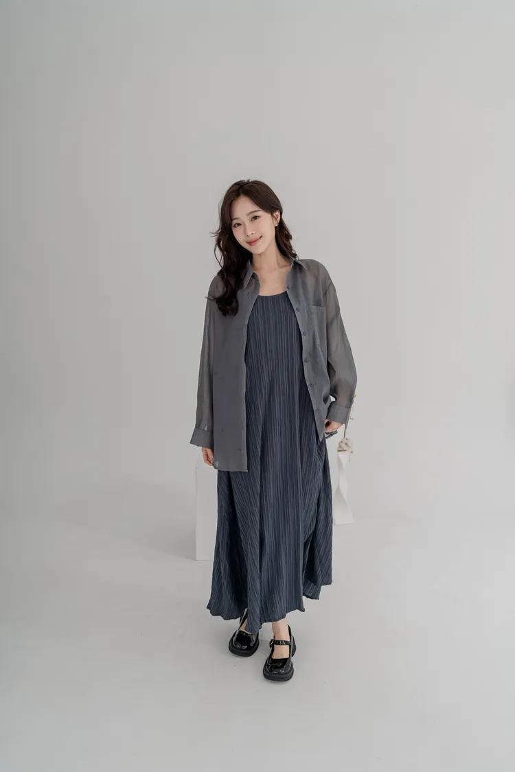 霧感透膚雪紡襯衫,搭配細直紋皺褶背心洋裝,自然打造出不刻意的層次穿搭感。皺褶設計修飾腹部與臀部線條,走路時帶有優雅垂墜感,比例顯高又顯瘦。真兩件式設計,肩帶可自由調整