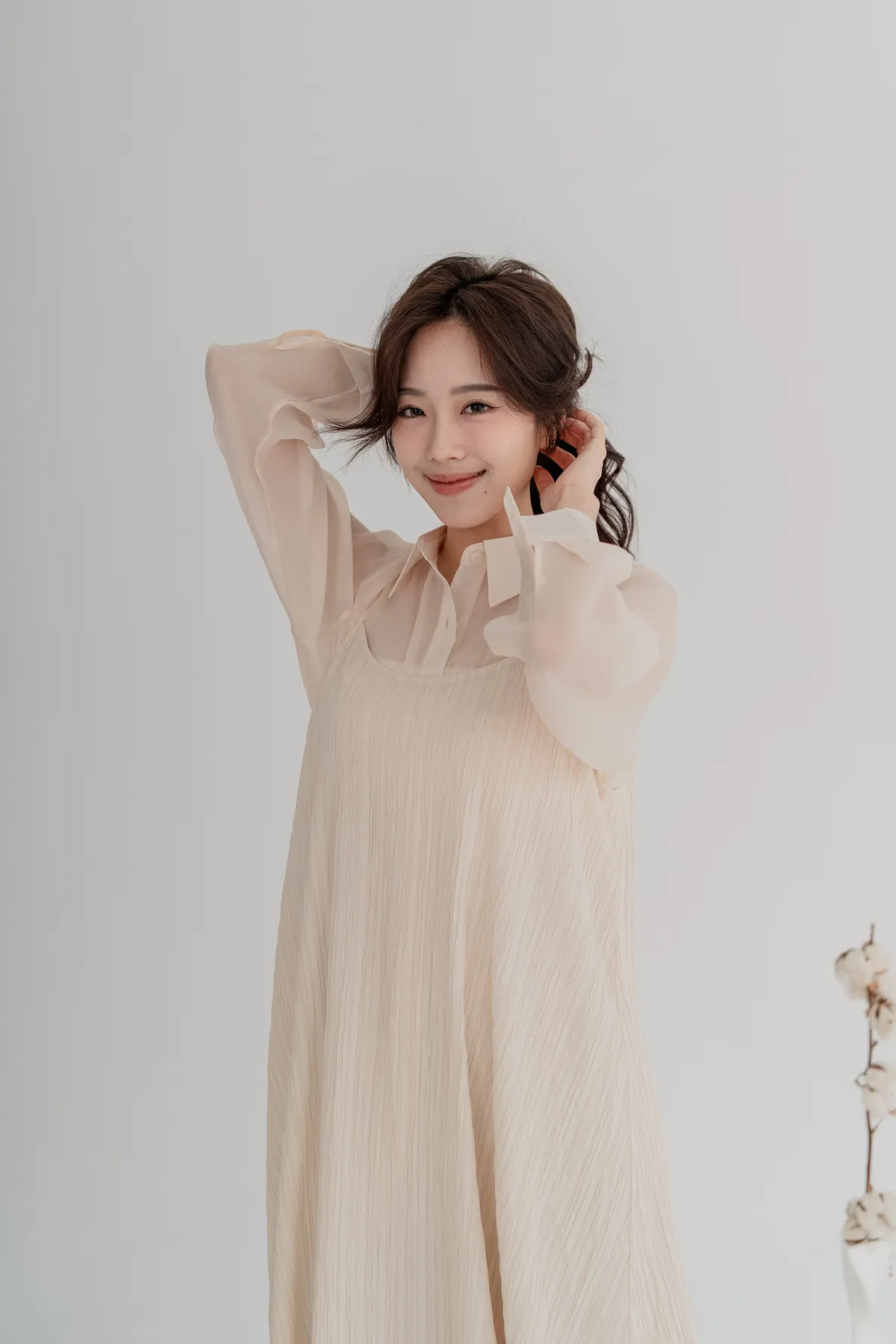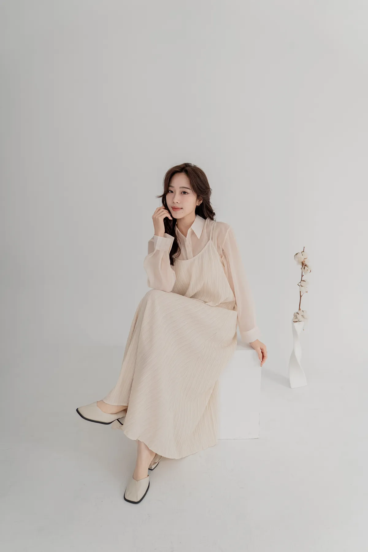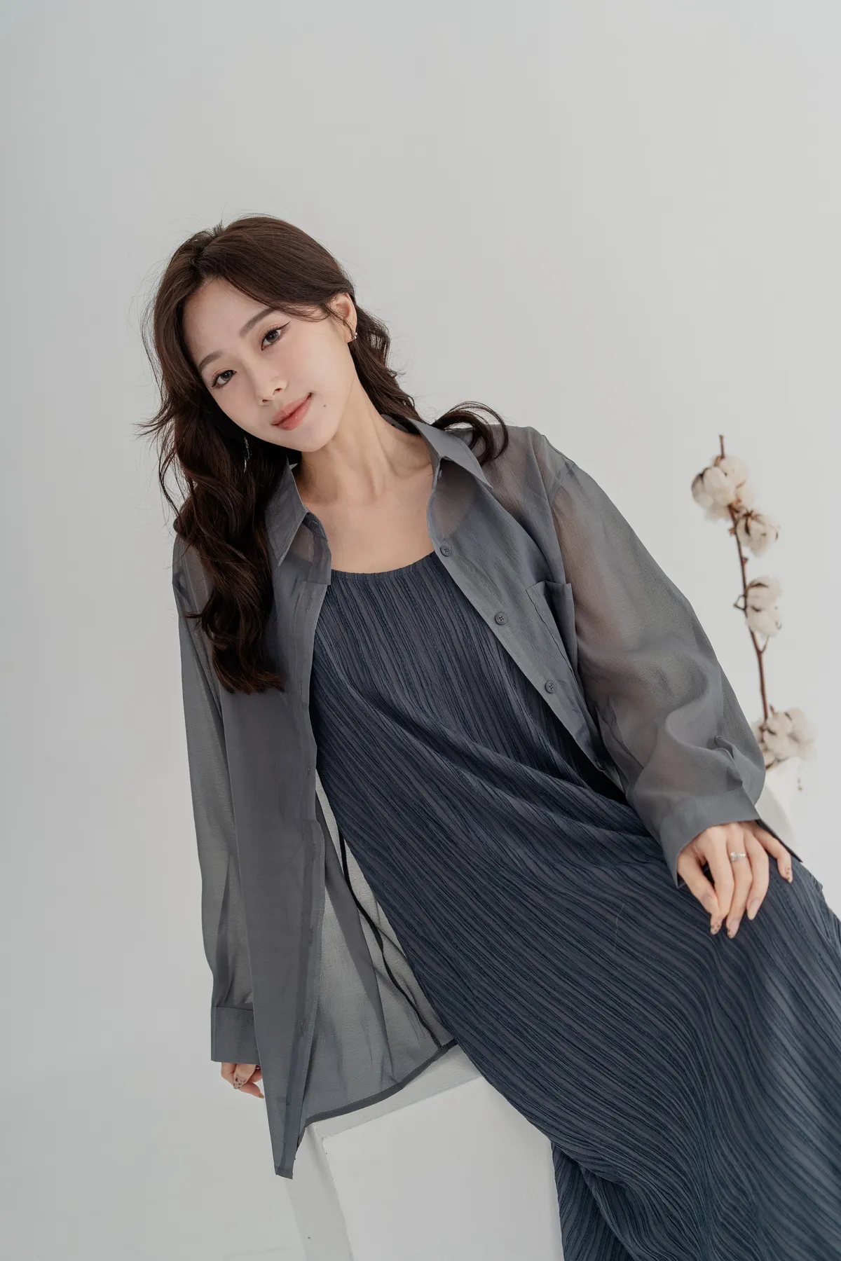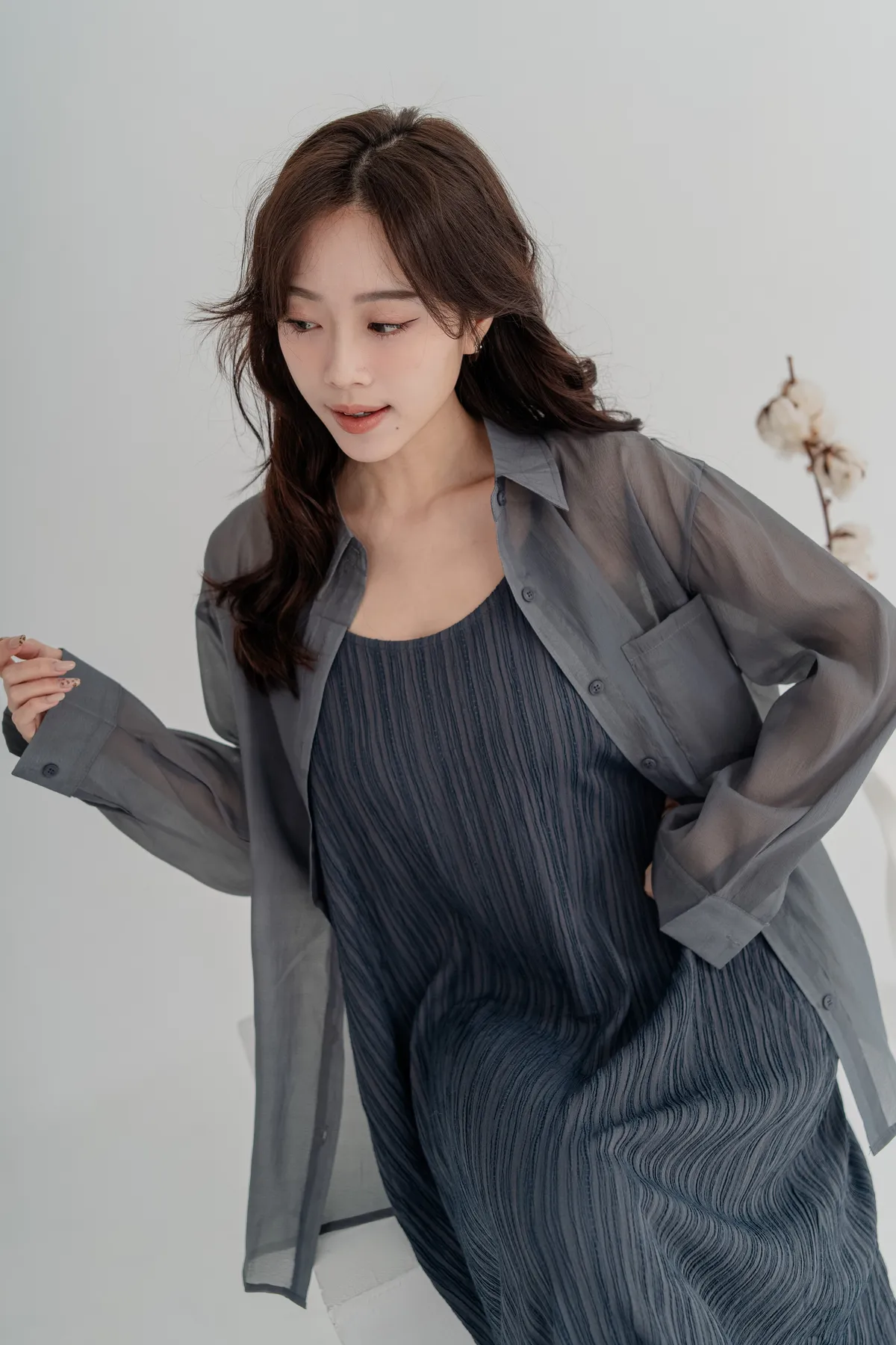 霧感透膚雪紡襯衫,搭配細直紋皺褶背心洋裝,自然打造出不刻意的層次穿搭感。皺褶設計修飾腹部與臀部線條,走路時帶有優雅垂墜感,比例顯高又顯瘦。真兩件式設計,肩帶可自由調整