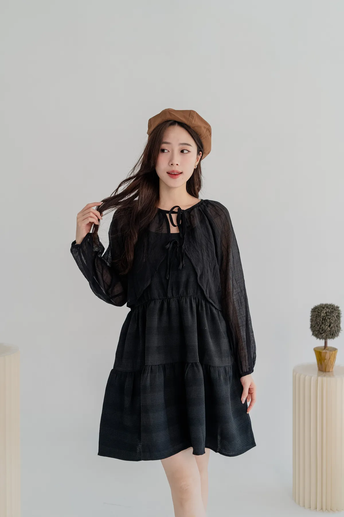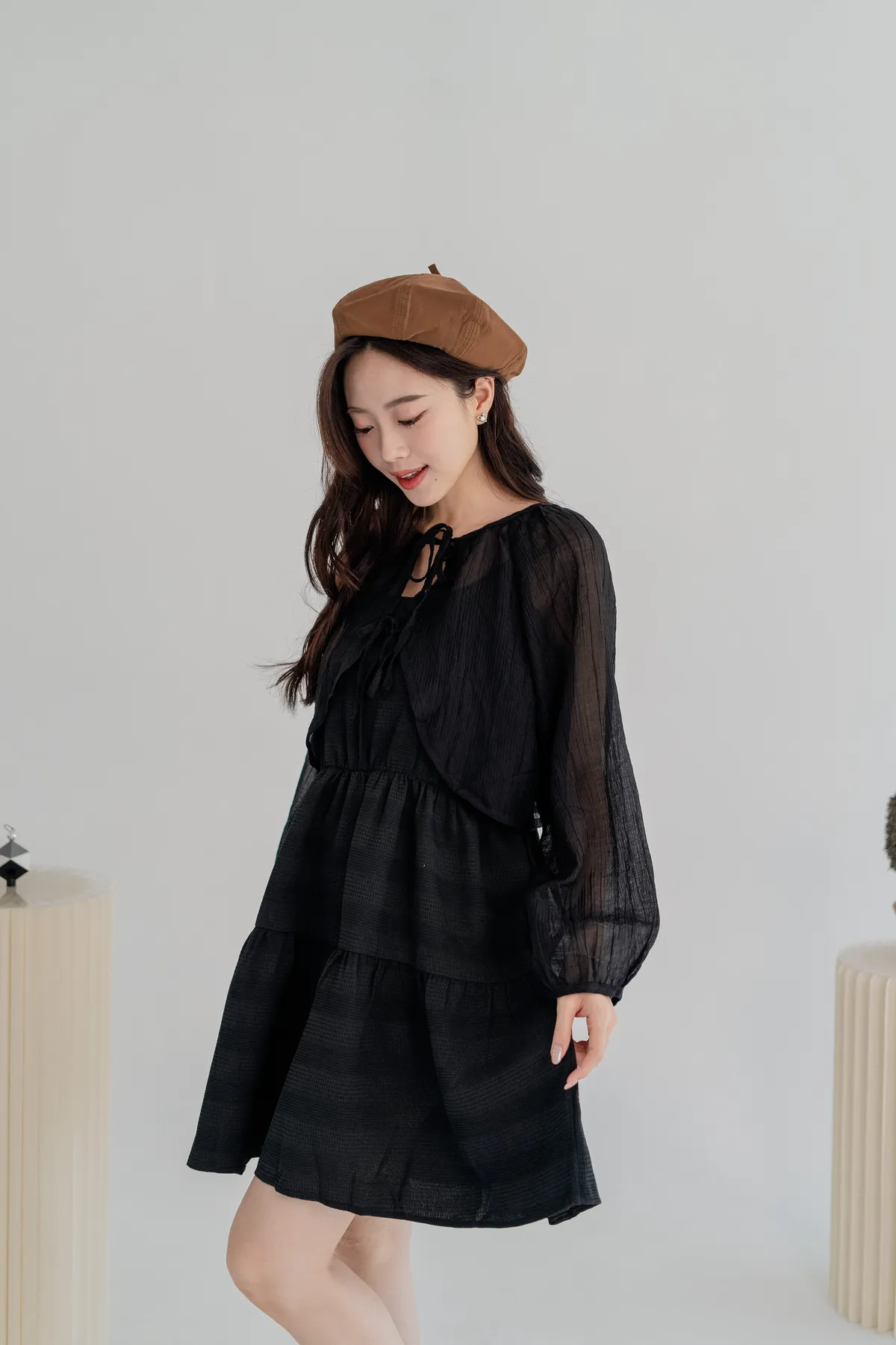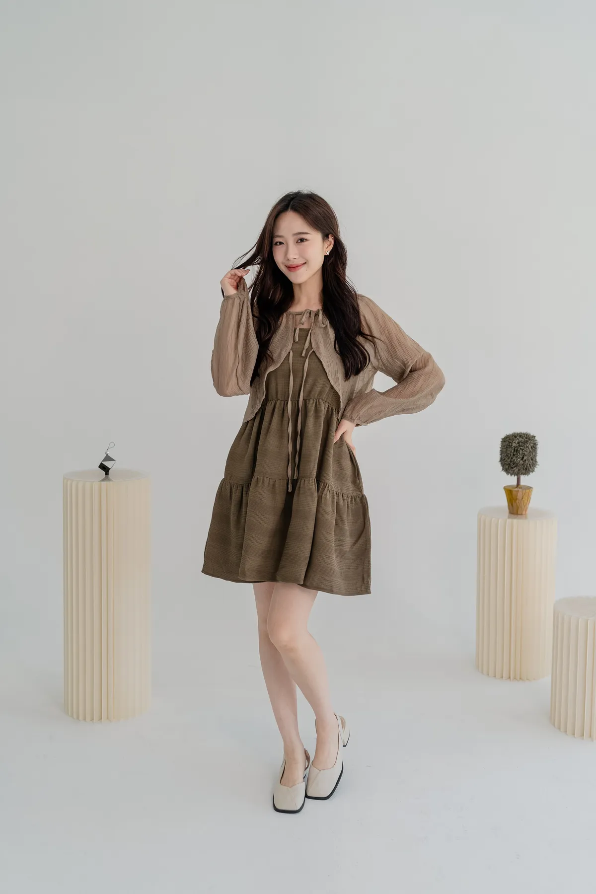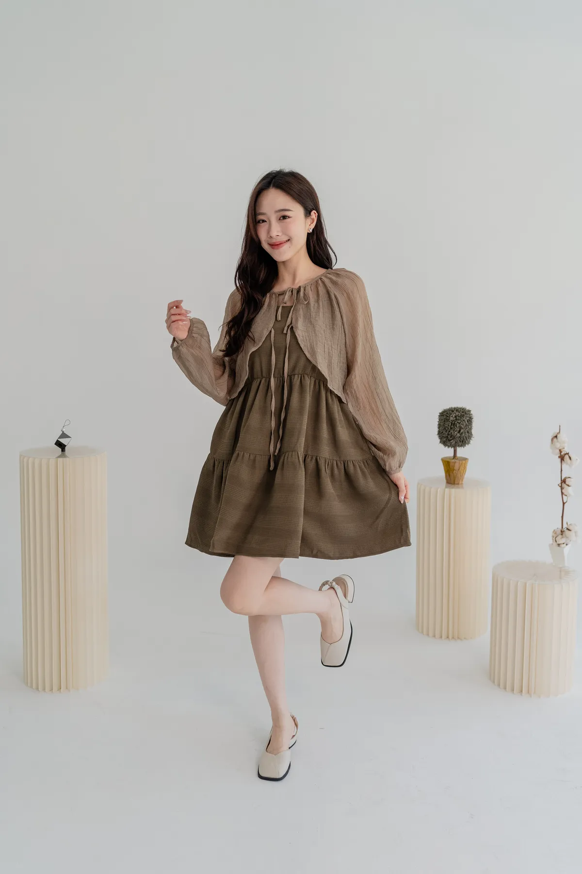 商品資訊:外套採用輕薄透膚的紗質拼接,隨著光線流轉散發柔美光澤。洋裝層次感裙擺帶出自然蓬度,修飾比例又增添俏皮靈動。