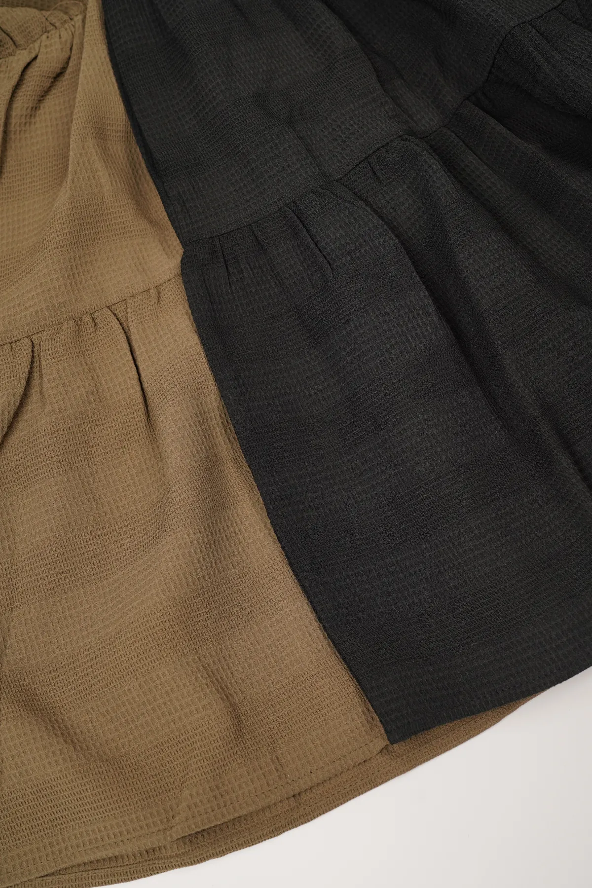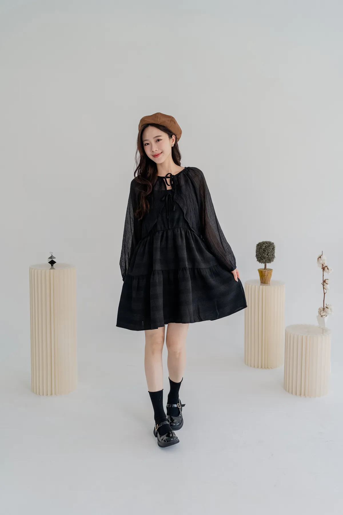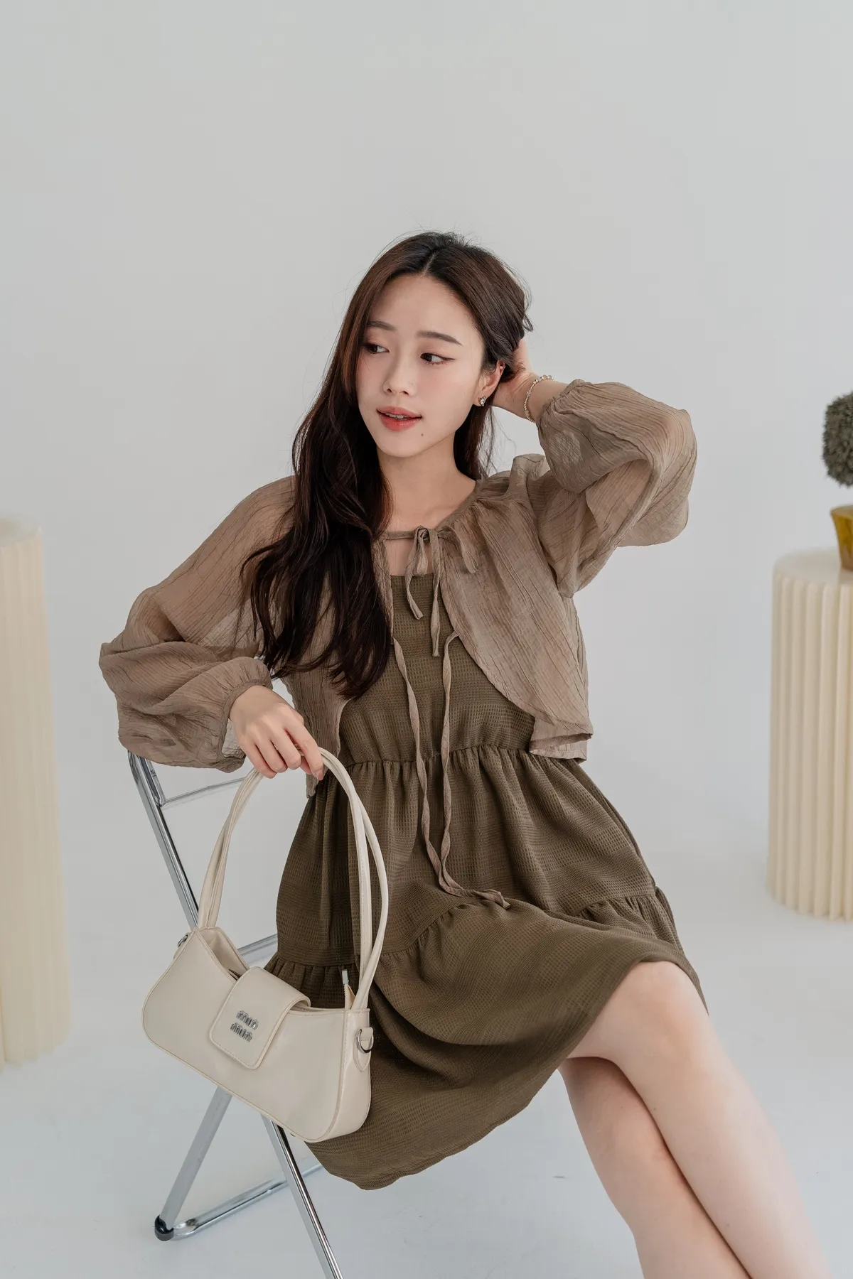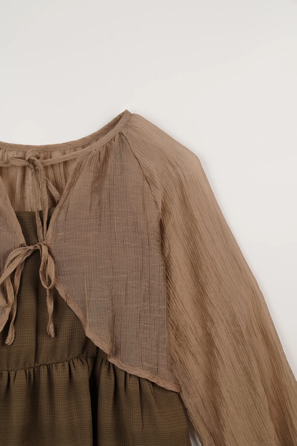 商品資訊:外套採用輕薄透膚的紗質拼接,隨著光線流轉散發柔美光澤。洋裝層次感裙擺帶出自然蓬度,修飾比例又增添俏皮靈動。