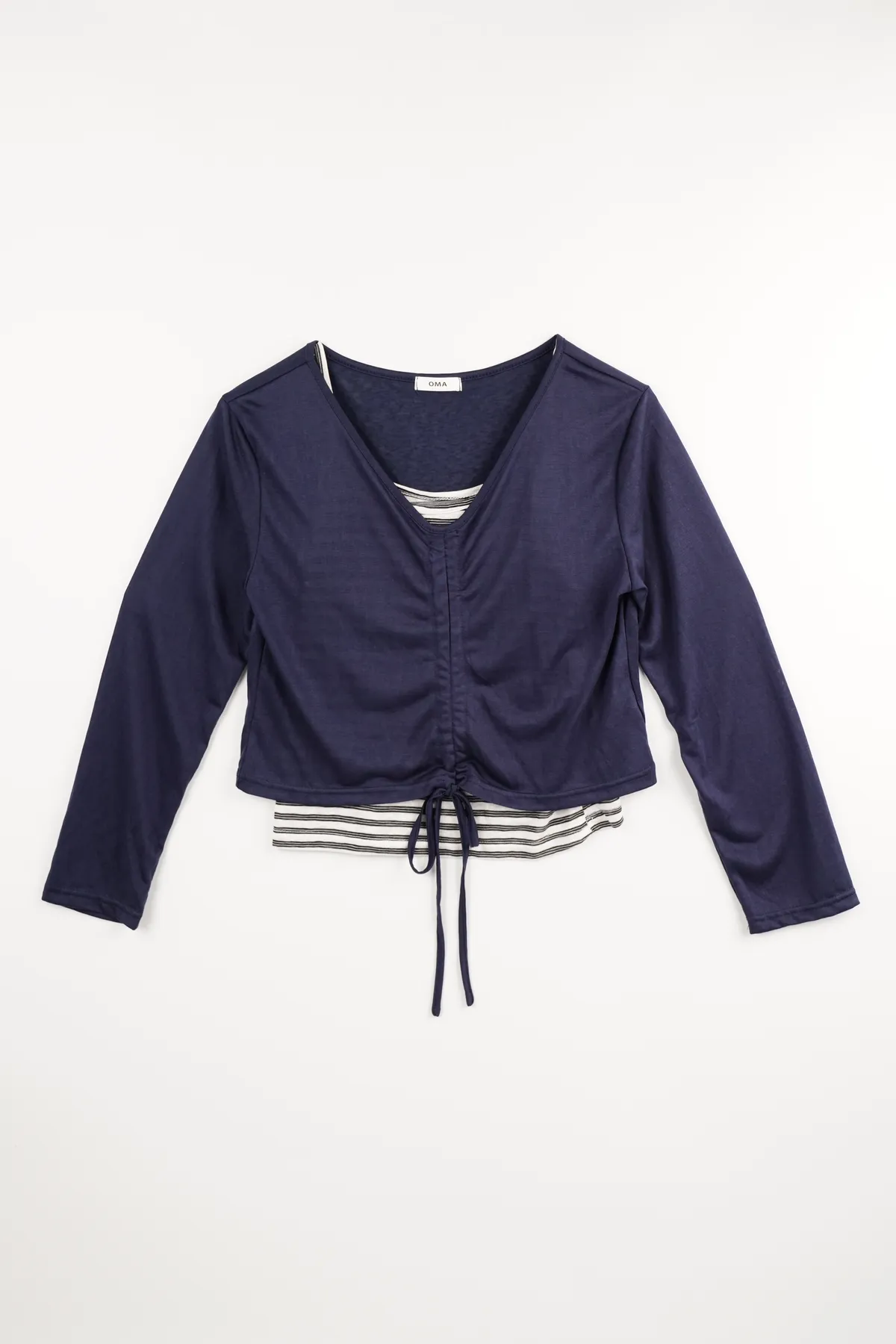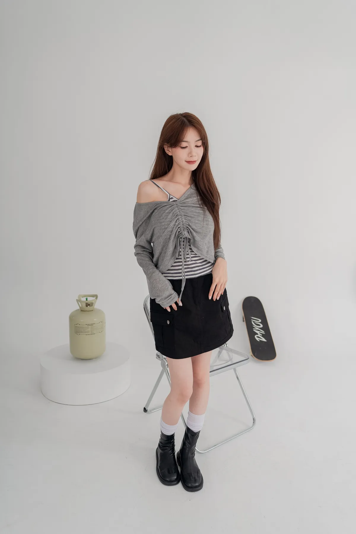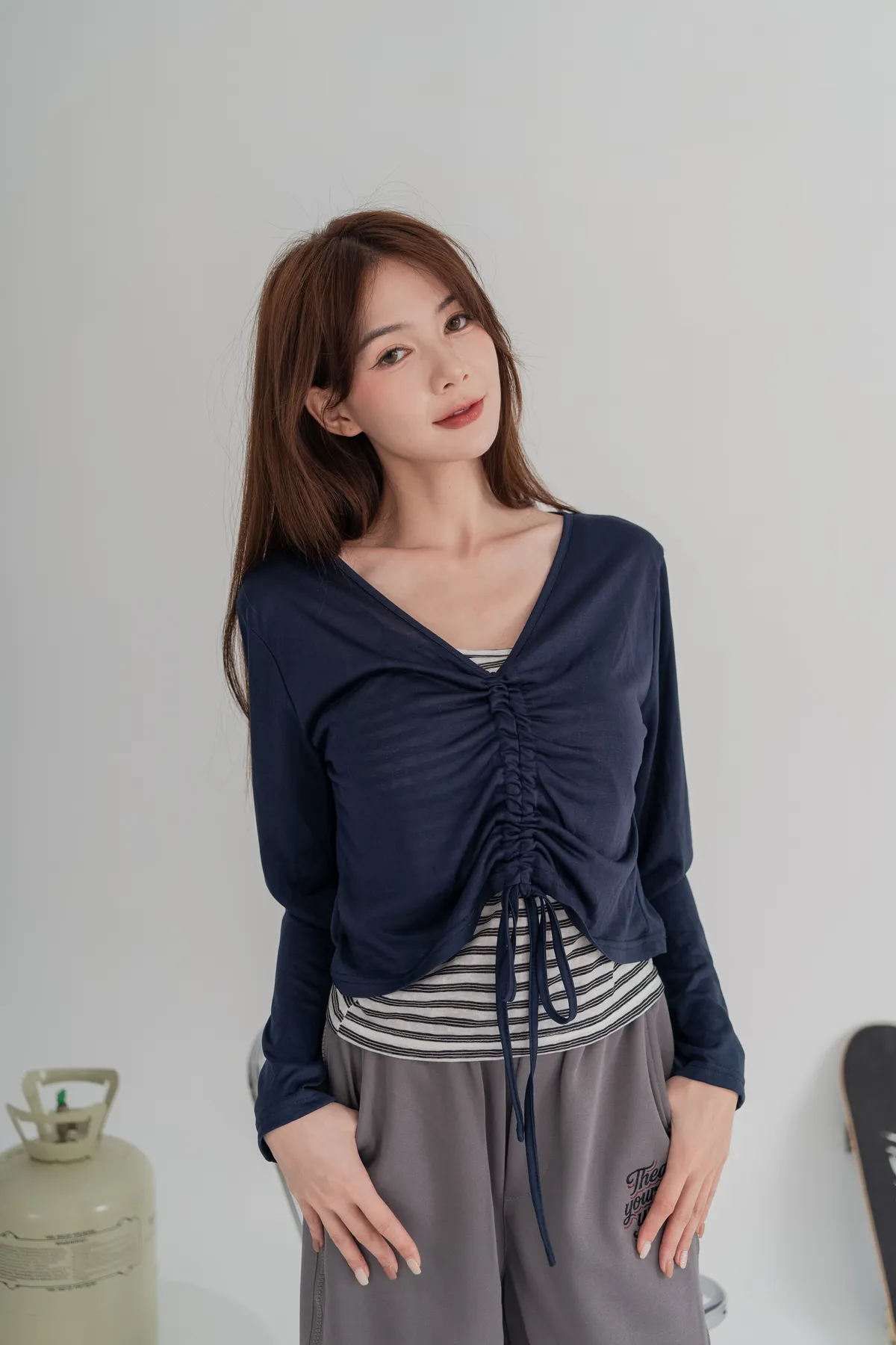 真兩件式設計,V領剪裁修飾頸部線條,中央抽繩設計可依喜好調整皺褶,自由變化衣長與造型層次。