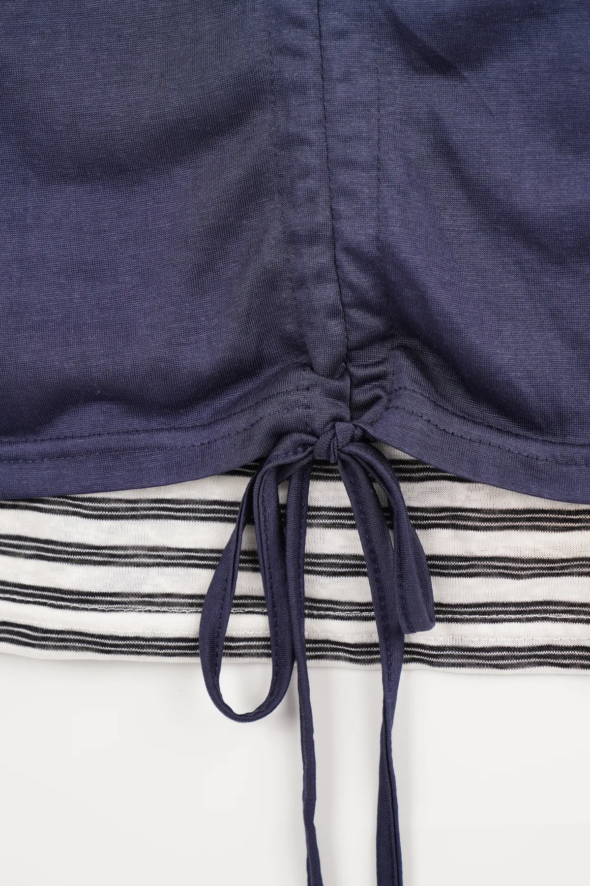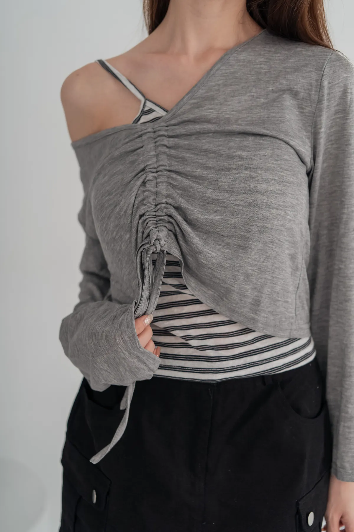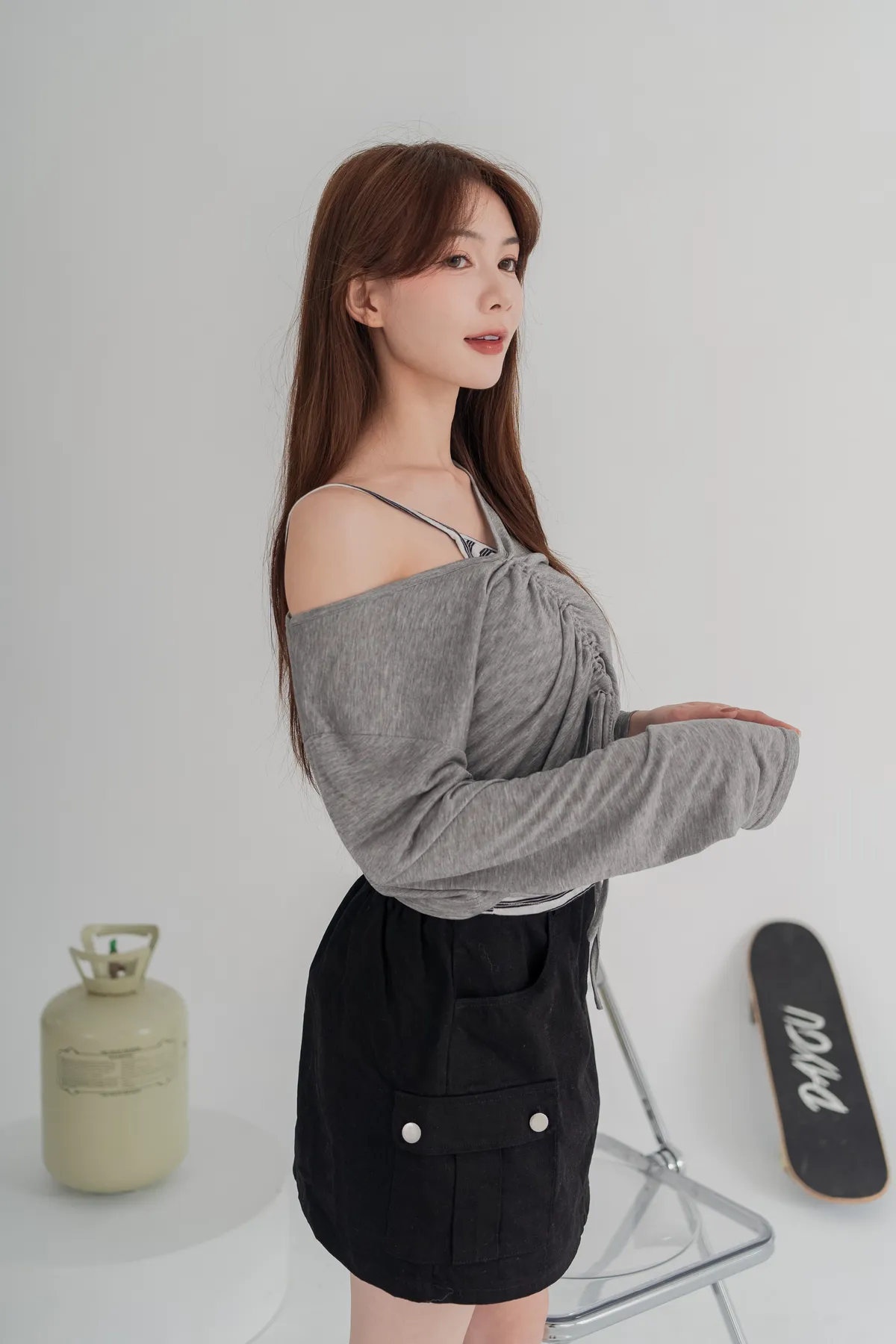 真兩件式設計,V領剪裁修飾頸部線條,中央抽繩設計可依喜好調整皺褶,自由變化衣長與造型層次。