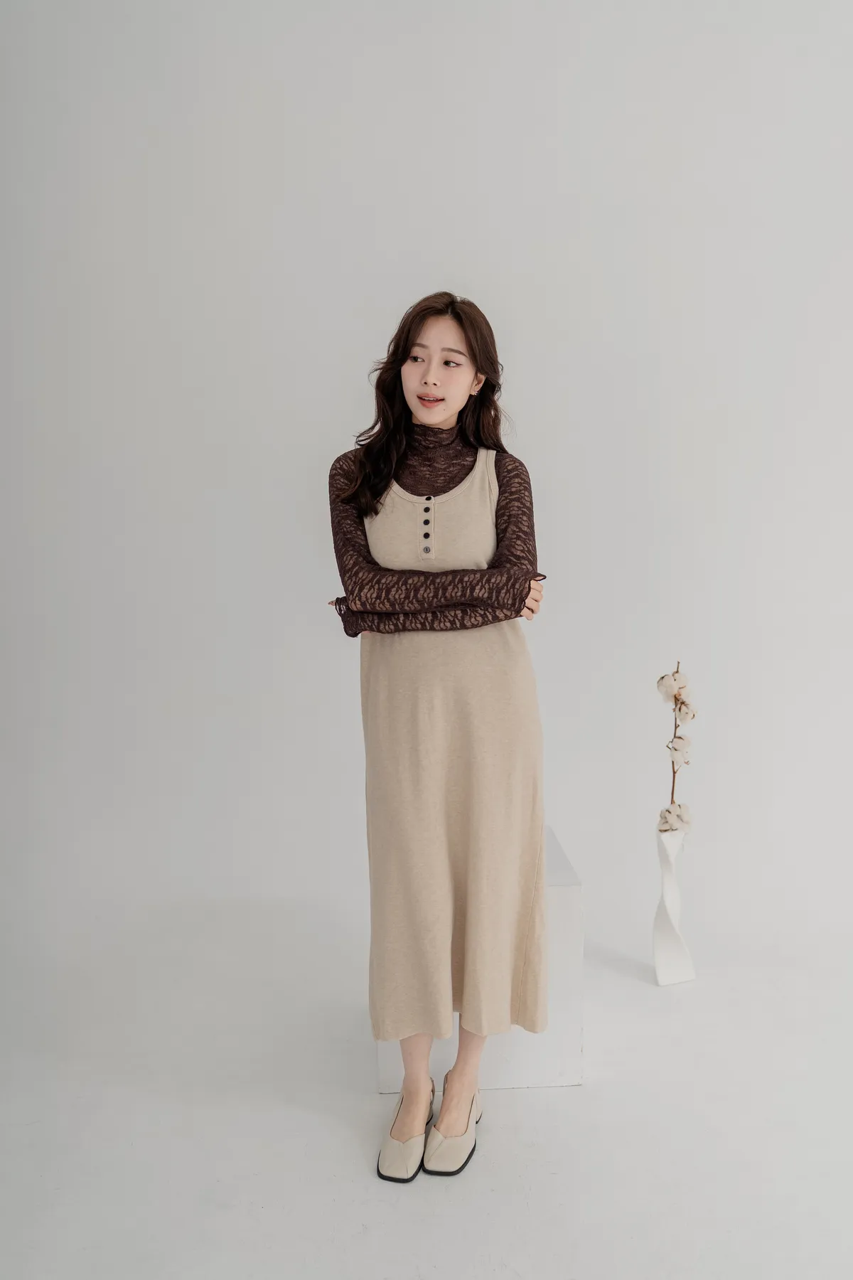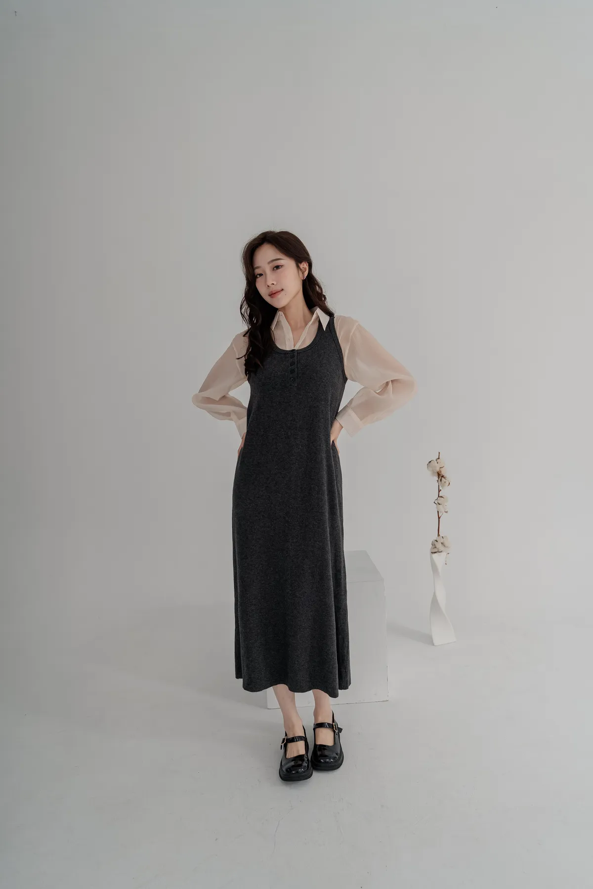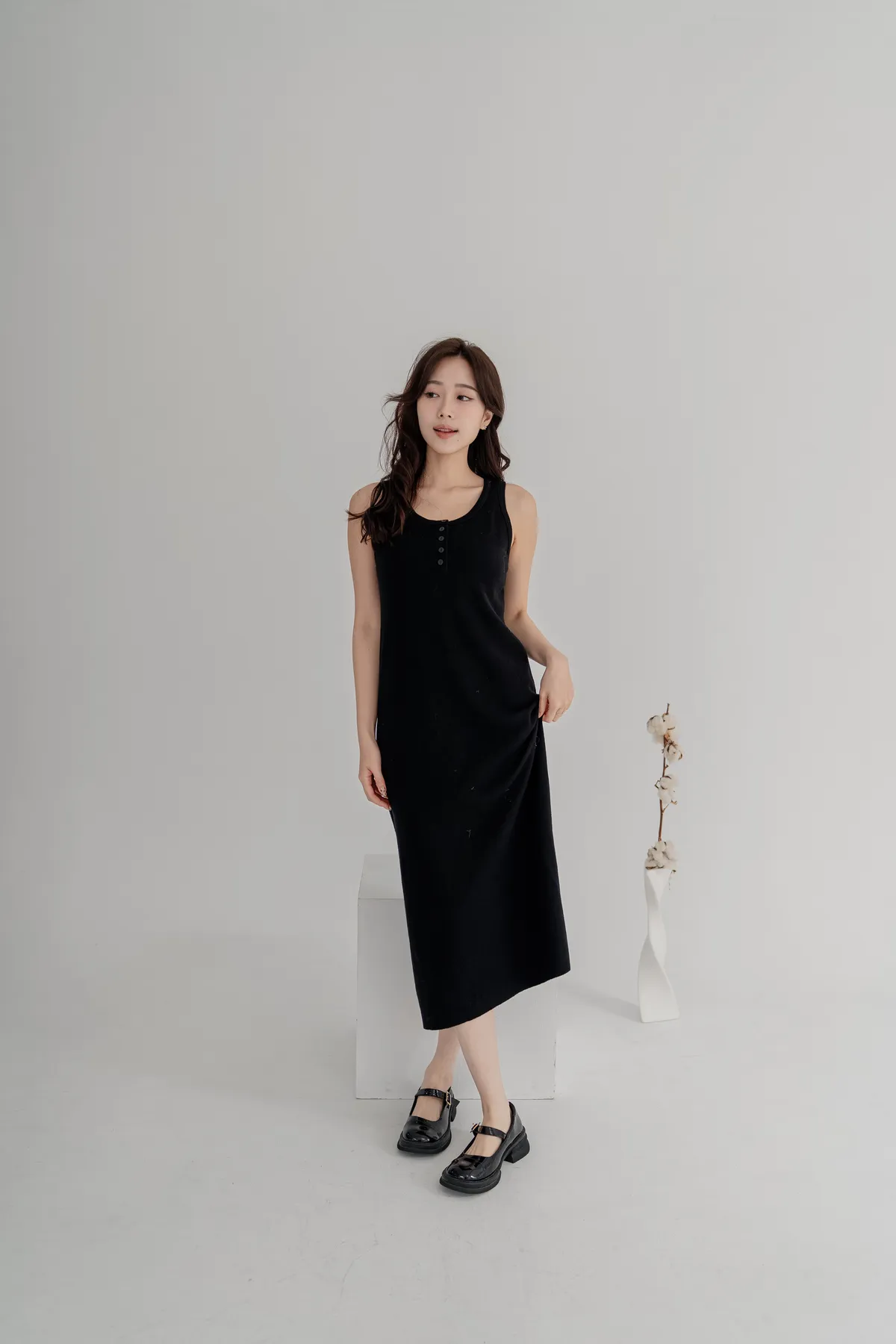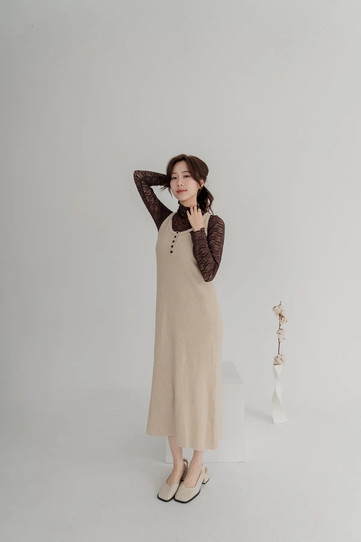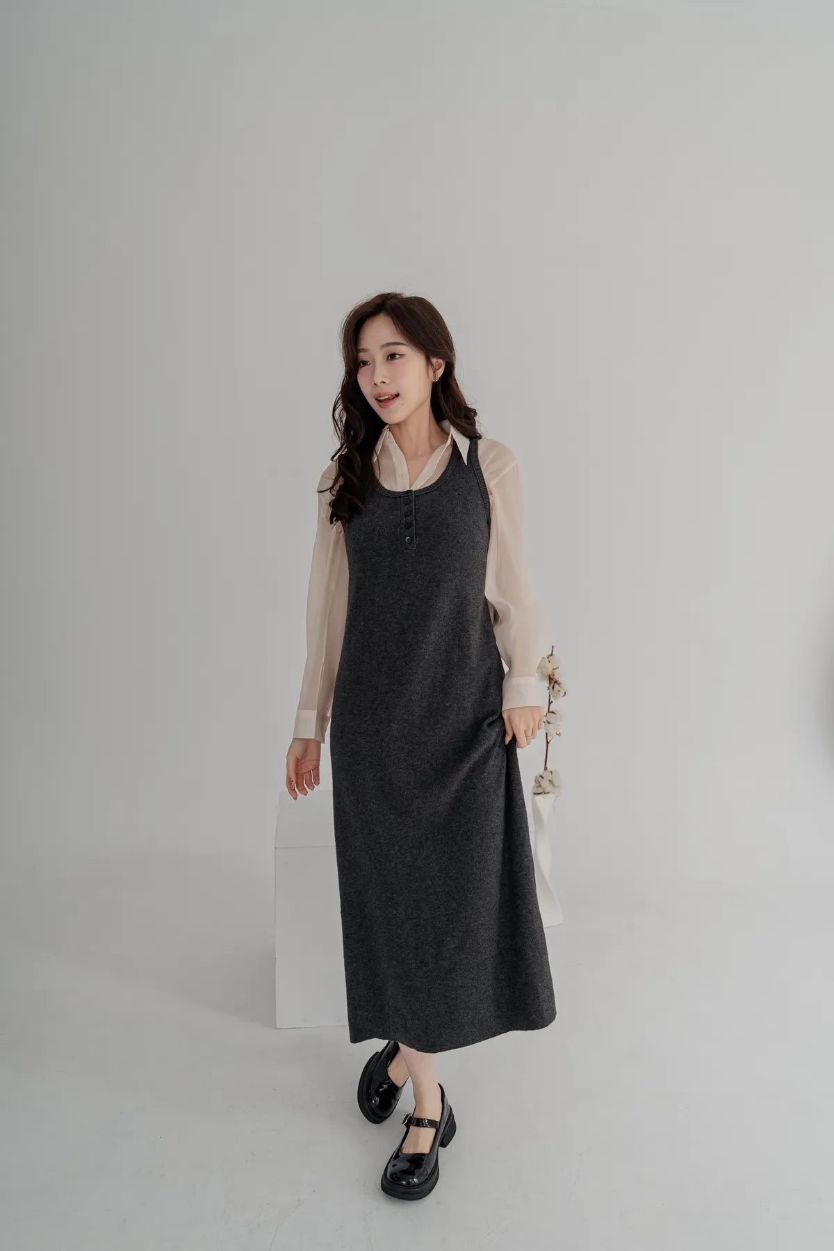 柔軟針織洋裝保暖不厚重,長版剪裁修飾身形,舒適包裹下半身。