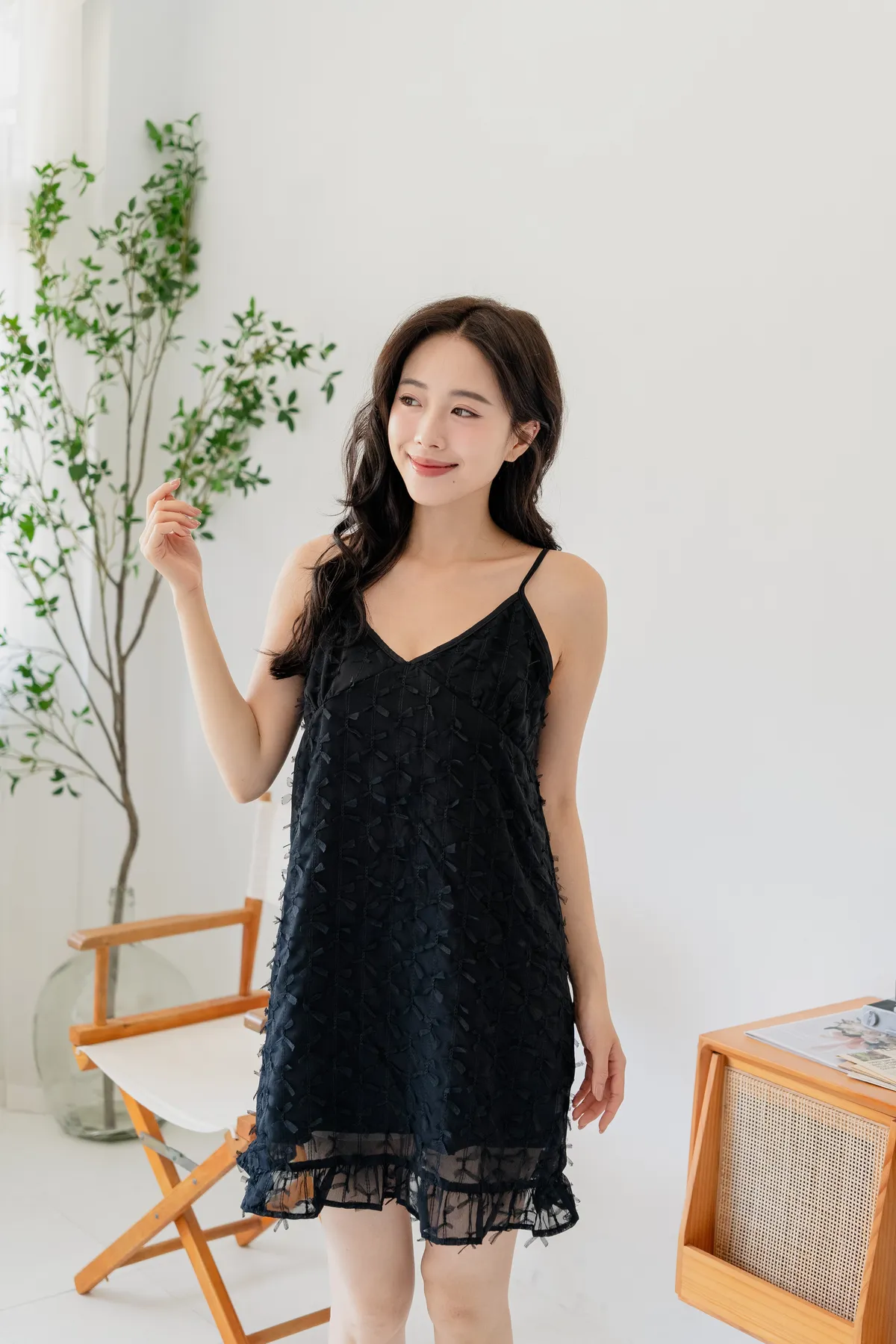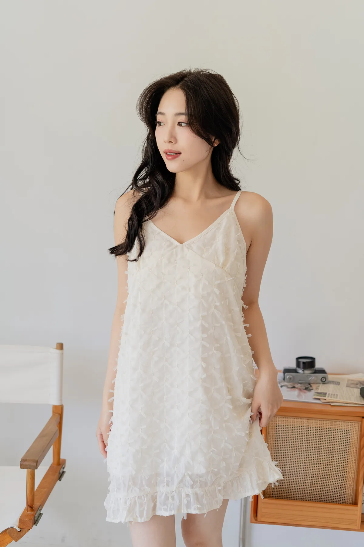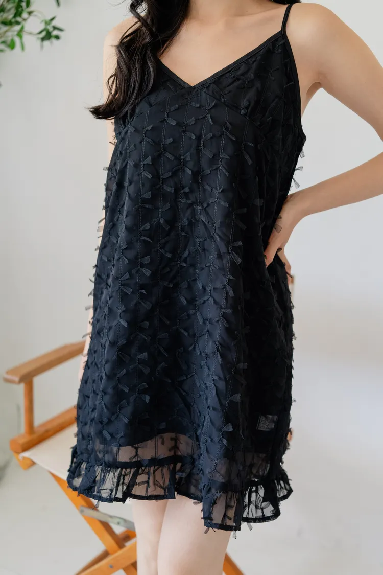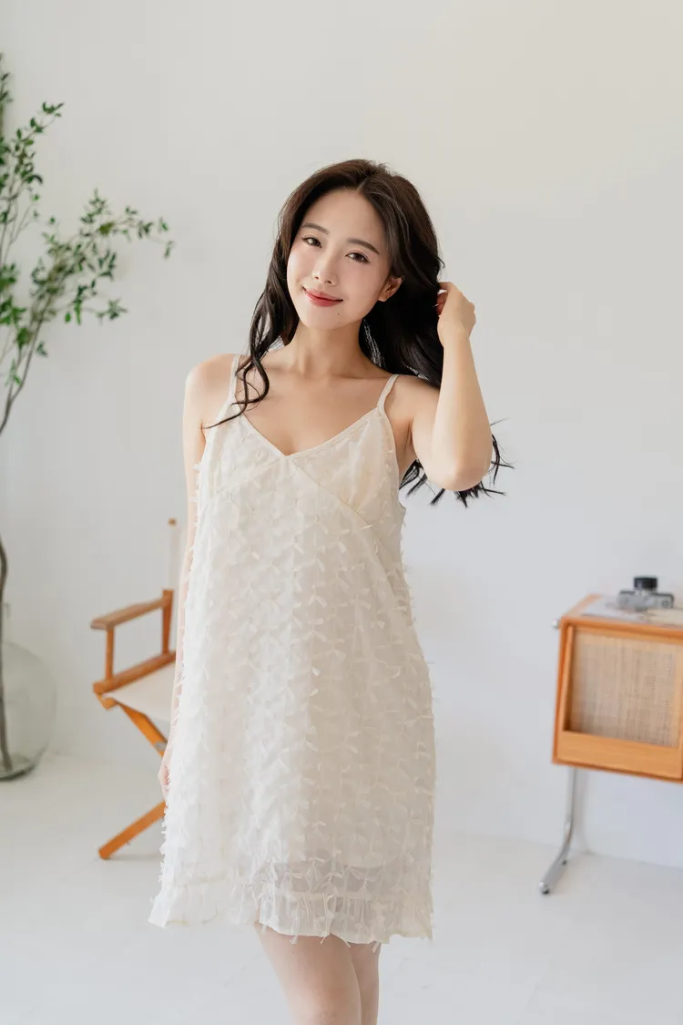 商品資訊:立體蝴蝶結紋理設計,讓細節悄悄展現質感。V領剪裁搭配細肩帶,修飾鎖骨線條,展現女性柔美。下擺微微透出的層次感,為整體增添一抹俏皮。